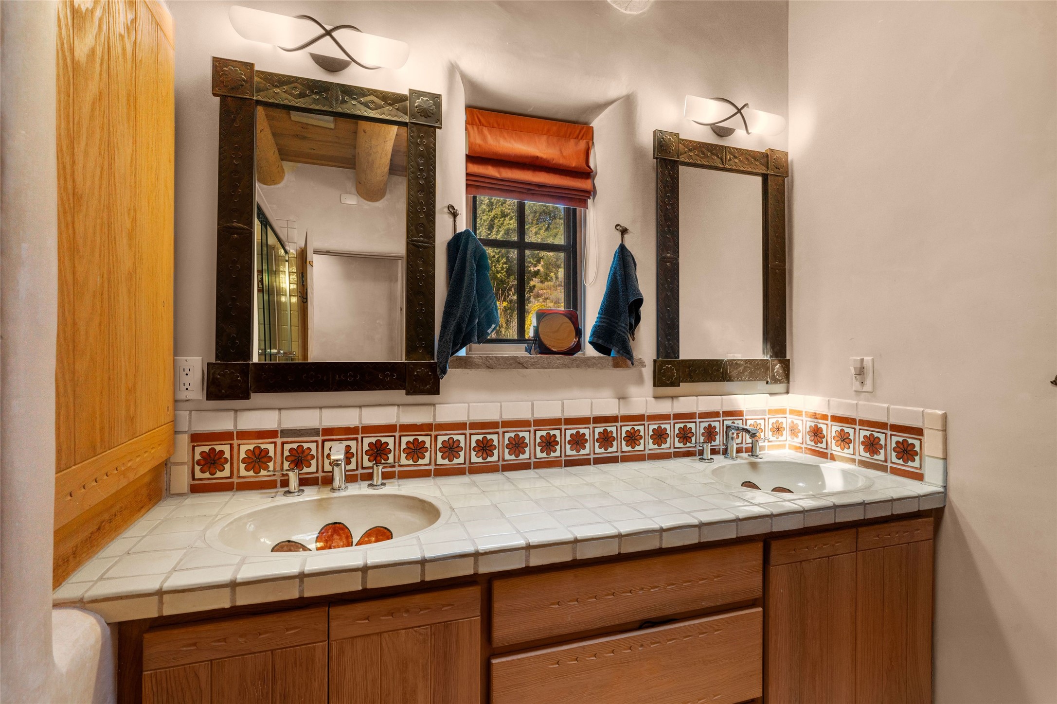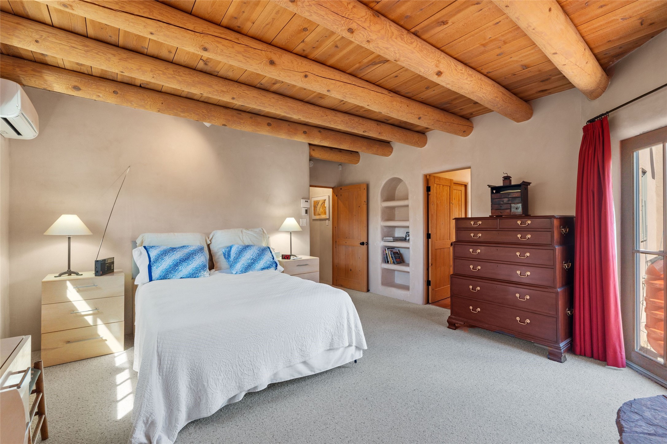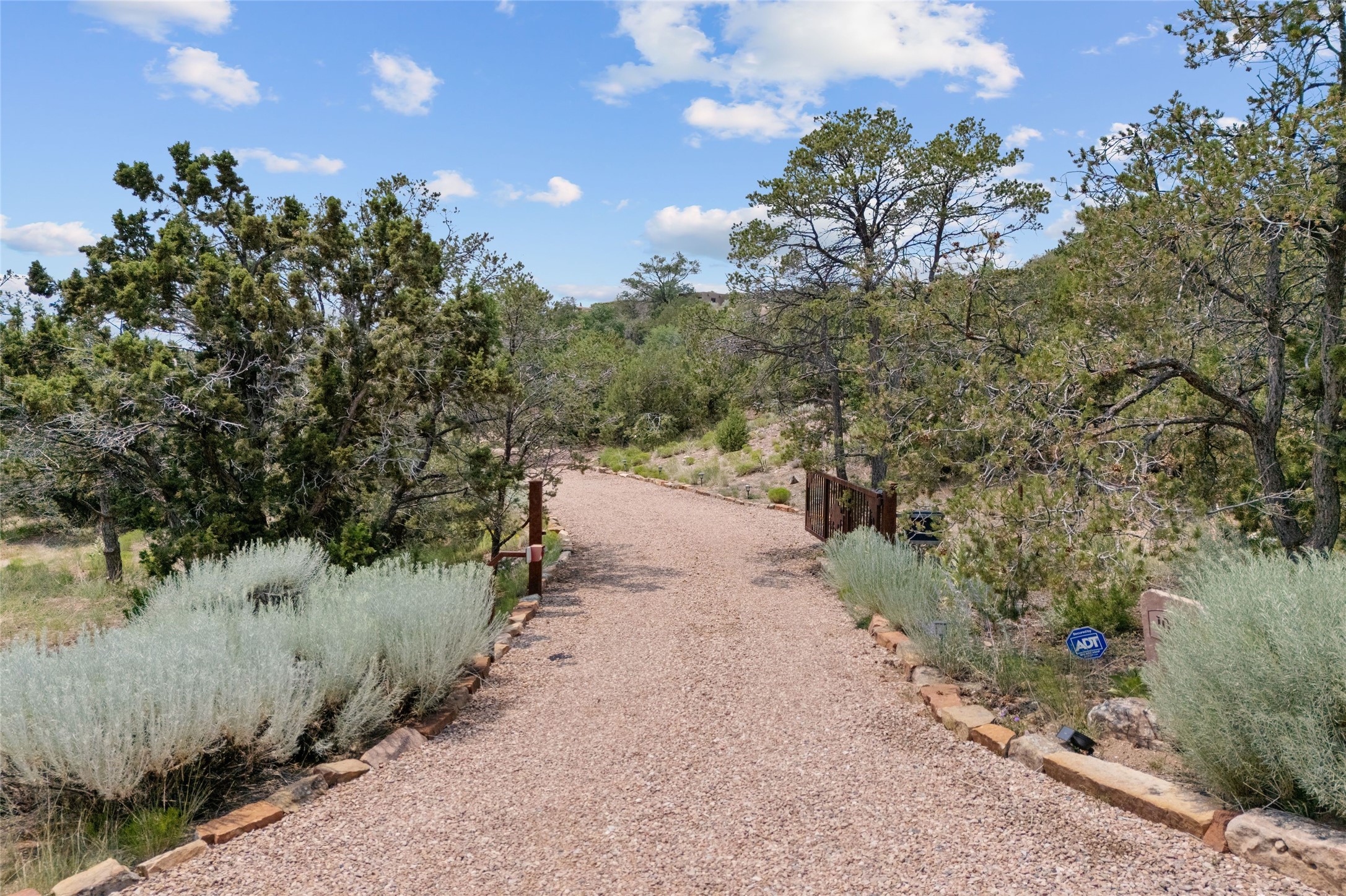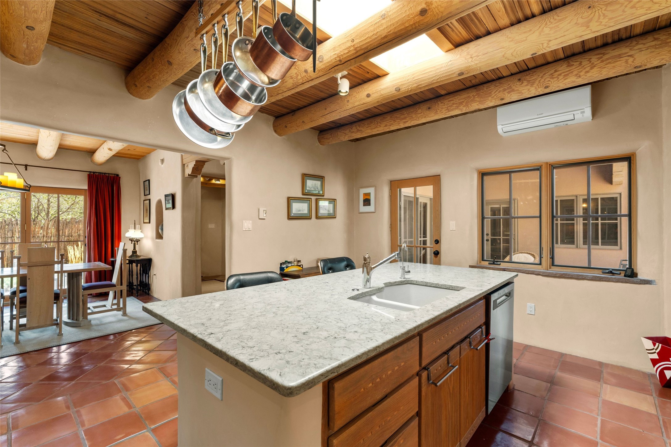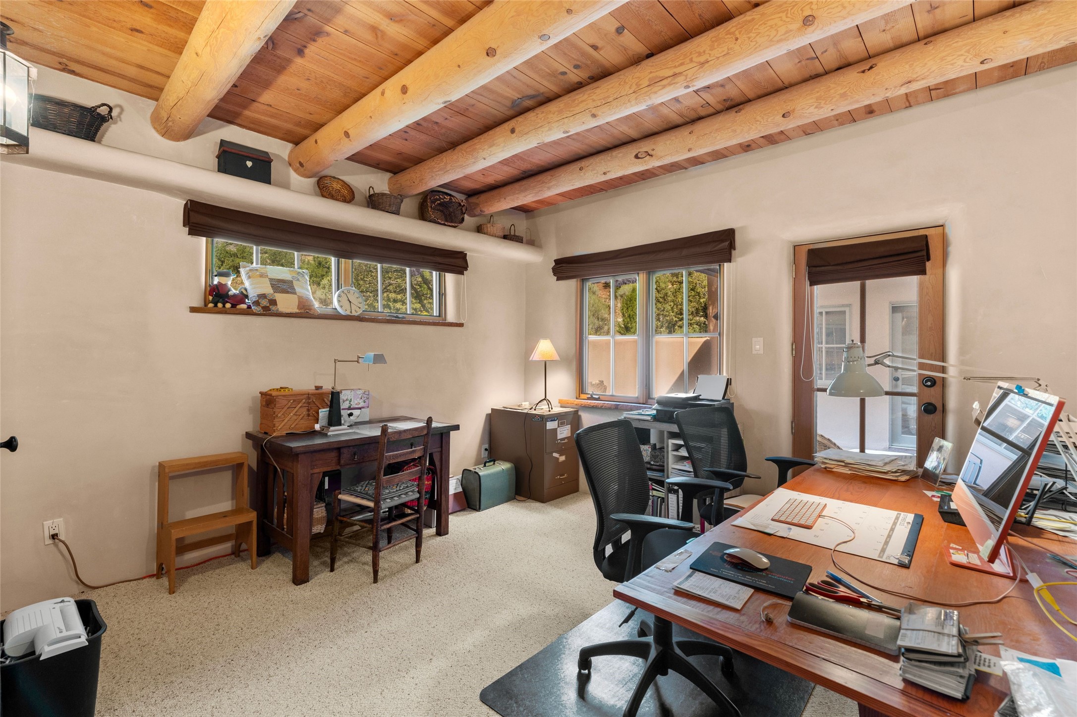 Prime Northside 3-bedroom, 2.5 home sited amidst Aspen and Pion trees with stunning views of the Sangre de Cristo Mountains. This single-level residence features no interior steps. Embracing the iconic Santa Fe style, the home showcases Saltillo tile floors, banco seating, and elegant plaster walls, complemented by traditional vigas and latillas. Two kiva fireplaces add warmth and character. The separate dining area offers captivating views of the Sangres, creating a delightful backdrop for mealtime. The updated kitchen is designed with a large island for casual seating and French doors that open to a covered patio, ideal for outdoor dining or relaxation. The primary suite features its own kiva fireplace, along with a separate office or exercise space and an outdoor patio. Additionally, the home includes a two-car garage with extra storage, enhancing convenience. Surrounded by natural landscaping, this property offers a tranquil setting while being just under two miles from the vibrant heart of downtown Santa Fe.