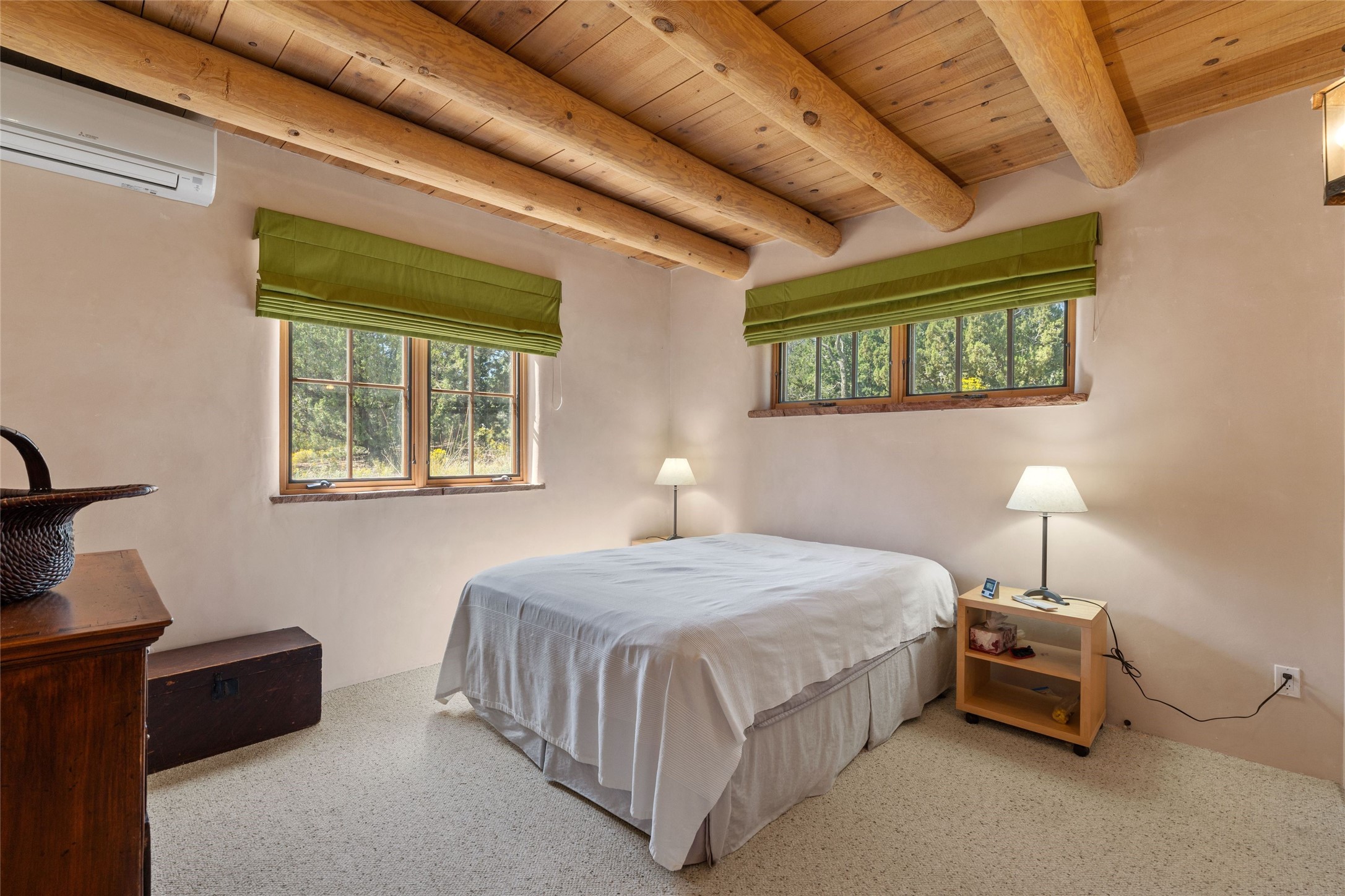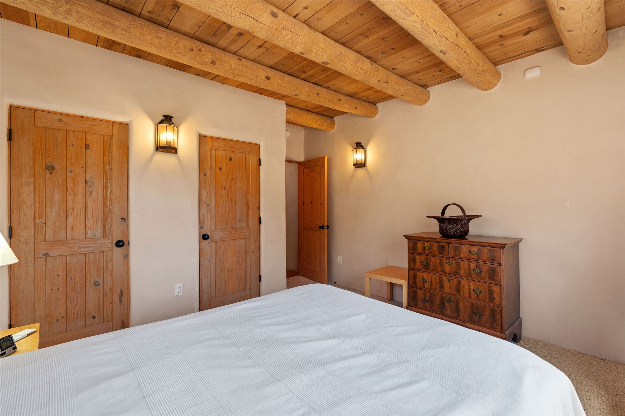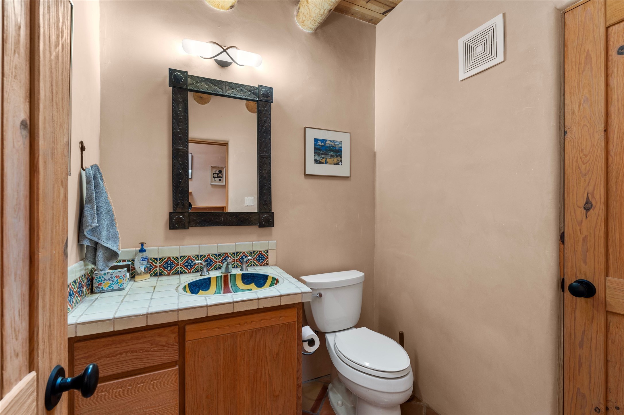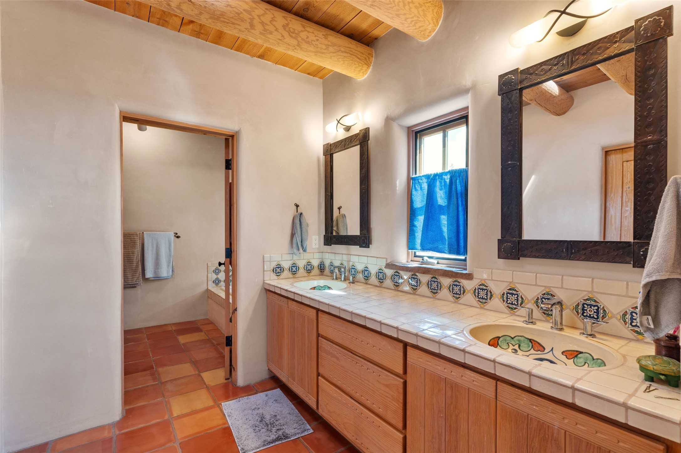 Prime Northside 3-bedroom, 2.5 home sited amidst Aspen and Pion trees with stunning views of the Sangre de Cristo Mountains. This single-level residence features no interior steps. Embracing the iconic Santa Fe style, the home showcases Saltillo tile floors, banco seating, and elegant plaster walls, complemented by traditional vigas and latillas. Two kiva fireplaces add warmth and character. The separate dining area offers captivating views of the Sangres, creating a delightful backdrop for mealtime. The updated kitchen is designed with a large island for casual seating and French doors that open to a covered patio, ideal for outdoor dining or relaxation. The primary suite features its own kiva fireplace, along with a separate office or exercise space and an outdoor patio. Additionally, the home includes a two-car garage with extra storage, enhancing convenience. Surrounded by natural landscaping, this property offers a tranquil setting while being just under two miles from the vibrant heart of downtown Santa Fe.