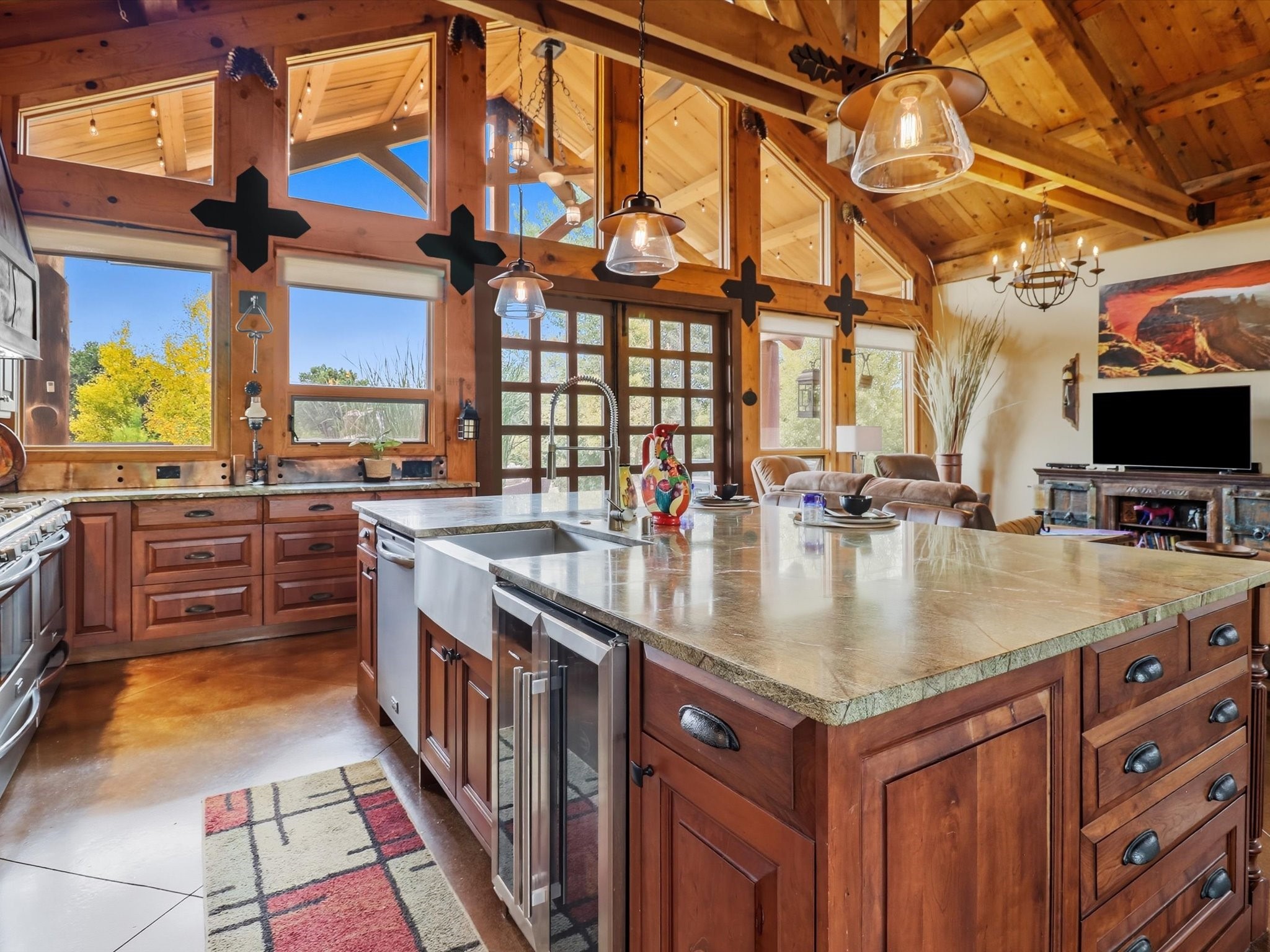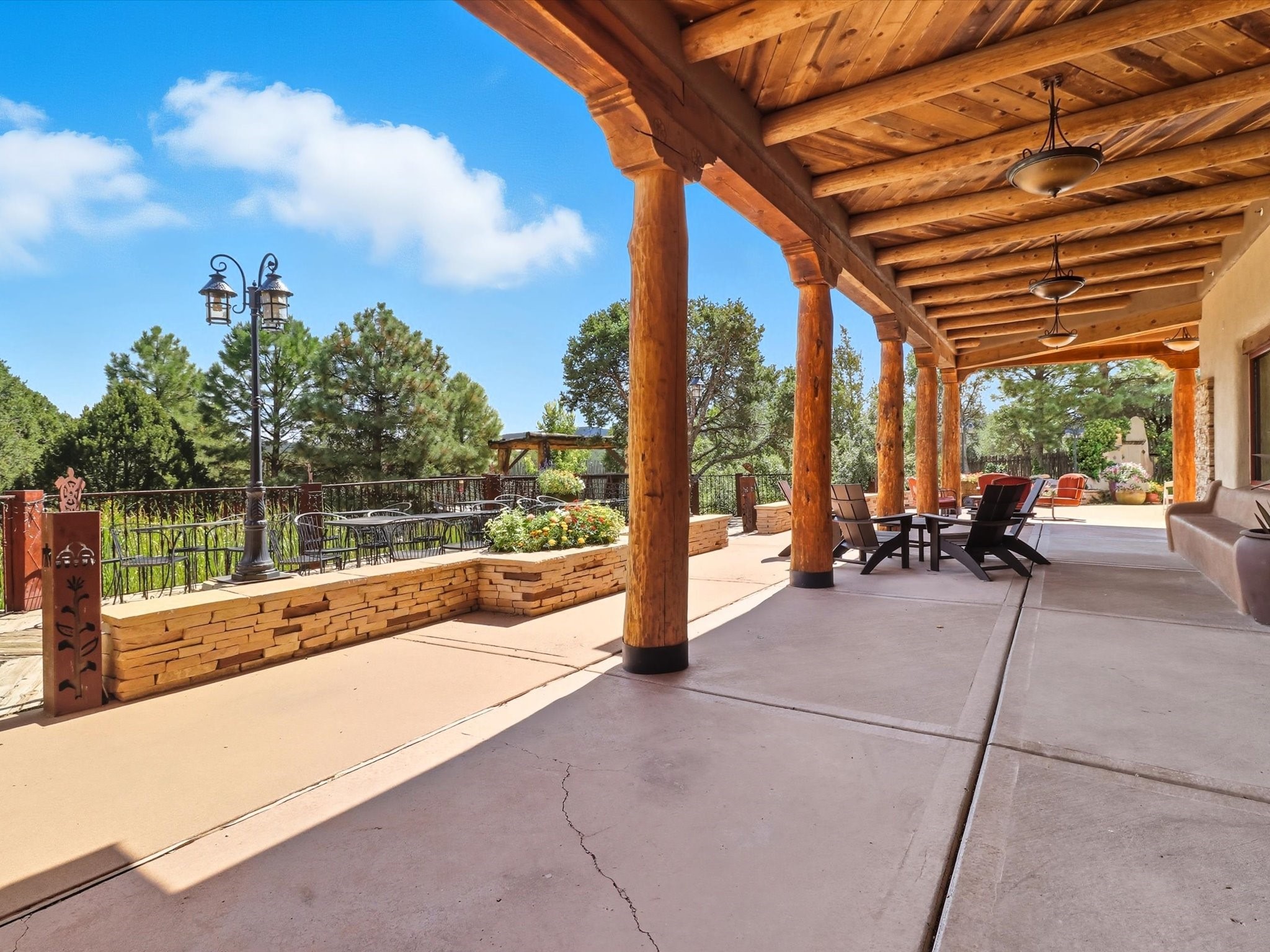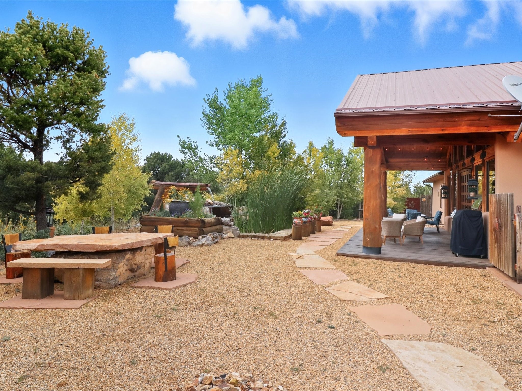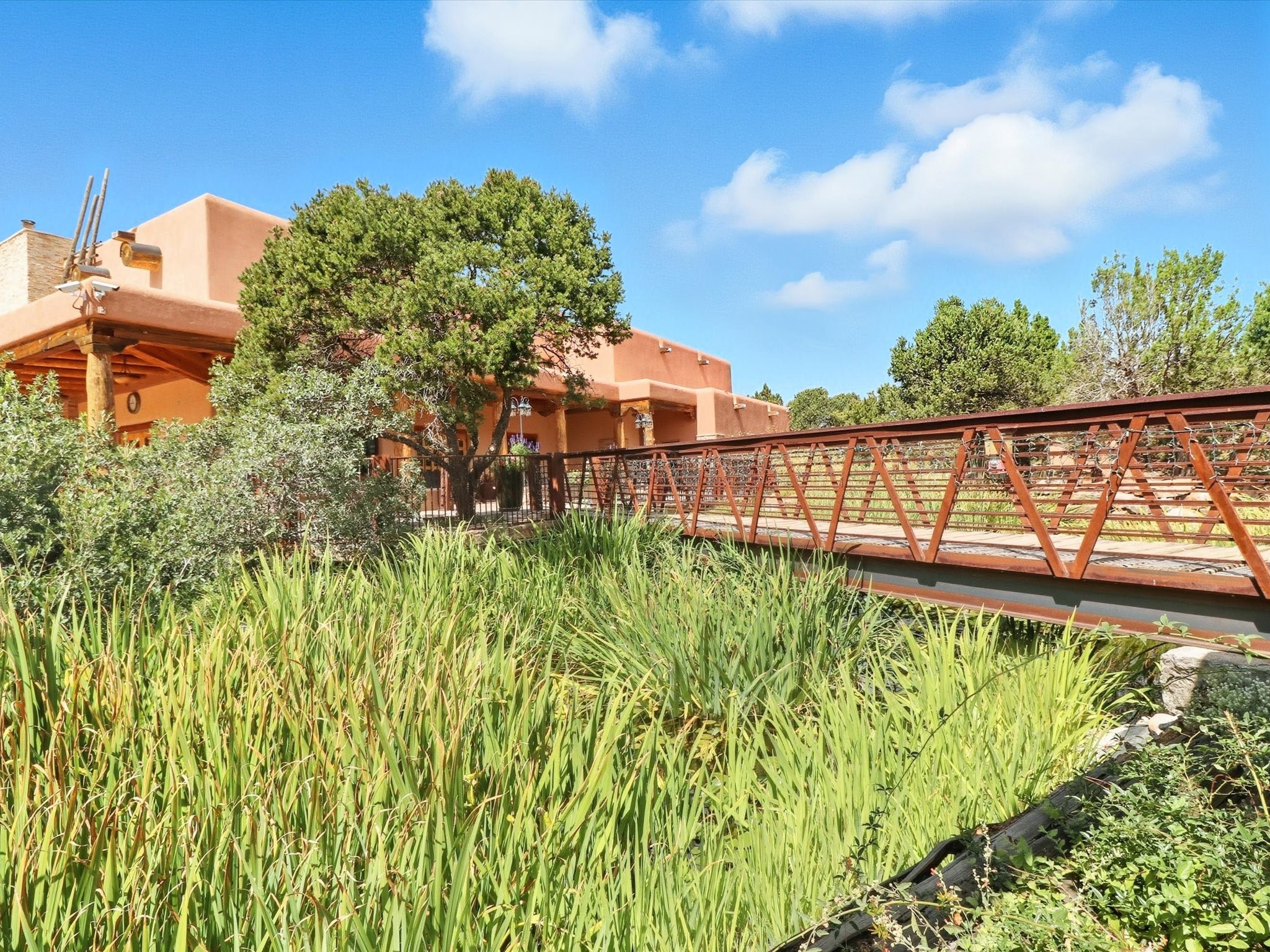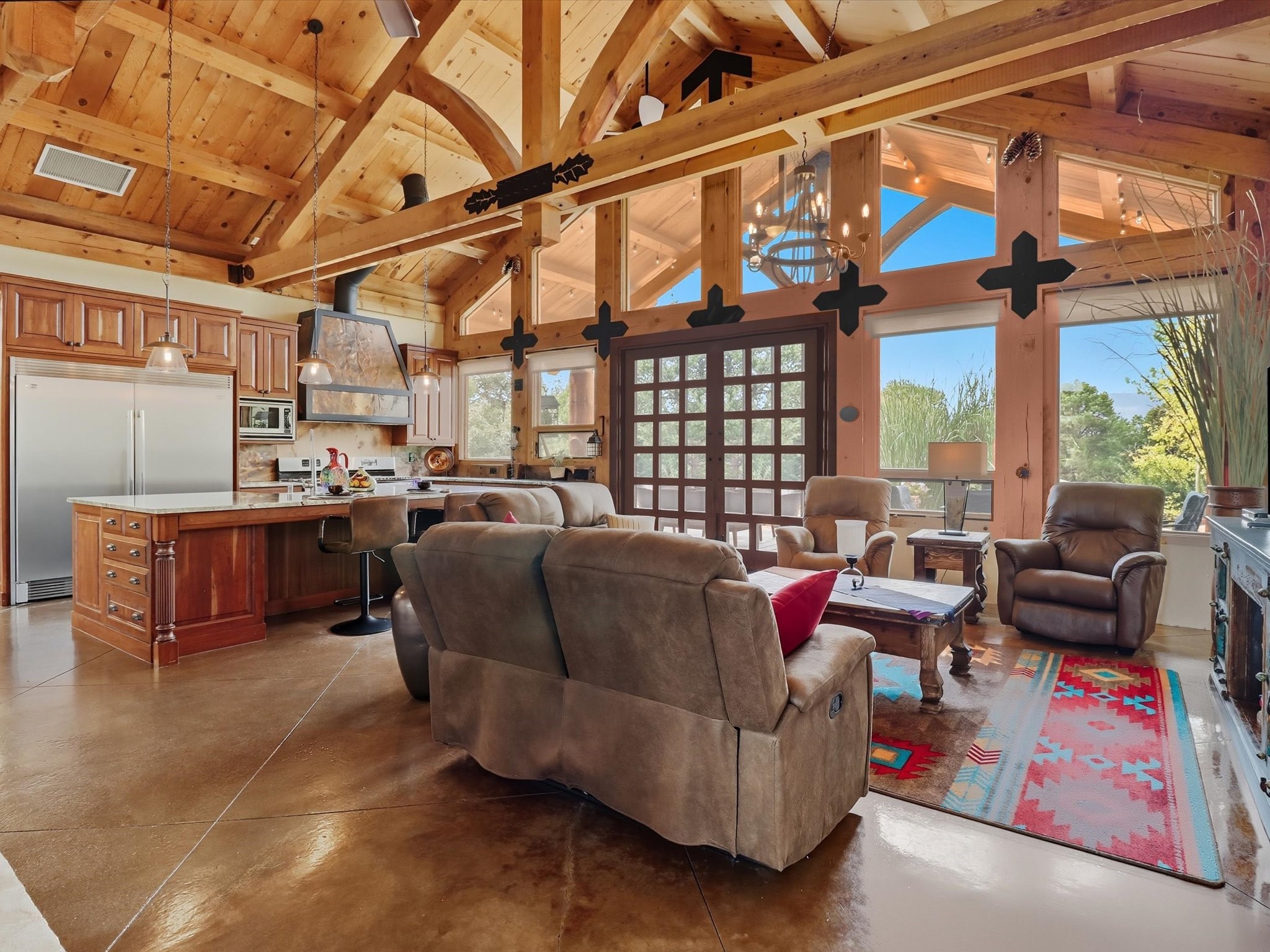 Country Lodge-Style Home in Gated CommunityCasually elegant lodge-style home in a country setting, designed to highlight 4 seasons with walls of windows, 20-foot wood ceilings, and massive trusses in the great room. Two living areas are divided by a two-way stacked stone fireplace, with a striking water feature inside the front entry.Interior features include concrete radiant-heated floors, wood vigas, and a chef's kitchen with 2 ranges, dishwasher, wine cooler, built-in refrigerator, rainforest quartz island, copper hood and backsplash, and a large pantry. A built-in china hutch adds to the custom design.The main suite includes a Jacuzzi tub, fireplace, and a large walk-in closet. Additional amenities feature a 1,369 sq. ft. 3+ car garage/workshop with shelving, porches at the front and back, and an outdoor hot tub. Backyard has a large koi pond with a water feature.Located in a gated, paved community with clubhouse amenities including walking trails, indoor pool, outdoor hot tub, sauna, gym, basketball, racquetball and tennis courts. Approximately 20 minutes east of Albuquerque. Sellers are offering the buyers a $5000 credit towards closing costs or to buy down their interest rate.