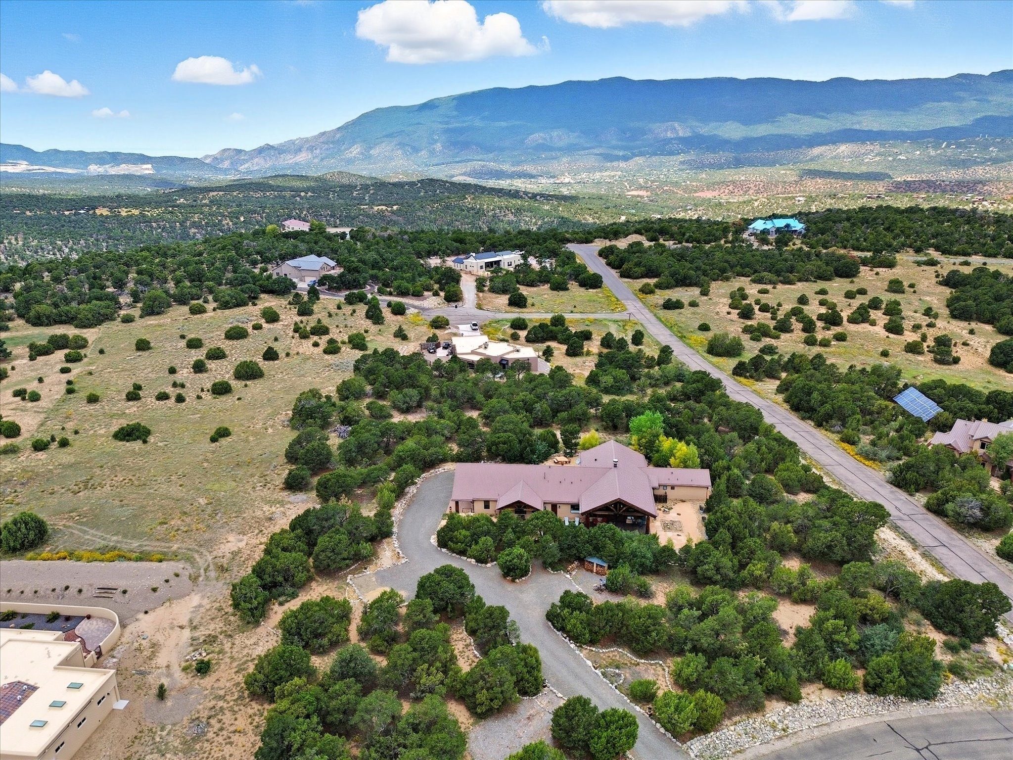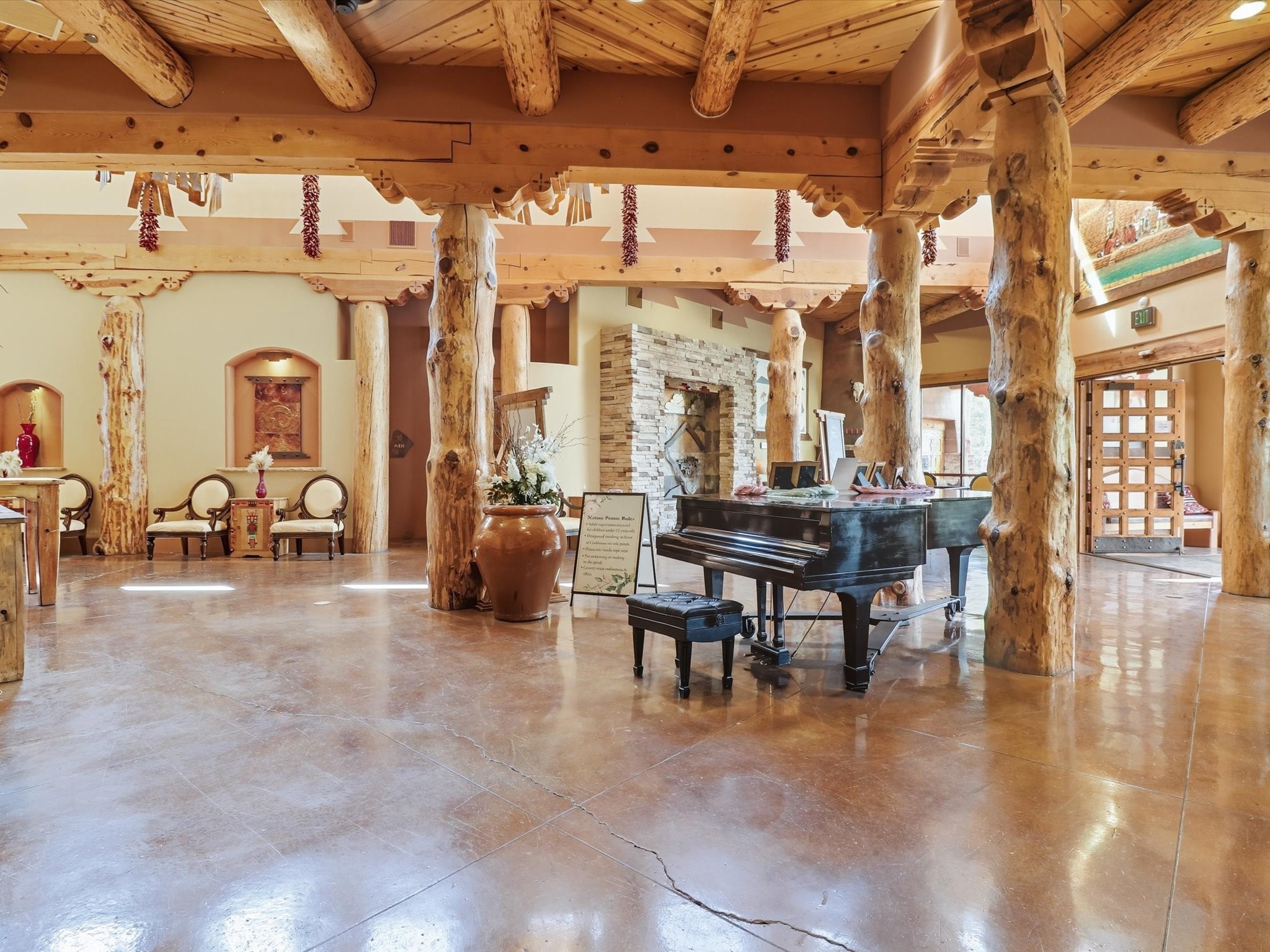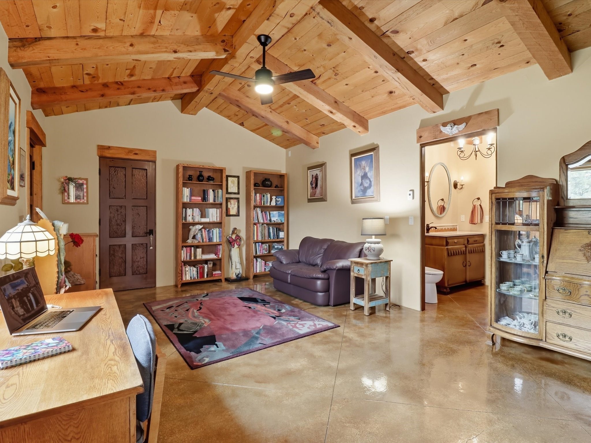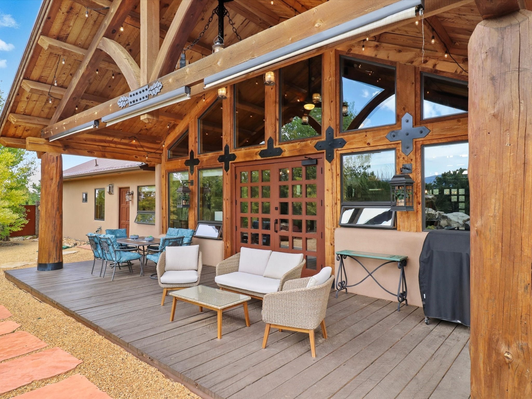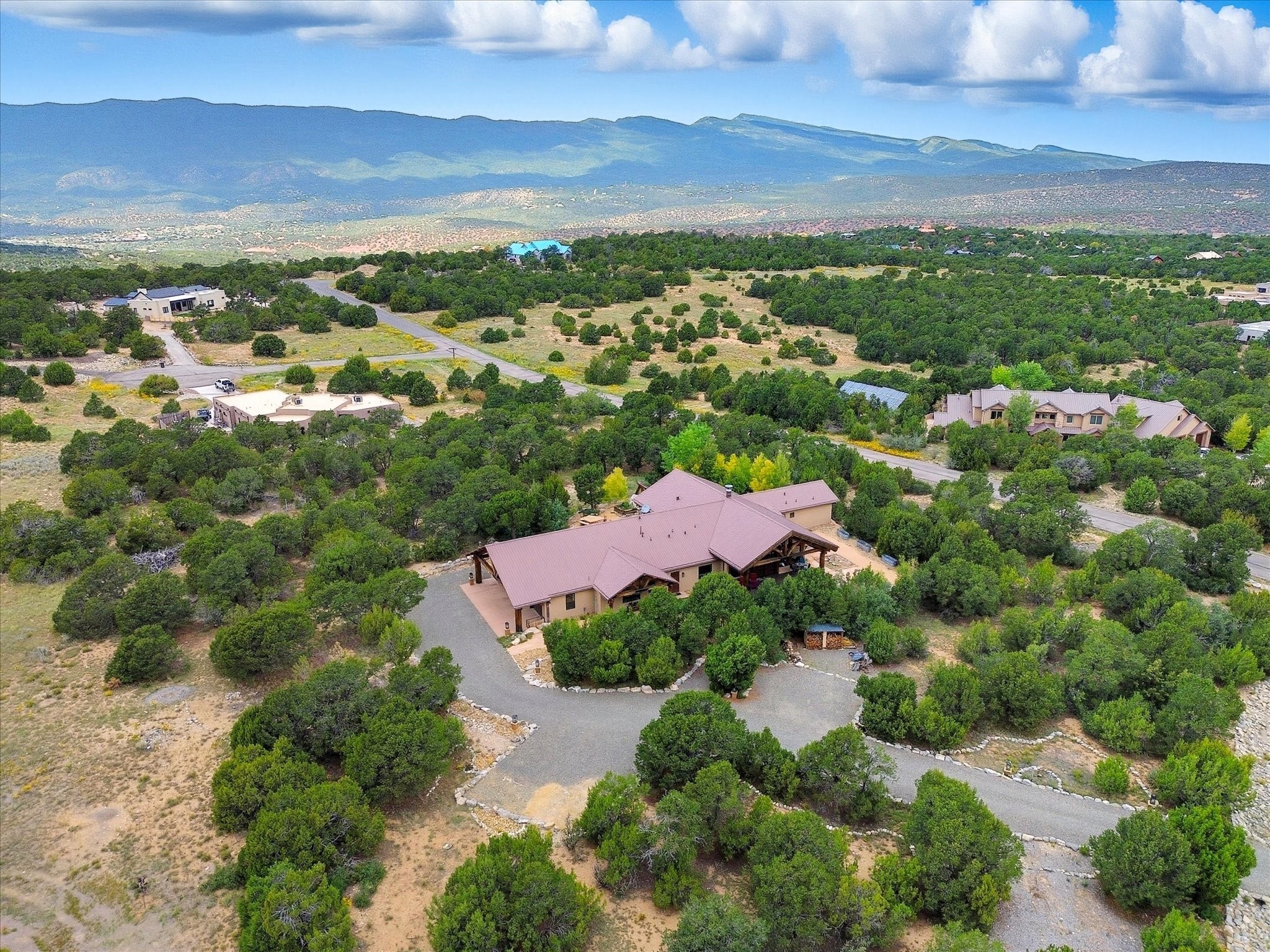 Country Lodge-Style Home in Gated CommunityCasually elegant lodge-style home in a country setting, designed to highlight 4 seasons with walls of windows, 20-foot wood ceilings, and massive trusses in the great room. Two living areas are divided by a two-way stacked stone fireplace, with a striking water feature inside the front entry.Interior features include concrete radiant-heated floors, wood vigas, and a chef's kitchen with 2 ranges, dishwasher, wine cooler, built-in refrigerator, rainforest quartz island, copper hood and backsplash, and a large pantry. A built-in china hutch adds to the custom design.The main suite includes a Jacuzzi tub, fireplace, and a large walk-in closet. Additional amenities feature a 1,369 sq. ft. 3+ car garage/workshop with shelving, porches at the front and back, and an outdoor hot tub. Backyard has a large koi pond with a water feature.Located in a gated, paved community with clubhouse amenities including walking trails, indoor pool, outdoor hot tub, sauna, gym, basketball, racquetball and tennis courts. Approximately 20 minutes east of Albuquerque. Sellers are offering the buyers a $5000 credit towards closing costs or to buy down their interest rate.