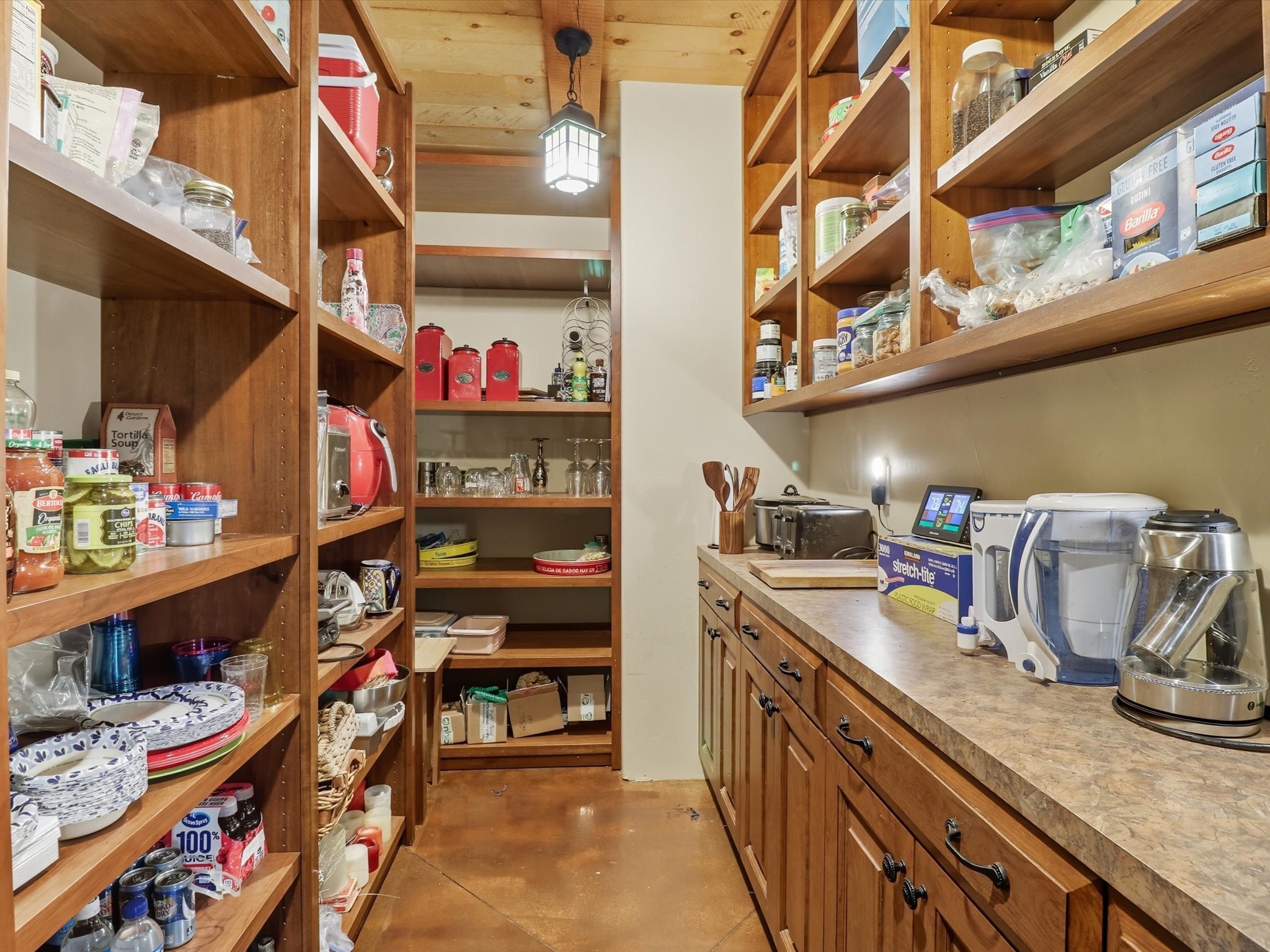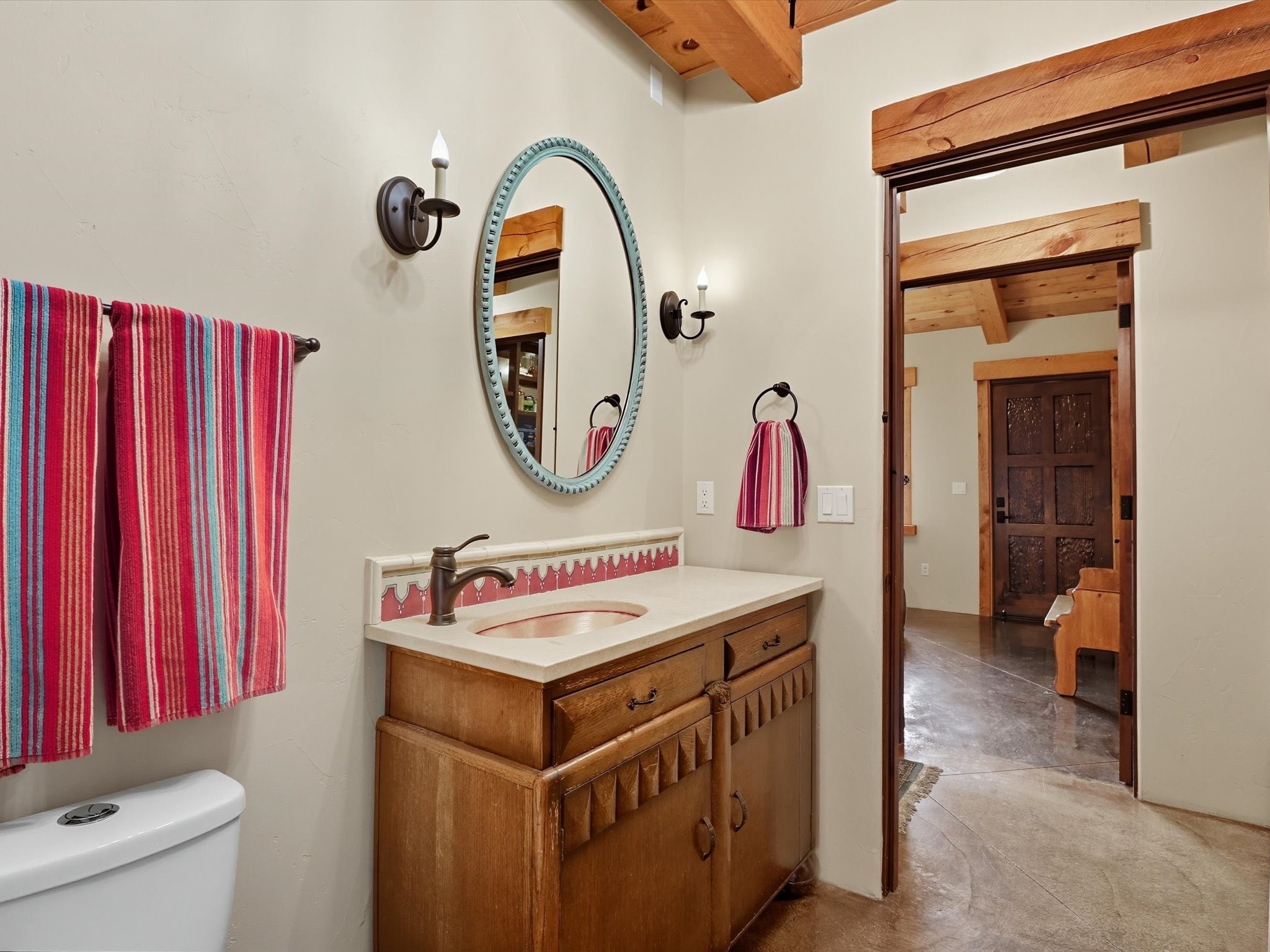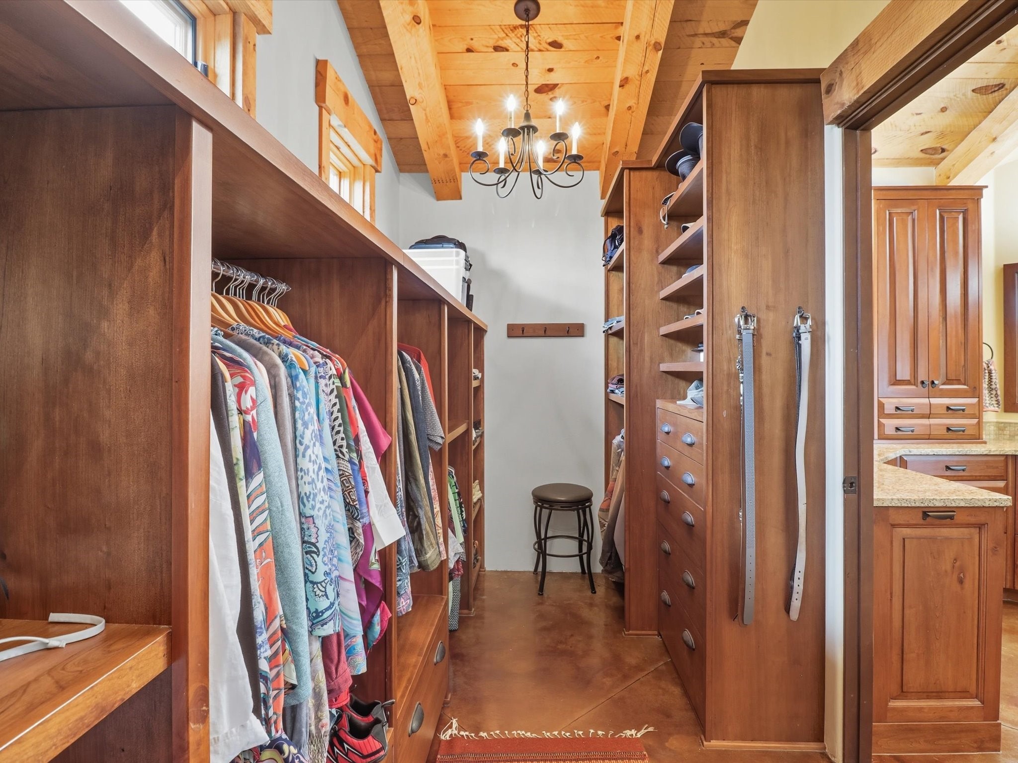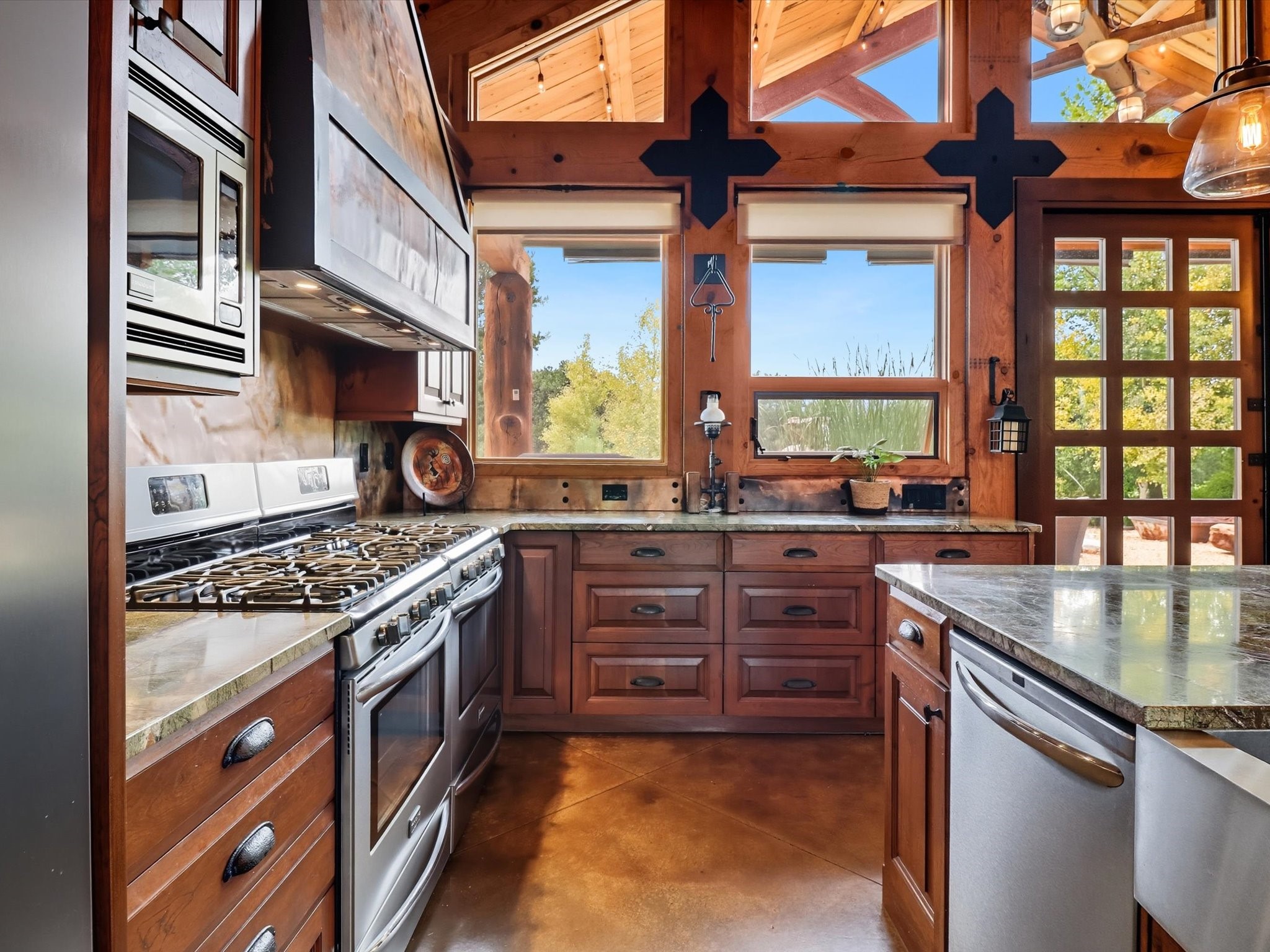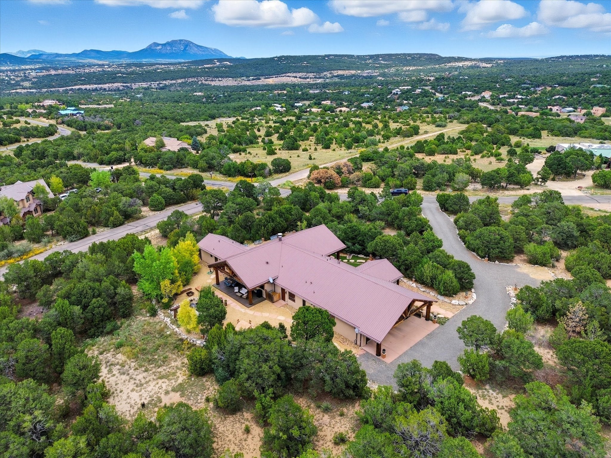 Country Lodge-Style Home in Gated CommunityCasually elegant lodge-style home in a country setting, designed to highlight 4 seasons with walls of windows, 20-foot wood ceilings, and massive trusses in the great room. Two living areas are divided by a two-way stacked stone fireplace, with a striking water feature inside the front entry.Interior features include concrete radiant-heated floors, wood vigas, and a chef's kitchen with 2 ranges, dishwasher, wine cooler, built-in refrigerator, rainforest quartz island, copper hood and backsplash, and a large pantry. A built-in china hutch adds to the custom design.The main suite includes a Jacuzzi tub, fireplace, and a large walk-in closet. Additional amenities feature a 1,369 sq. ft. 3+ car garage/workshop with shelving, porches at the front and back, and an outdoor hot tub. Backyard has a large koi pond with a water feature.Located in a gated, paved community with clubhouse amenities including walking trails, indoor pool, outdoor hot tub, sauna, gym, basketball, racquetball and tennis courts. Approximately 20 minutes east of Albuquerque. Sellers are offering the buyers a $5000 credit towards closing costs or to buy down their interest rate.
