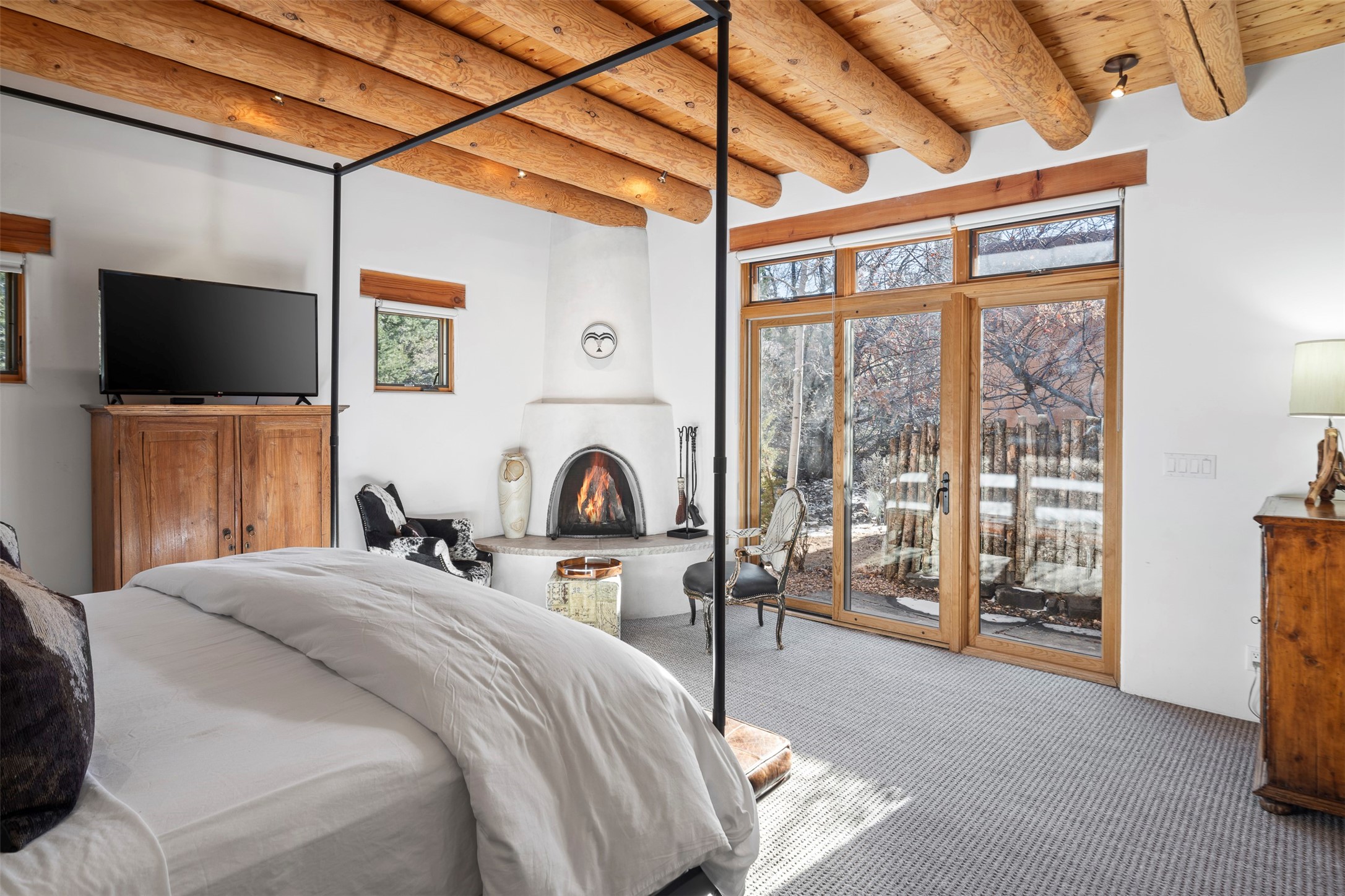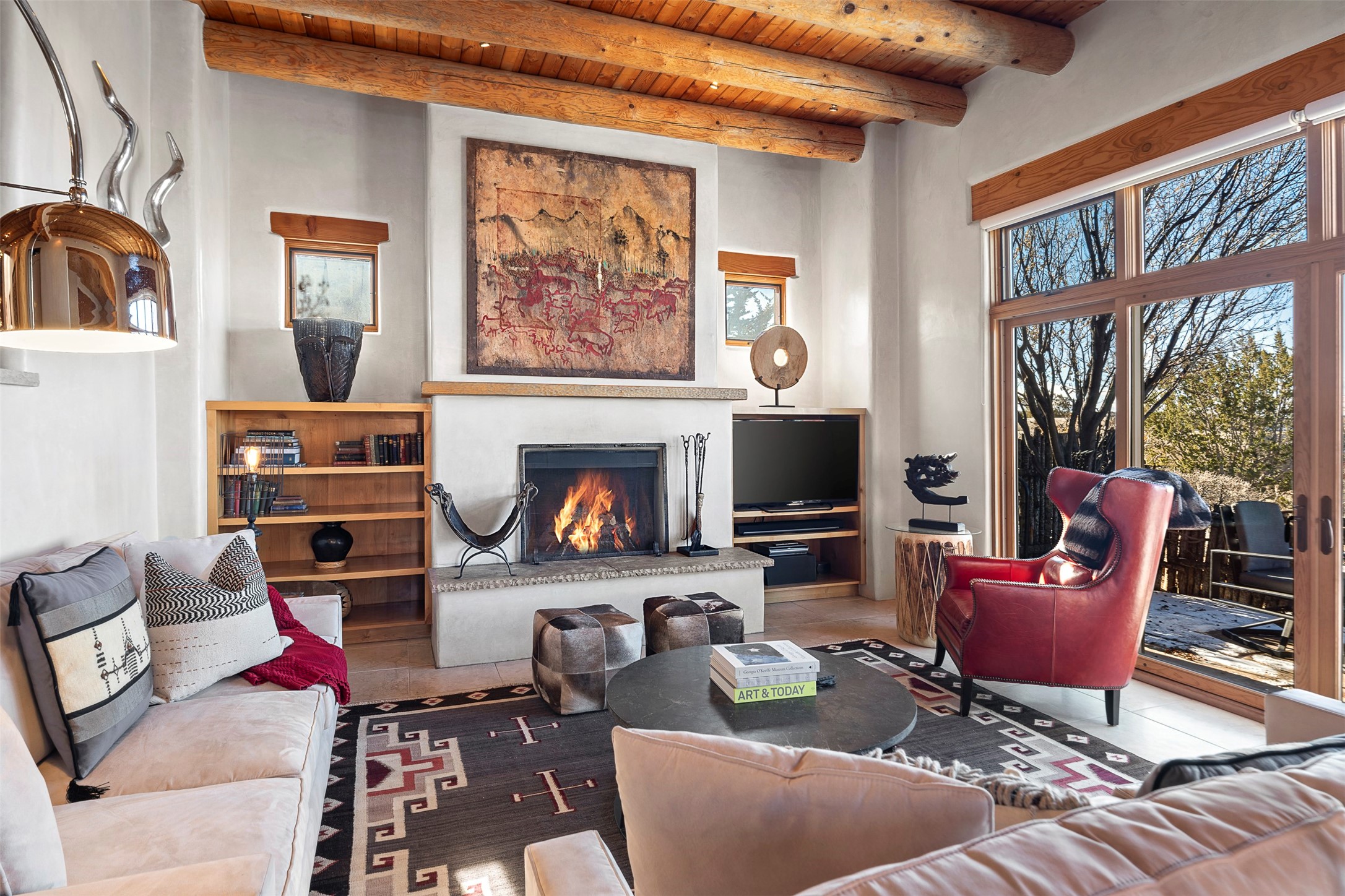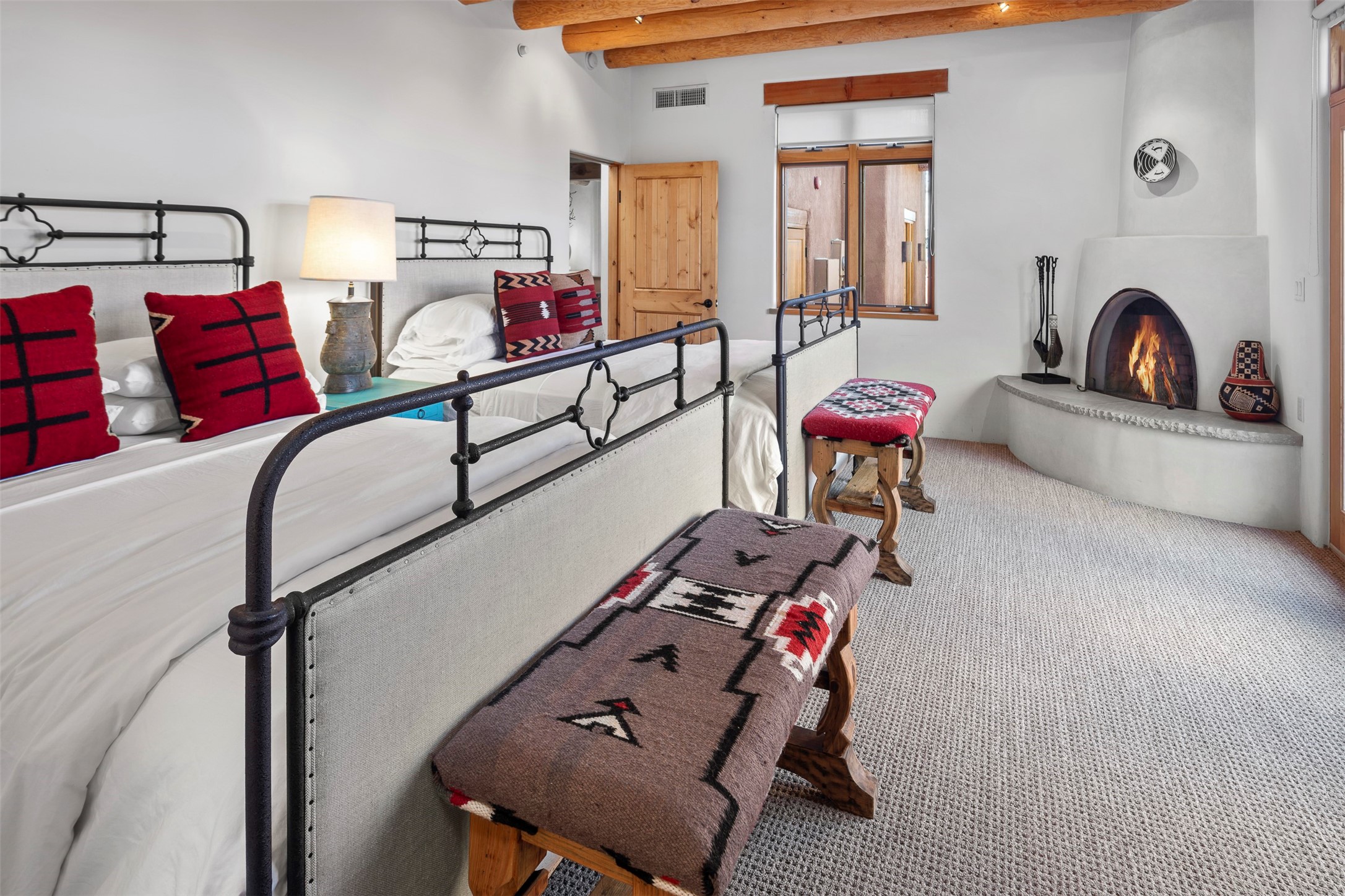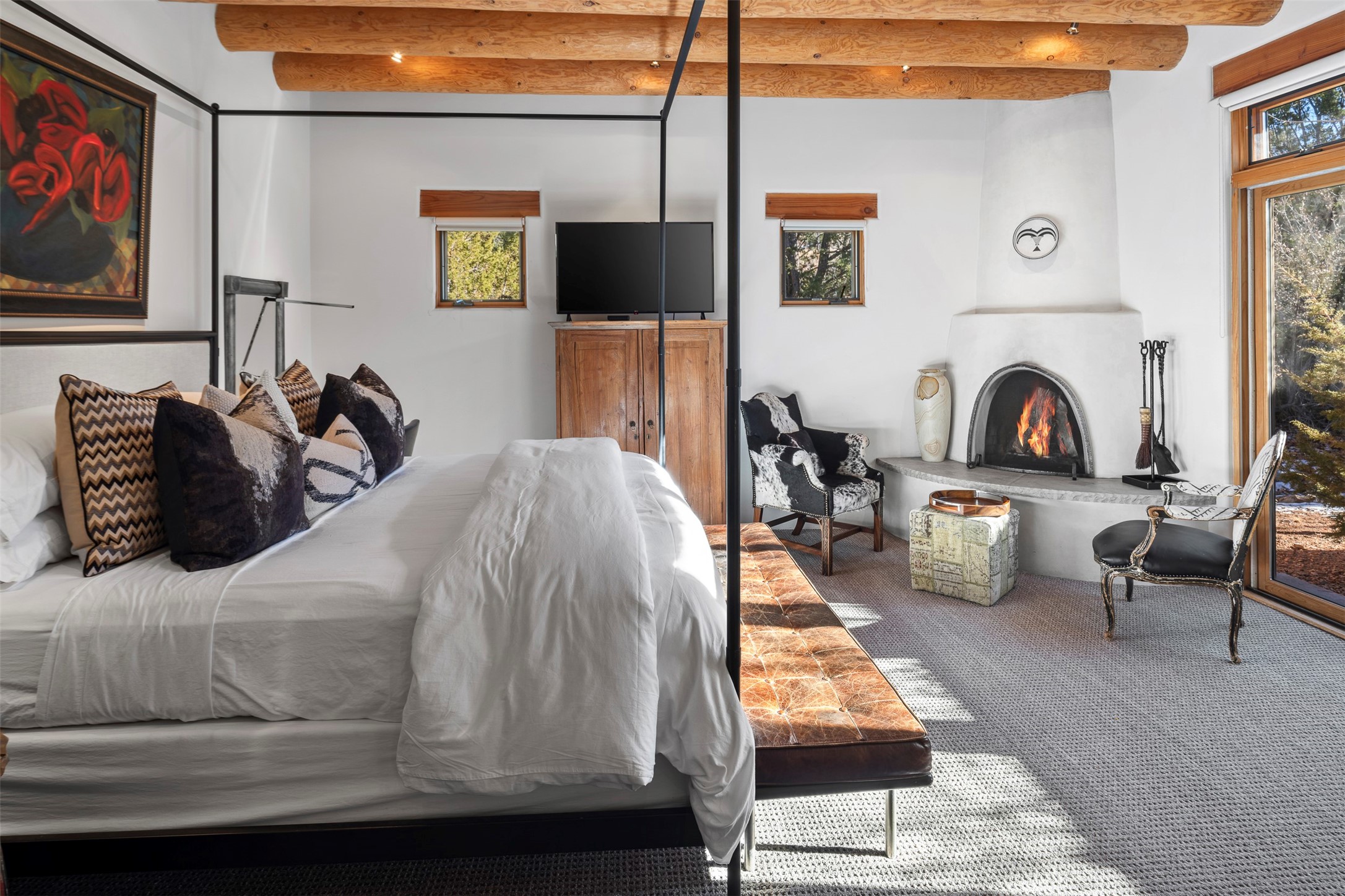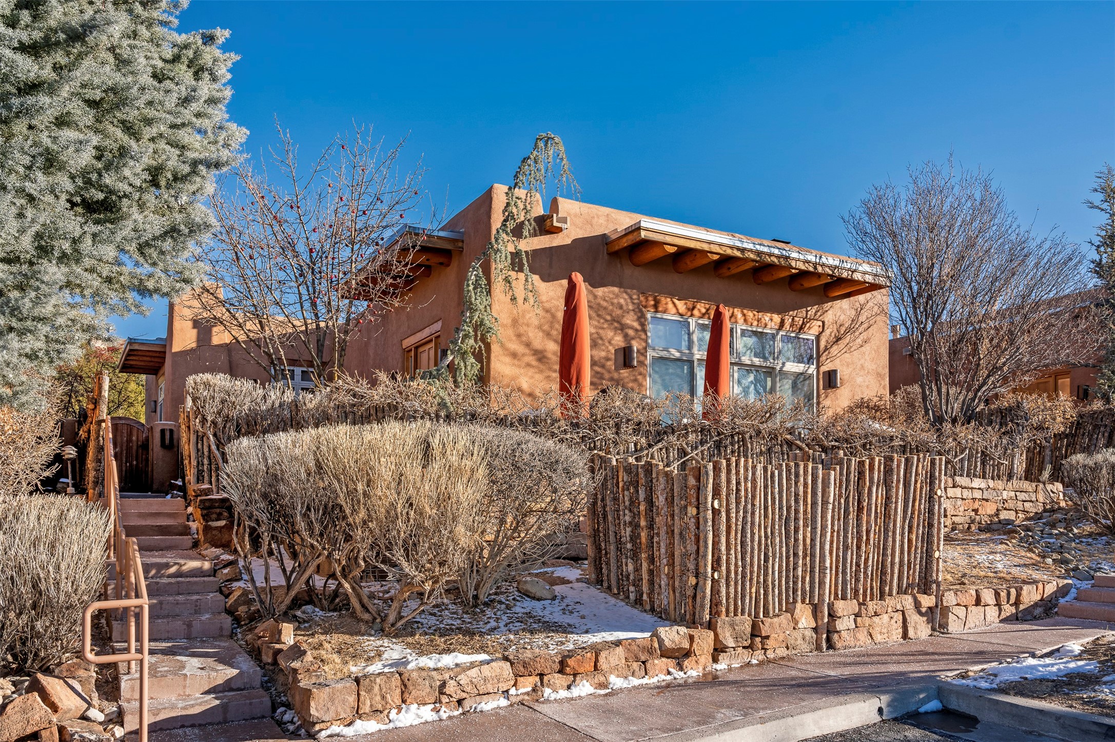 Nestled within the exclusive Bishop's Lodge Villas, just 2.5 miles north of the historic Santa Fe Plaza, this impeccably renovated villa blends the soul of traditional Pueblo architecture with the elegance of contemporary design. Adjacent to 200 acres of the Santa Fe National Forest, the property offers both a serene escape into nature and effortless access to the city's renowned cultural heartbeat. Spanning approximately 1,800 square feet, this freestanding unit enjoys extraordinary privacy, uninterrupted mountain views, and the coveted amenities of a gated community neighboring the world-class Bishop's Lodge Resort, managed by Auberge. Residents enjoy access to fine dining, a luxurious spa, equestrian facilities, and a sparkling community pool set against panoramic vistas. Inside, the villa reflects Santa Fe's timeless character with soaring ceilings, exposed vigas, hand-troweled plaster walls, and tile floors. A newly redesigned living room features floor-to-ceiling windows framing the desert landscape and a dramatic fireplace anchoring the space. Just above, the gourmet kitchen seamlessly opens to the dining area, creating a fluid setting for entertaining. Each of the two bedrooms is a private sanctuary, with kiva fireplaces, en-suite baths, and doors opening to secluded patios where desert breezes and vivid sunsets become part of the daily rhythm. Thoughtful upgrades--including a new roof, central HVAC, and modern appliances--make this residence move-in ready, while recent enhancements preserve its rustic yet refined aesthetic. Step outside to discover patios bordered by native landscaping, ideal for morning coffee, alfresco dining, or evenings spent under the brilliant New Mexico sky. For the adventurous spirit, hiking trails begin just beyond your doorstep, weaving through the protected wilderness of the National Forest.