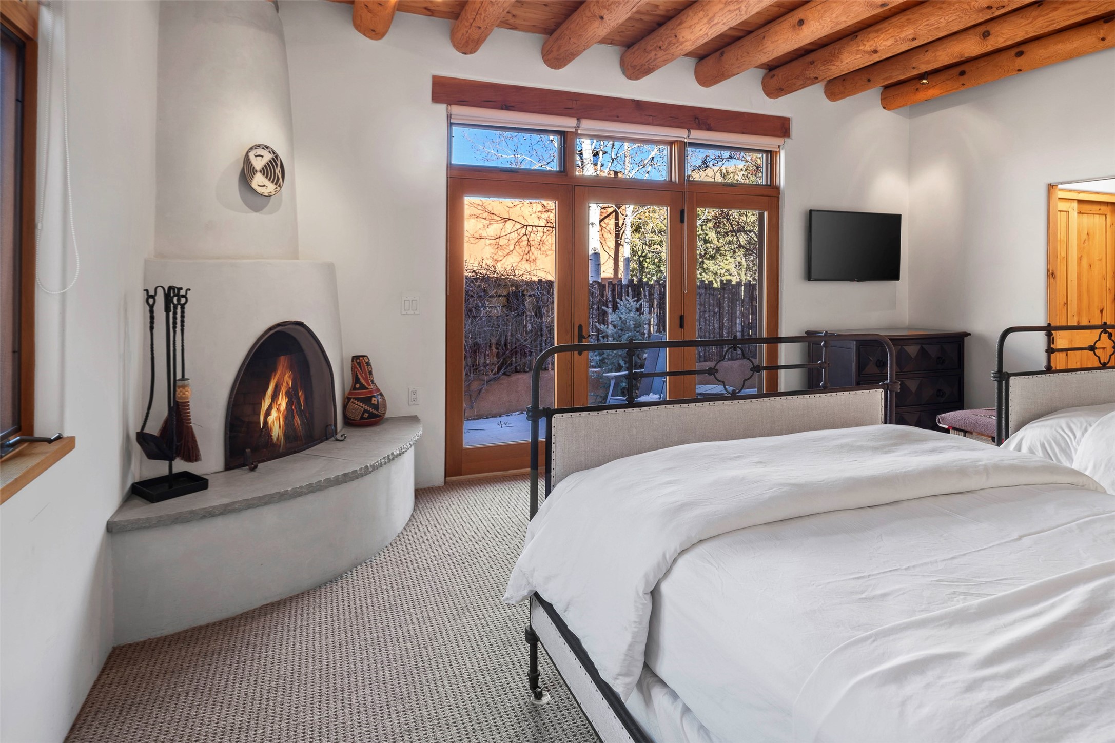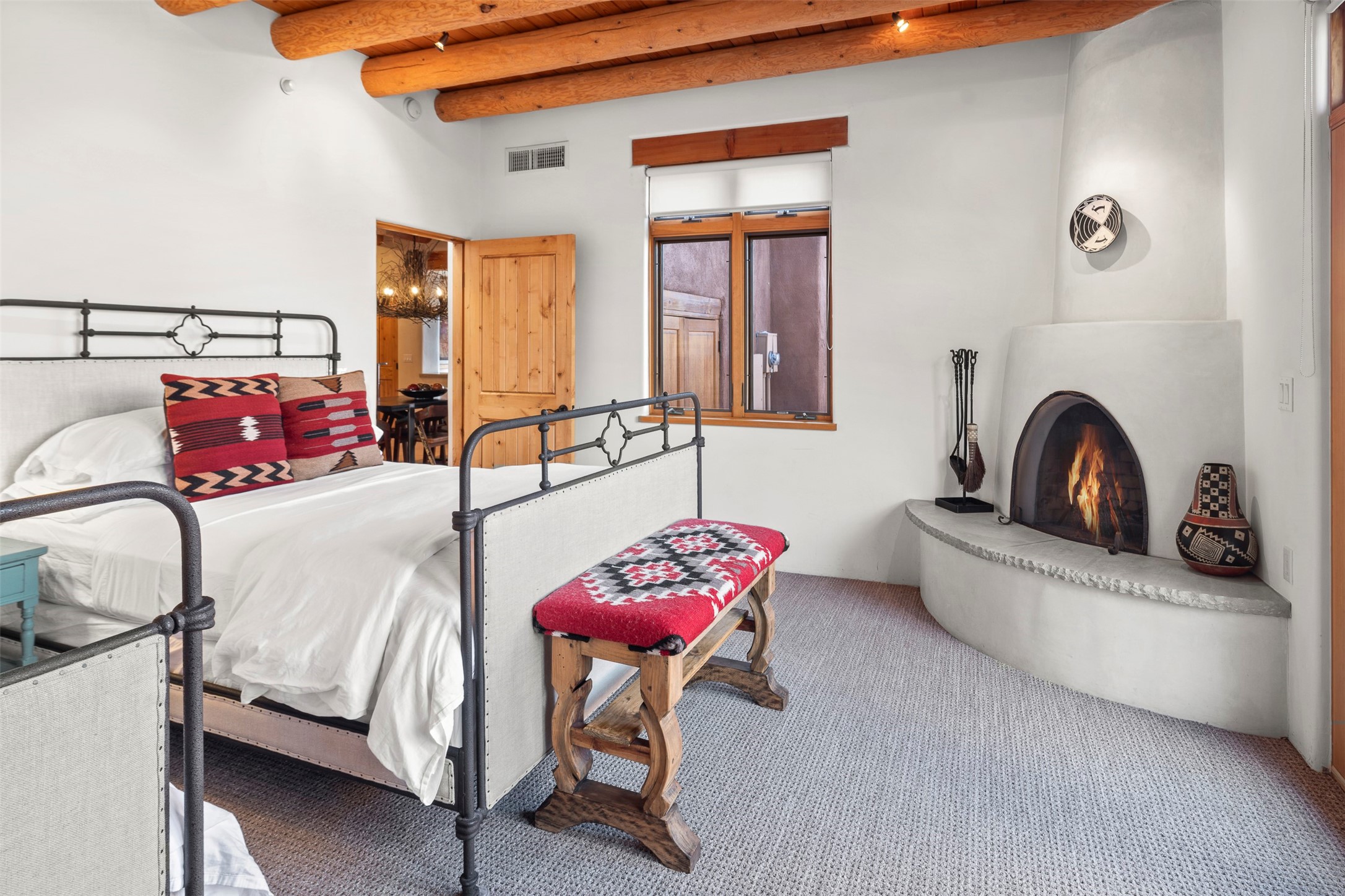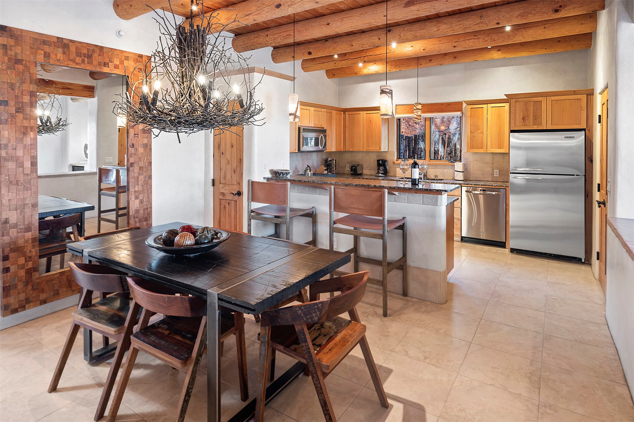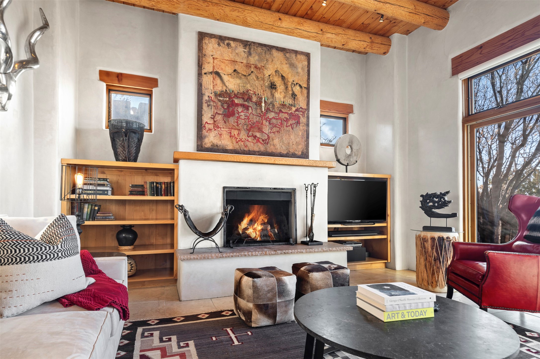 Nestled within the exclusive Bishop's Lodge Villas, just 2.5 miles north of the historic Santa Fe Plaza, this impeccably renovated villa blends the soul of traditional Pueblo architecture with the elegance of contemporary design. Adjacent to 200 acres of the Santa Fe National Forest, the property offers both a serene escape into nature and effortless access to the city's renowned cultural heartbeat. Spanning approximately 1,800 square feet, this freestanding unit enjoys extraordinary privacy, uninterrupted mountain views, and the coveted amenities of a gated community neighboring the world-class Bishop's Lodge Resort, managed by Auberge. Residents enjoy access to fine dining, a luxurious spa, equestrian facilities, and a sparkling community pool set against panoramic vistas. Inside, the villa reflects Santa Fe's timeless character with soaring ceilings, exposed vigas, hand-troweled plaster walls, and tile floors. A newly redesigned living room features floor-to-ceiling windows framing the desert landscape and a dramatic fireplace anchoring the space. Just above, the gourmet kitchen seamlessly opens to the dining area, creating a fluid setting for entertaining. Each of the two bedrooms is a private sanctuary, with kiva fireplaces, en-suite baths, and doors opening to secluded patios where desert breezes and vivid sunsets become part of the daily rhythm. Thoughtful upgrades--including a new roof, central HVAC, and modern appliances--make this residence move-in ready, while recent enhancements preserve its rustic yet refined aesthetic. Step outside to discover patios bordered by native landscaping, ideal for morning coffee, alfresco dining, or evenings spent under the brilliant New Mexico sky. For the adventurous spirit, hiking trails begin just beyond your doorstep, weaving through the protected wilderness of the National Forest.
