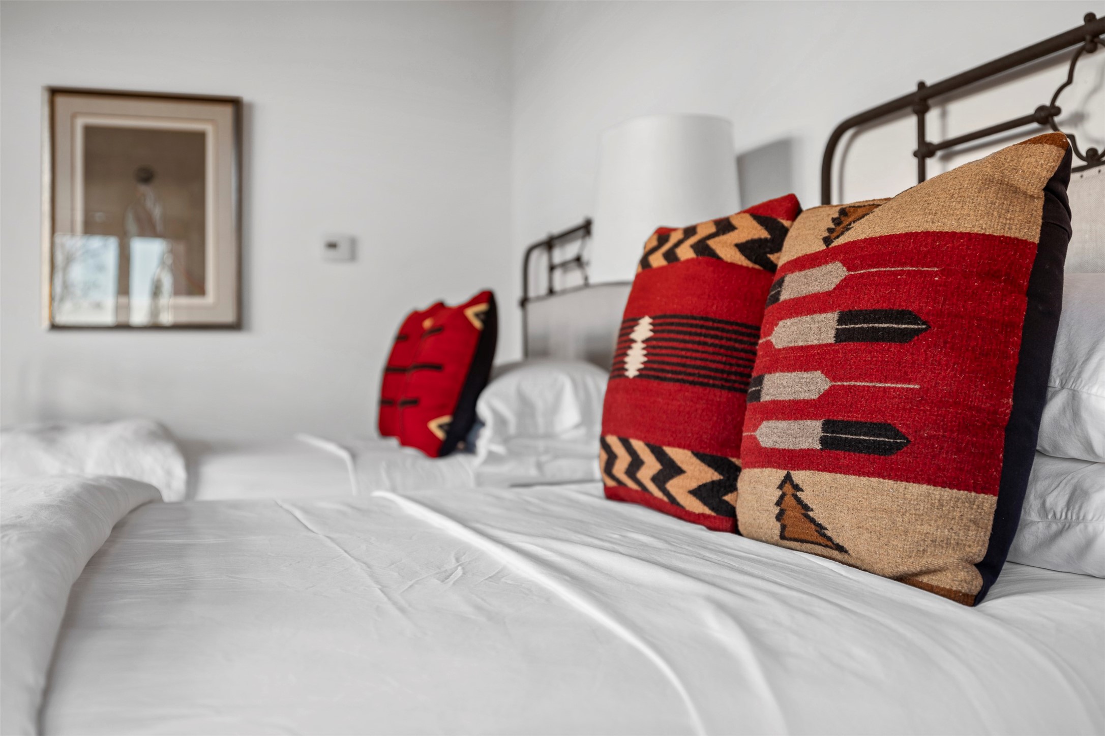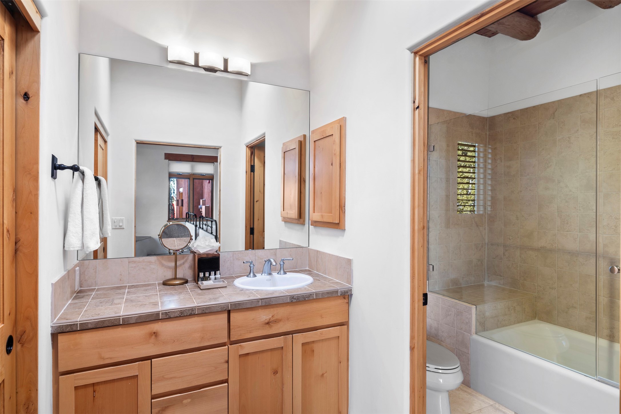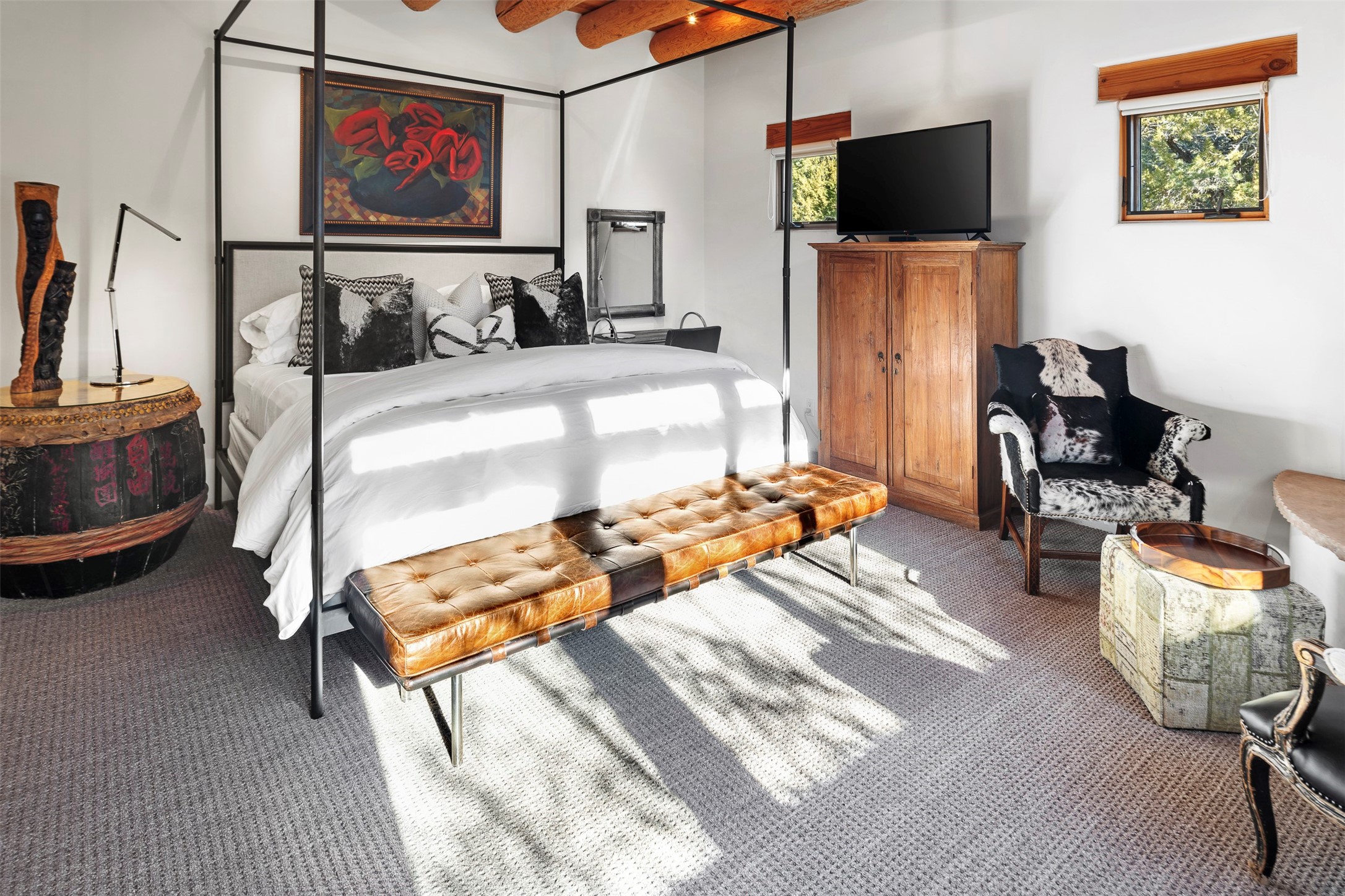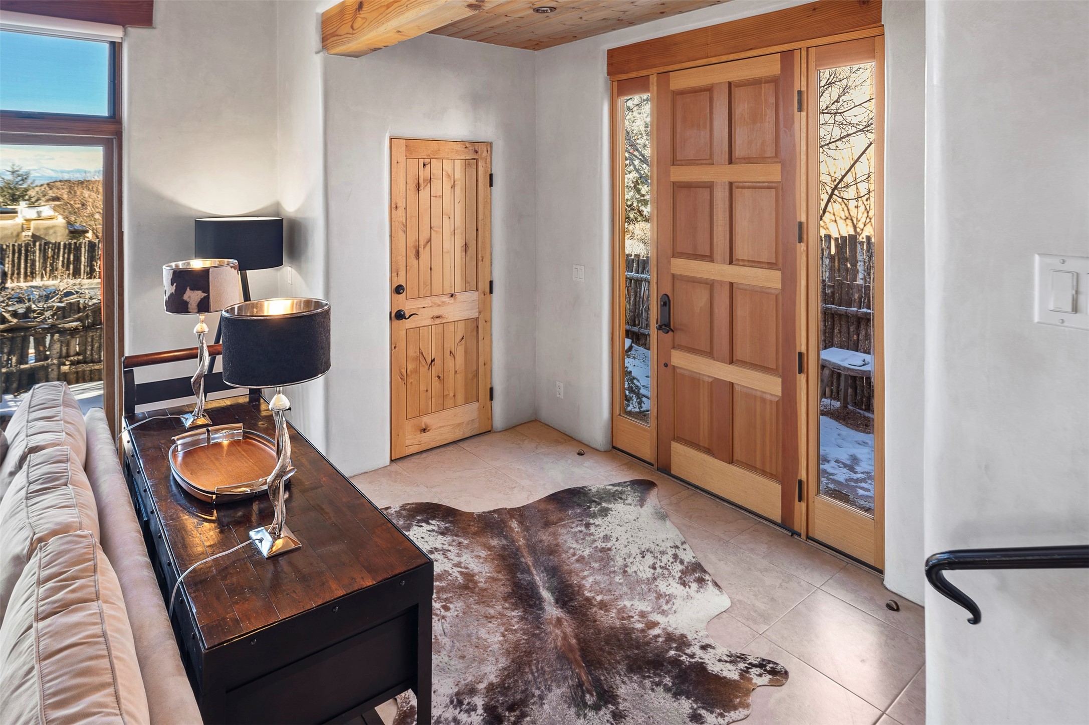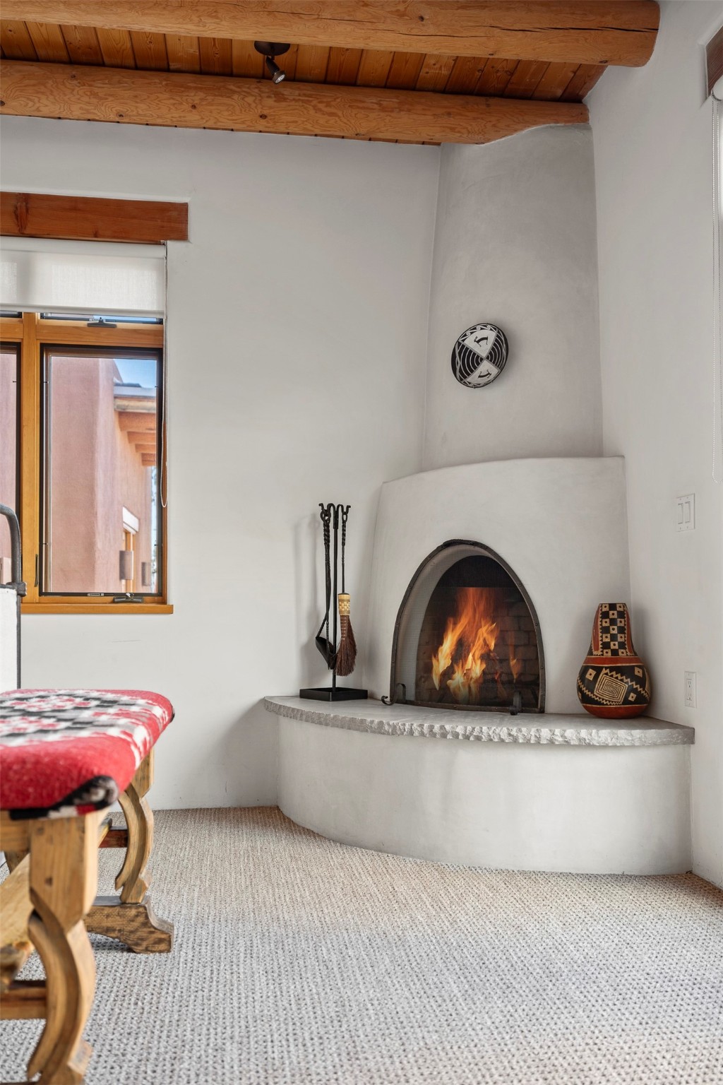 Nestled within the exclusive Bishop's Lodge Villas, just 2.5 miles north of the historic Santa Fe Plaza, this impeccably renovated villa blends the soul of traditional Pueblo architecture with the elegance of contemporary design. Adjacent to 200 acres of the Santa Fe National Forest, the property offers both a serene escape into nature and effortless access to the city's renowned cultural heartbeat. Spanning approximately 1,800 square feet, this freestanding unit enjoys extraordinary privacy, uninterrupted mountain views, and the coveted amenities of a gated community neighboring the world-class Bishop's Lodge Resort, managed by Auberge. Residents enjoy access to fine dining, a luxurious spa, equestrian facilities, and a sparkling community pool set against panoramic vistas. Inside, the villa reflects Santa Fe's timeless character with soaring ceilings, exposed vigas, hand-troweled plaster walls, and tile floors. A newly redesigned living room features floor-to-ceiling windows framing the desert landscape and a dramatic fireplace anchoring the space. Just above, the gourmet kitchen seamlessly opens to the dining area, creating a fluid setting for entertaining. Each of the two bedrooms is a private sanctuary, with kiva fireplaces, en-suite baths, and doors opening to secluded patios where desert breezes and vivid sunsets become part of the daily rhythm. Thoughtful upgrades--including a new roof, central HVAC, and modern appliances--make this residence move-in ready, while recent enhancements preserve its rustic yet refined aesthetic. Step outside to discover patios bordered by native landscaping, ideal for morning coffee, alfresco dining, or evenings spent under the brilliant New Mexico sky. For the adventurous spirit, hiking trails begin just beyond your doorstep, weaving through the protected wilderness of the National Forest.