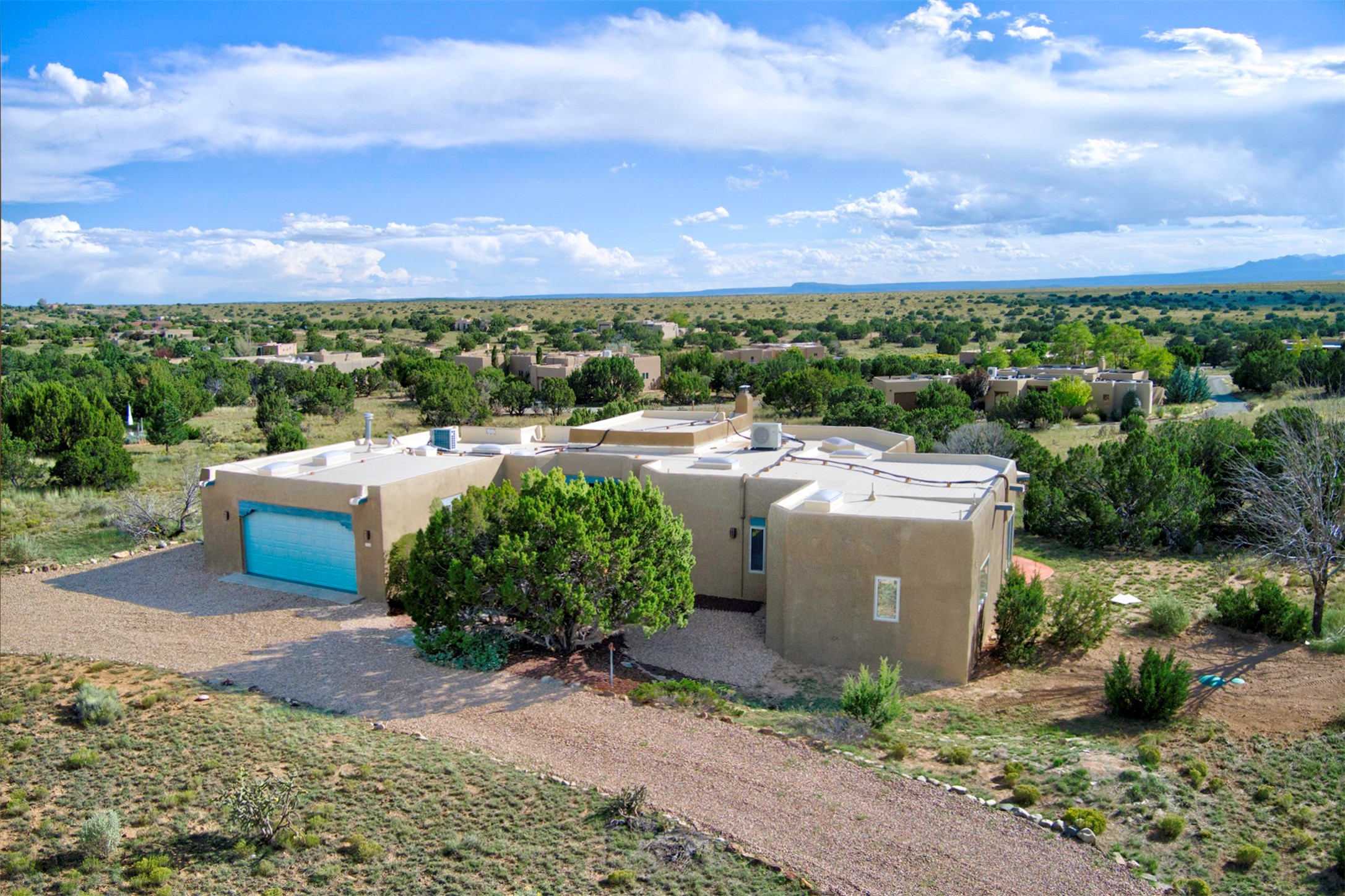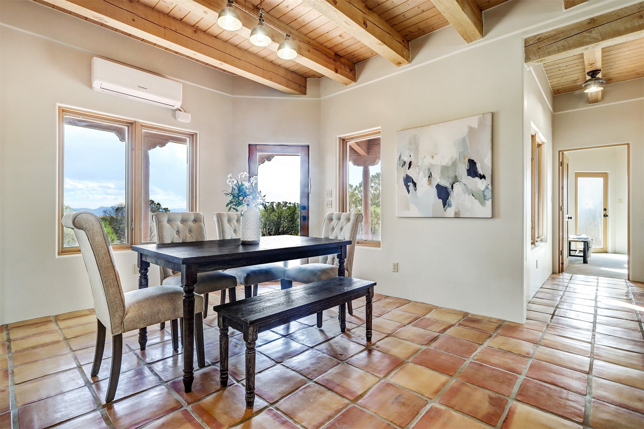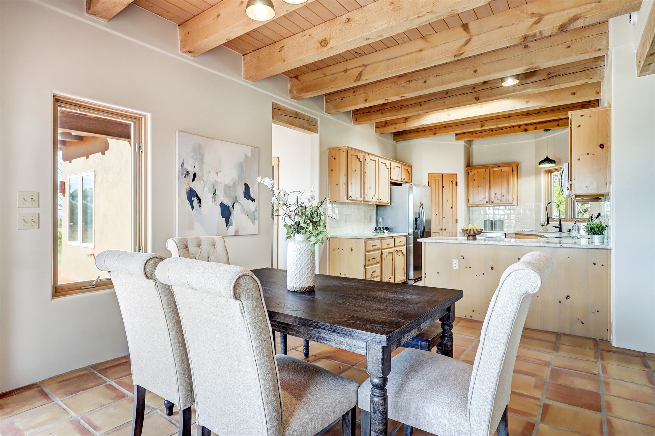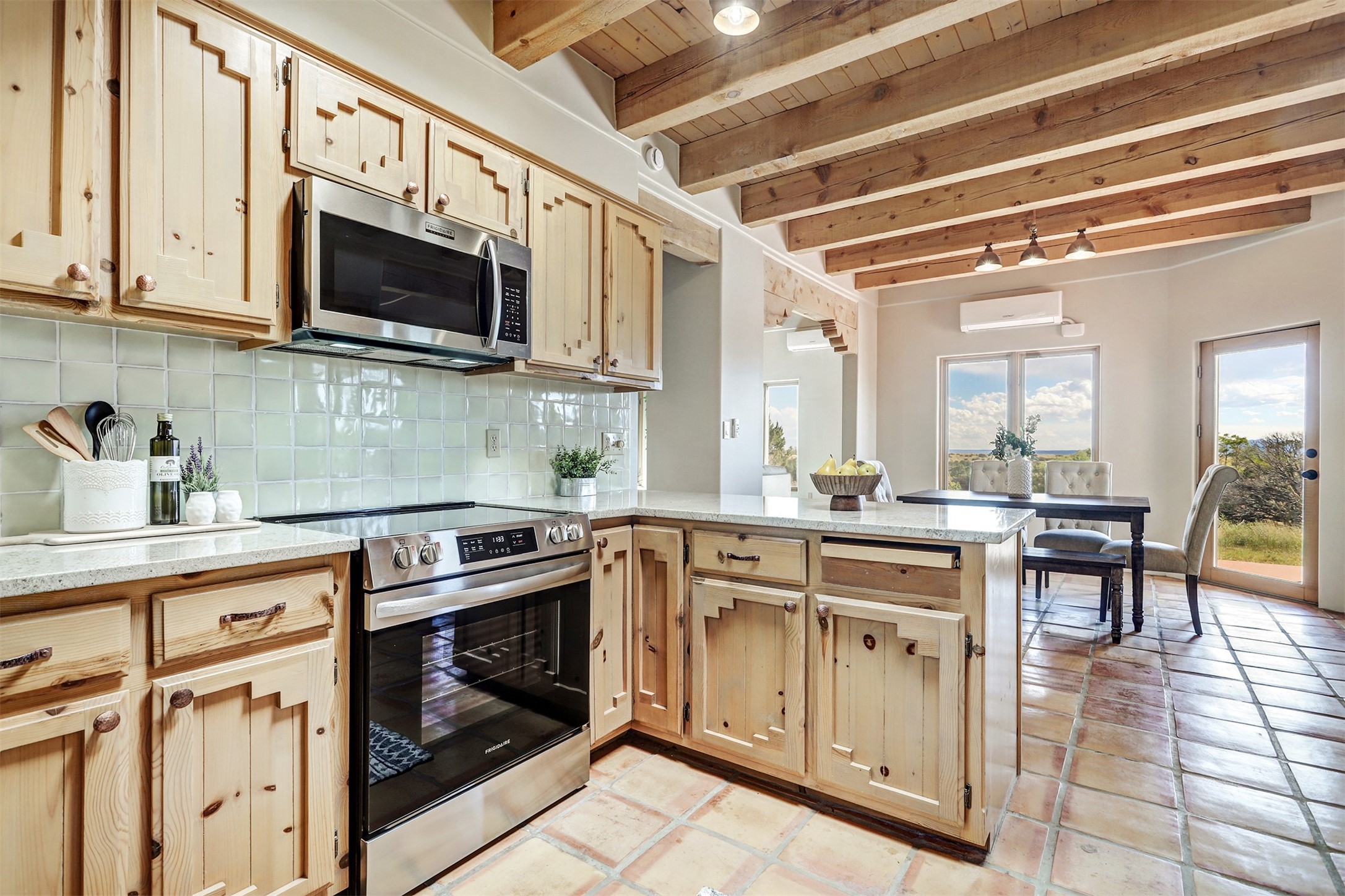 Step into this enchanting single-story home in Eldorado, where timeless Santa Fe character meets thoughtful modern upgrades. From the moment you enter, rich Saltillo tile and a stunning kiva fireplace set the tone, creating warmth and authenticity throughout. Vibrant colors, beautiful light fixtures, wood ceilings, beams, and corbels fill the home with unmistakable Santa Fe charm. The kitchen is truly the heart of the home -- beautifully refreshed with new countertops, a handmade backsplash, and new stainless steel appliances that make cooking a joy. The space itself glows with natural light and character. This home offers four bedrooms, providing flexibility for family, guests, or creative pursuits. The fourth bedroom can easily serve as a home office, studio, or be adapted for many possibilities. Two bathrooms blend comfort and style with updated finishes. Additional upgrades include a new TPO roof, fresh stucco, new hot water heater, mini-split system, fresh interior and exterior paint, and plush carpeting in the bedrooms. Every update was made with care, ensuring you can move right in and enjoy. Beyond the home, Eldorado offers a vibrant lifestyle with a wealth of amenities. The Community Center features a swimming pool, tennis and pickleball courts, basketball courts, a playground, and a dog park. Residents enjoy access to hiking and biking paths, a disc golf course, and the Community Preserve. The area hosts a variety of events, including yoga, Tai Chi, and hiking groups, fostering a strong sense of community. Santa Fe's world-class dining, galleries, and festivals are just a short drive away. Beautifully updated and thoughtfully designed, this Eldorado gem is ready to welcome you home.