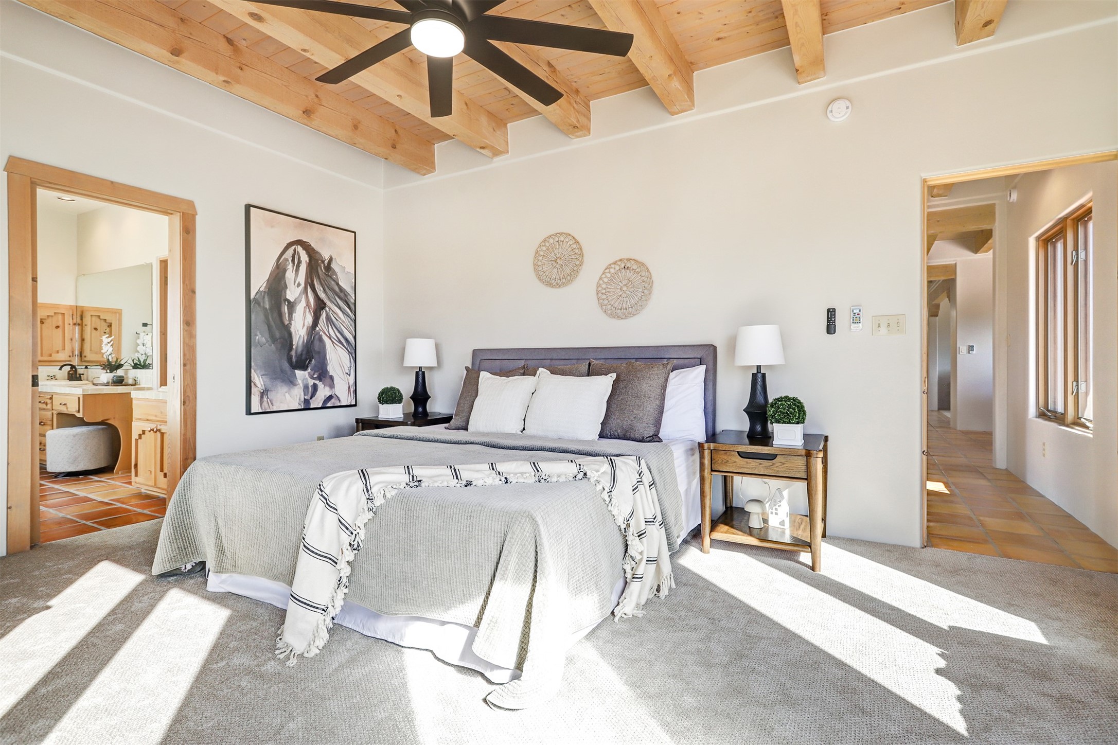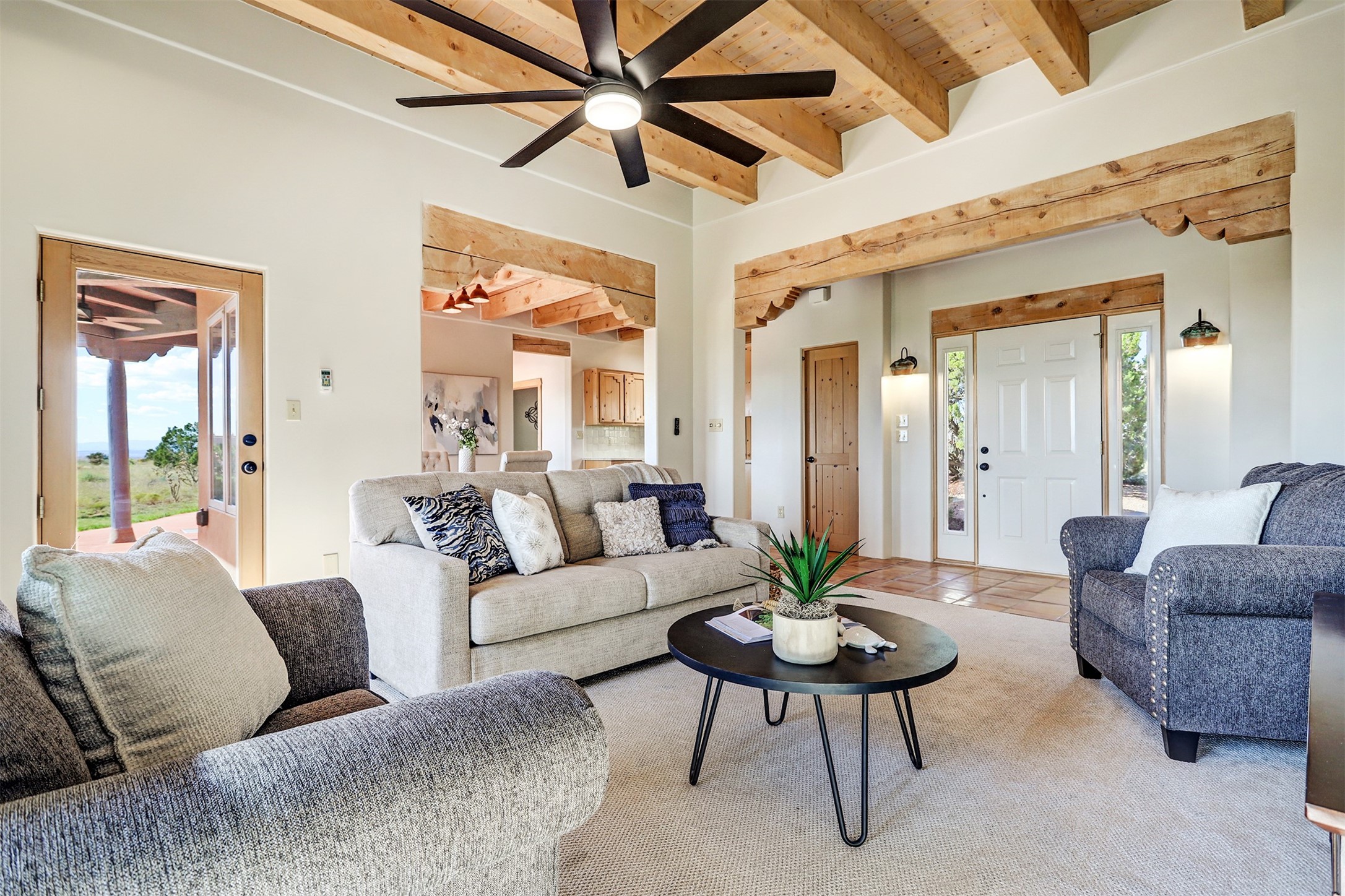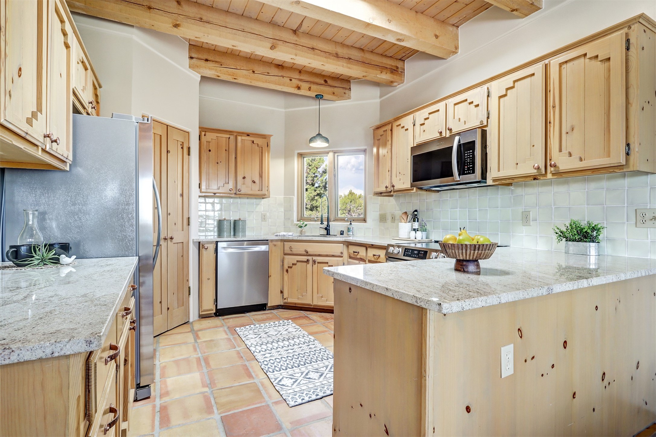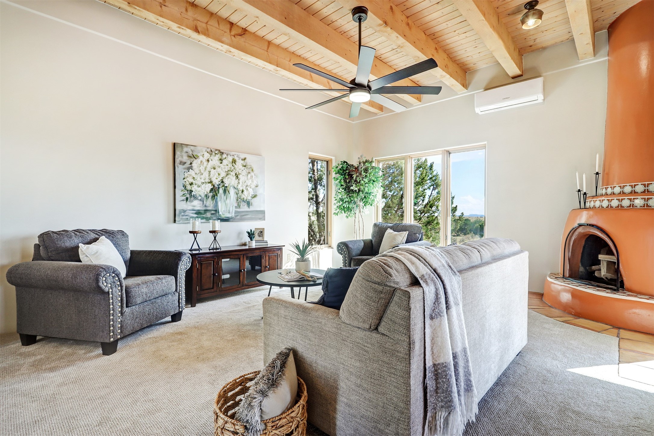 Step into this enchanting single-story home in Eldorado, where timeless Santa Fe character meets thoughtful modern upgrades. From the moment you enter, rich Saltillo tile and a stunning kiva fireplace set the tone, creating warmth and authenticity throughout. Vibrant colors, beautiful light fixtures, wood ceilings, beams, and corbels fill the home with unmistakable Santa Fe charm. The kitchen is truly the heart of the home -- beautifully refreshed with new countertops, a handmade backsplash, and new stainless steel appliances that make cooking a joy. The space itself glows with natural light and character. This home offers four bedrooms, providing flexibility for family, guests, or creative pursuits. The fourth bedroom can easily serve as a home office, studio, or be adapted for many possibilities. Two bathrooms blend comfort and style with updated finishes. Additional upgrades include a new TPO roof, fresh stucco, new hot water heater, mini-split system, fresh interior and exterior paint, and plush carpeting in the bedrooms. Every update was made with care, ensuring you can move right in and enjoy. Beyond the home, Eldorado offers a vibrant lifestyle with a wealth of amenities. The Community Center features a swimming pool, tennis and pickleball courts, basketball courts, a playground, and a dog park. Residents enjoy access to hiking and biking paths, a disc golf course, and the Community Preserve. The area hosts a variety of events, including yoga, Tai Chi, and hiking groups, fostering a strong sense of community. Santa Fe's world-class dining, galleries, and festivals are just a short drive away. Beautifully updated and thoughtfully designed, this Eldorado gem is ready to welcome you home.