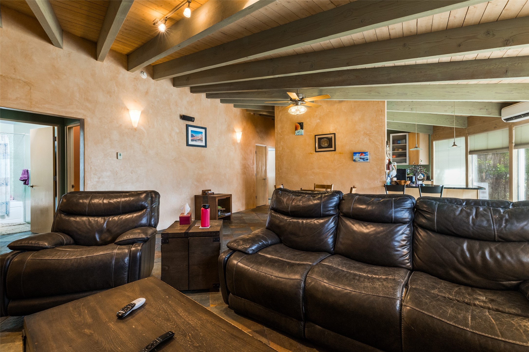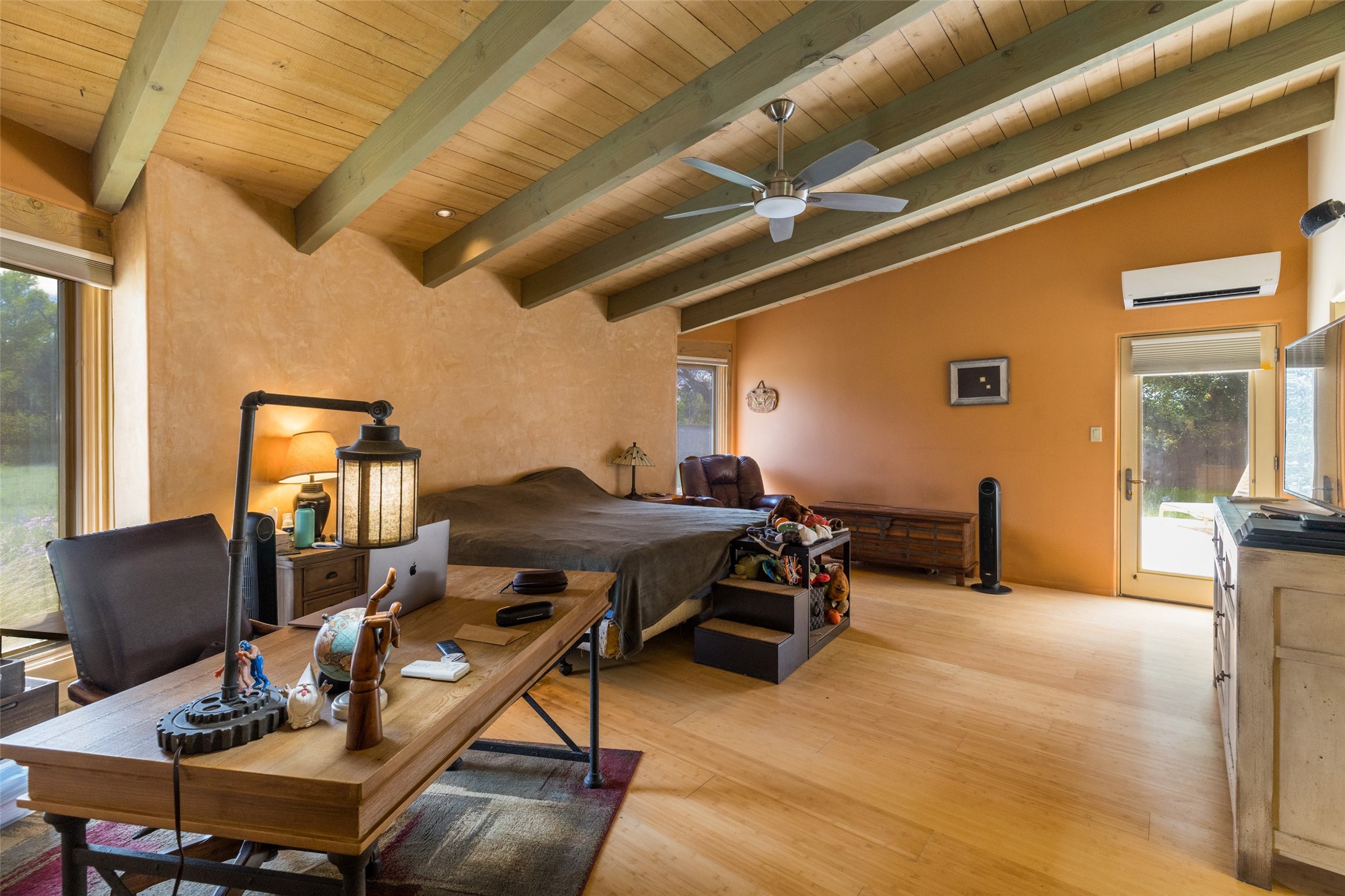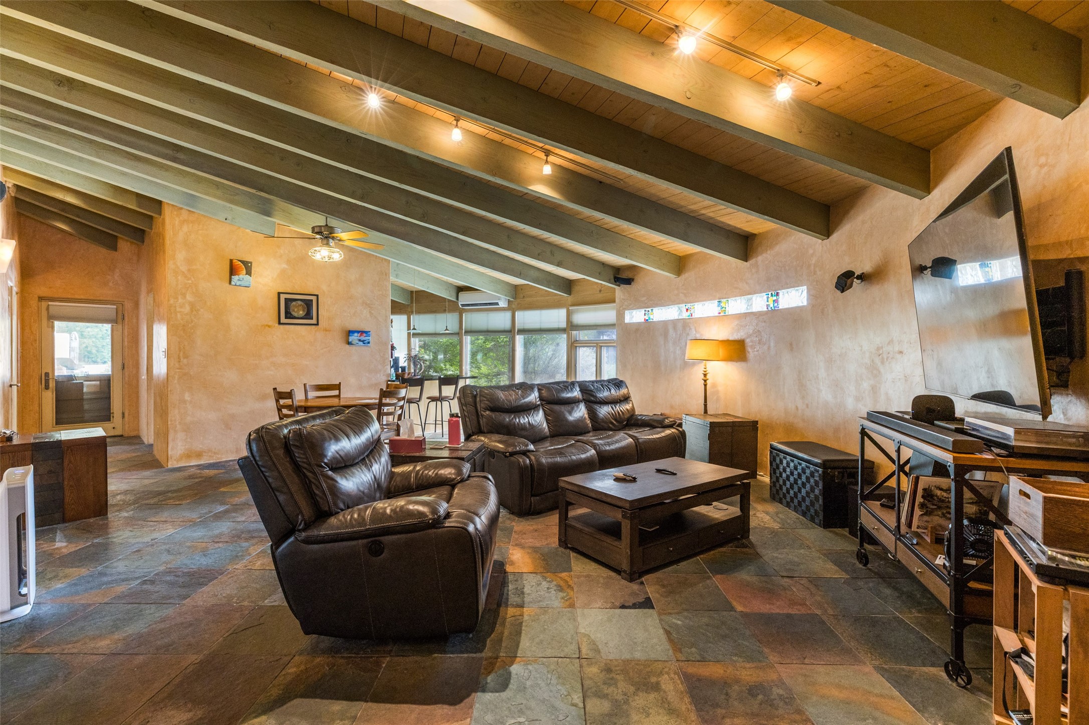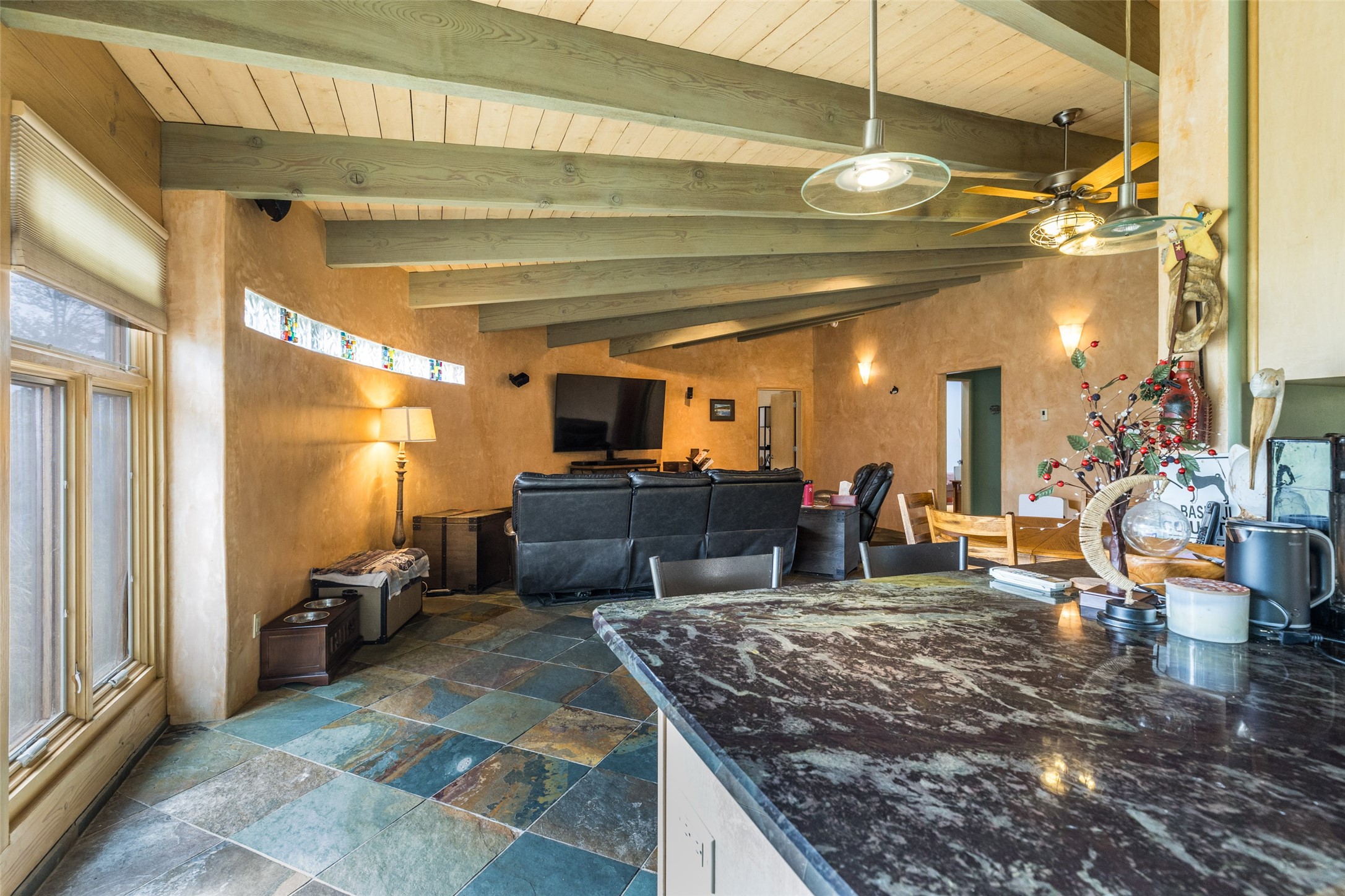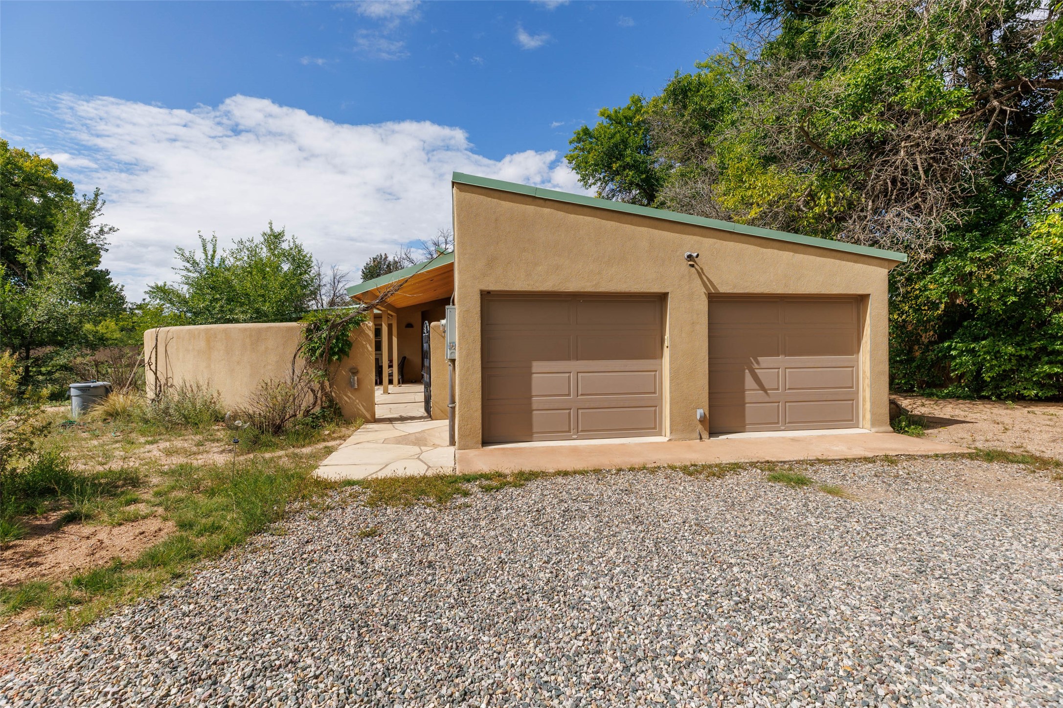 Located just 20 minutes from both Los Alamos & Santa Fe, within the Nambe/Pojoaque greenbelt, this unique property sits on over an acre of land with water rights and a valve for flood irrigation. Outdoors, enjoy mature cottonwoods along with apple, apricot, and pear trees in a lush, meadow-like setting. The Trombe wall in the living area utilizes passive solar principles! The energy-efficient home also features radiant floor heating, mini splits, a durable metal roof, bamboo & slate tile flooring, granite countertops, & wood-beamed ceilings. The open kitchen flows seamlessly into the great room, while the primary suite includes a huge walk-in closet & private patio. Use the heated garage space to park up to four cars or to create a unique studio or flex area. Don't miss this opportunity!