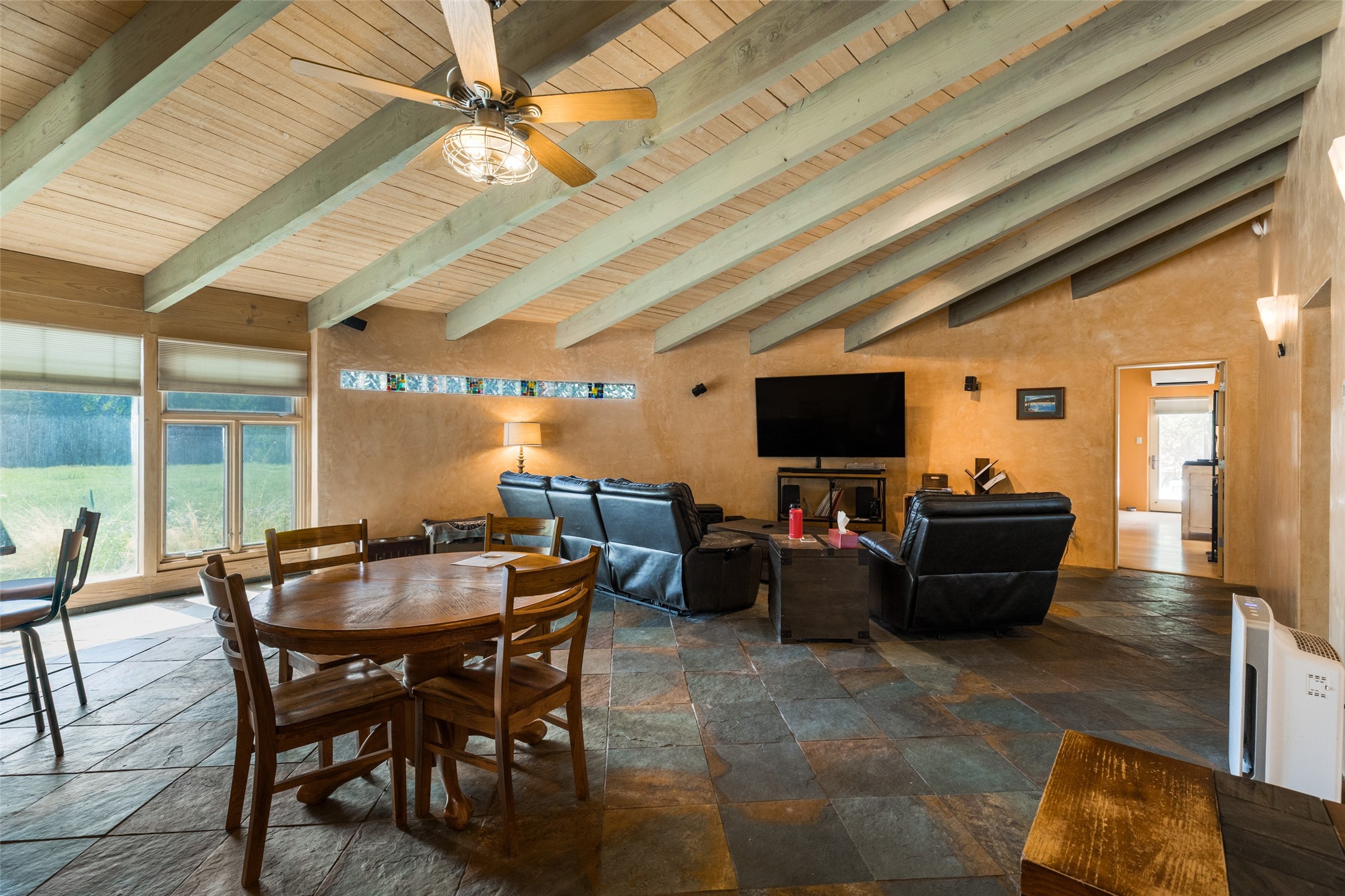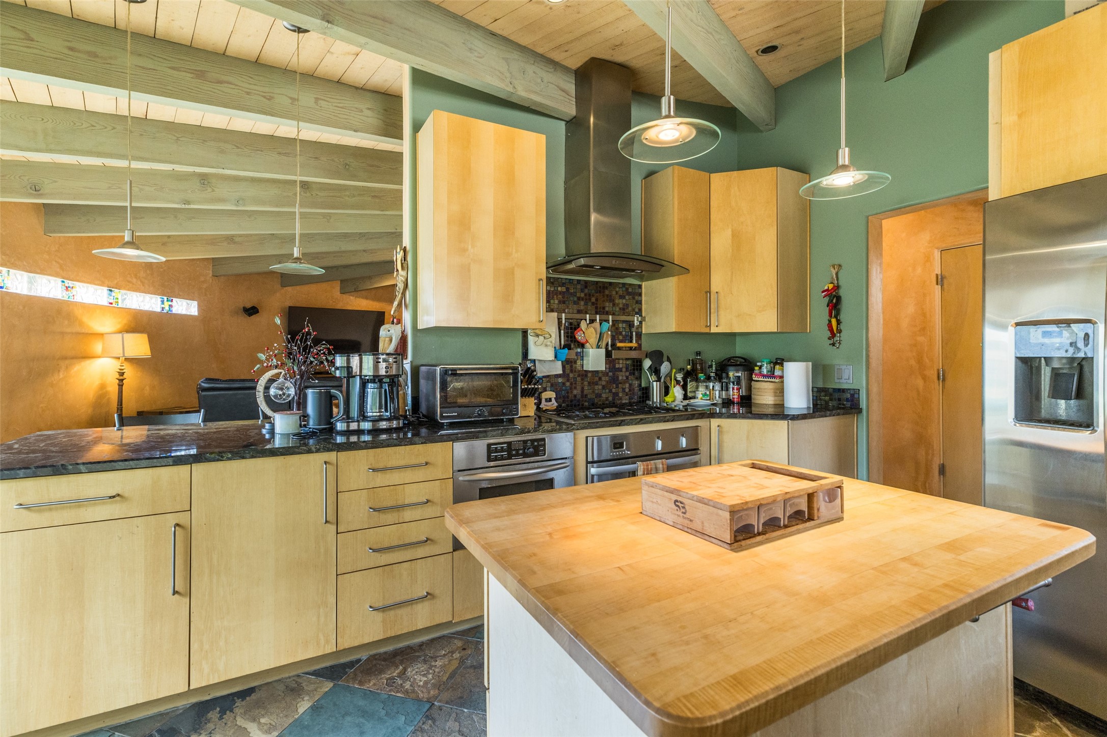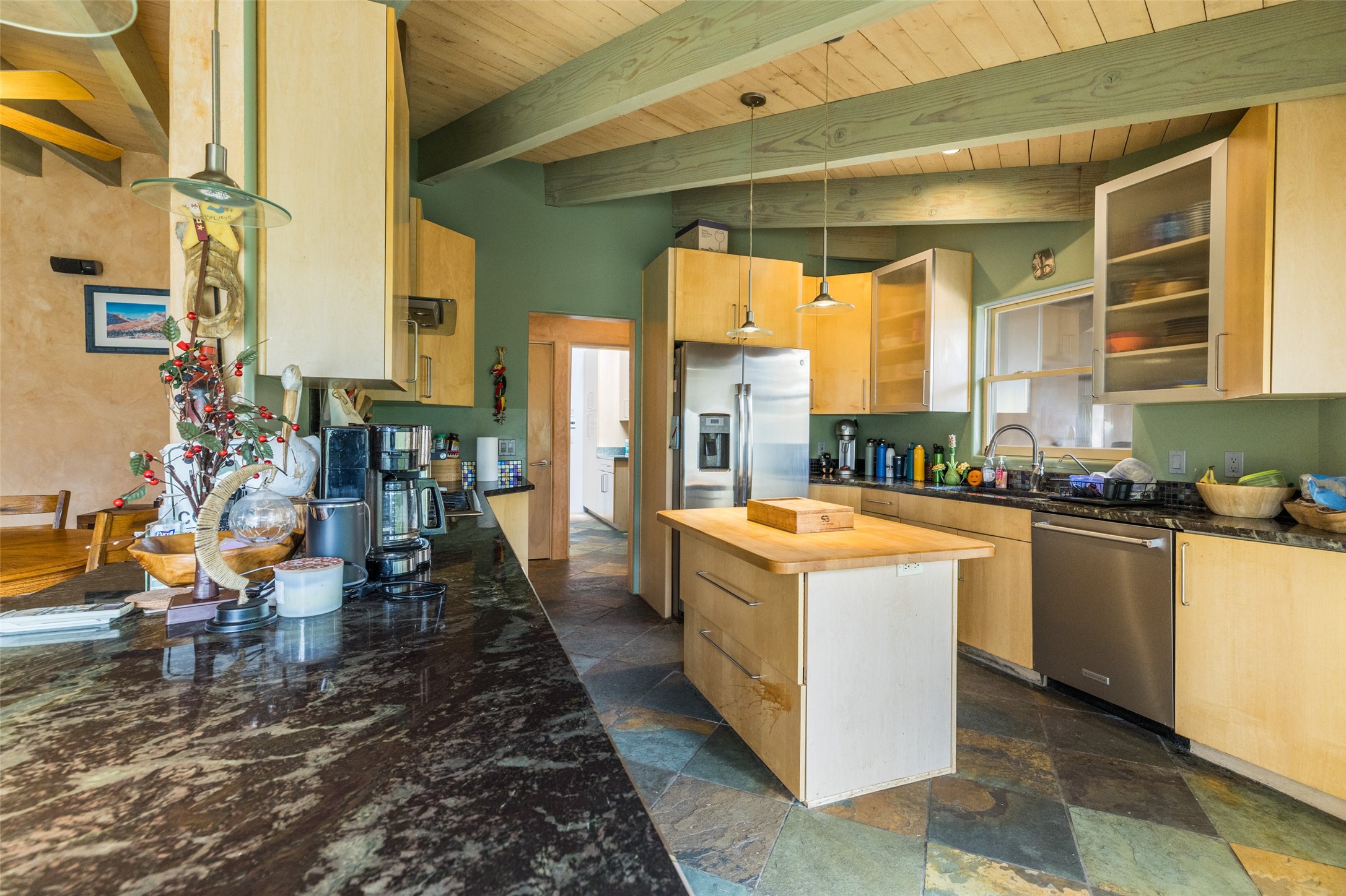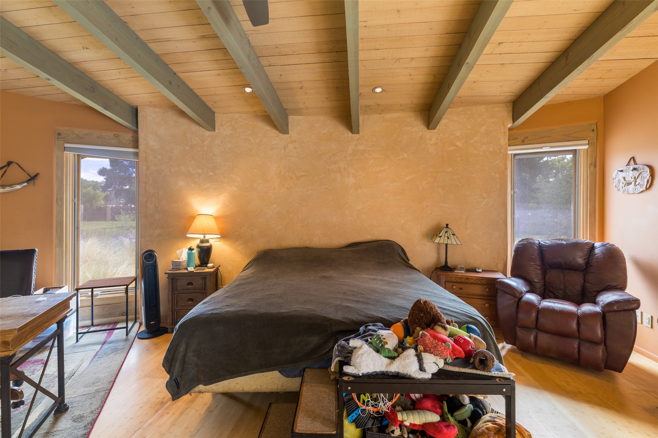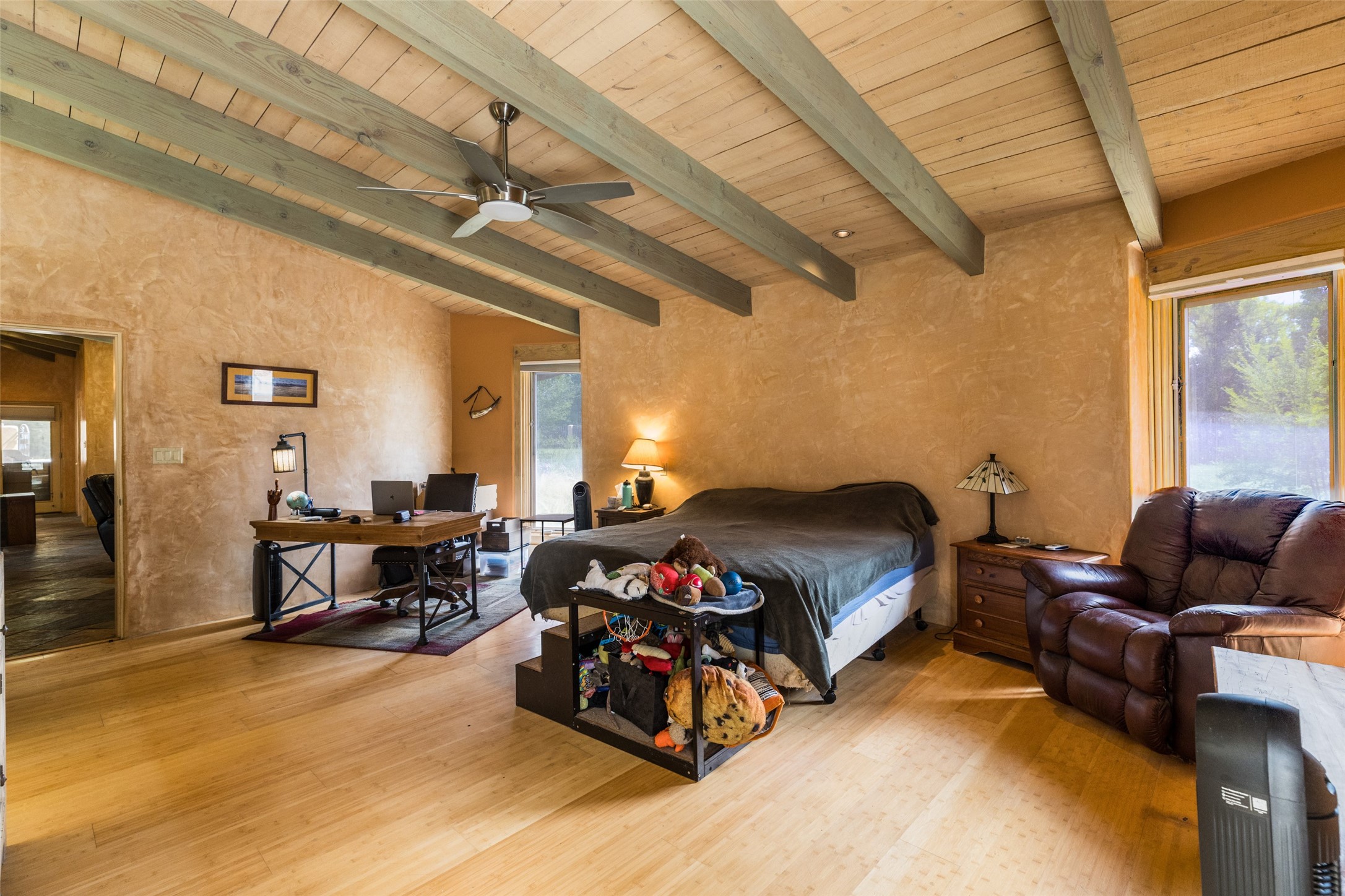 Located just 20 minutes from both Los Alamos & Santa Fe, within the Nambe/Pojoaque greenbelt, this unique property sits on over an acre of land with water rights and a valve for flood irrigation. Outdoors, enjoy mature cottonwoods along with apple, apricot, and pear trees in a lush, meadow-like setting. The Trombe wall in the living area utilizes passive solar principles! The energy-efficient home also features radiant floor heating, mini splits, a durable metal roof, bamboo & slate tile flooring, granite countertops, & wood-beamed ceilings. The open kitchen flows seamlessly into the great room, while the primary suite includes a huge walk-in closet & private patio. Use the heated garage space to park up to four cars or to create a unique studio or flex area. Don't miss this opportunity!