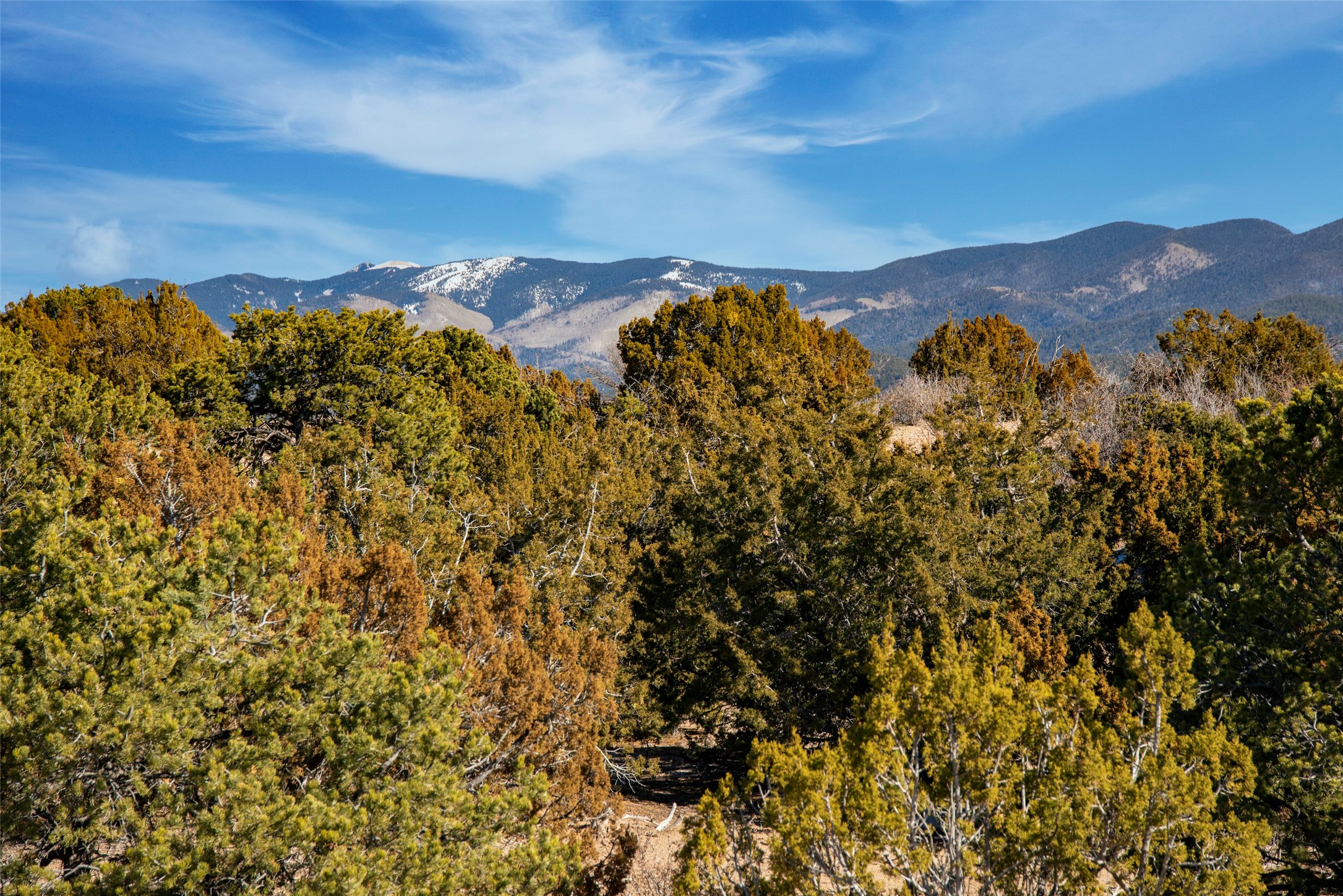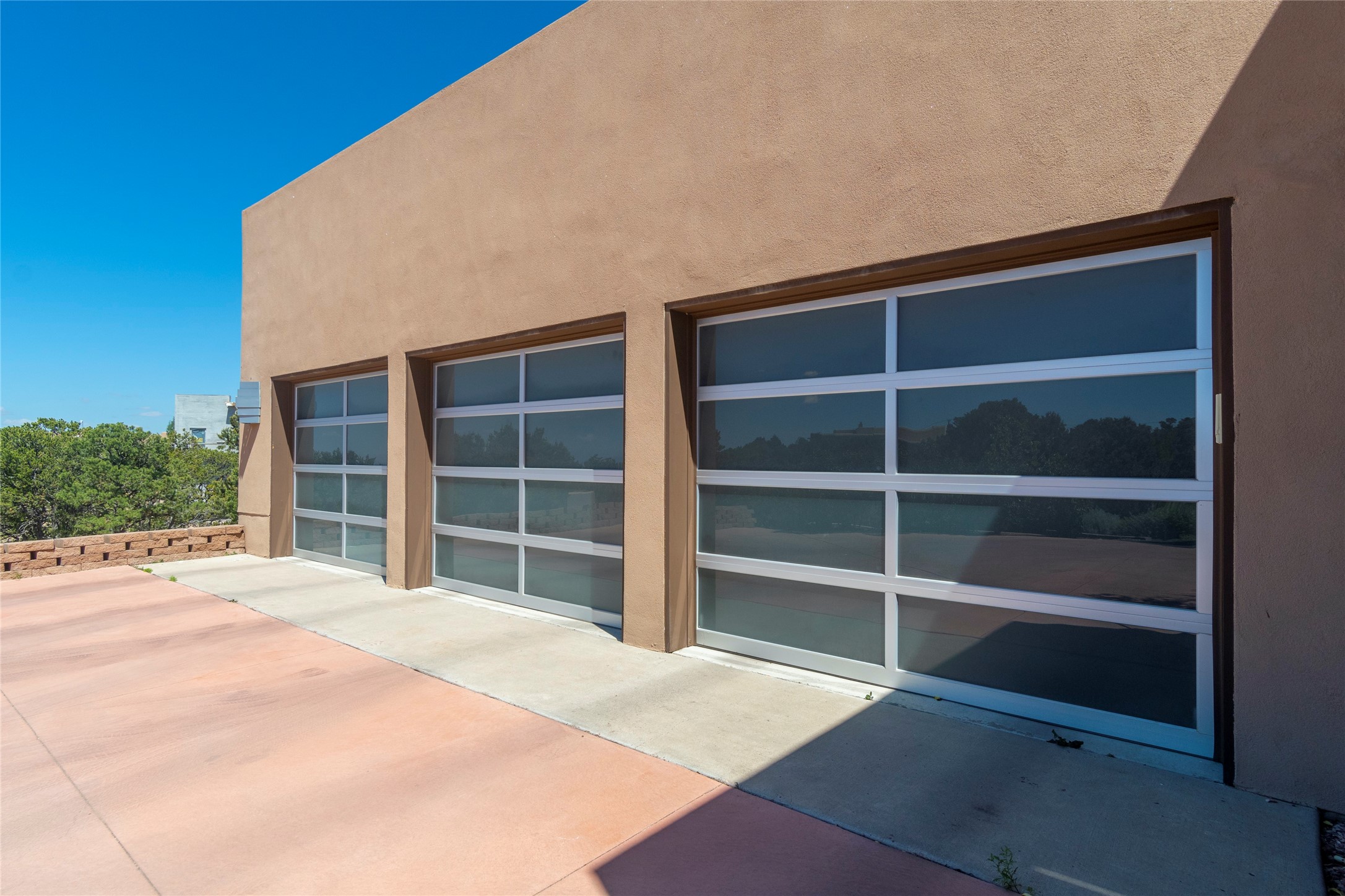 This Michael Bauer custom designed, contemporary, two-story home was built by long time Santa Fe builder, Gary Lincoln, for himself. Known for quality construction and excellent designs, the best finishes and appliances were used in building this stunning home. The 3520 sq ft, open floor plan home is designed for comfortable, easy living and sited perfectly on 2+ acres to take in the breathtaking panoramic mountain views. Striking entry doors lead into the great room where a grand fireplace is a focal point, along with oversized windows that look onto a rooftop deck with fireplace and spectacular mountain views. The kitchen has wall-to-wall windows over the granite countertops on two sides so the chef will never be without a lovely view. A good-sized island with sink, and a walk-in pantry are conveniently located and offer plenty of storage. The appliances are top notch and include a double oven. The portal off the kitchen is the perfect for outdoor entertaining. Adjacent to the kitchen is an office and the master suite with its walk-in closet, beautiful bathroom and private portal with a fireplace. On the other side of the great room are two guest bedrooms each with outside entrances, and a laundry room. The lower level has a spacious den, bathroom, gym, huge storage room, and access to the 3-car garage. Just minutes to the Plaza in Santa Fe, and located in a small, highly desirable gated community, this home has easy access to walking and biking trails.