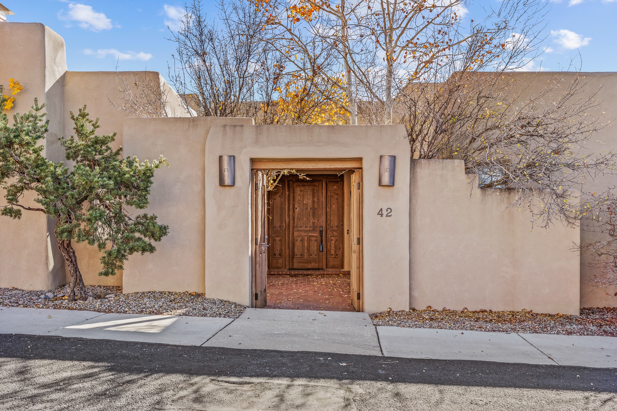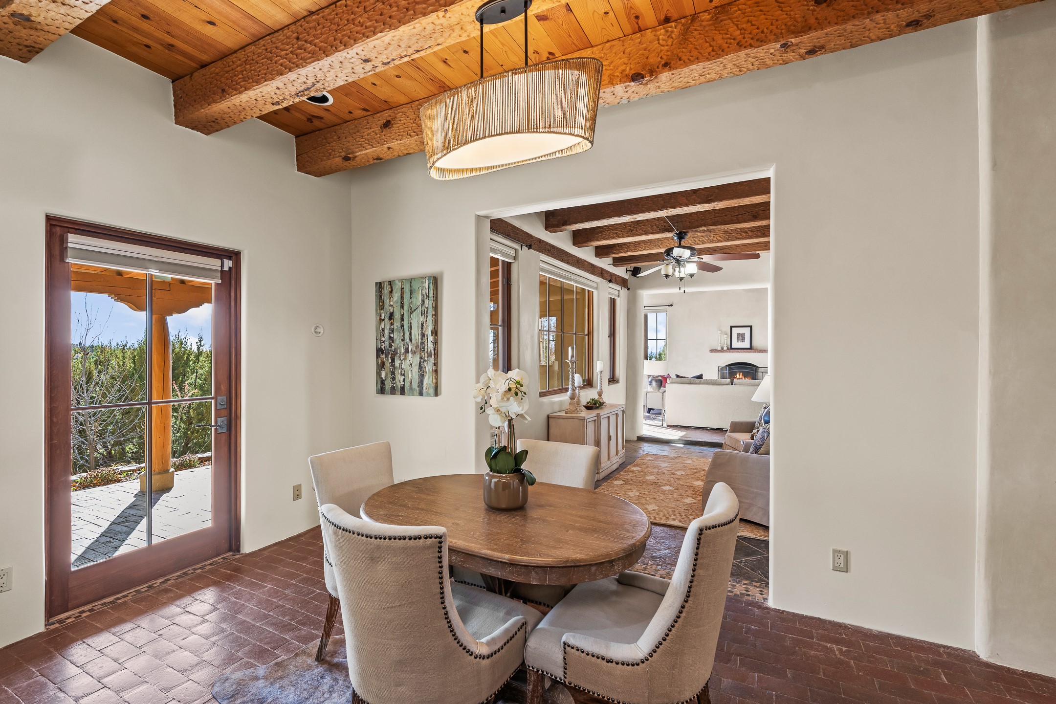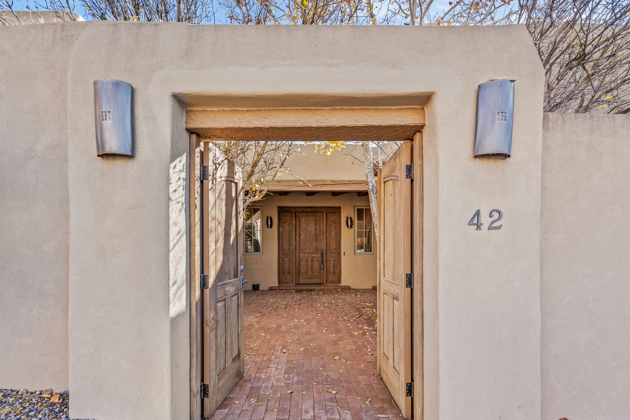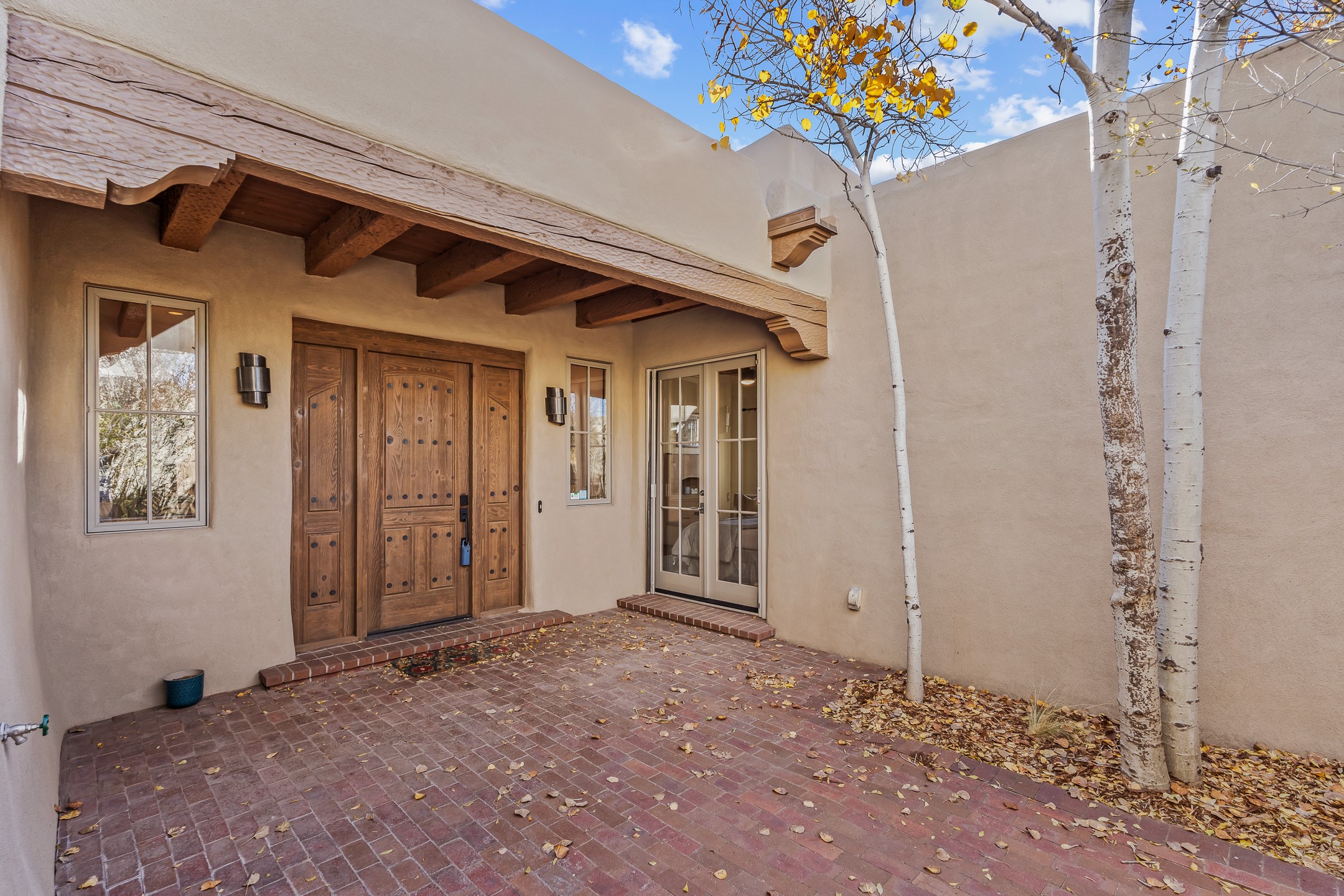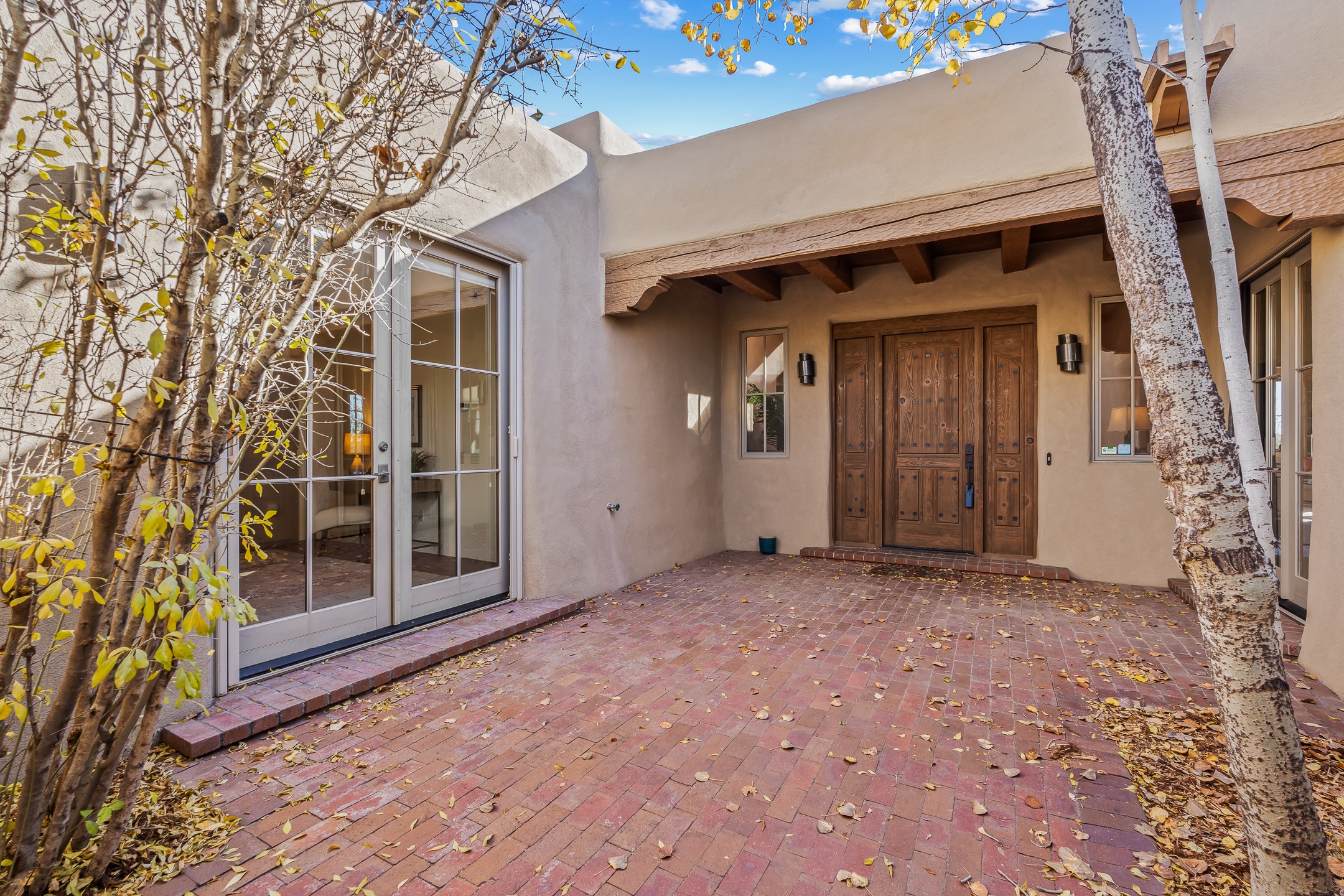 42 E. Va Plaza Nueva offers a warm embrace of classic Santa Fe style within the highly desirable community of Aldea de Santa Fe. This 2,392-square-foot residence features 3 bedrooms, 2.5 baths, and a 2-car garage, blending timeless craftsmanship with inviting indoor-outdoor living.Enter through a private front courtyard and step into a home rich with Old World charm. Brick and tile floors run throughout, complementing the carved wood beams, vigas, and hand-troweled plaster walls in the main living areas. The expansive living room feels gracious and grounded, ideal for quiet evenings or elegant entertaining.The third bedroom, with its own separate entrance and cozy fireplace, offers versatility--perfect as a guest suite or a comfortable home office with added privacy.The kitchen is appointed with wood cabinetry, a gas cooktop and vent hood, double wall ovens, and granite counters accented by tile surrounds. A cozy breakfast nook creates an inviting place to savor your morning coffee.Designed for Santa Fe's coveted lifestyle, the home's outdoor living and dining spaces are surrounded by mature landscaping and back up to open space, creating a serene setting with views to the Sandias to enjoy year-round.Located in desirable Aldea de Santa Fe, a vibrant village-style community, residents enjoy 13 miles of walking trails, extensive shared open space, a community center, and tennis, basketball, and bocce courts. Neighborhood life is enhanced further with annual art tours, community garage sales, and a variety of active clubs--participate as much or as little as you like.This home embodies the warmth, texture, and tradition of Old Santa Fe while offering the amenities of a welcoming, engaged community.