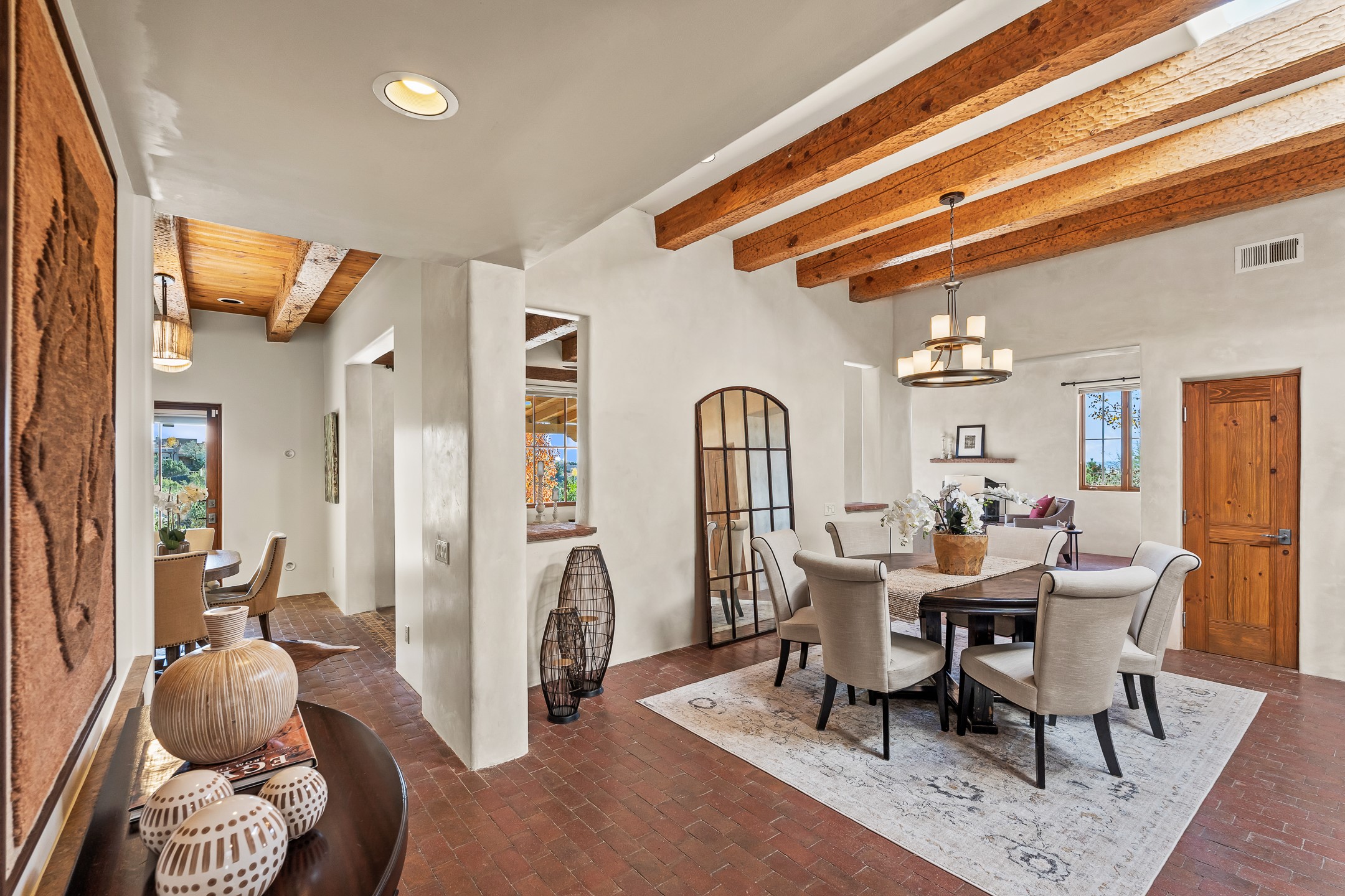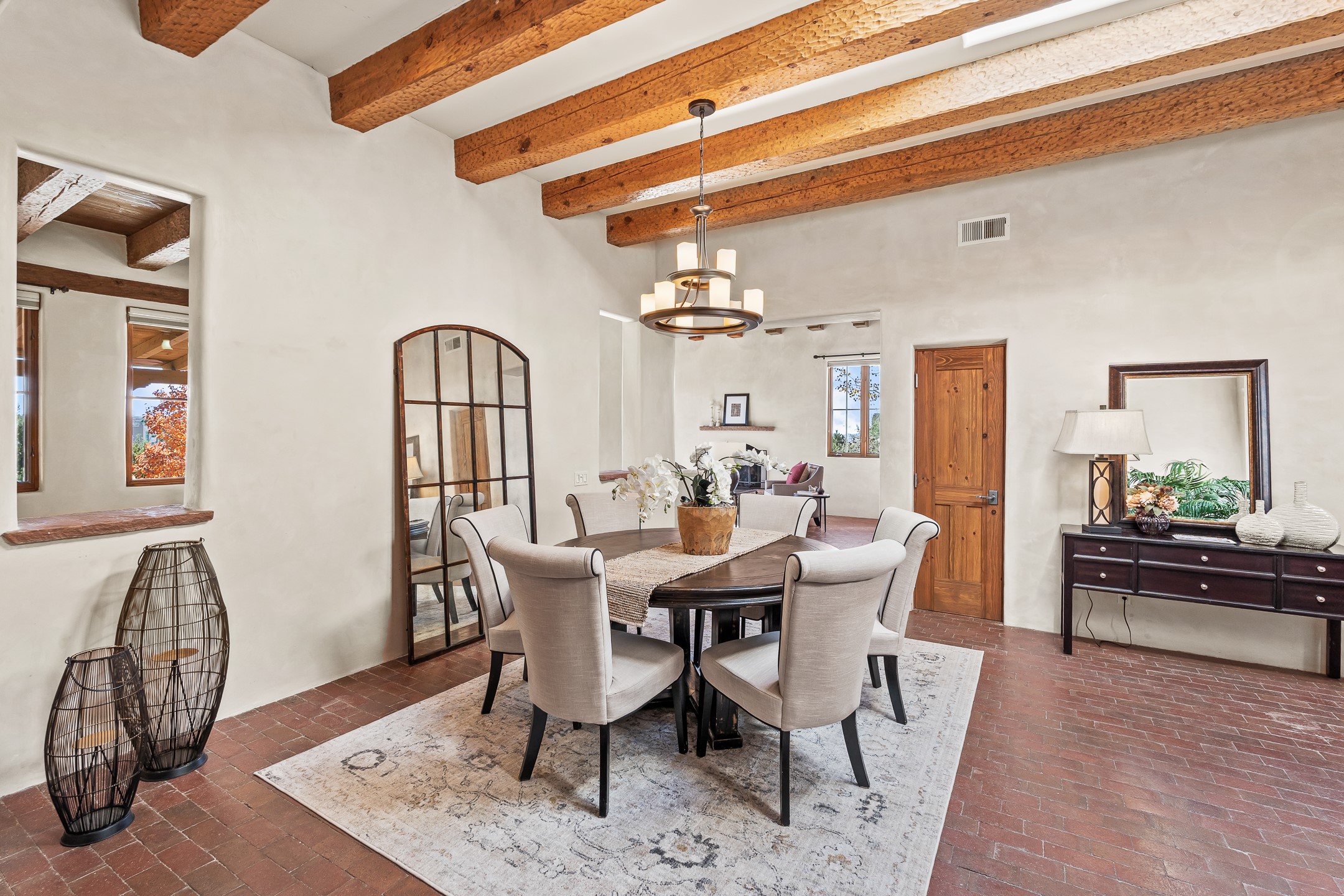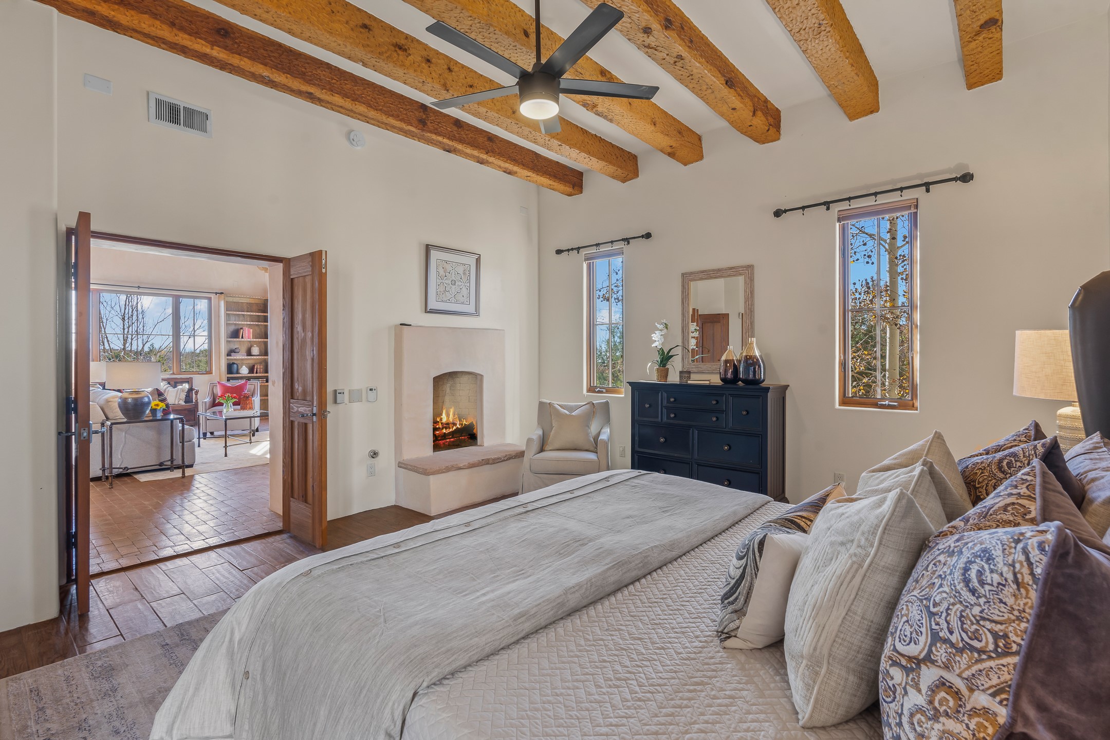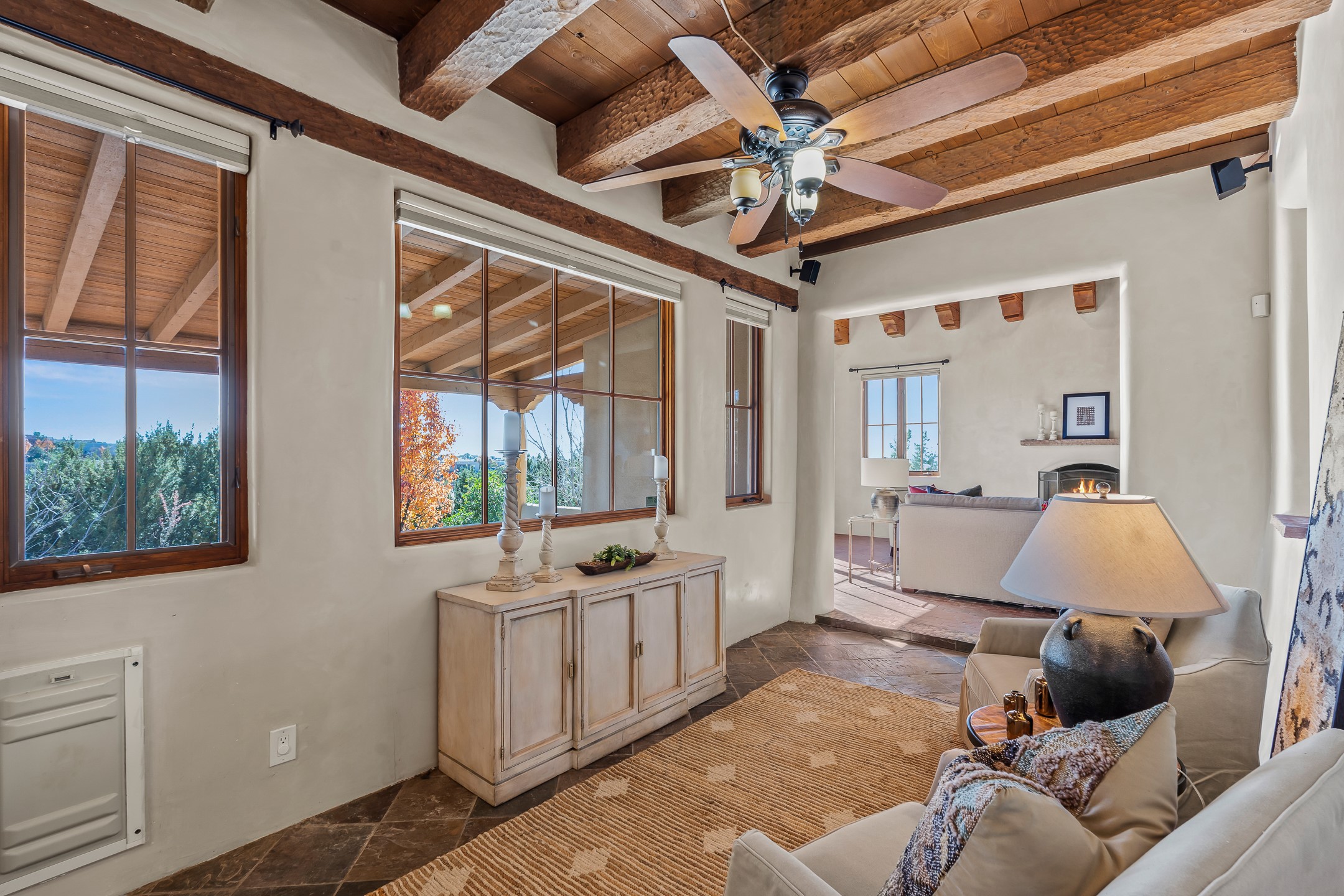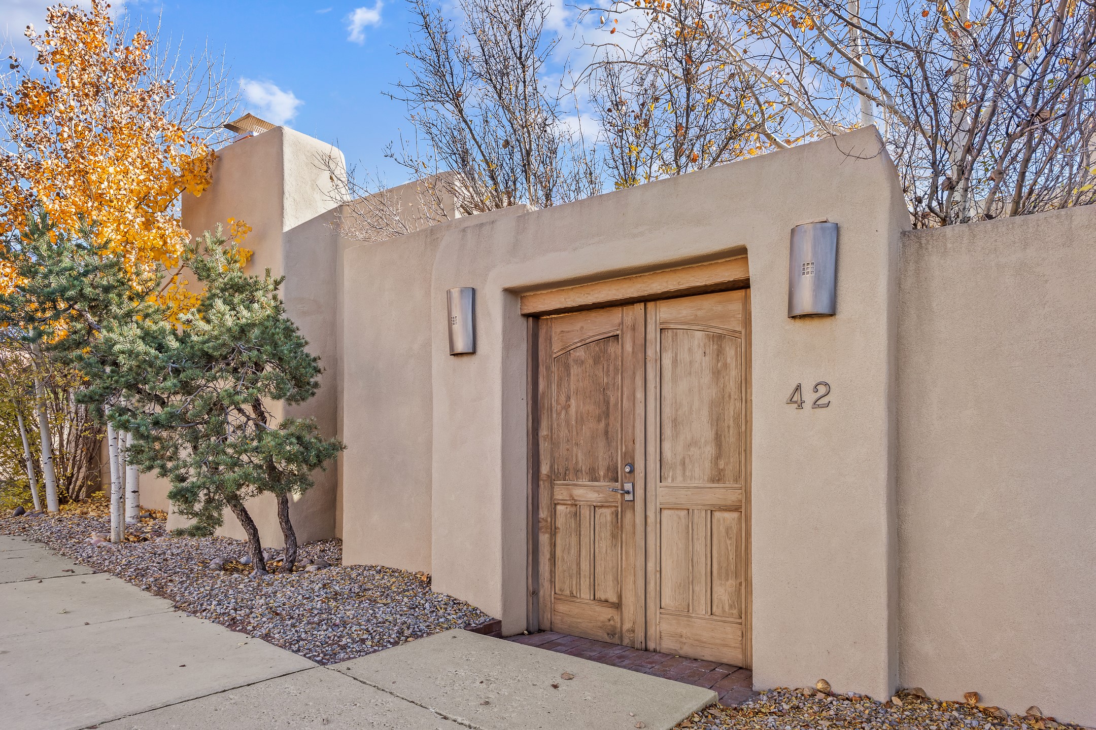42 E. Va Plaza Nueva offers a warm embrace of classic Santa Fe style within the highly desirable community of Aldea de Santa Fe. This 2,392-square-foot residence features 3 bedrooms, 2.5 baths, and a 2-car garage, blending timeless craftsmanship with inviting indoor-outdoor living.Enter through a private front courtyard and step into a home rich with Old World charm. Brick and tile floors run throughout, complementing the carved wood beams, vigas, and hand-troweled plaster walls in the main living areas. The expansive living room feels gracious and grounded, ideal for quiet evenings or elegant entertaining.The third bedroom, with its own separate entrance and cozy fireplace, offers versatility--perfect as a guest suite or a comfortable home office with added privacy.The kitchen is appointed with wood cabinetry, a gas cooktop and vent hood, double wall ovens, and granite counters accented by tile surrounds. A cozy breakfast nook creates an inviting place to savor your morning coffee.Designed for Santa Fe's coveted lifestyle, the home's outdoor living and dining spaces are surrounded by mature landscaping and back up to open space, creating a serene setting with views to the Sandias to enjoy year-round.Located in desirable Aldea de Santa Fe, a vibrant village-style community, residents enjoy 13 miles of walking trails, extensive shared open space, a community center, and tennis, basketball, and bocce courts. Neighborhood life is enhanced further with annual art tours, community garage sales, and a variety of active clubs--participate as much or as little as you like.This home embodies the warmth, texture, and tradition of Old Santa Fe while offering the amenities of a welcoming, engaged community.