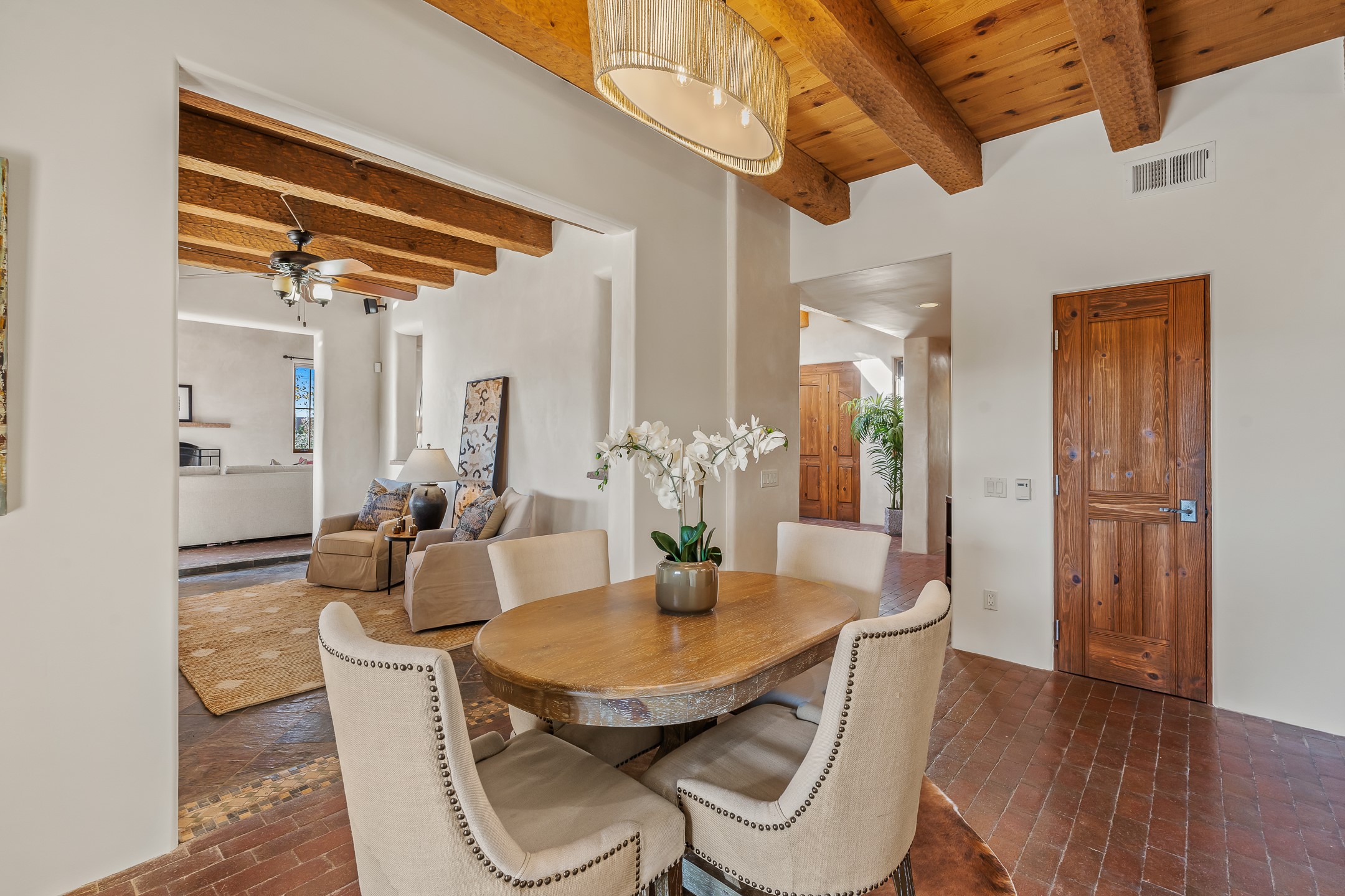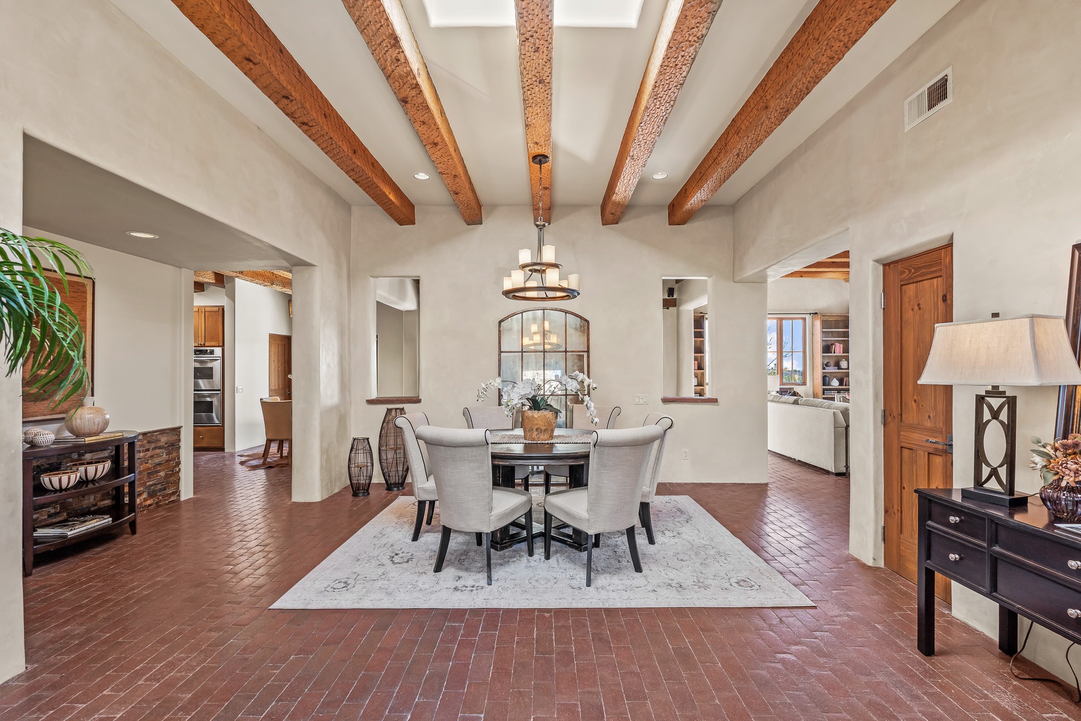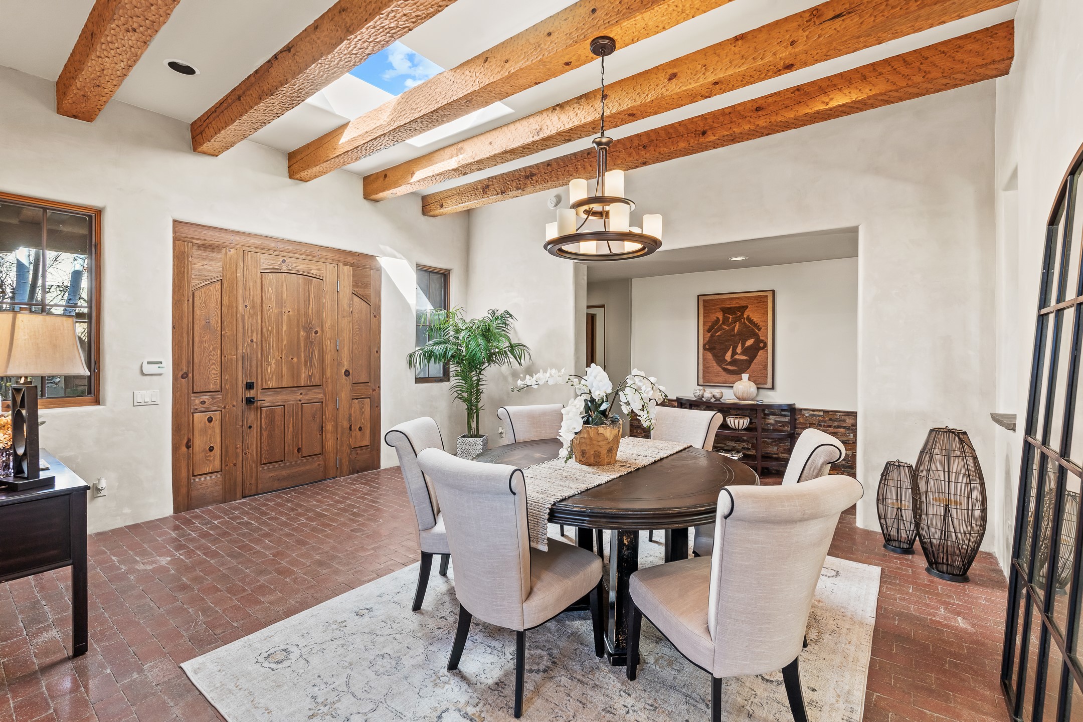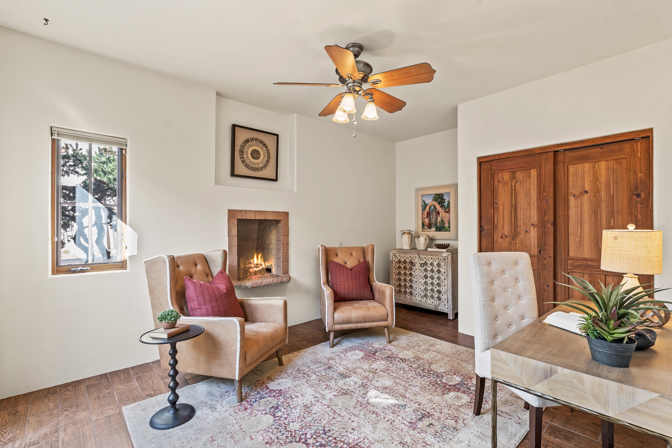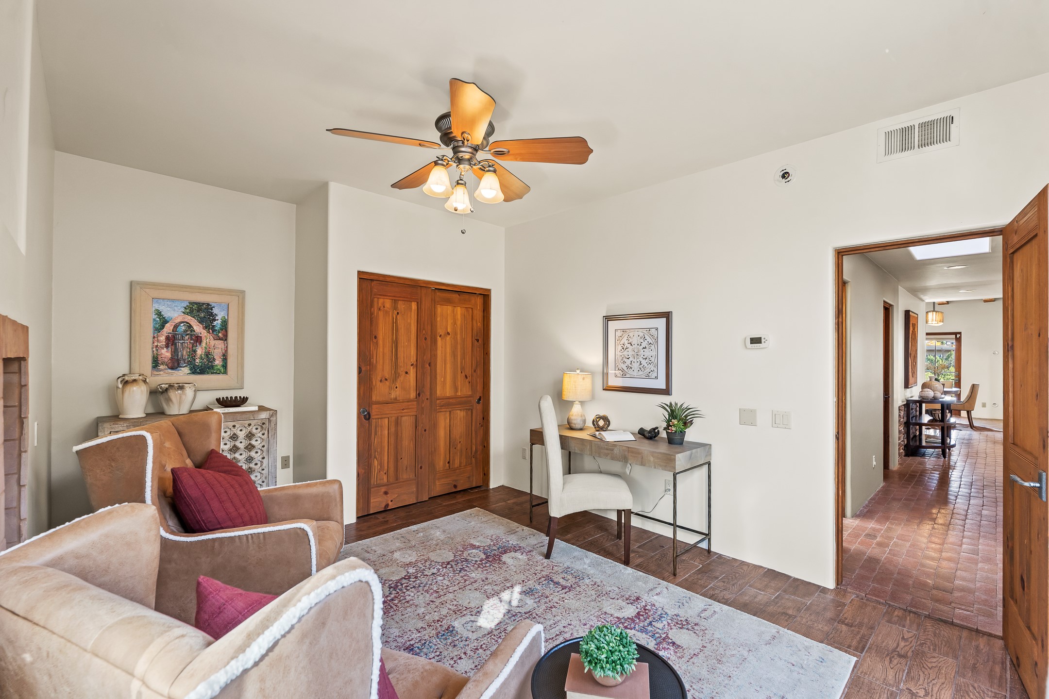 42 E. Va Plaza Nueva offers a warm embrace of classic Santa Fe style within the highly desirable community of Aldea de Santa Fe. This 2,392-square-foot residence features 3 bedrooms, 2.5 baths, and a 2-car garage, blending timeless craftsmanship with inviting indoor-outdoor living.Enter through a private front courtyard and step into a home rich with Old World charm. Brick and tile floors run throughout, complementing the carved wood beams, vigas, and hand-troweled plaster walls in the main living areas. The expansive living room feels gracious and grounded, ideal for quiet evenings or elegant entertaining.The third bedroom, with its own separate entrance and cozy fireplace, offers versatility--perfect as a guest suite or a comfortable home office with added privacy.The kitchen is appointed with wood cabinetry, a gas cooktop and vent hood, double wall ovens, and granite counters accented by tile surrounds. A cozy breakfast nook creates an inviting place to savor your morning coffee.Designed for Santa Fe's coveted lifestyle, the home's outdoor living and dining spaces are surrounded by mature landscaping and back up to open space, creating a serene setting with views to the Sandias to enjoy year-round.Located in desirable Aldea de Santa Fe, a vibrant village-style community, residents enjoy 13 miles of walking trails, extensive shared open space, a community center, and tennis, basketball, and bocce courts. Neighborhood life is enhanced further with annual art tours, community garage sales, and a variety of active clubs--participate as much or as little as you like.This home embodies the warmth, texture, and tradition of Old Santa Fe while offering the amenities of a welcoming, engaged community.