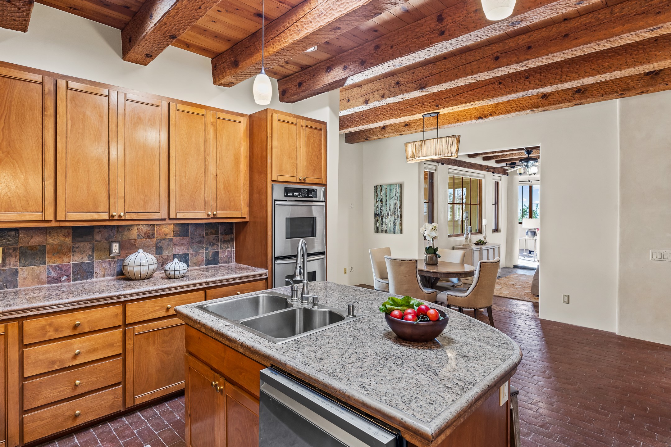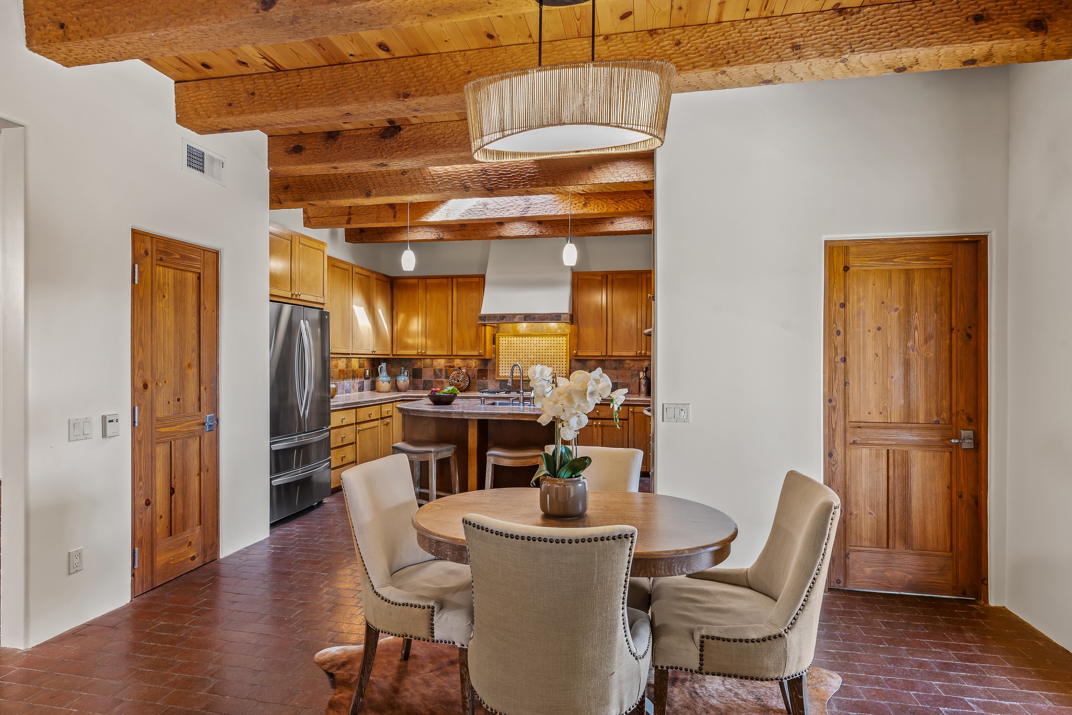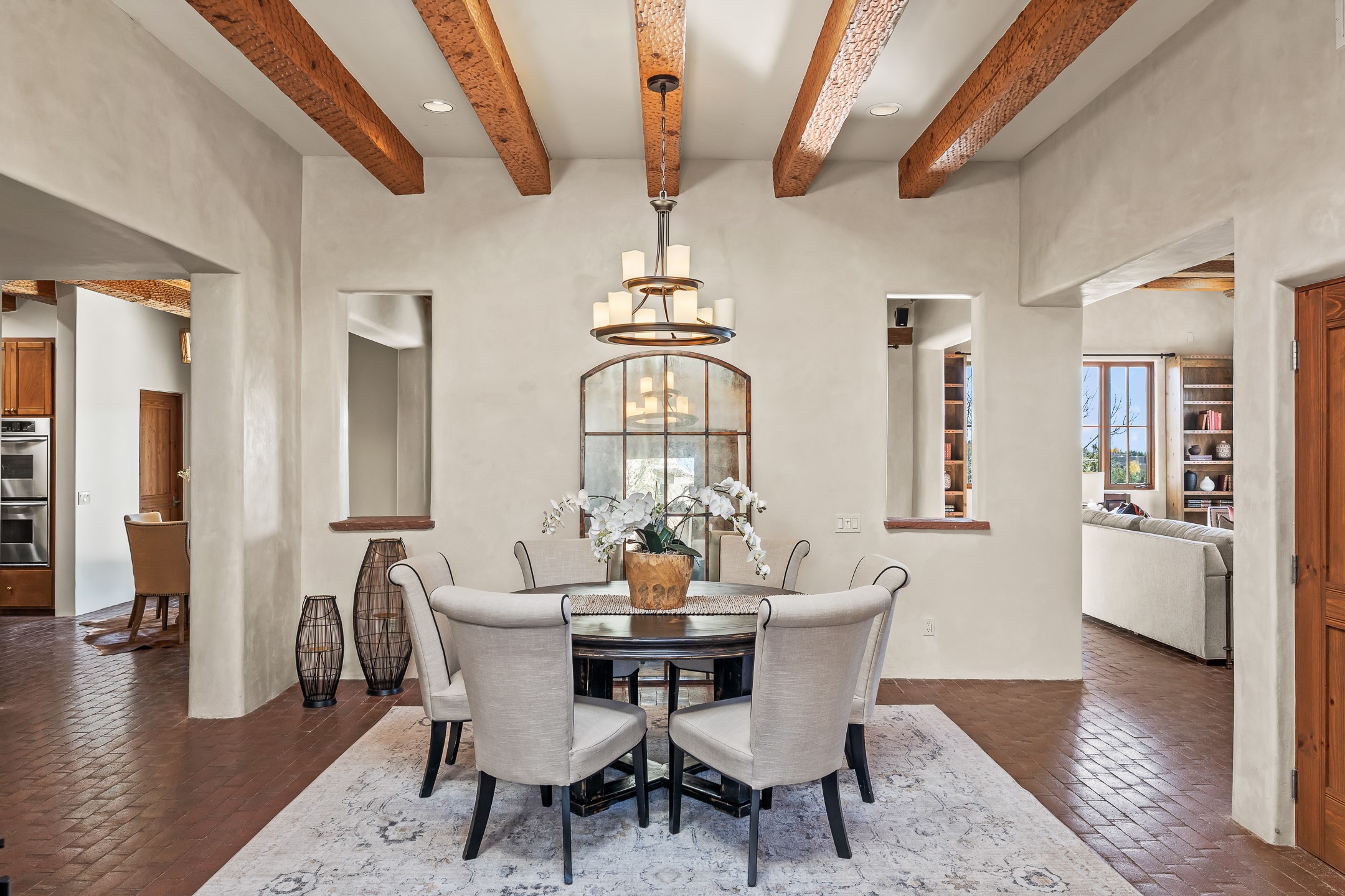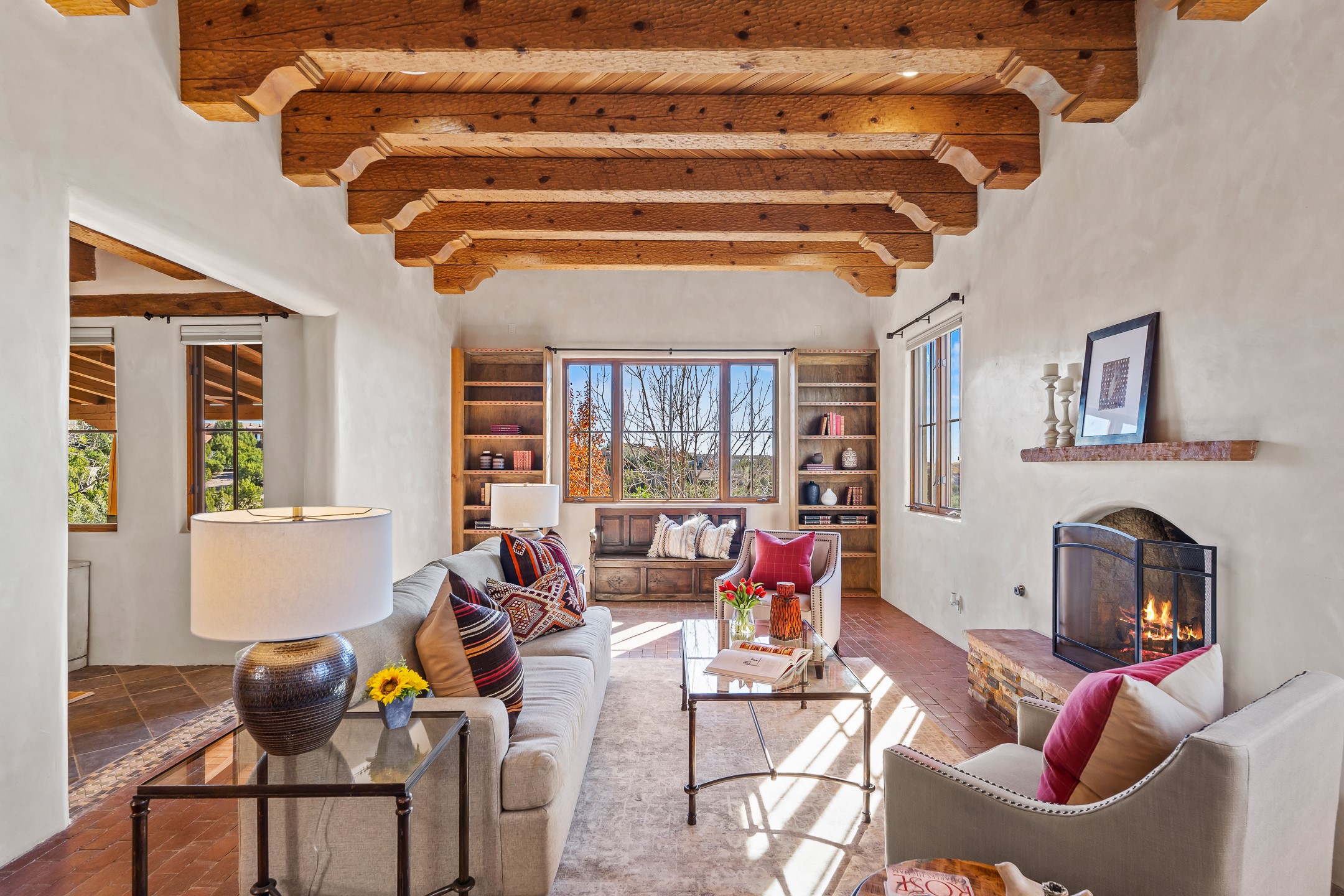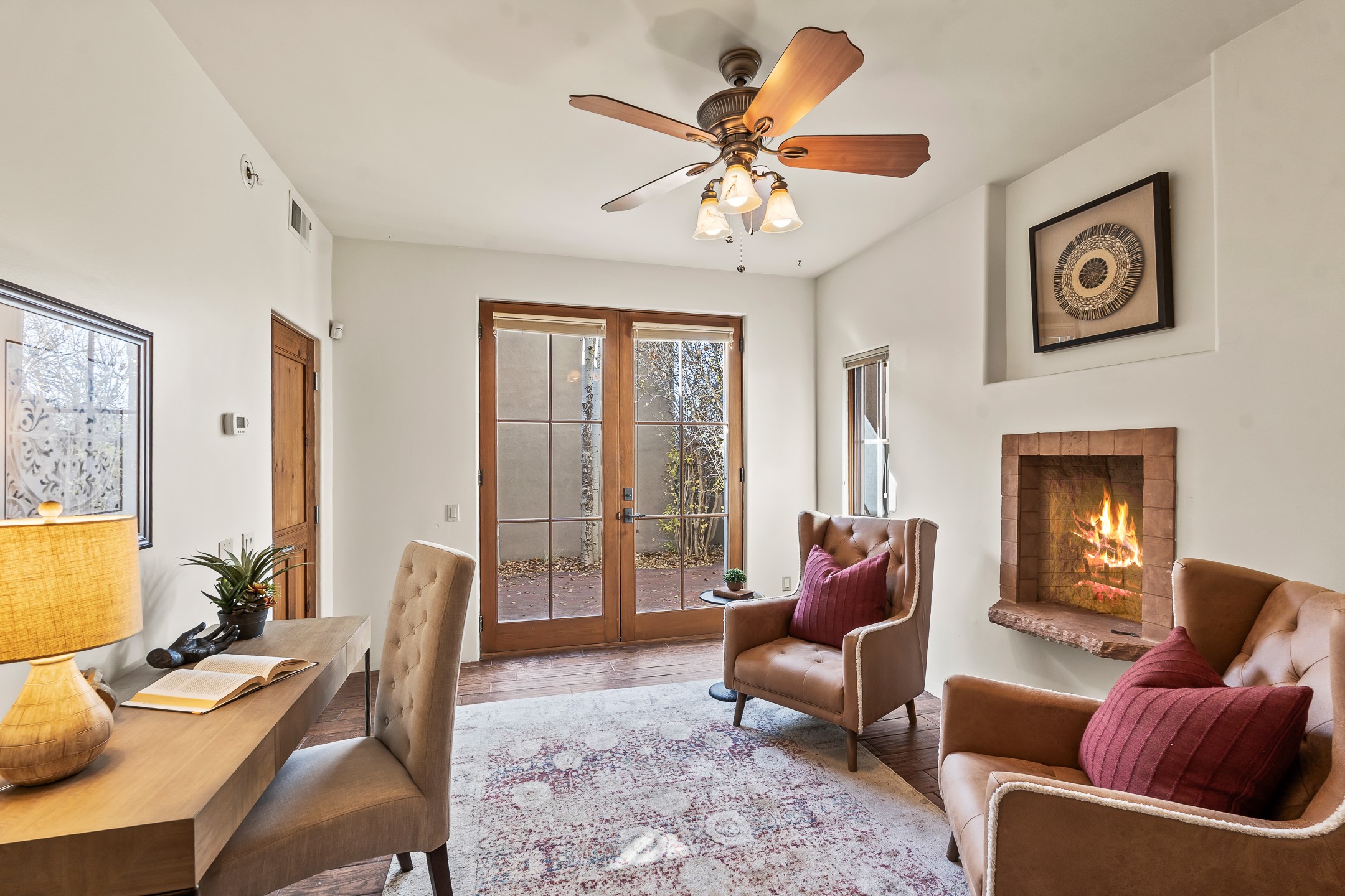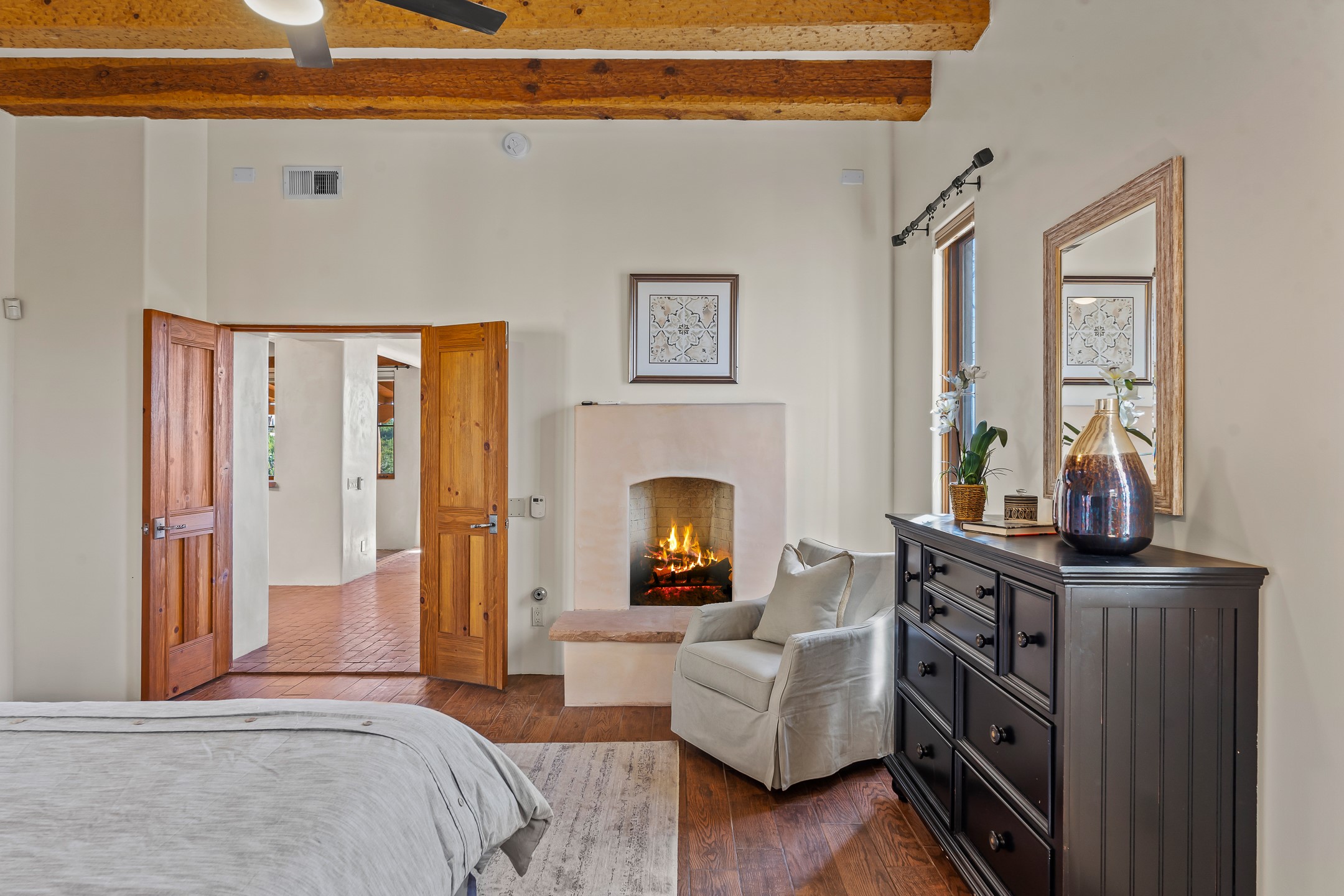 42 E. Va Plaza Nueva offers a warm embrace of classic Santa Fe style within the highly desirable community of Aldea de Santa Fe. This 2,392-square-foot residence features 3 bedrooms, 2.5 baths, and a 2-car garage, blending timeless craftsmanship with inviting indoor-outdoor living.Enter through a private front courtyard and step into a home rich with Old World charm. Brick and tile floors run throughout, complementing the carved wood beams, vigas, and hand-troweled plaster walls in the main living areas. The expansive living room feels gracious and grounded, ideal for quiet evenings or elegant entertaining.The third bedroom, with its own separate entrance and cozy fireplace, offers versatility--perfect as a guest suite or a comfortable home office with added privacy.The kitchen is appointed with wood cabinetry, a gas cooktop and vent hood, double wall ovens, and granite counters accented by tile surrounds. A cozy breakfast nook creates an inviting place to savor your morning coffee.Designed for Santa Fe's coveted lifestyle, the home's outdoor living and dining spaces are surrounded by mature landscaping and back up to open space, creating a serene setting with views to the Sandias to enjoy year-round.Located in desirable Aldea de Santa Fe, a vibrant village-style community, residents enjoy 13 miles of walking trails, extensive shared open space, a community center, and tennis, basketball, and bocce courts. Neighborhood life is enhanced further with annual art tours, community garage sales, and a variety of active clubs--participate as much or as little as you like.This home embodies the warmth, texture, and tradition of Old Santa Fe while offering the amenities of a welcoming, engaged community.