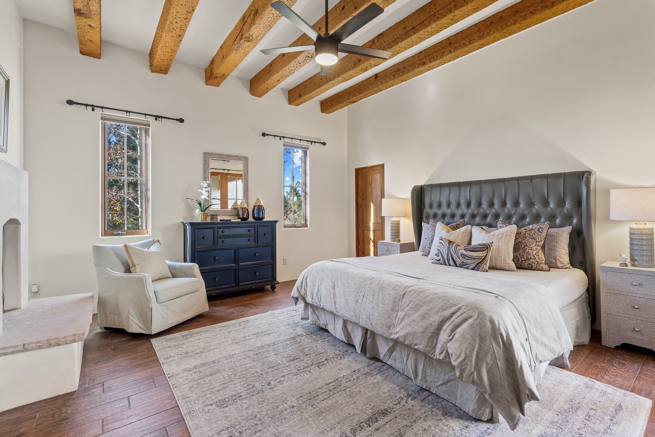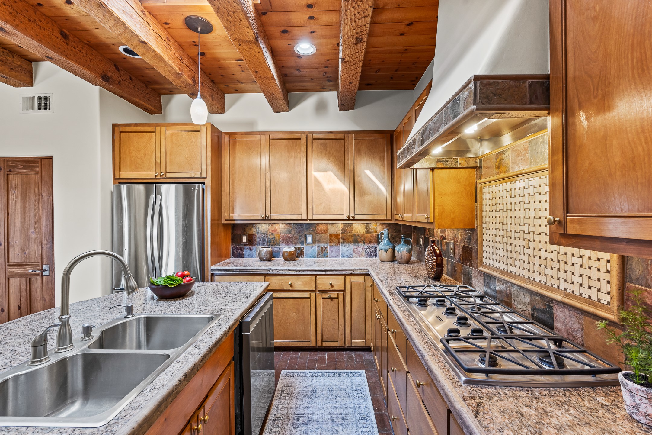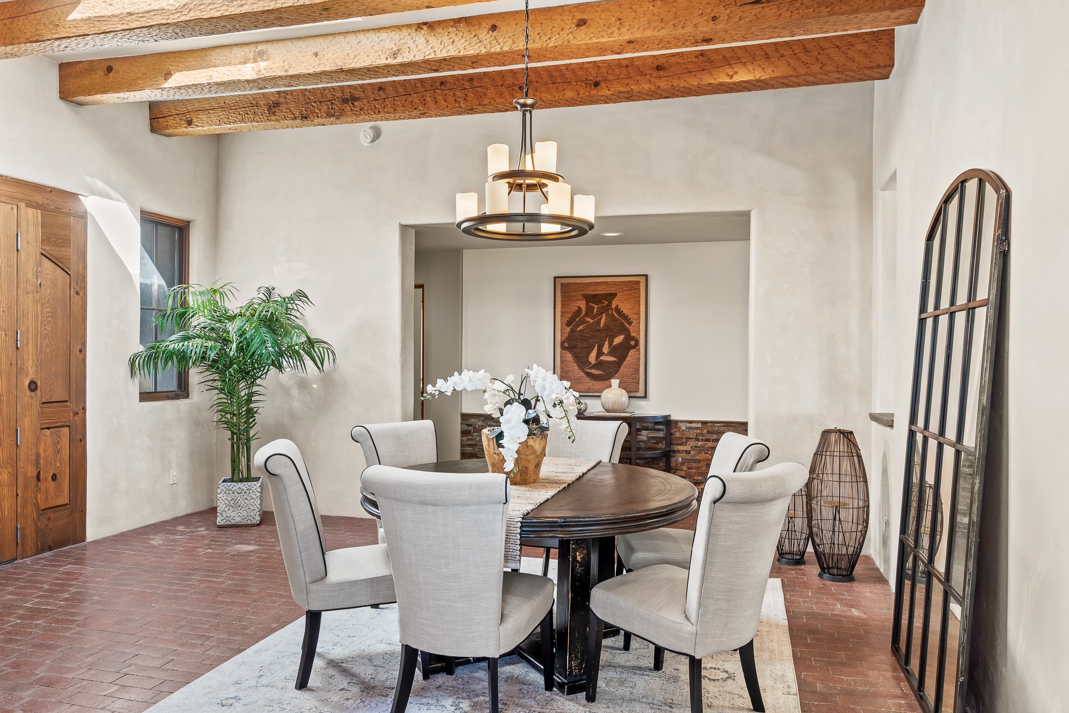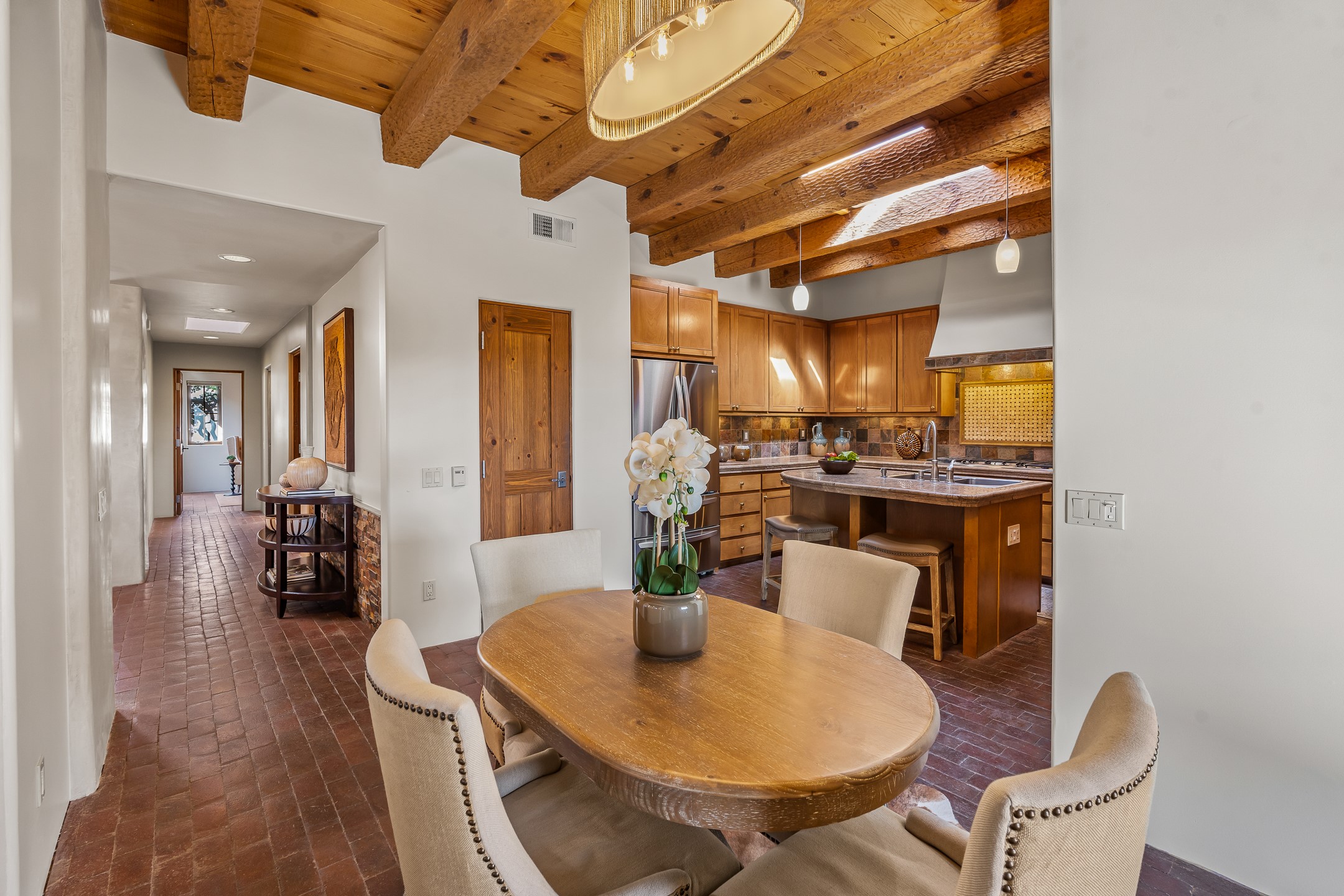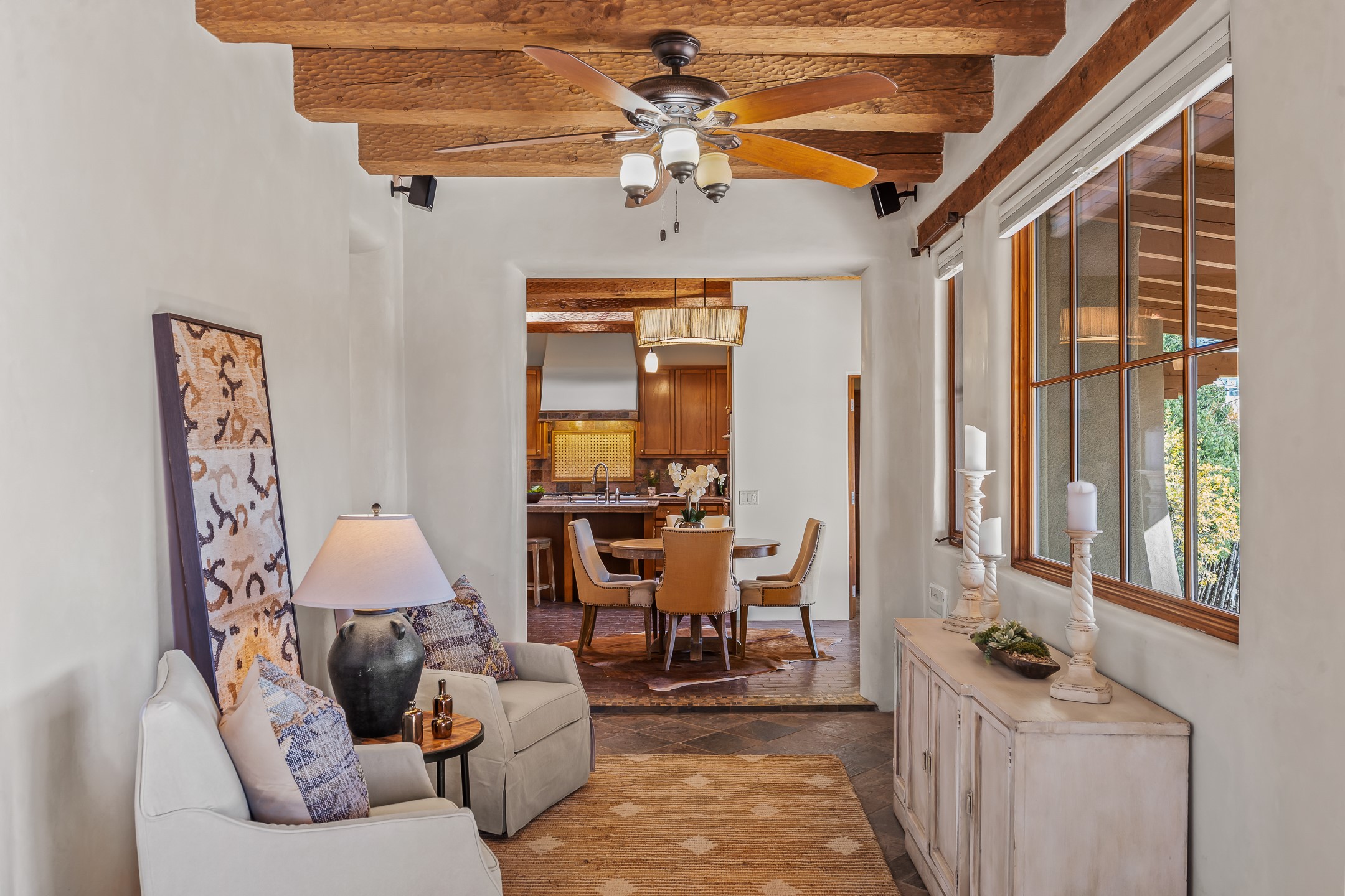 42 E. Va Plaza Nueva offers a warm embrace of classic Santa Fe style within the highly desirable community of Aldea de Santa Fe. This 2,392-square-foot residence features 3 bedrooms, 2.5 baths, and a 2-car garage, blending timeless craftsmanship with inviting indoor-outdoor living.Enter through a private front courtyard and step into a home rich with Old World charm. Brick and tile floors run throughout, complementing the carved wood beams, vigas, and hand-troweled plaster walls in the main living areas. The expansive living room feels gracious and grounded, ideal for quiet evenings or elegant entertaining.The third bedroom, with its own separate entrance and cozy fireplace, offers versatility--perfect as a guest suite or a comfortable home office with added privacy.The kitchen is appointed with wood cabinetry, a gas cooktop and vent hood, double wall ovens, and granite counters accented by tile surrounds. A cozy breakfast nook creates an inviting place to savor your morning coffee.Designed for Santa Fe's coveted lifestyle, the home's outdoor living and dining spaces are surrounded by mature landscaping and back up to open space, creating a serene setting with views to the Sandias to enjoy year-round.Located in desirable Aldea de Santa Fe, a vibrant village-style community, residents enjoy 13 miles of walking trails, extensive shared open space, a community center, and tennis, basketball, and bocce courts. Neighborhood life is enhanced further with annual art tours, community garage sales, and a variety of active clubs--participate as much or as little as you like.This home embodies the warmth, texture, and tradition of Old Santa Fe while offering the amenities of a welcoming, engaged community.