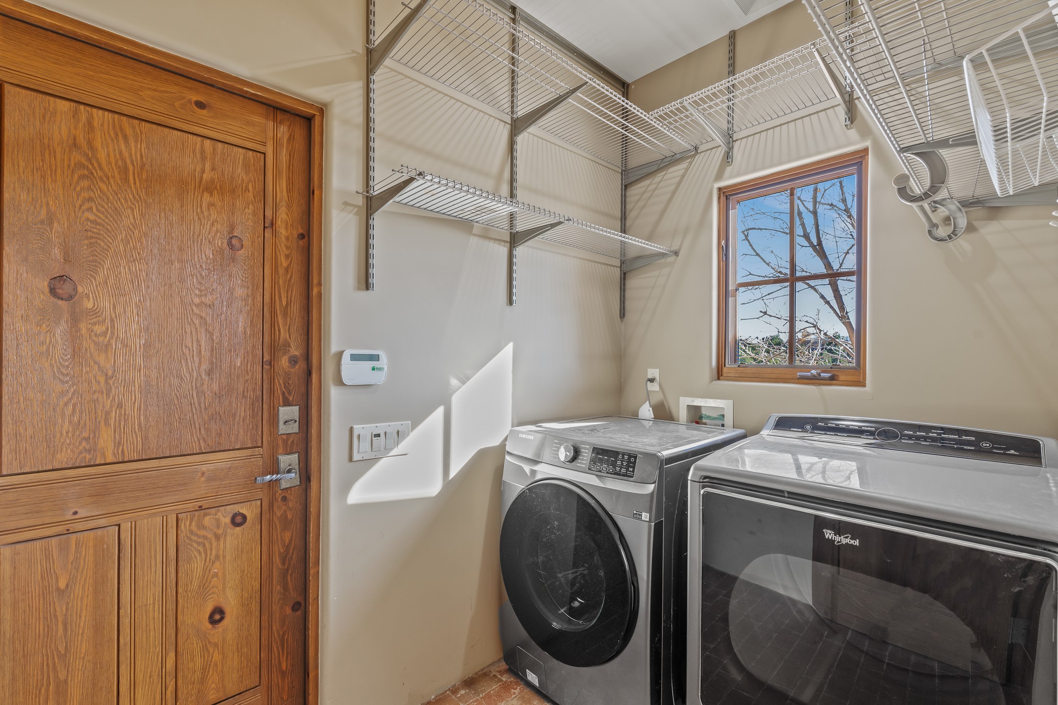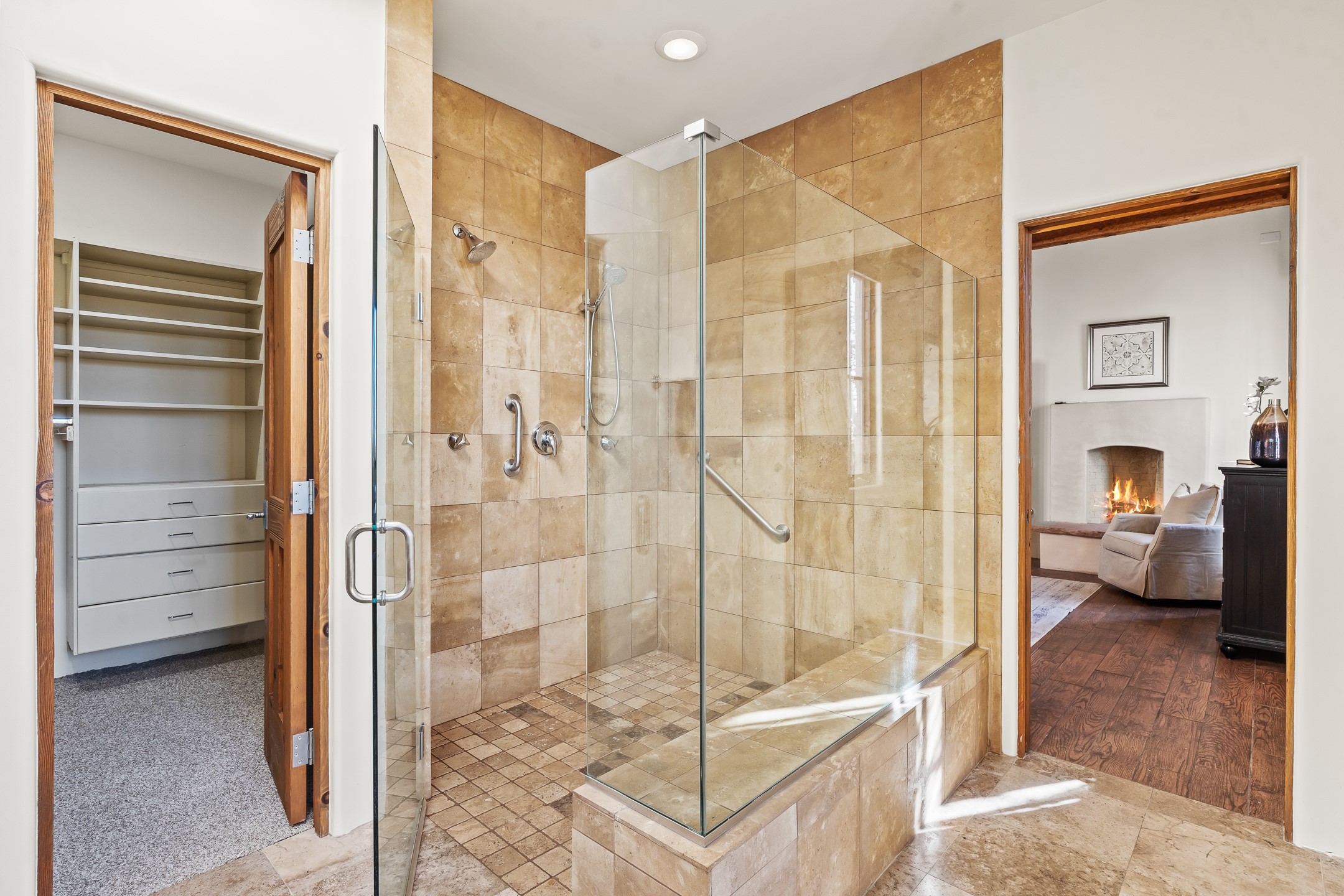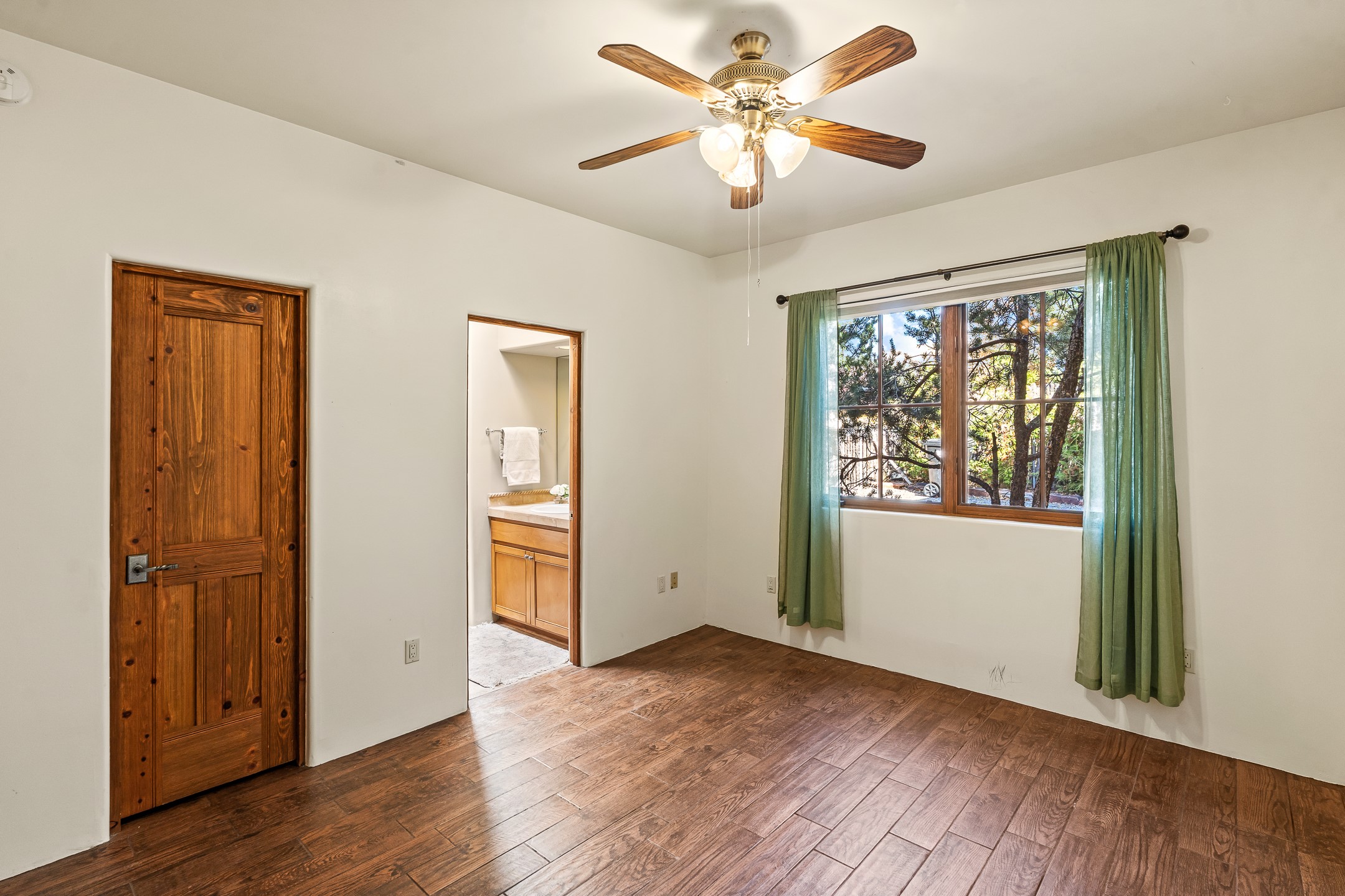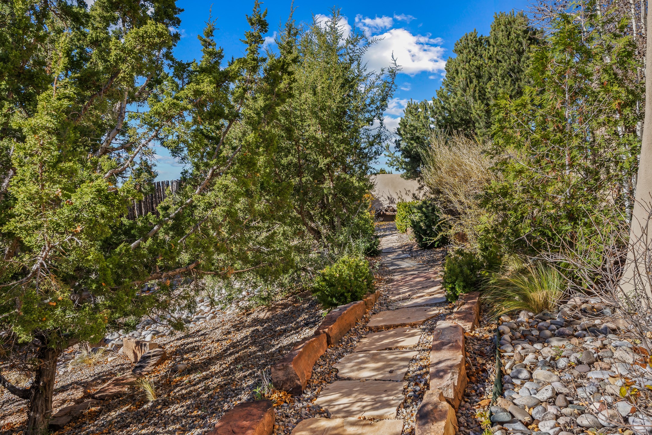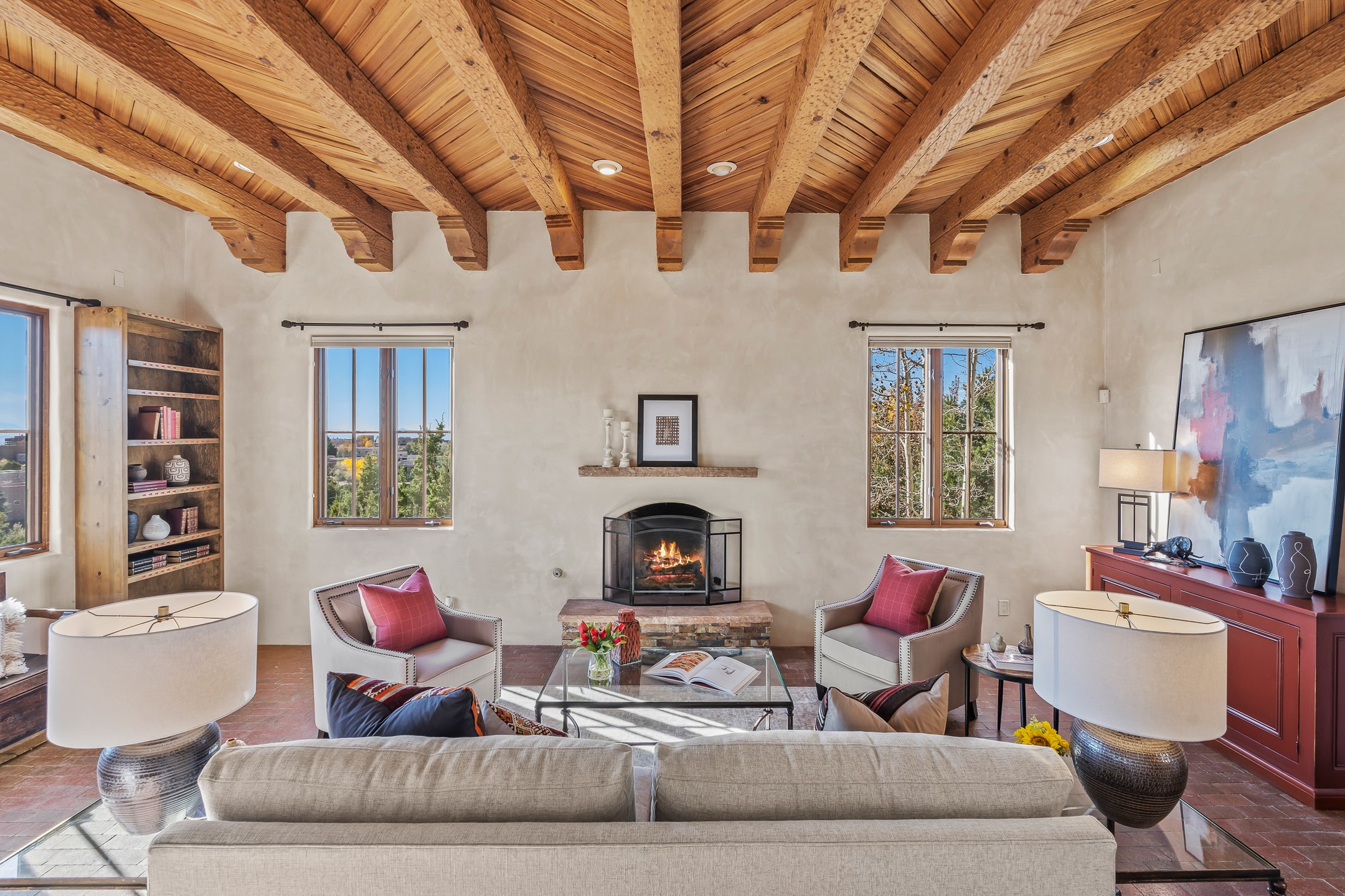 42 E. Va Plaza Nueva offers a warm embrace of classic Santa Fe style within the highly desirable community of Aldea de Santa Fe. This 2,392-square-foot residence features 3 bedrooms, 2.5 baths, and a 2-car garage, blending timeless craftsmanship with inviting indoor-outdoor living.Enter through a private front courtyard and step into a home rich with Old World charm. Brick and tile floors run throughout, complementing the carved wood beams, vigas, and hand-troweled plaster walls in the main living areas. The expansive living room feels gracious and grounded, ideal for quiet evenings or elegant entertaining.The third bedroom, with its own separate entrance and cozy fireplace, offers versatility--perfect as a guest suite or a comfortable home office with added privacy.The kitchen is appointed with wood cabinetry, a gas cooktop and vent hood, double wall ovens, and granite counters accented by tile surrounds. A cozy breakfast nook creates an inviting place to savor your morning coffee.Designed for Santa Fe's coveted lifestyle, the home's outdoor living and dining spaces are surrounded by mature landscaping and back up to open space, creating a serene setting with views to the Sandias to enjoy year-round.Located in desirable Aldea de Santa Fe, a vibrant village-style community, residents enjoy 13 miles of walking trails, extensive shared open space, a community center, and tennis, basketball, and bocce courts. Neighborhood life is enhanced further with annual art tours, community garage sales, and a variety of active clubs--participate as much or as little as you like.This home embodies the warmth, texture, and tradition of Old Santa Fe while offering the amenities of a welcoming, engaged community.