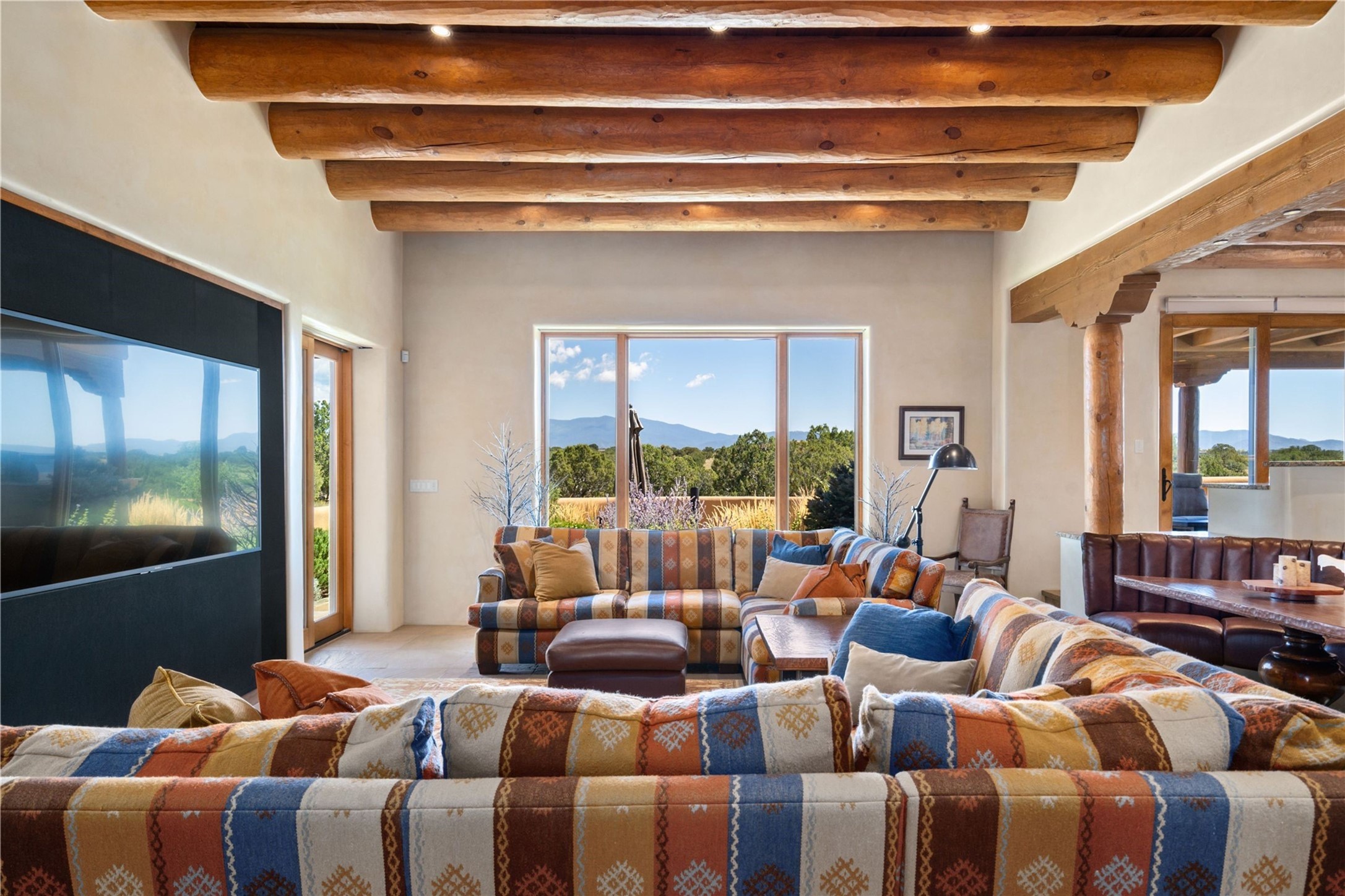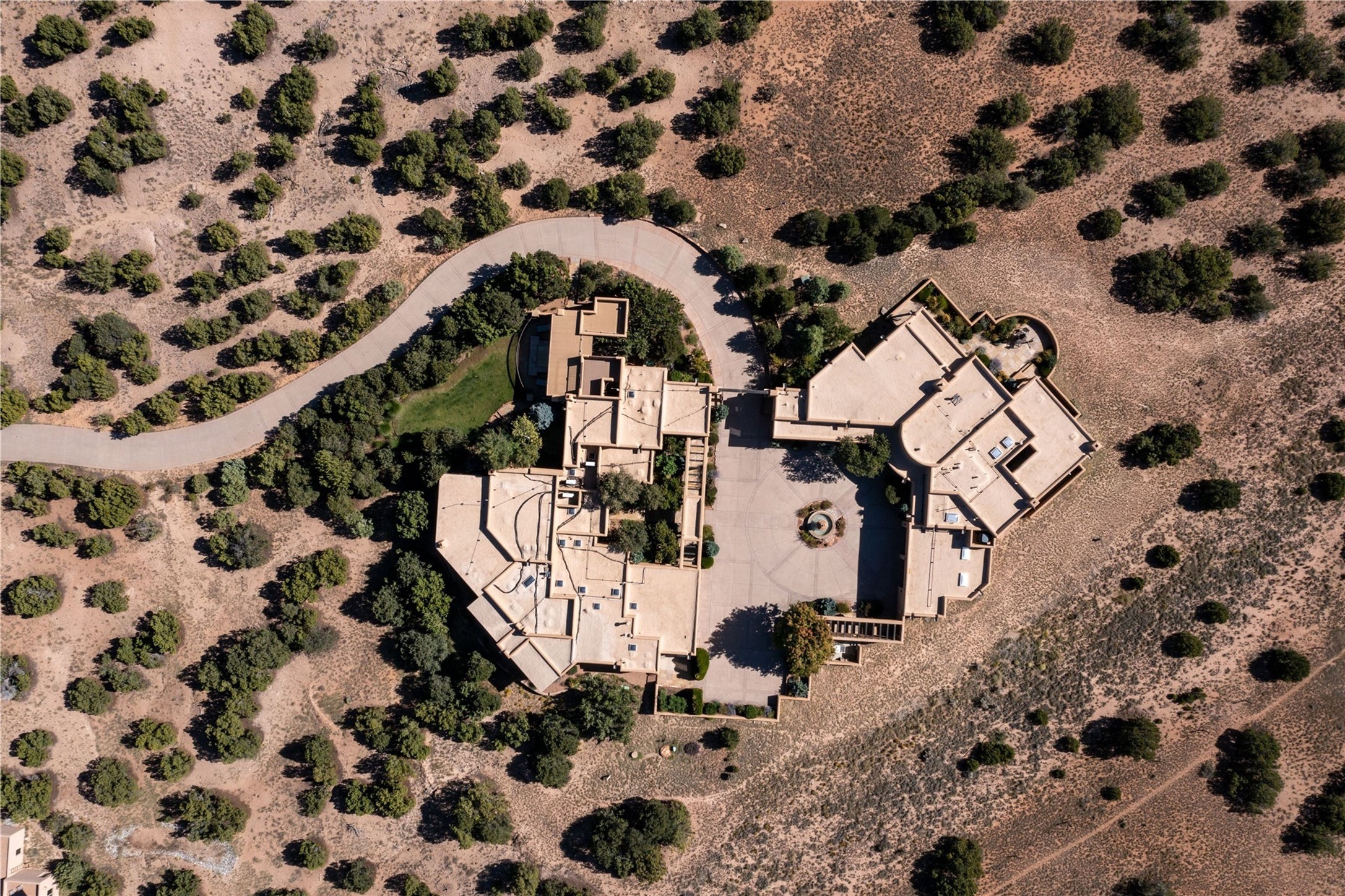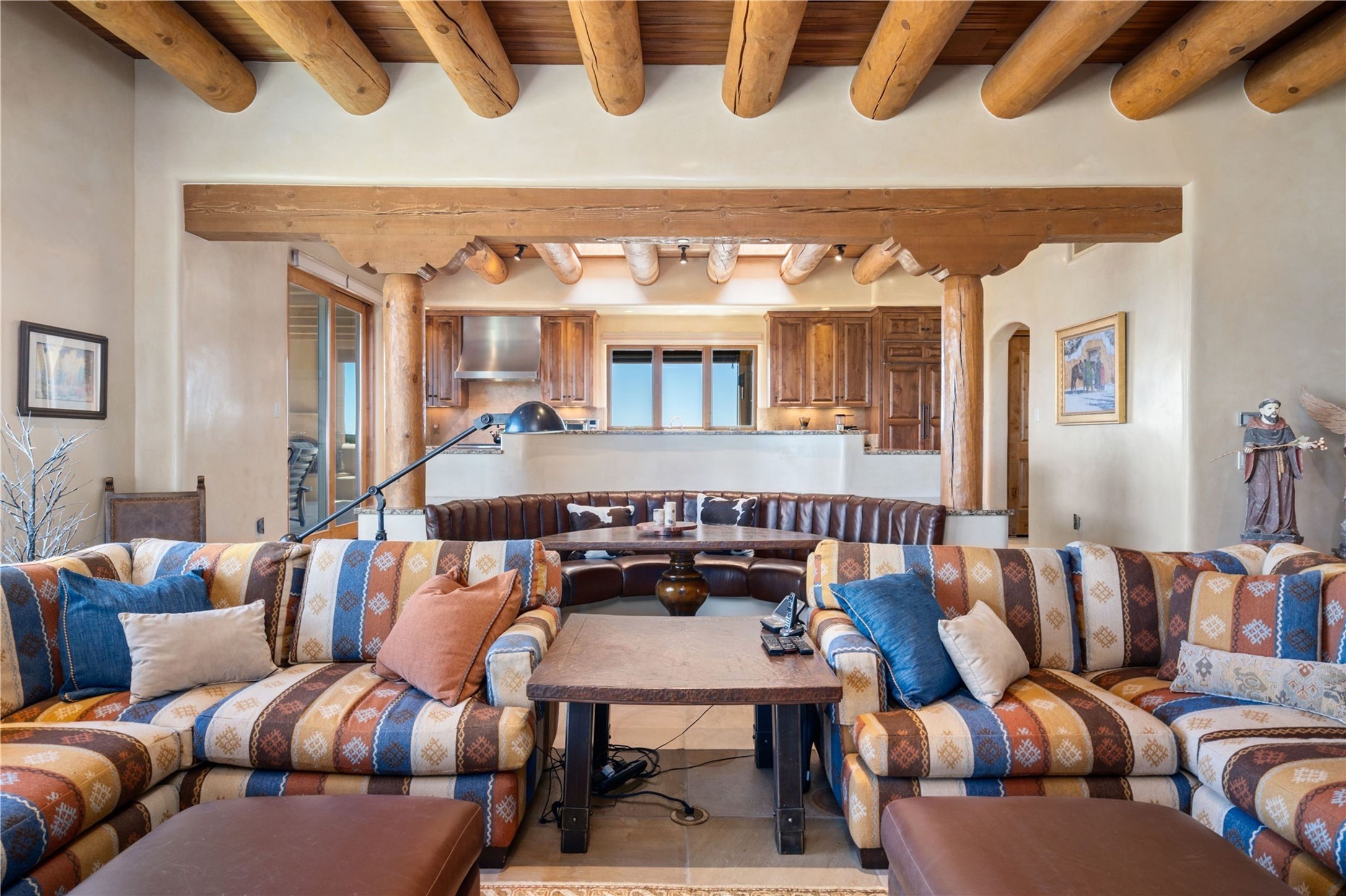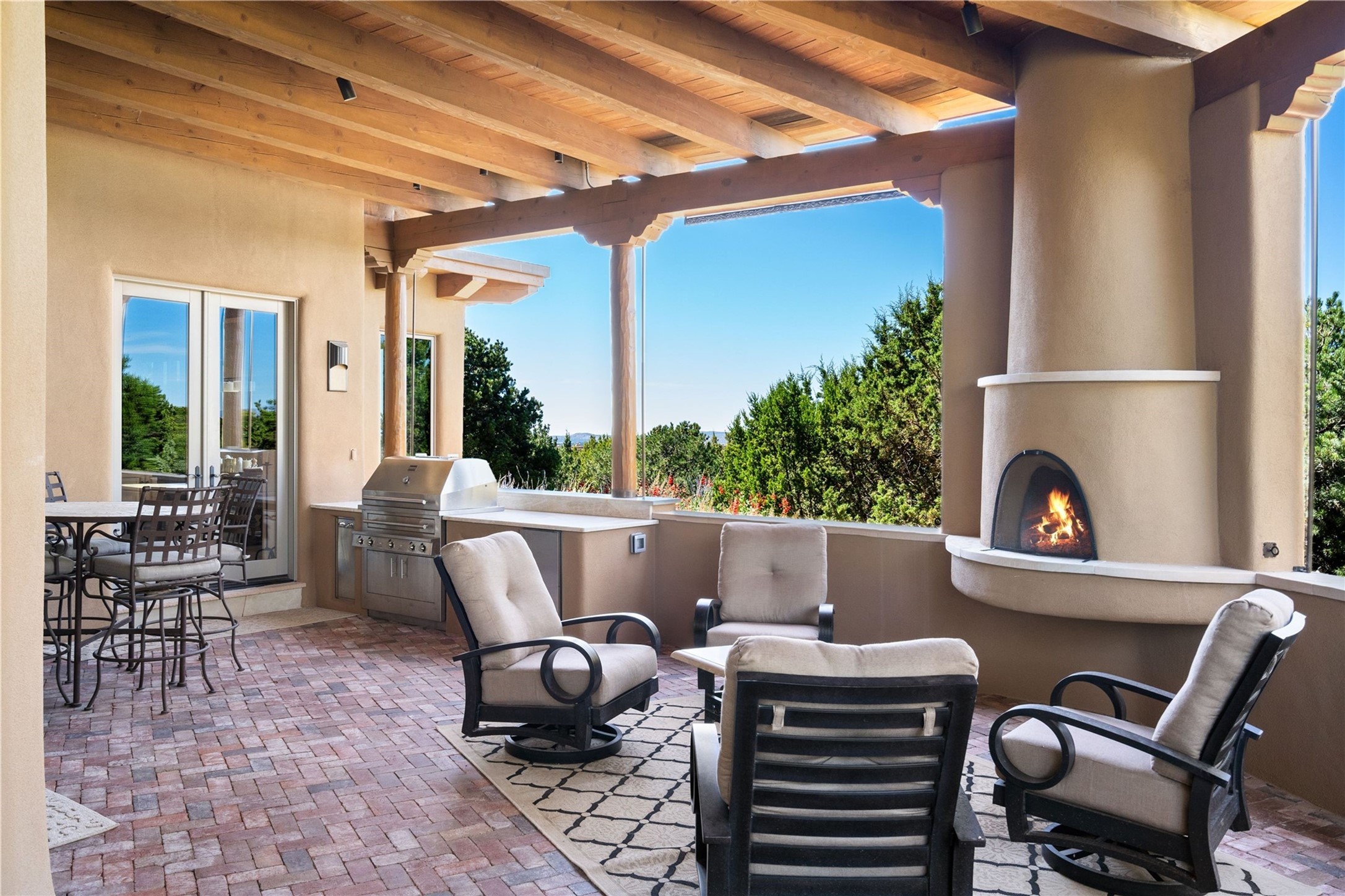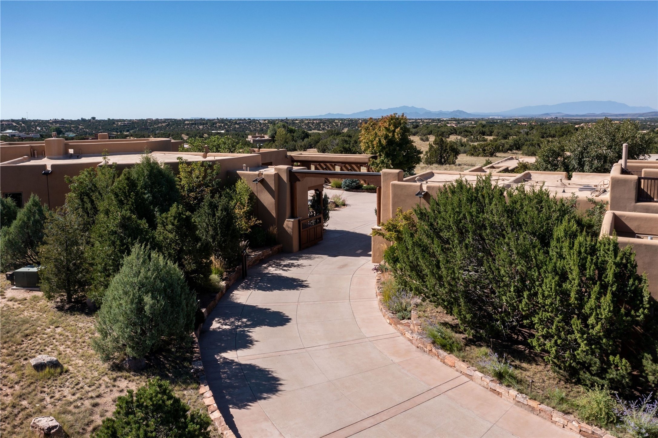 Set high on a private hilltop, and enjoying sunset mountain views, this custom Pueblo Revival compound embodies craftsmanship, substance, and timeless Santa Fe style. Built with quality at every turn and refreshed with a new roof and stucco, the property is introduced by a grand, gated courtyard with center fountain, full poured concrete drive, and a spacious garage for 4 cars. The 3-bedroom main residence, remodeled by Kim Dressel in 2012, reveals artisan details from the moment you step into the dramatic Zaguan entry. Finishes include slate floors, carved woodwork by master craftsman David Naylor, thick plaster walls, and a freestanding bar that anchors the open living and dining spaces. The chef's island kitchen features Wolf, Sub-Zero, and wine refrigeration, ideal for both daily living and entertaining. The split-bedroom layout offers privacy, while the primary suite is a sanctuary with dual closets, built-ins with fridge, kiva fireplace, and a dedicated exercise room. Outdoor living extends to multiple portals, a rooftop deck with 360 mountain views, a full kitchen, fireplace, and an elegant in-ground cocktail pool. The 3,050 sq. ft. second residence, newly built by Kim Dressel in 2013, echoes the same solid construction and fine finishes. With 2 bedrooms, 2 living rooms, a full kitchen and dining space, carved details by David Naylor, and far-reaching Sangre de Cristo and Jemez views, it offers luxurious comfort. Special features include a built-in bar, 90-inch screen with 9-speaker theater, and an expansive portal with pizza oven, grill, and fireplace. Additional amenities--a workshop, generator, and 15,000 gallon irrigation cistern--enhance function and reliability. Only 15 minutes from The Plaza and Santa Fe Airport, this compound is ideal for multi-generational living or hosting guests in a one-of-a-kind setting where custom design, quality finishes, and Pueblo Revival authenticity define the experience. A contiguous 1.7-acre lot on Black Mesa may be available separately. Membership to the Club at Las Campanas is available for purchase and upon approval.