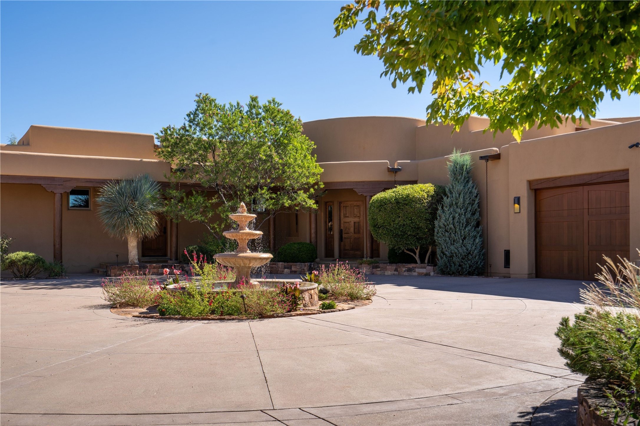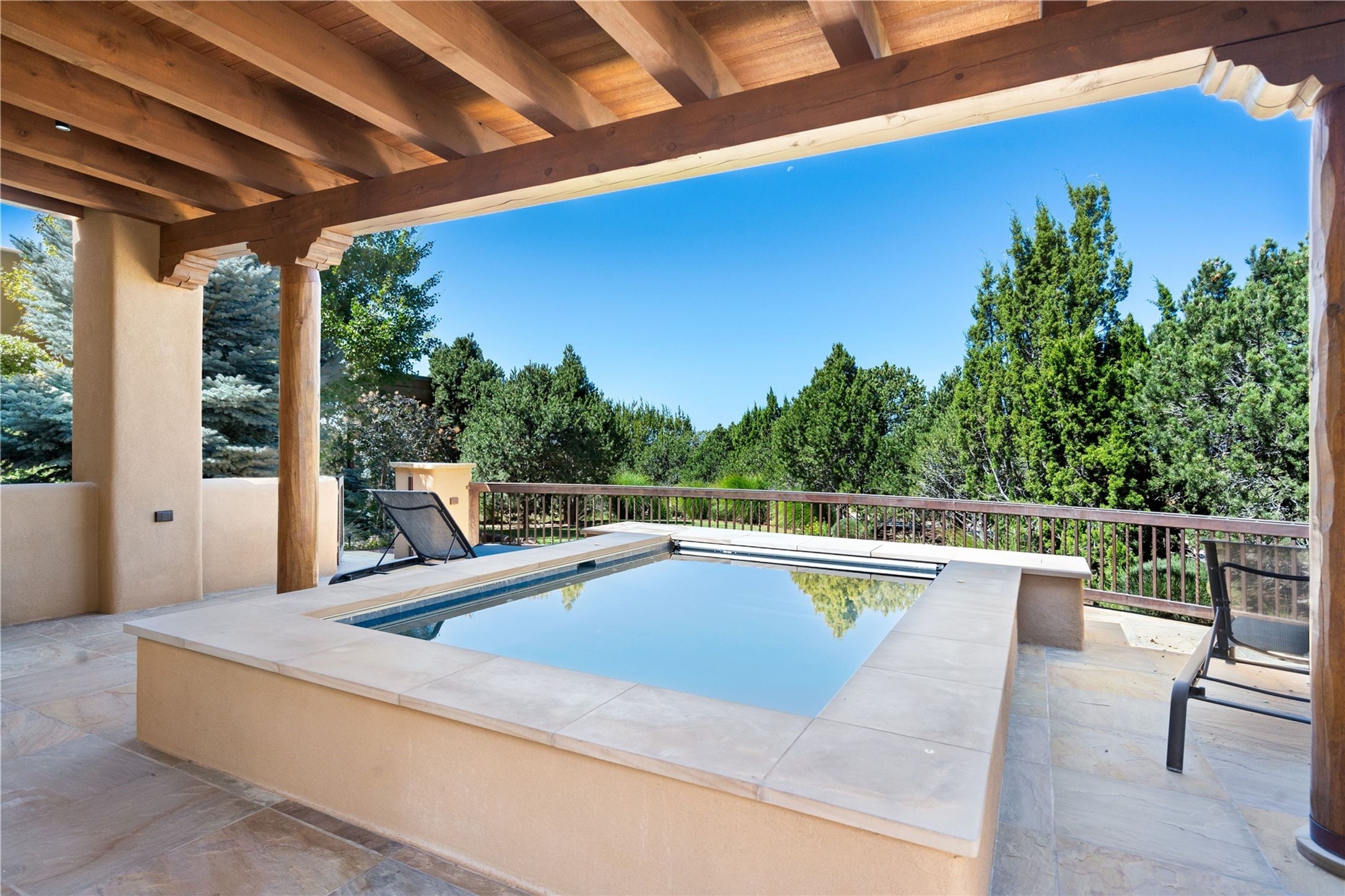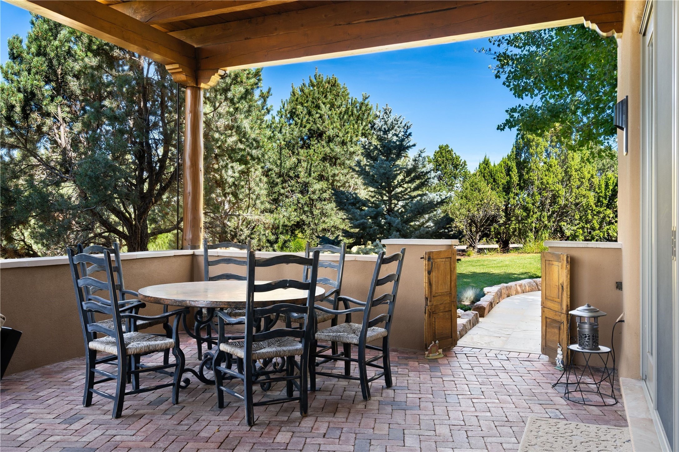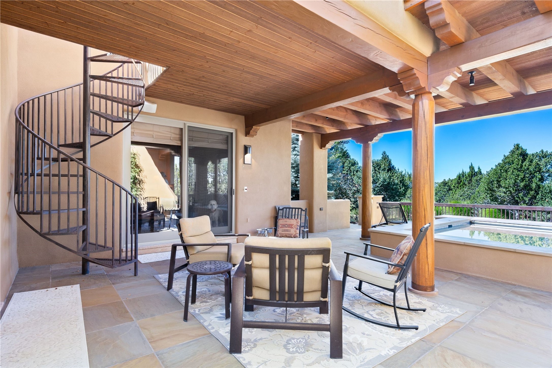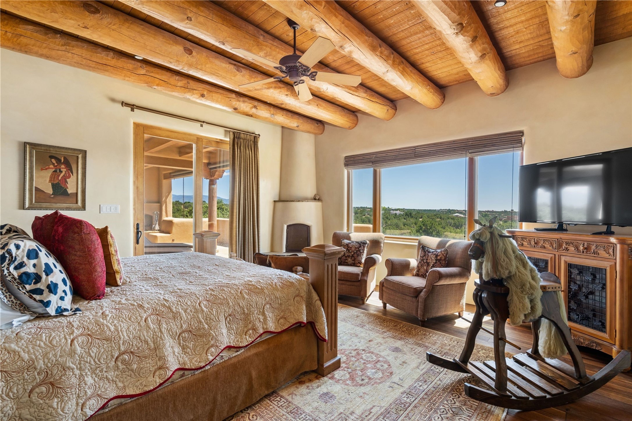 Set high on a private hilltop, and enjoying sunset mountain views, this custom Pueblo Revival compound embodies craftsmanship, substance, and timeless Santa Fe style. Built with quality at every turn and refreshed with a new roof and stucco, the property is introduced by a grand, gated courtyard with center fountain, full poured concrete drive, and a spacious garage for 4 cars. The 3-bedroom main residence, remodeled by Kim Dressel in 2012, reveals artisan details from the moment you step into the dramatic Zaguan entry. Finishes include slate floors, carved woodwork by master craftsman David Naylor, thick plaster walls, and a freestanding bar that anchors the open living and dining spaces. The chef's island kitchen features Wolf, Sub-Zero, and wine refrigeration, ideal for both daily living and entertaining. The split-bedroom layout offers privacy, while the primary suite is a sanctuary with dual closets, built-ins with fridge, kiva fireplace, and a dedicated exercise room. Outdoor living extends to multiple portals, a rooftop deck with 360 mountain views, a full kitchen, fireplace, and an elegant in-ground cocktail pool. The 3,050 sq. ft. second residence, newly built by Kim Dressel in 2013, echoes the same solid construction and fine finishes. With 2 bedrooms, 2 living rooms, a full kitchen and dining space, carved details by David Naylor, and far-reaching Sangre de Cristo and Jemez views, it offers luxurious comfort. Special features include a built-in bar, 90-inch screen with 9-speaker theater, and an expansive portal with pizza oven, grill, and fireplace. Additional amenities--a workshop, generator, and 15,000 gallon irrigation cistern--enhance function and reliability. Only 15 minutes from The Plaza and Santa Fe Airport, this compound is ideal for multi-generational living or hosting guests in a one-of-a-kind setting where custom design, quality finishes, and Pueblo Revival authenticity define the experience. A contiguous 1.7-acre lot on Black Mesa may be available separately. Membership to the Club at Las Campanas is available for purchase and upon approval.