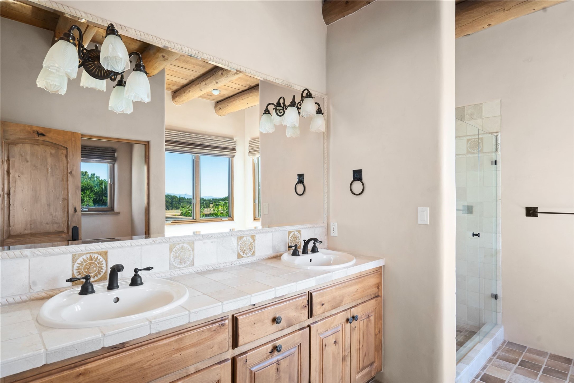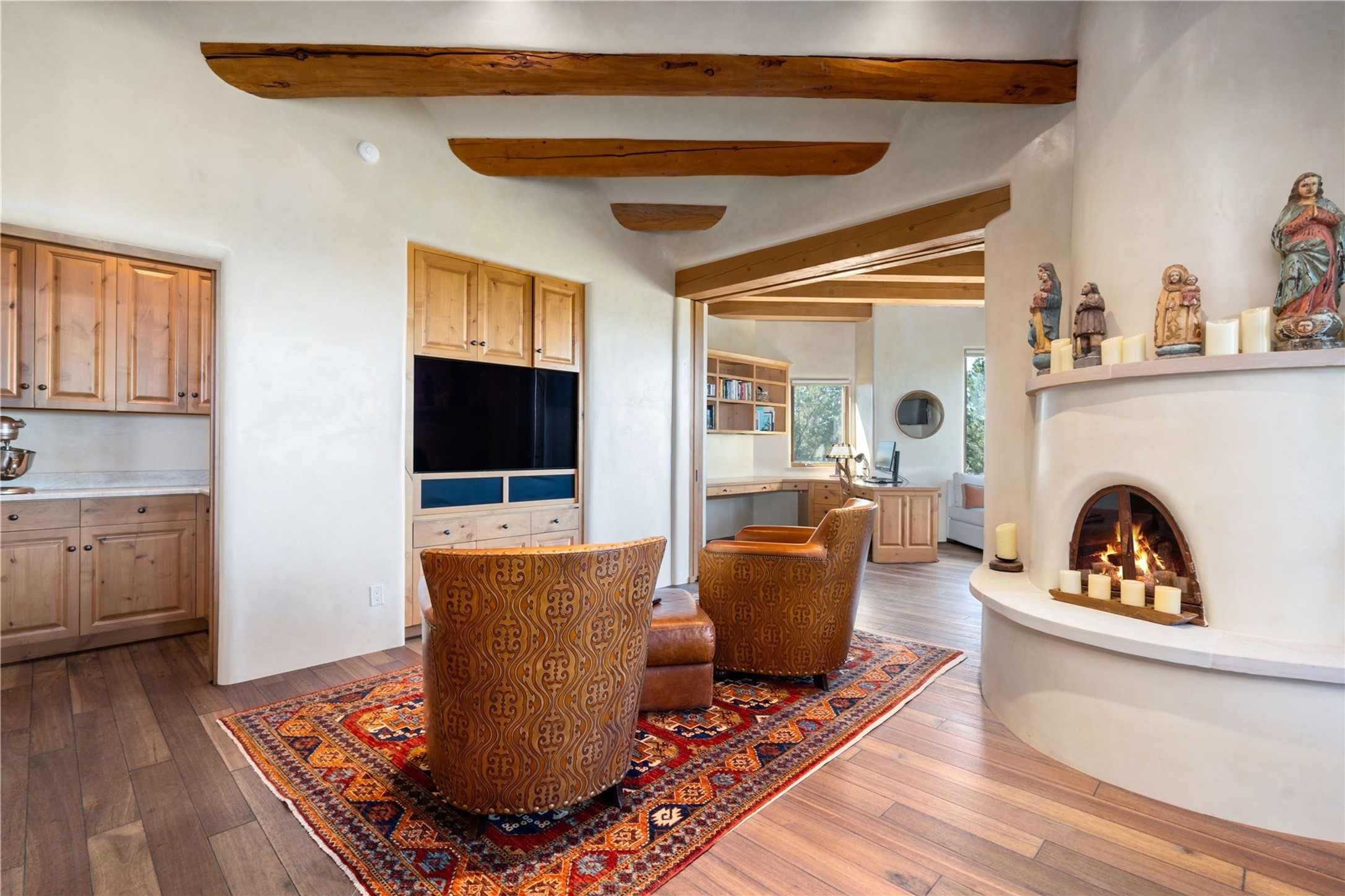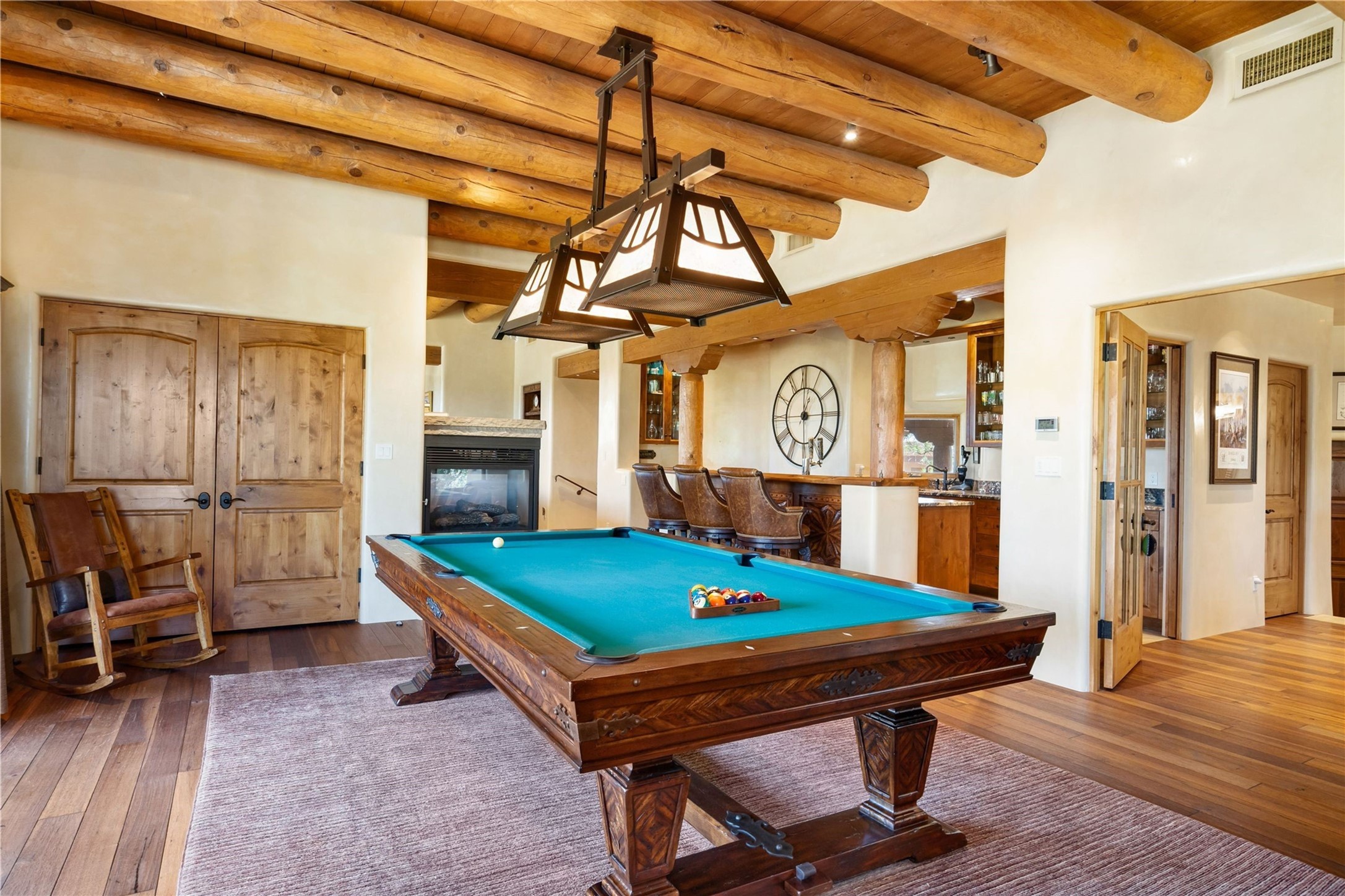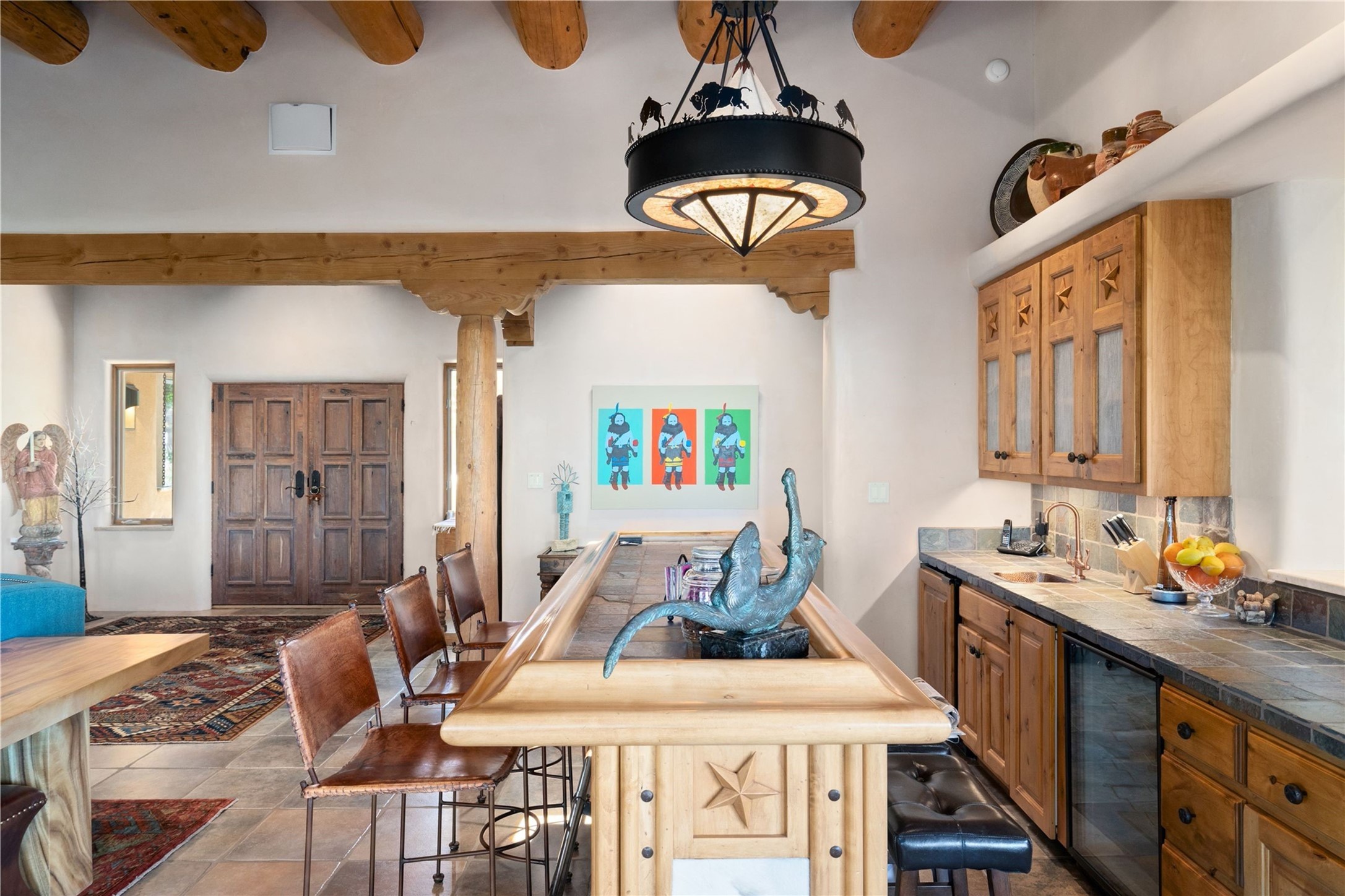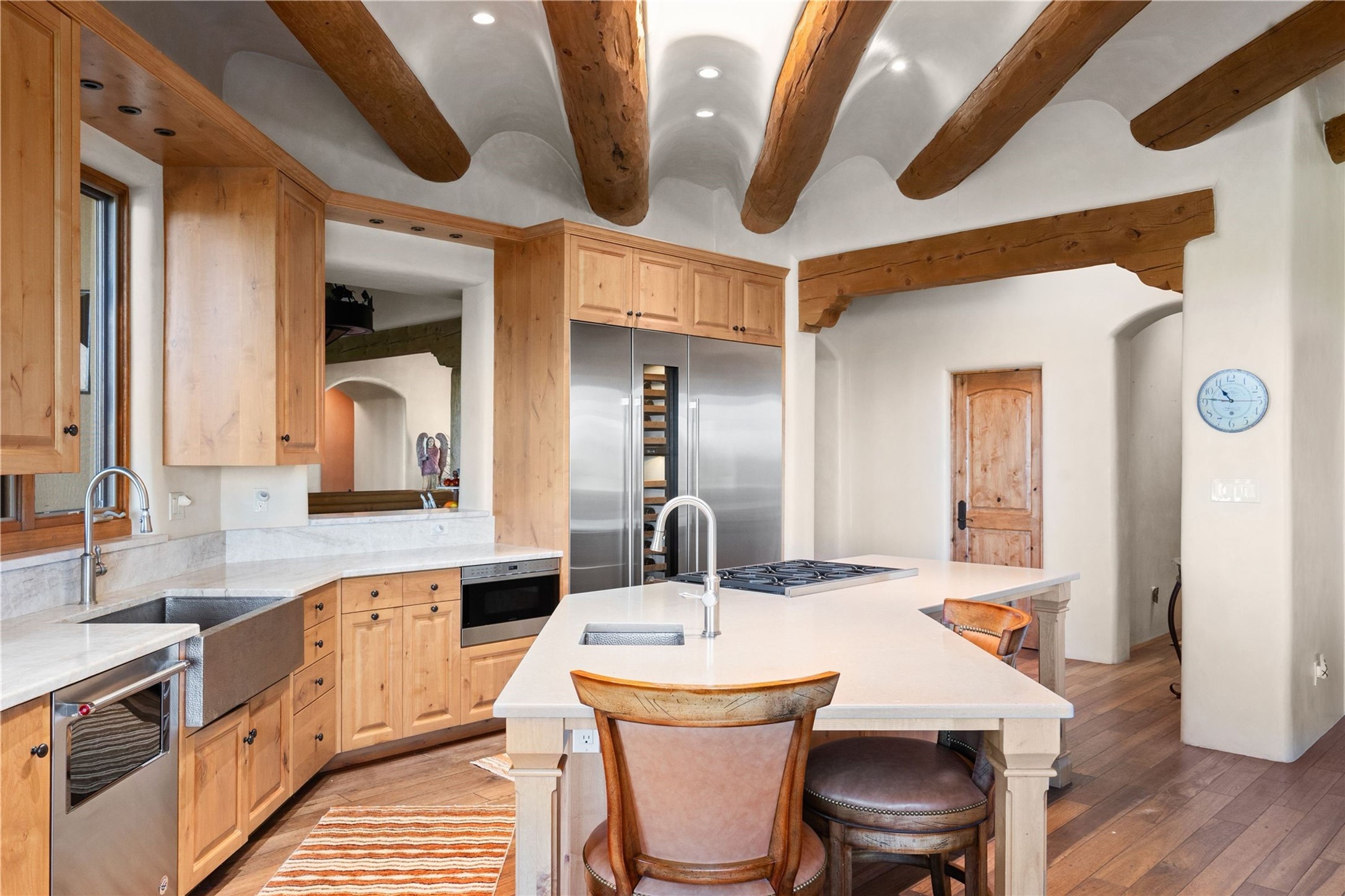 Set high on a private hilltop, and enjoying sunset mountain views, this custom Pueblo Revival compound embodies craftsmanship, substance, and timeless Santa Fe style. Built with quality at every turn and refreshed with a new roof and stucco, the property is introduced by a grand, gated courtyard with center fountain, full poured concrete drive, and a spacious garage for 4 cars. The 3-bedroom main residence, remodeled by Kim Dressel in 2012, reveals artisan details from the moment you step into the dramatic Zaguan entry. Finishes include slate floors, carved woodwork by master craftsman David Naylor, thick plaster walls, and a freestanding bar that anchors the open living and dining spaces. The chef's island kitchen features Wolf, Sub-Zero, and wine refrigeration, ideal for both daily living and entertaining. The split-bedroom layout offers privacy, while the primary suite is a sanctuary with dual closets, built-ins with fridge, kiva fireplace, and a dedicated exercise room. Outdoor living extends to multiple portals, a rooftop deck with 360 mountain views, a full kitchen, fireplace, and an elegant in-ground cocktail pool. The 3,050 sq. ft. second residence, newly built by Kim Dressel in 2013, echoes the same solid construction and fine finishes. With 2 bedrooms, 2 living rooms, a full kitchen and dining space, carved details by David Naylor, and far-reaching Sangre de Cristo and Jemez views, it offers luxurious comfort. Special features include a built-in bar, 90-inch screen with 9-speaker theater, and an expansive portal with pizza oven, grill, and fireplace. Additional amenities--a workshop, generator, and 15,000 gallon irrigation cistern--enhance function and reliability. Only 15 minutes from The Plaza and Santa Fe Airport, this compound is ideal for multi-generational living or hosting guests in a one-of-a-kind setting where custom design, quality finishes, and Pueblo Revival authenticity define the experience. A contiguous 1.7-acre lot on Black Mesa may be available separately. Membership to the Club at Las Campanas is available for purchase and upon approval.