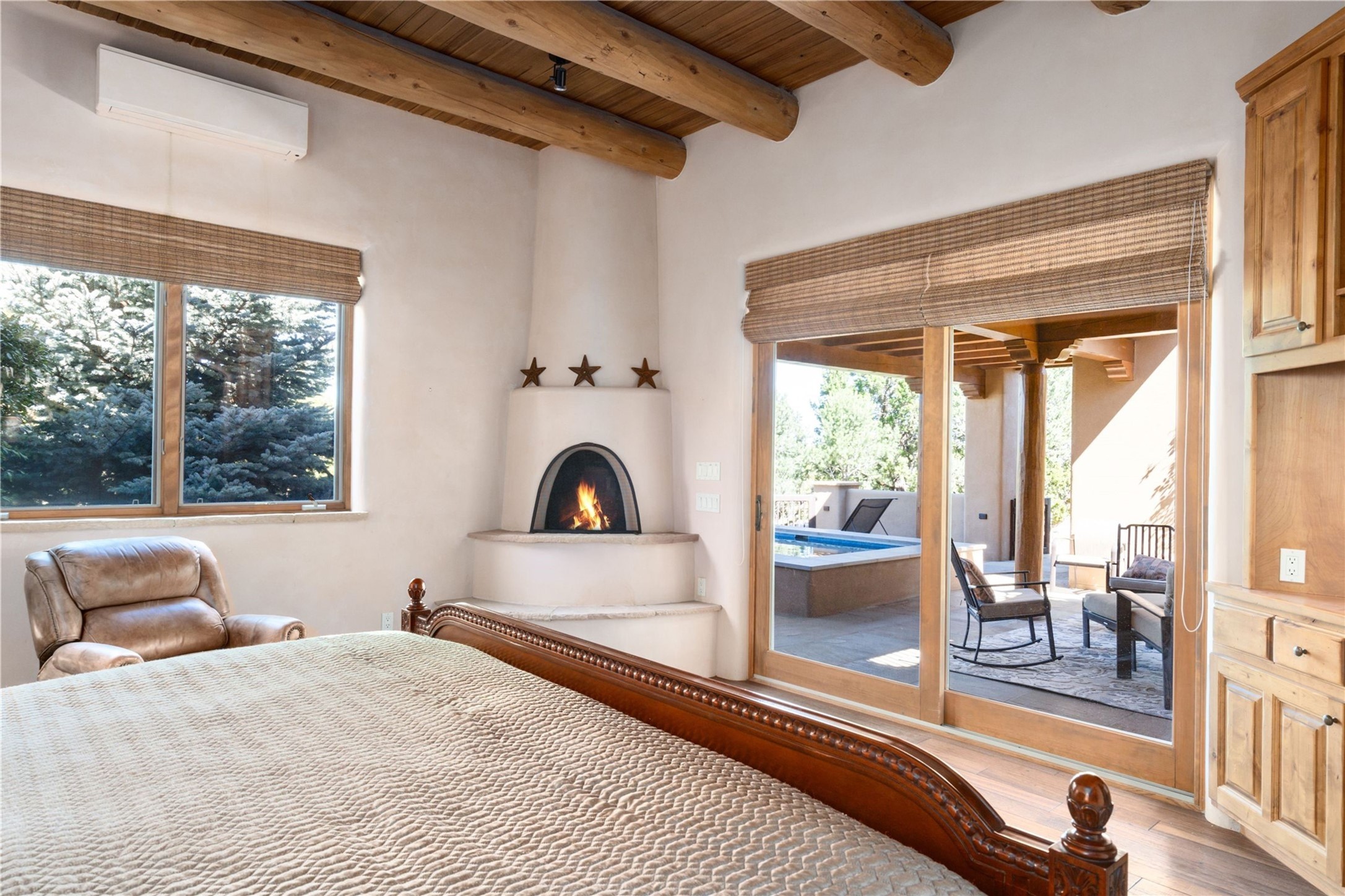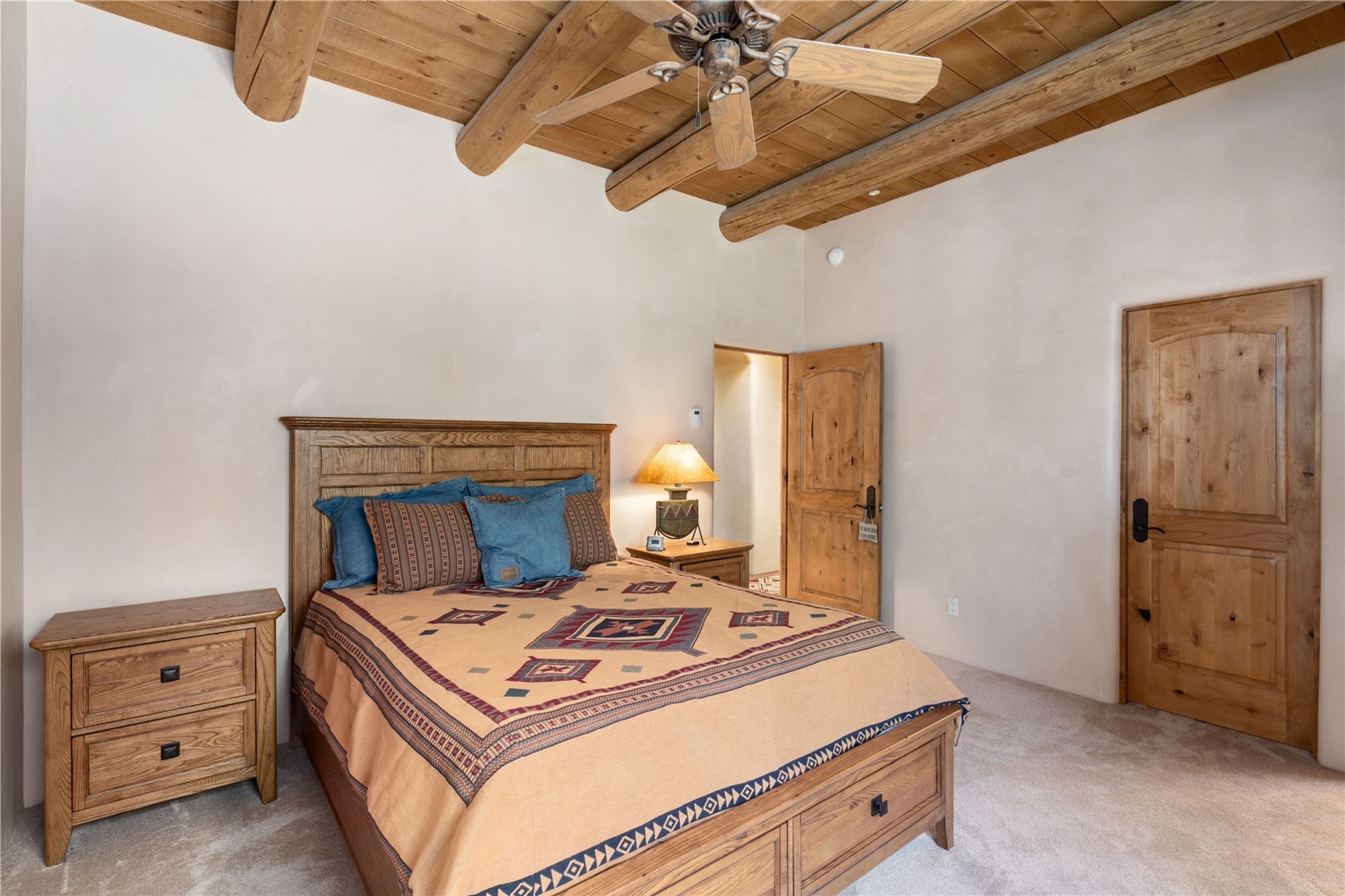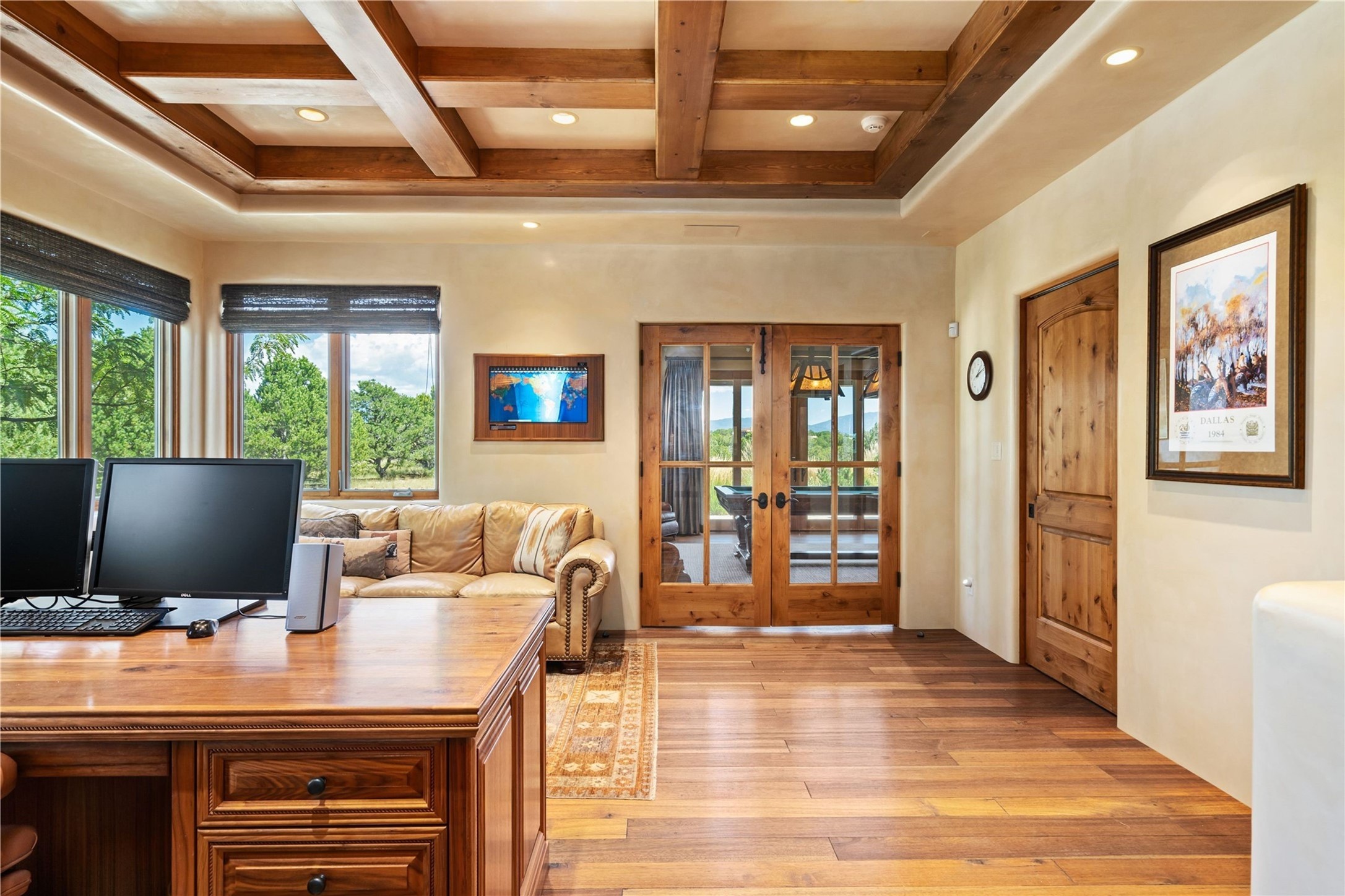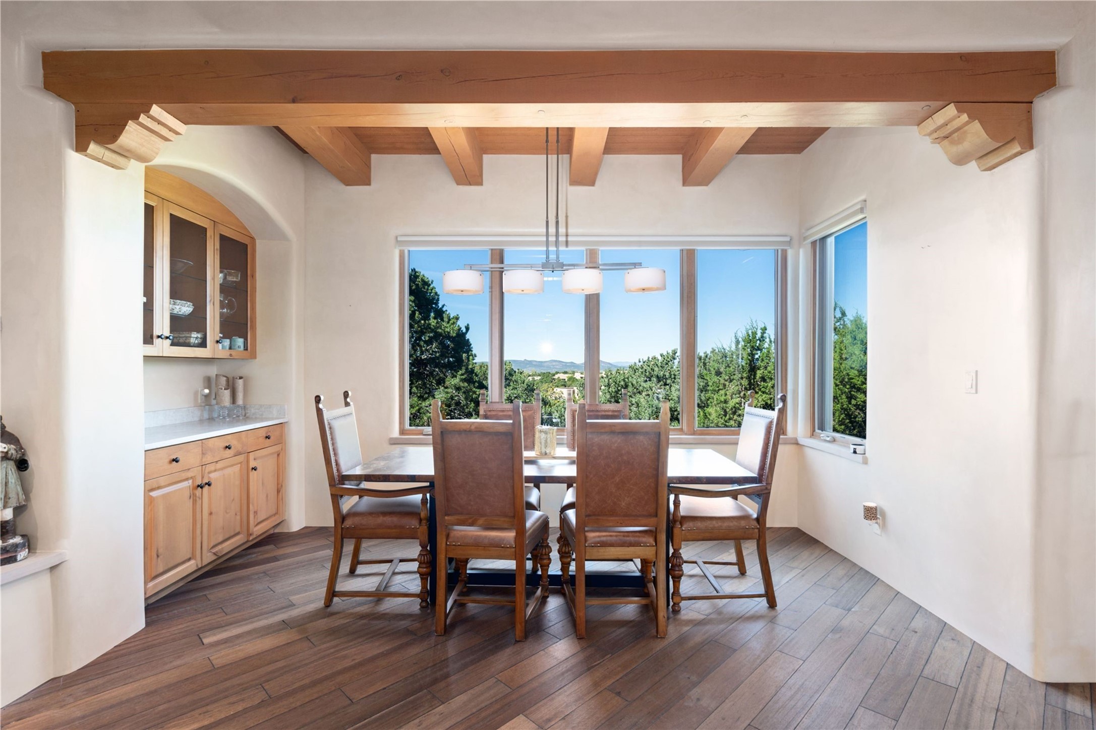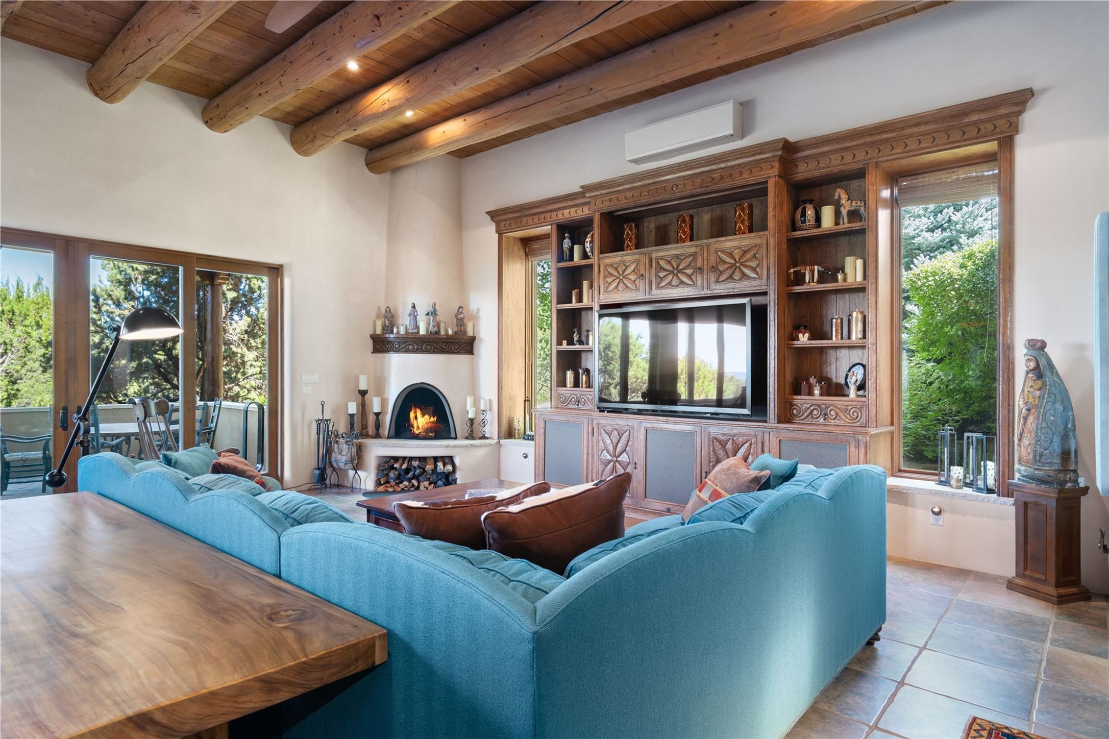 Set high on a private hilltop, and enjoying sunset mountain views, this custom Pueblo Revival compound embodies craftsmanship, substance, and timeless Santa Fe style. Built with quality at every turn and refreshed with a new roof and stucco, the property is introduced by a grand, gated courtyard with center fountain, full poured concrete drive, and a spacious garage for 4 cars. The 3-bedroom main residence, remodeled by Kim Dressel in 2012, reveals artisan details from the moment you step into the dramatic Zaguan entry. Finishes include slate floors, carved woodwork by master craftsman David Naylor, thick plaster walls, and a freestanding bar that anchors the open living and dining spaces. The chef's island kitchen features Wolf, Sub-Zero, and wine refrigeration, ideal for both daily living and entertaining. The split-bedroom layout offers privacy, while the primary suite is a sanctuary with dual closets, built-ins with fridge, kiva fireplace, and a dedicated exercise room. Outdoor living extends to multiple portals, a rooftop deck with 360 mountain views, a full kitchen, fireplace, and an elegant in-ground cocktail pool. The 3,050 sq. ft. second residence, newly built by Kim Dressel in 2013, echoes the same solid construction and fine finishes. With 2 bedrooms, 2 living rooms, a full kitchen and dining space, carved details by David Naylor, and far-reaching Sangre de Cristo and Jemez views, it offers luxurious comfort. Special features include a built-in bar, 90-inch screen with 9-speaker theater, and an expansive portal with pizza oven, grill, and fireplace. Additional amenities--a workshop, generator, and 15,000 gallon irrigation cistern--enhance function and reliability. Only 15 minutes from The Plaza and Santa Fe Airport, this compound is ideal for multi-generational living or hosting guests in a one-of-a-kind setting where custom design, quality finishes, and Pueblo Revival authenticity define the experience. A contiguous 1.7-acre lot on Black Mesa may be available separately. Membership to the Club at Las Campanas is available for purchase and upon approval.