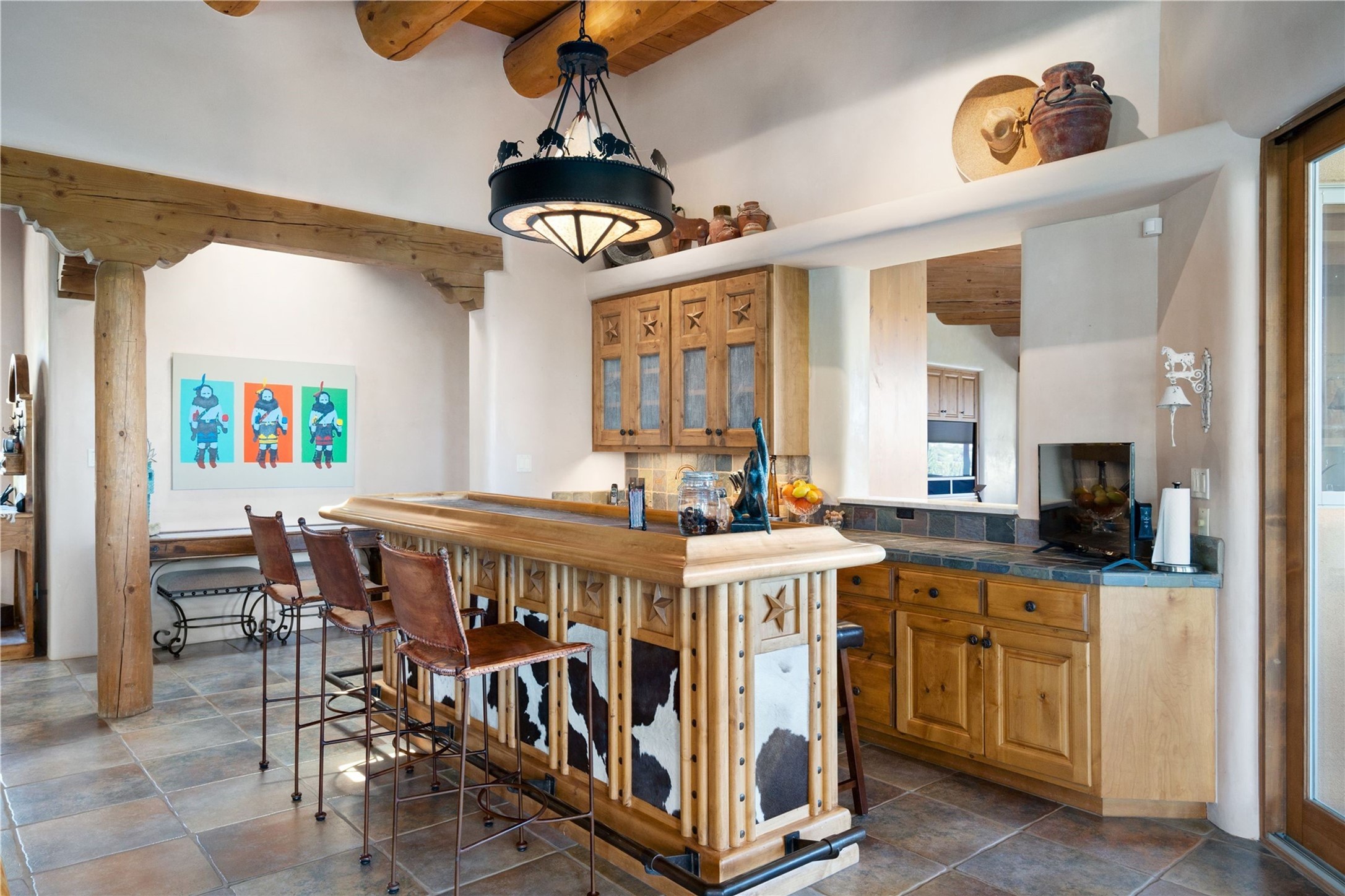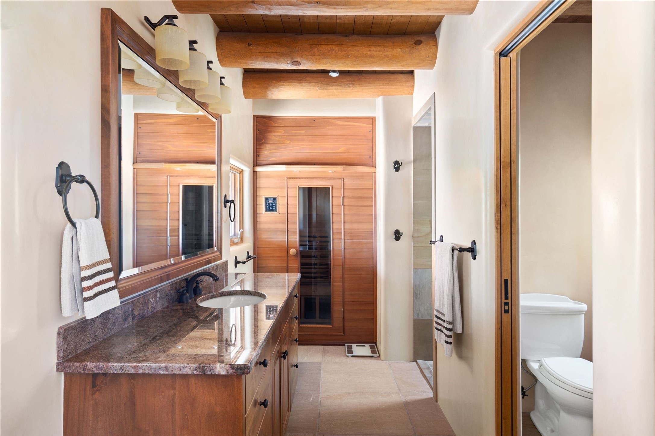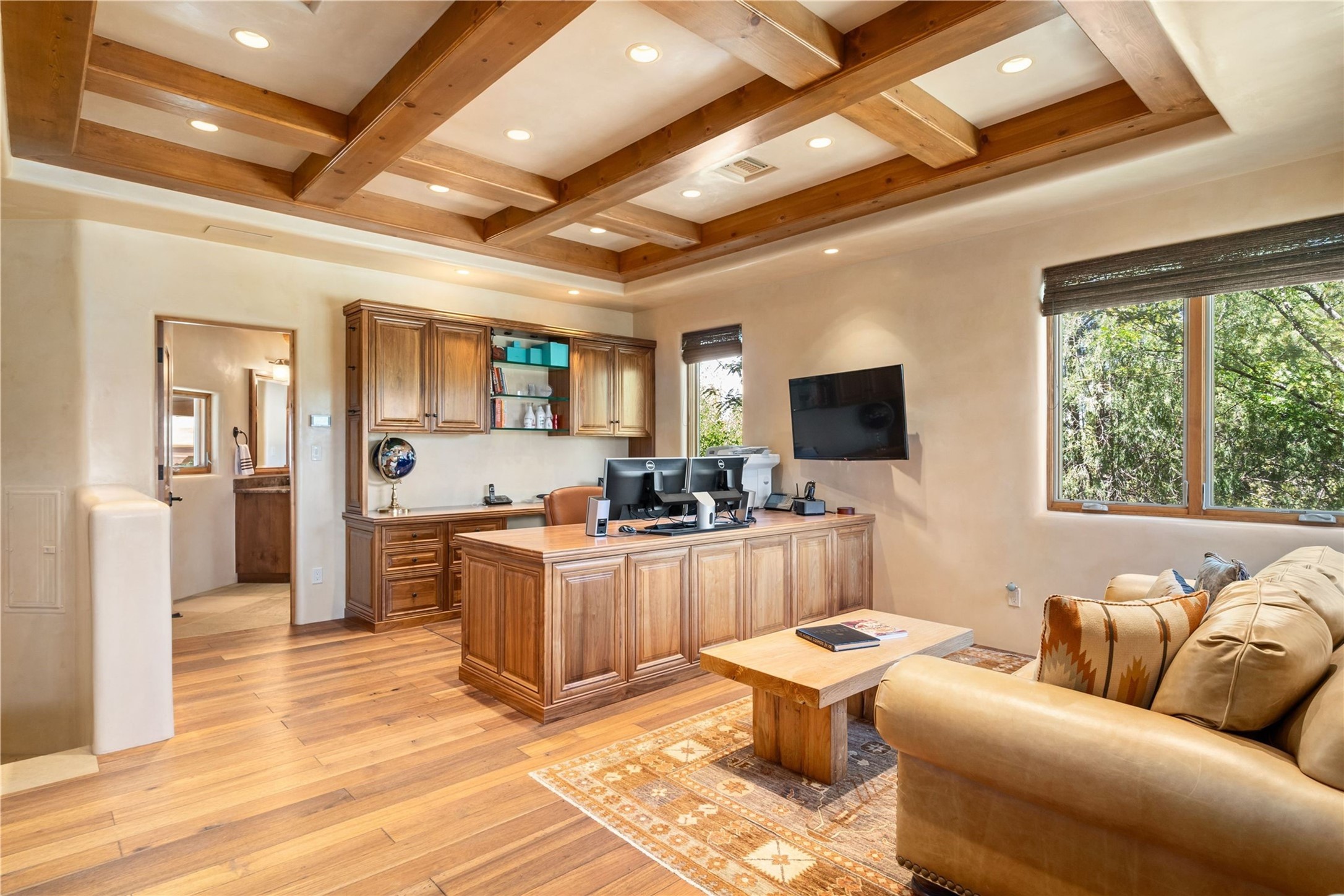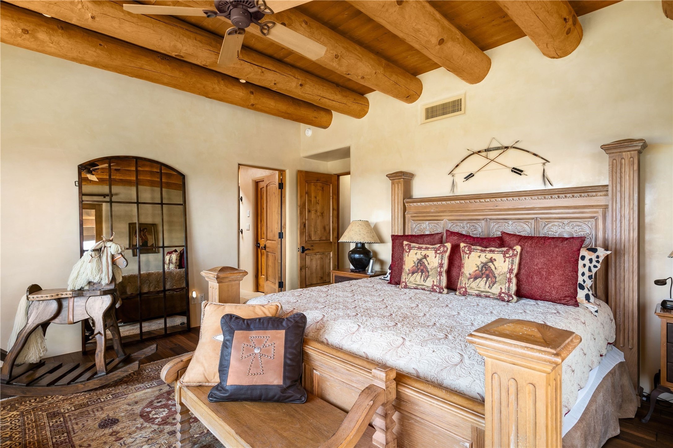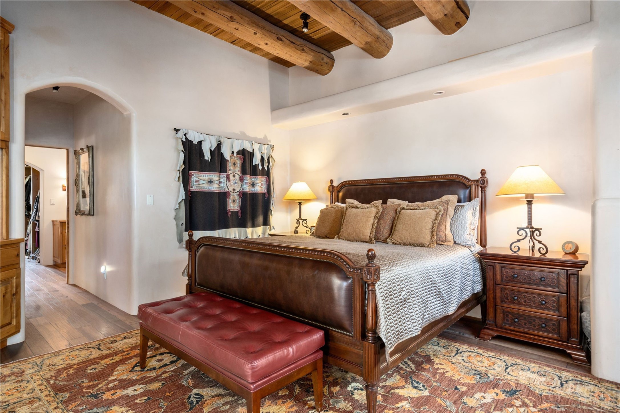 Set high on a private hilltop, and enjoying sunset mountain views, this custom Pueblo Revival compound embodies craftsmanship, substance, and timeless Santa Fe style. Built with quality at every turn and refreshed with a new roof and stucco, the property is introduced by a grand, gated courtyard with center fountain, full poured concrete drive, and a spacious garage for 4 cars. The 3-bedroom main residence, remodeled by Kim Dressel in 2012, reveals artisan details from the moment you step into the dramatic Zaguan entry. Finishes include slate floors, carved woodwork by master craftsman David Naylor, thick plaster walls, and a freestanding bar that anchors the open living and dining spaces. The chef's island kitchen features Wolf, Sub-Zero, and wine refrigeration, ideal for both daily living and entertaining. The split-bedroom layout offers privacy, while the primary suite is a sanctuary with dual closets, built-ins with fridge, kiva fireplace, and a dedicated exercise room. Outdoor living extends to multiple portals, a rooftop deck with 360 mountain views, a full kitchen, fireplace, and an elegant in-ground cocktail pool. The 3,050 sq. ft. second residence, newly built by Kim Dressel in 2013, echoes the same solid construction and fine finishes. With 2 bedrooms, 2 living rooms, a full kitchen and dining space, carved details by David Naylor, and far-reaching Sangre de Cristo and Jemez views, it offers luxurious comfort. Special features include a built-in bar, 90-inch screen with 9-speaker theater, and an expansive portal with pizza oven, grill, and fireplace. Additional amenities--a workshop, generator, and 15,000 gallon irrigation cistern--enhance function and reliability. Only 15 minutes from The Plaza and Santa Fe Airport, this compound is ideal for multi-generational living or hosting guests in a one-of-a-kind setting where custom design, quality finishes, and Pueblo Revival authenticity define the experience. A contiguous 1.7-acre lot on Black Mesa may be available separately. Membership to the Club at Las Campanas is available for purchase and upon approval.