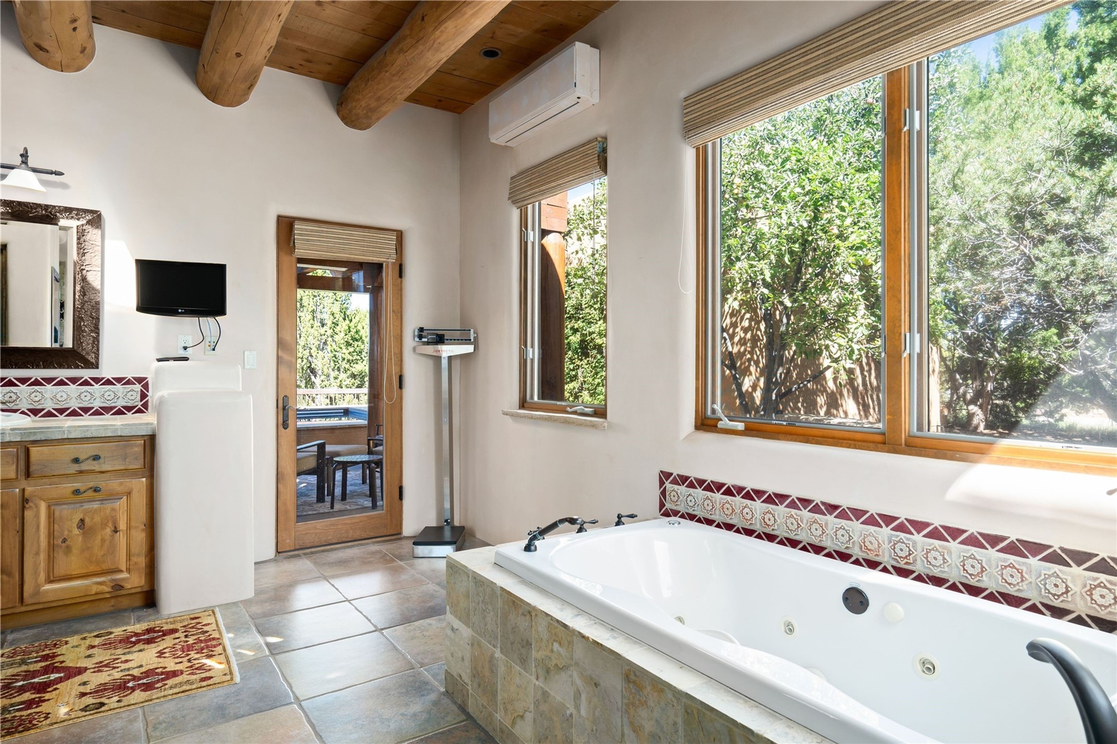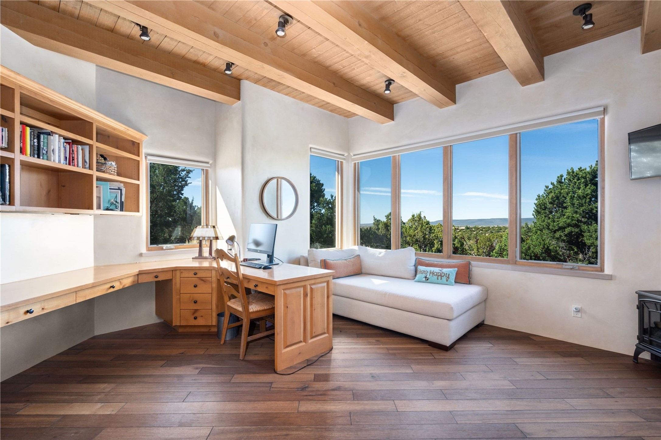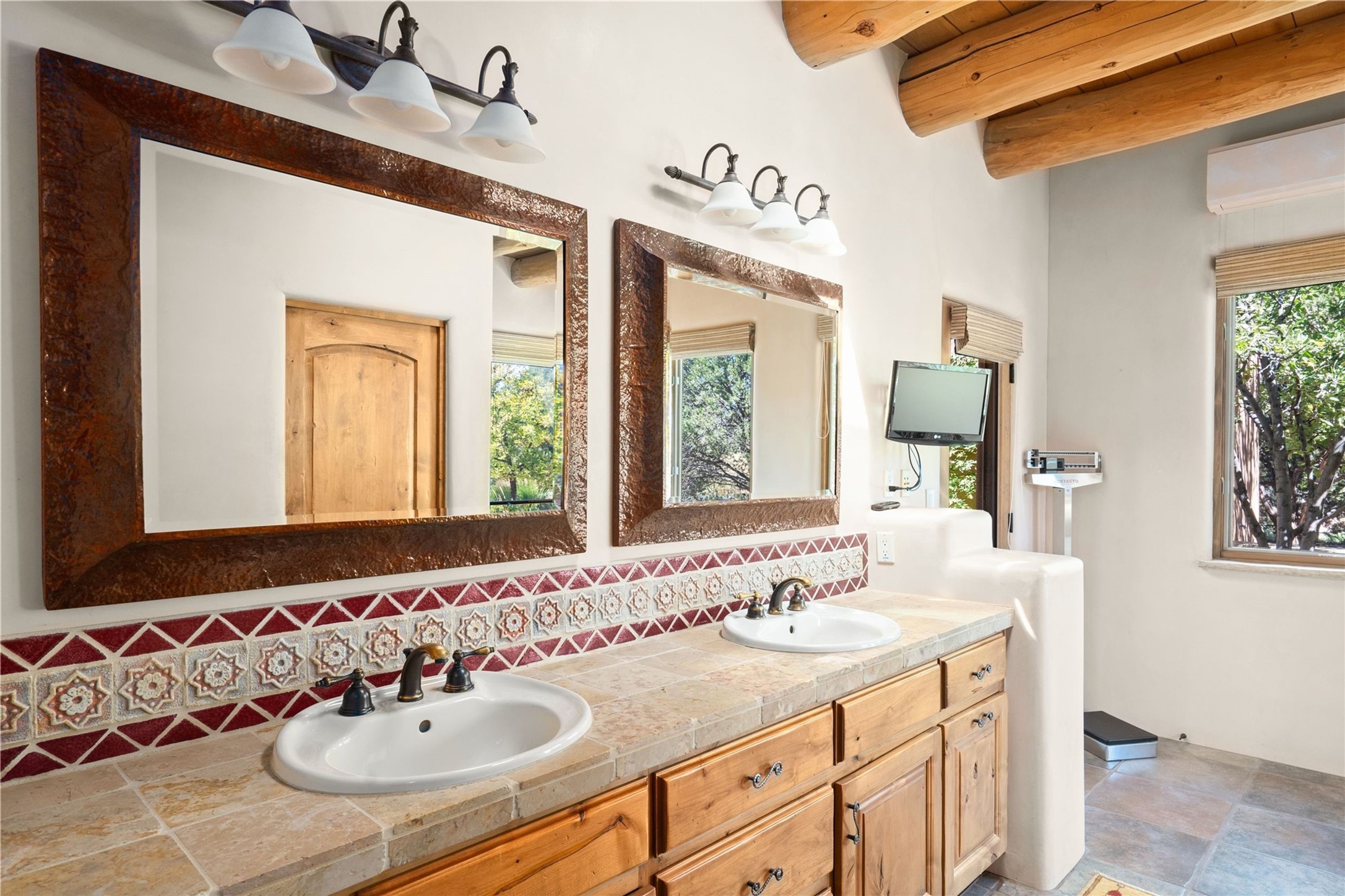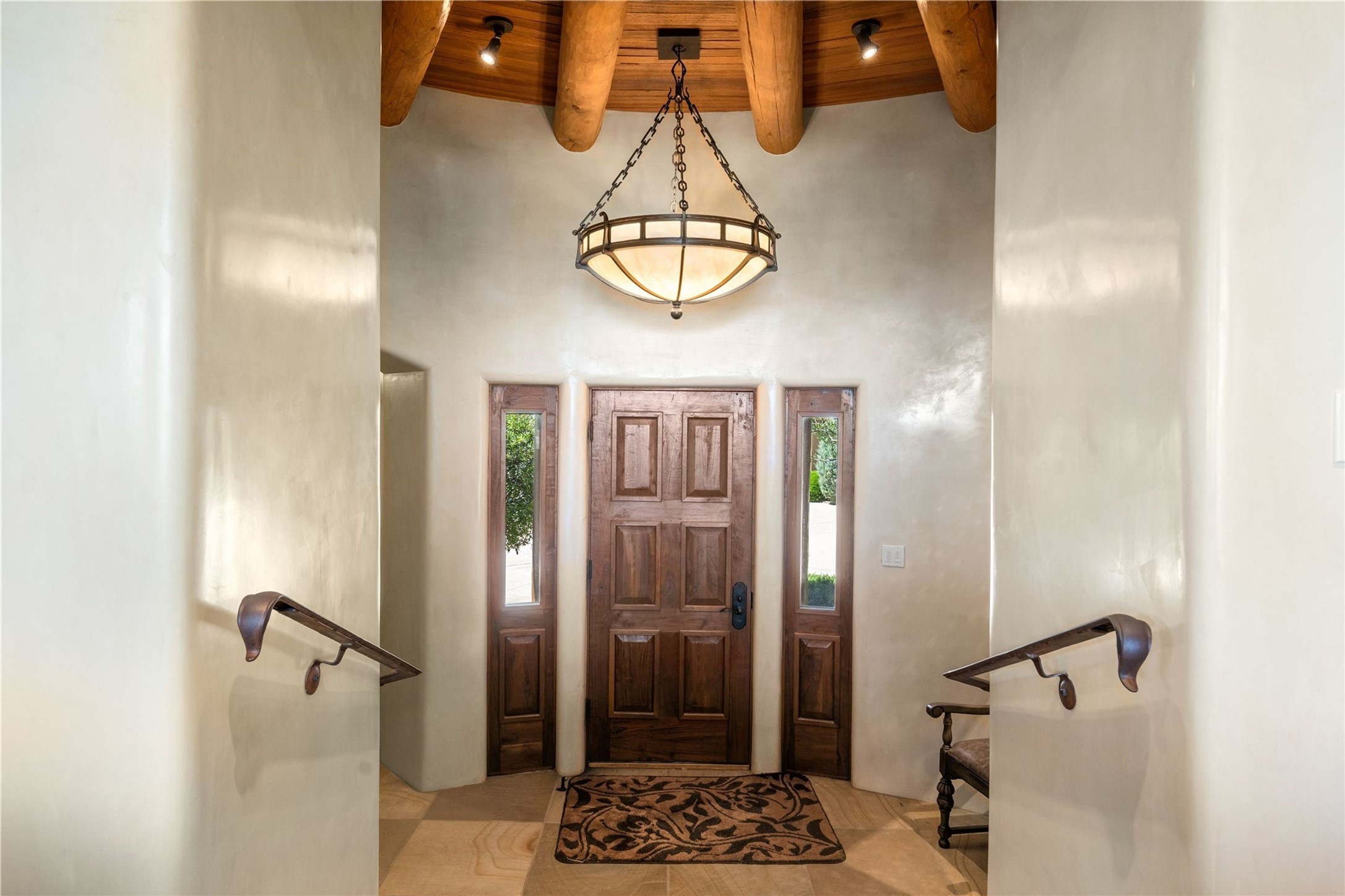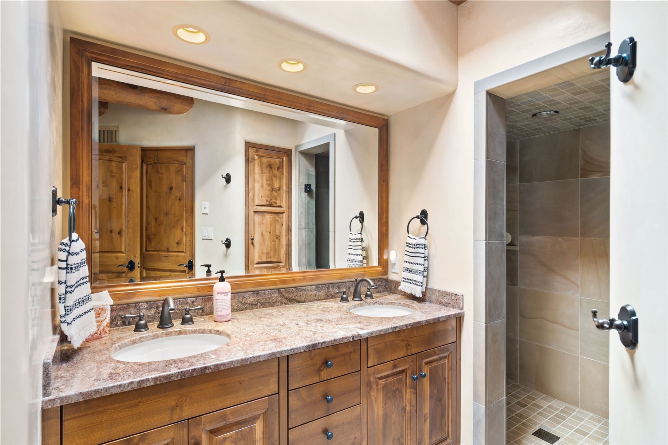 Set high on a private hilltop, and enjoying sunset mountain views, this custom Pueblo Revival compound embodies craftsmanship, substance, and timeless Santa Fe style. Built with quality at every turn and refreshed with a new roof and stucco, the property is introduced by a grand, gated courtyard with center fountain, full poured concrete drive, and a spacious garage for 4 cars. The 3-bedroom main residence, remodeled by Kim Dressel in 2012, reveals artisan details from the moment you step into the dramatic Zaguan entry. Finishes include slate floors, carved woodwork by master craftsman David Naylor, thick plaster walls, and a freestanding bar that anchors the open living and dining spaces. The chef's island kitchen features Wolf, Sub-Zero, and wine refrigeration, ideal for both daily living and entertaining. The split-bedroom layout offers privacy, while the primary suite is a sanctuary with dual closets, built-ins with fridge, kiva fireplace, and a dedicated exercise room. Outdoor living extends to multiple portals, a rooftop deck with 360 mountain views, a full kitchen, fireplace, and an elegant in-ground cocktail pool. The 3,050 sq. ft. second residence, newly built by Kim Dressel in 2013, echoes the same solid construction and fine finishes. With 2 bedrooms, 2 living rooms, a full kitchen and dining space, carved details by David Naylor, and far-reaching Sangre de Cristo and Jemez views, it offers luxurious comfort. Special features include a built-in bar, 90-inch screen with 9-speaker theater, and an expansive portal with pizza oven, grill, and fireplace. Additional amenities--a workshop, generator, and 15,000 gallon irrigation cistern--enhance function and reliability. Only 15 minutes from The Plaza and Santa Fe Airport, this compound is ideal for multi-generational living or hosting guests in a one-of-a-kind setting where custom design, quality finishes, and Pueblo Revival authenticity define the experience. A contiguous 1.7-acre lot on Black Mesa may be available separately. Membership to the Club at Las Campanas is available for purchase and upon approval.