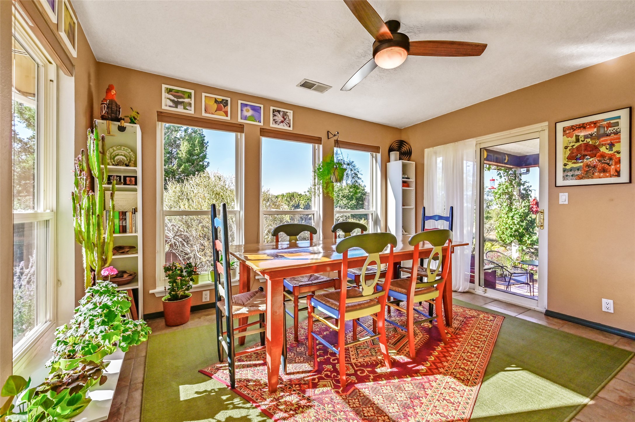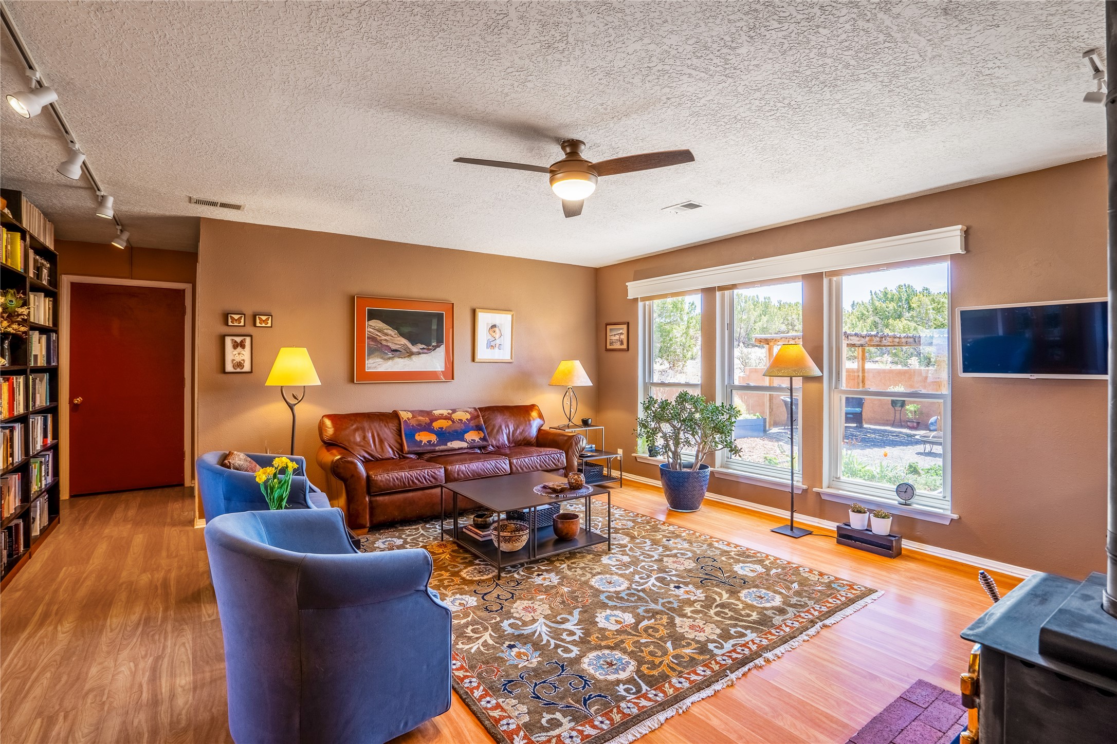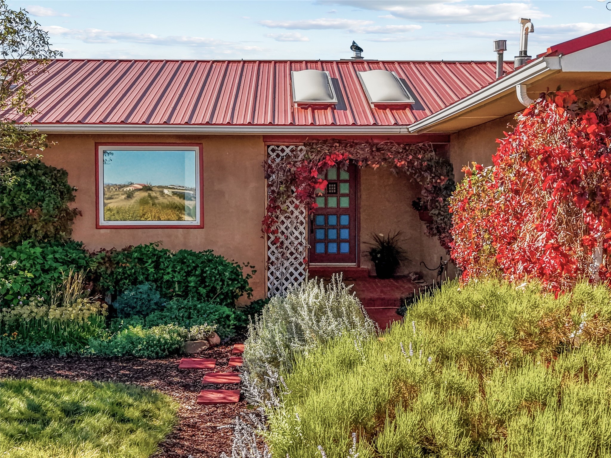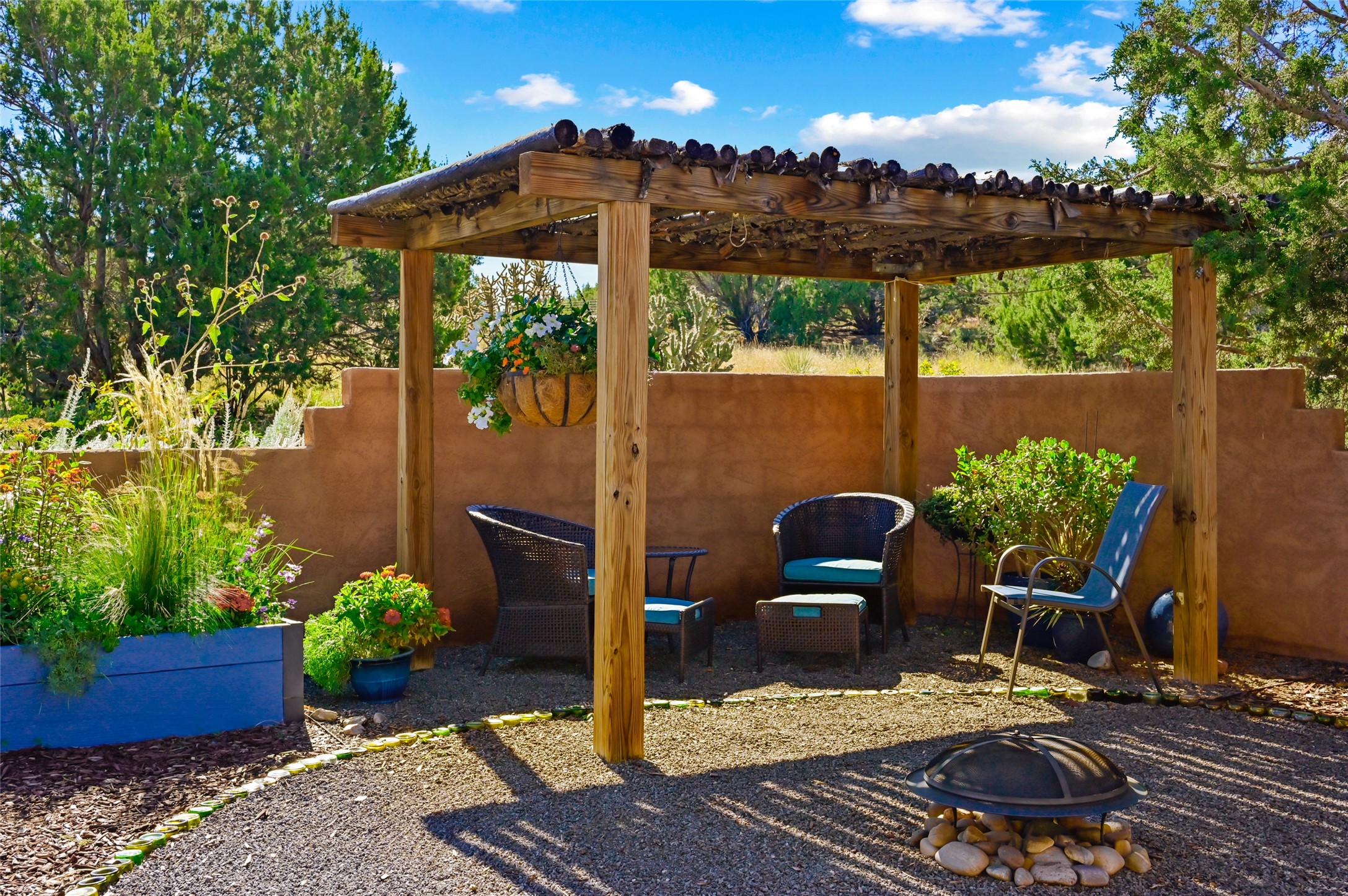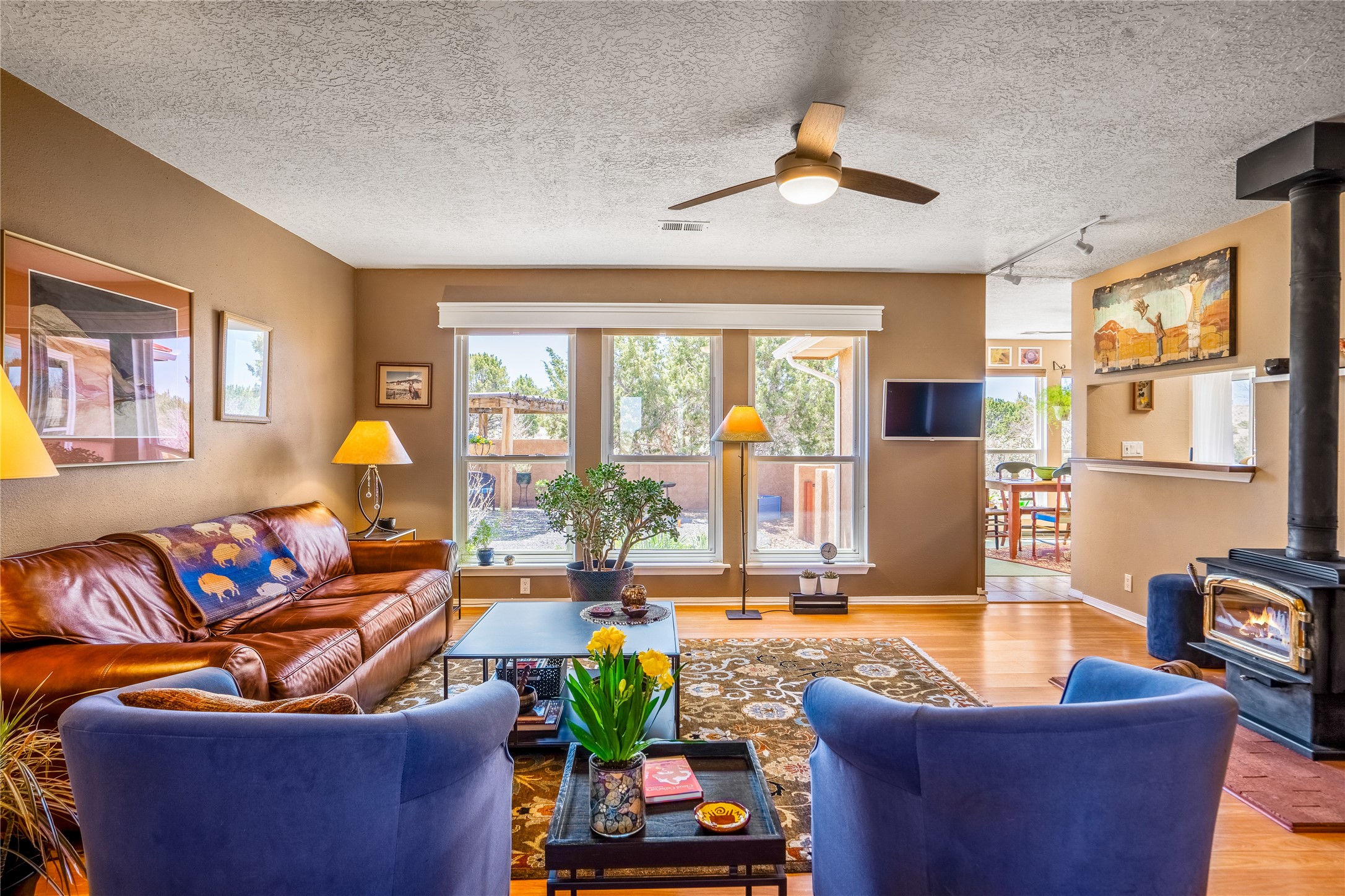 This sparkling, light-filled New Mexico ranch house, set on a gentle hillside among mature trees, wildflowers, and expansive mountain views, offers an easy blend of indoor and outdoor living. It includes 3+ fully fenced acres, located on a quiet road just north of the historic, artists' village of Cerrillos and just south of Santa Fe. Horses are allowed or may be boarded nearby. Inside, a thoughtfully designed layout flows from room to room, offering versatility for entertaining, home-business, or family use. The spacious living room has a wood-burning stove and convenient pass-through access to the kitchen. The kitchen features custom tiled floors and trim, all new appliances, and ample counter space. A large adjoining dining area is surrounded by tall windows. It opens to a covered patio and rear courtyard, complete with a ramada for shade and a fire ring for cool-season conversations under the stars. The primary suite catches the morning sun and opens onto a secluded rock garden. It features a lavish tiled bath and walk-in closet. Down the hall you'll find two generously sized bedrooms, a recently restyled bath with soaking tub, and flexible space for your office, media, studio, or whatever you can imagine. Grid-tied solar PV, a high efficiency gas furnace, upgraded windows and insulation assure low energy bills for years to come. A new water heater, supplemental water storage, and Pro-Panel roof round out the practicality of this beautiful place you'll want to come home to. Highly rated charter schools with bus service nearby. Outdoor furnishings and equipment will stay if desired. Seller financing available.
