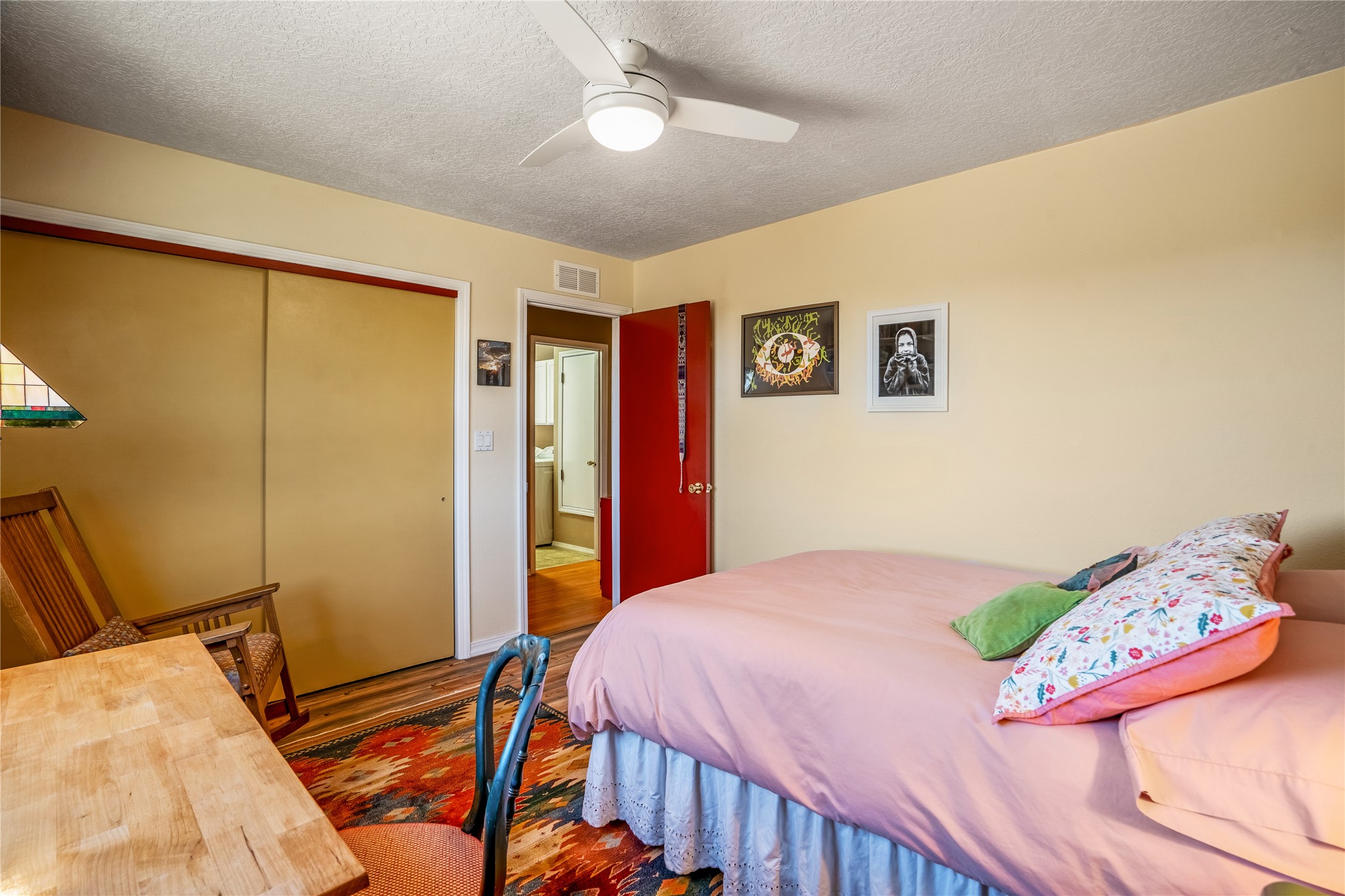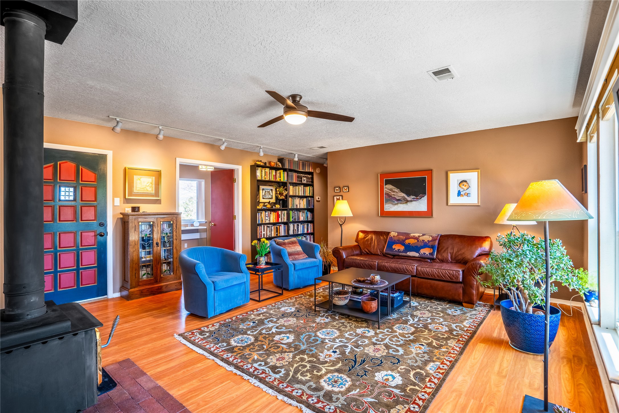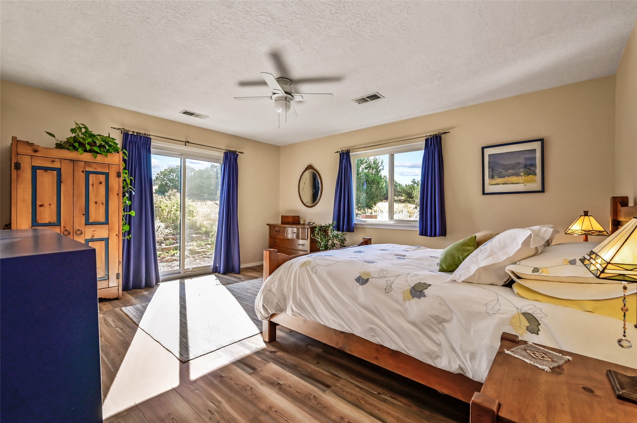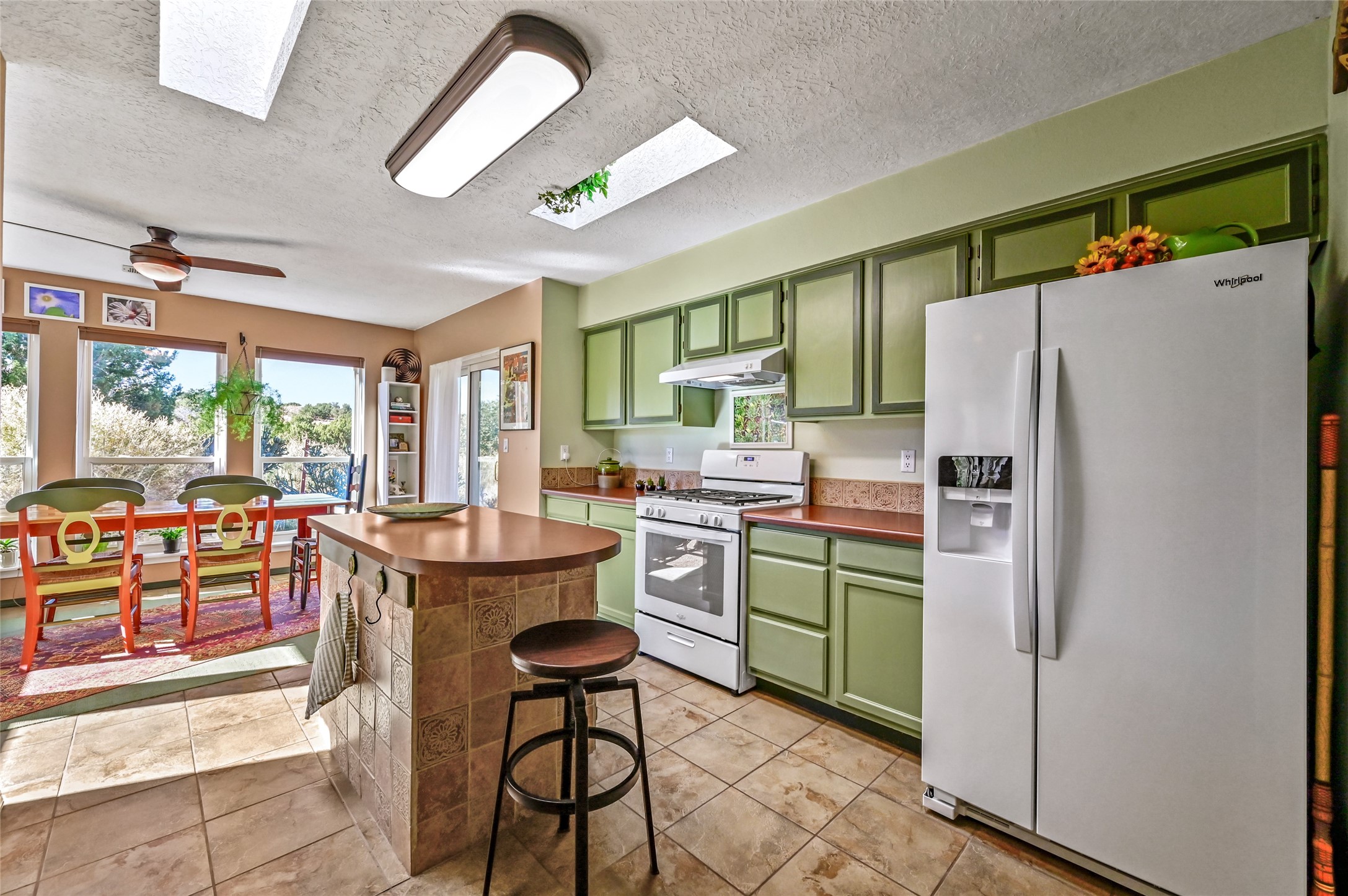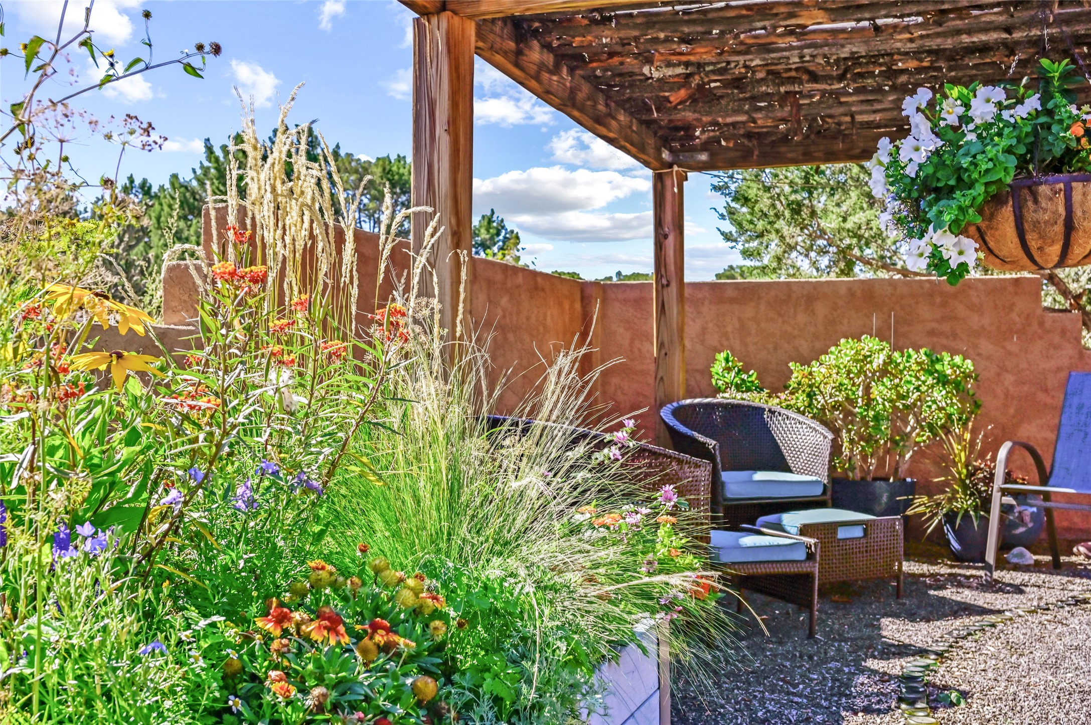 This sparkling, light-filled New Mexico ranch house, set on a gentle hillside among mature trees, wildflowers, and expansive mountain views, offers an easy blend of indoor and outdoor living. It includes 3+ fully fenced acres, located on a quiet road just north of the historic, artists' village of Cerrillos and just south of Santa Fe. Horses are allowed or may be boarded nearby. Inside, a thoughtfully designed layout flows from room to room, offering versatility for entertaining, home-business, or family use. The spacious living room has a wood-burning stove and convenient pass-through access to the kitchen. The kitchen features custom tiled floors and trim, all new appliances, and ample counter space. A large adjoining dining area is surrounded by tall windows. It opens to a covered patio and rear courtyard, complete with a ramada for shade and a fire ring for cool-season conversations under the stars. The primary suite catches the morning sun and opens onto a secluded rock garden. It features a lavish tiled bath and walk-in closet. Down the hall you'll find two generously sized bedrooms, a recently restyled bath with soaking tub, and flexible space for your office, media, studio, or whatever you can imagine. Grid-tied solar PV, a high efficiency gas furnace, upgraded windows and insulation assure low energy bills for years to come. A new water heater, supplemental water storage, and Pro-Panel roof round out the practicality of this beautiful place you'll want to come home to. Highly rated charter schools with bus service nearby. Outdoor furnishings and equipment will stay if desired. Seller financing available.