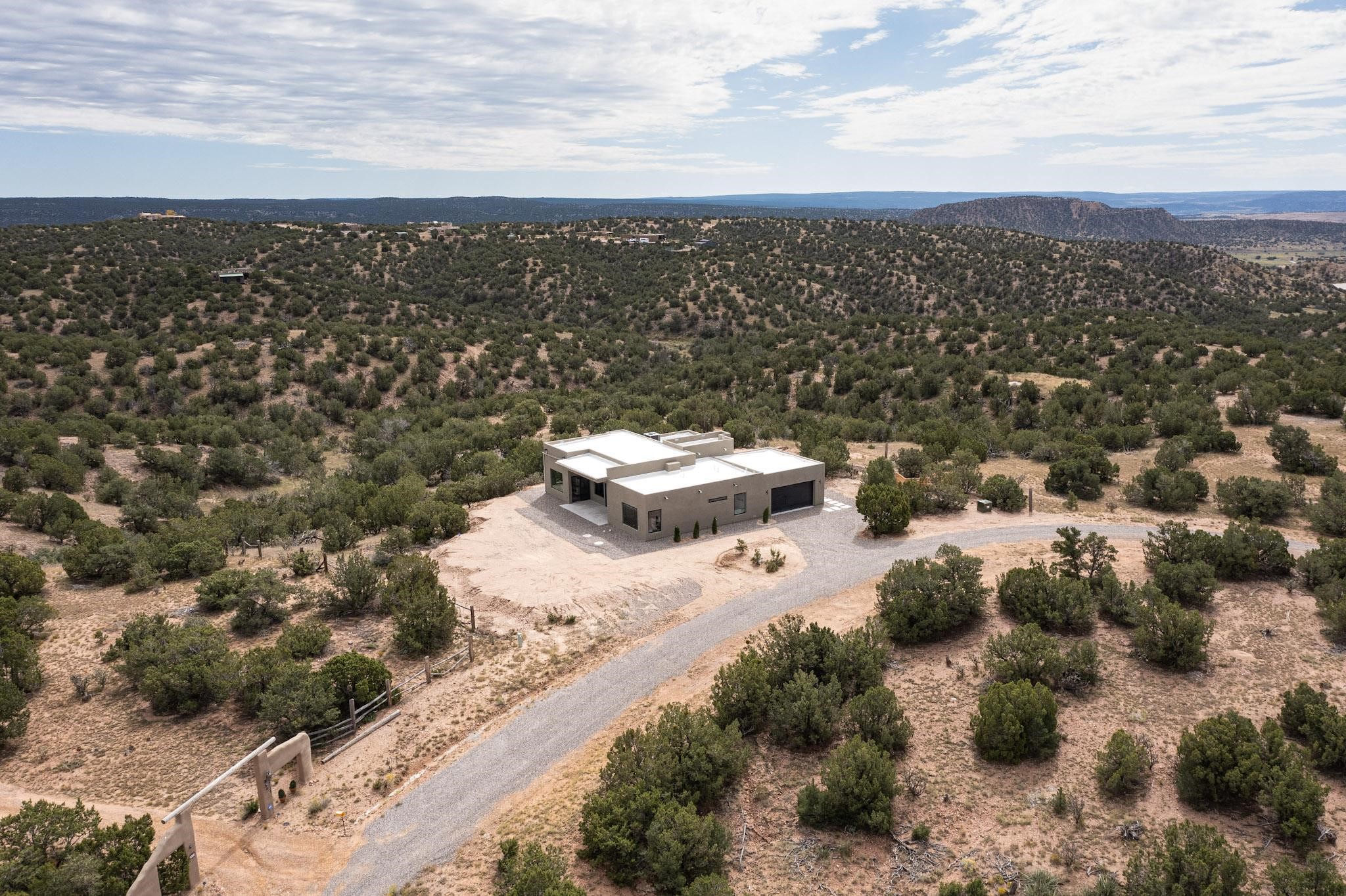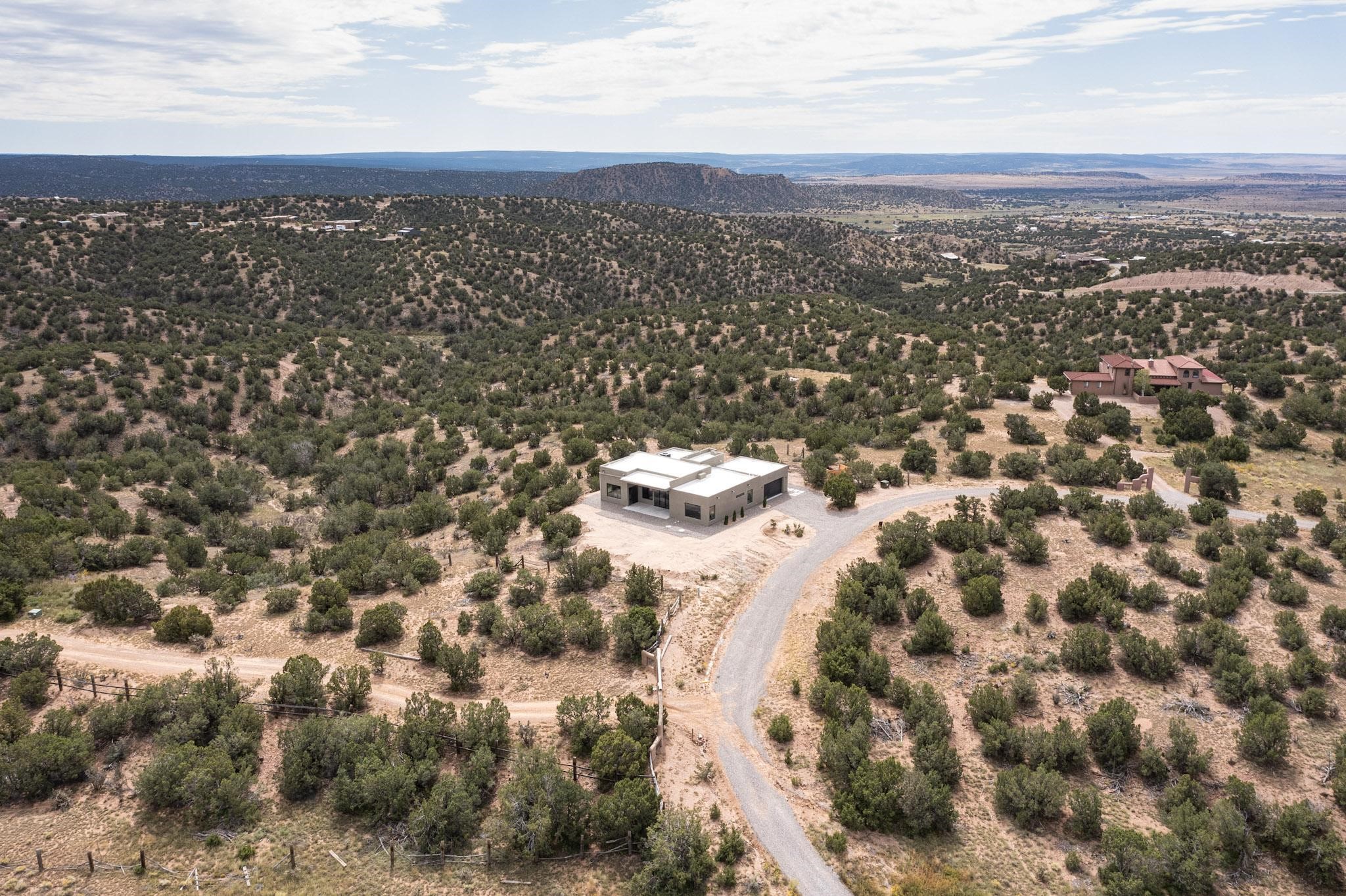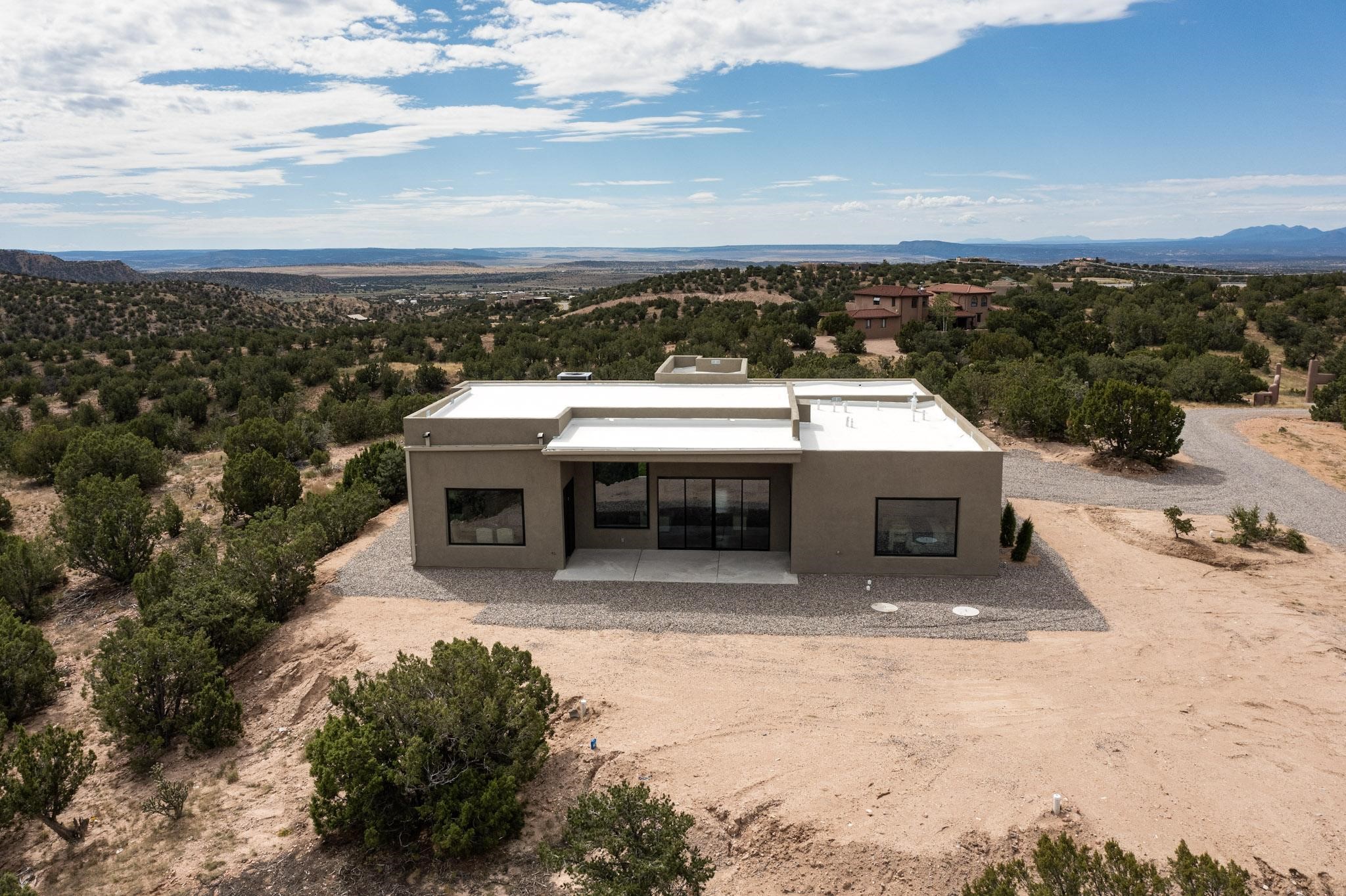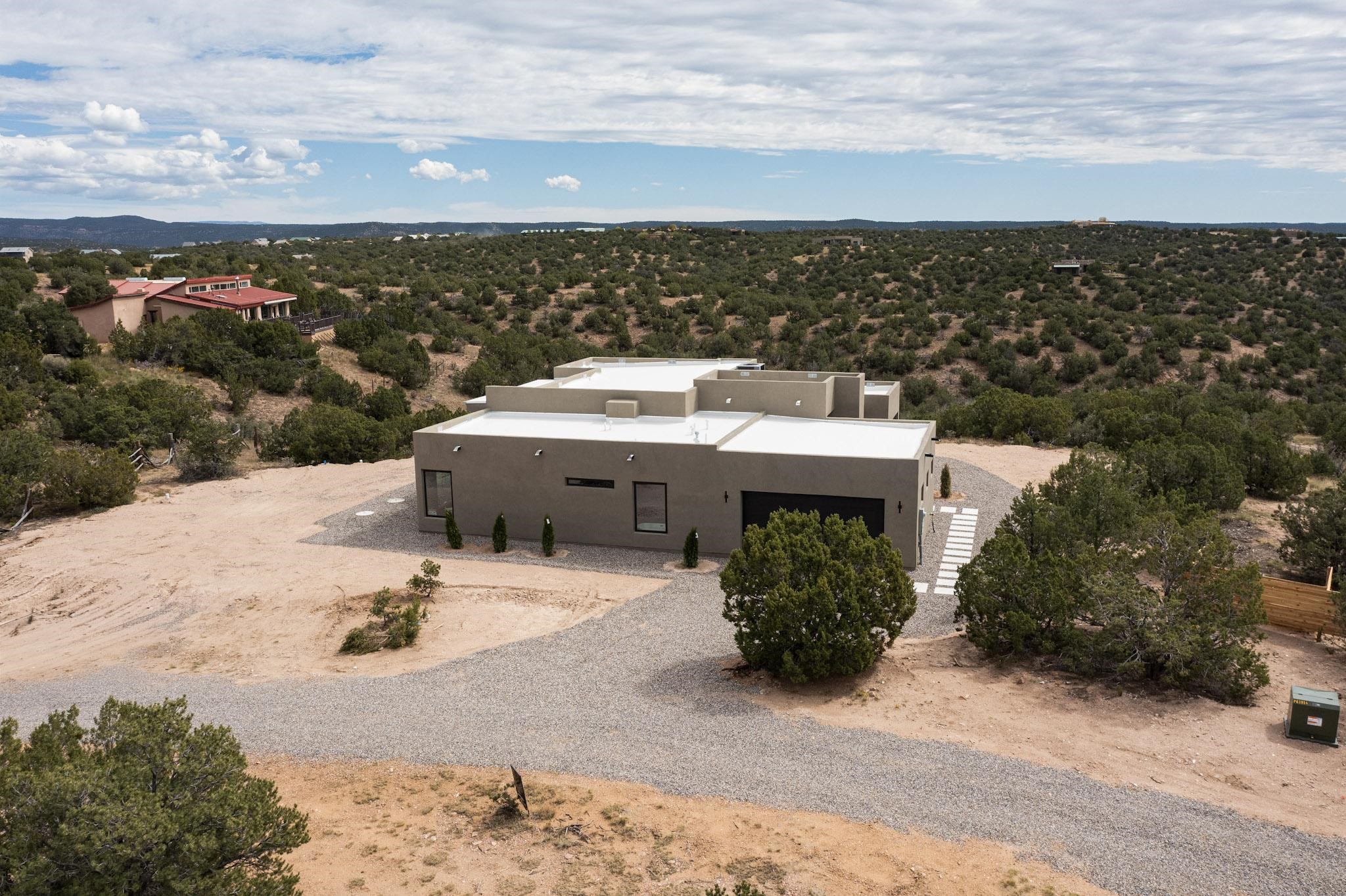 Just completed and ready for occupancy! Mountain views from every window in this new custom built contemporary pueblo style home with open floor plan situated on a huge 10.0 +/- ac. private lot in Lamy. Convenient access to US-285, the Agora shopping center, bank and restaurants. Perfect for indoor and outdoor entertaining. Open kitchen/family/dining room has floor to ceiling windows and double sliding glass doors to take in the fabulous views and access to the portal. The contemporary kitchen has a huge island bar and large walk in pantry. Every room has large picture windows with fabulous mountain views. Owner's bath has double sinks, soaking tub and large walk in shower room with double shower heads and rain showers and a large walk in closet. Home features contemporary style vigas in living areas. Three bedrooms with good separation and 2 baths. A guest house and equestrian structures are allowed, as well as 10 horses or cattle. (1 large animal per acre.) No HOA, recreational vehicles are allowed if parked inconspicuously. Connected to the Eldorado community water system. Located only 20 minutes from Downtown Santa Fe this home offers gorgeous views, rural living and easy access to everything Santa Fe has to offer. This home has it all; new home, fabulous views, great outdoor spaces, contemporary open floor plan, large private lot. Buyer to verify all information and Covenants. Seller gives $4000 credit to the buyer at closing for Range, dishwasher and microwave. Open House Sunday, October 5. 1:00 - 4:00 PM.