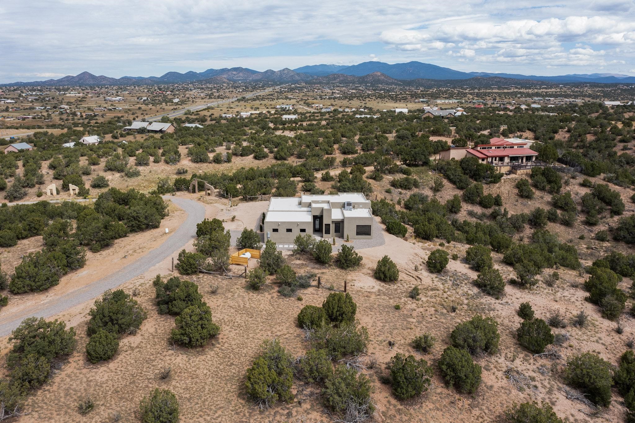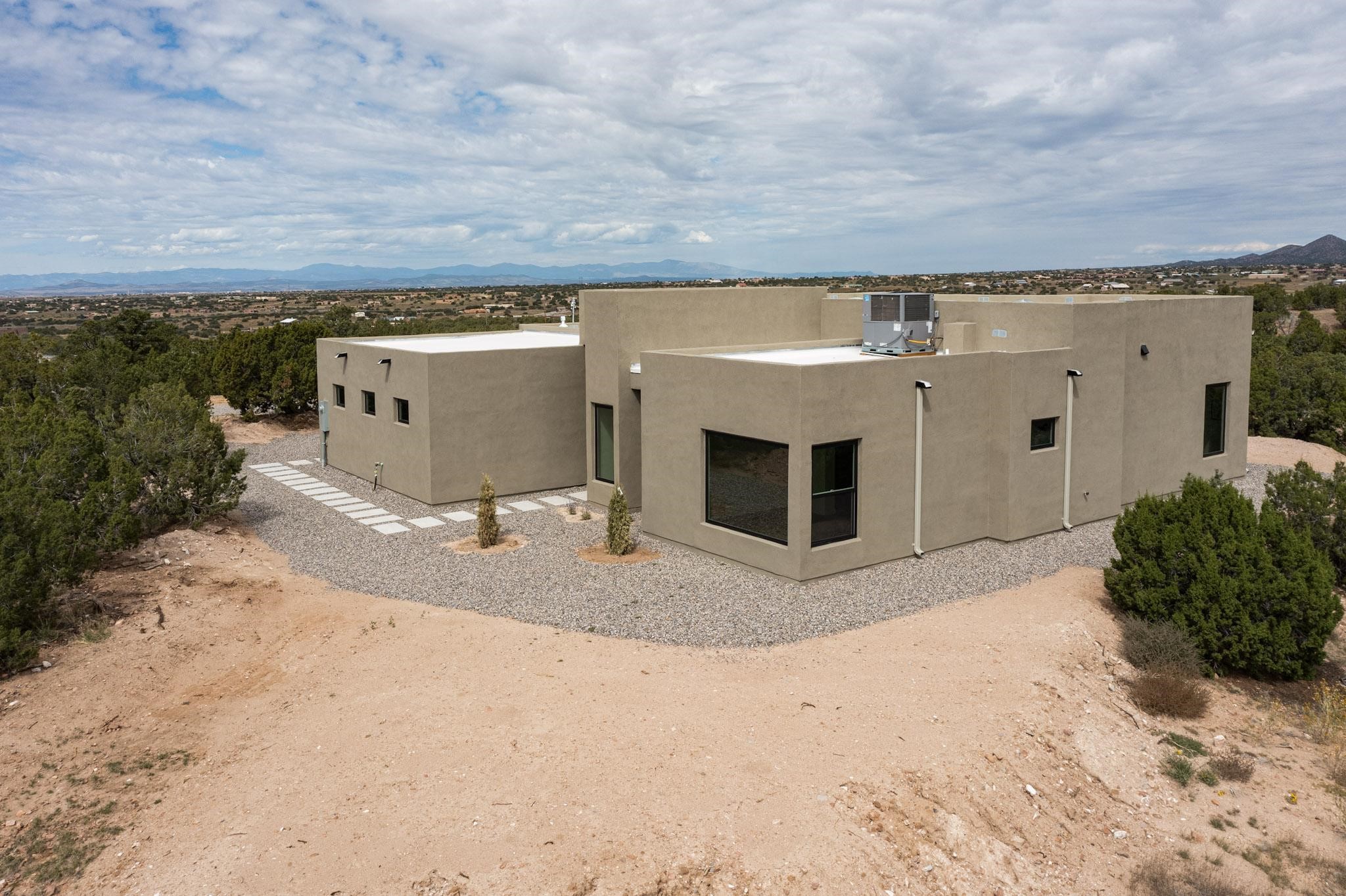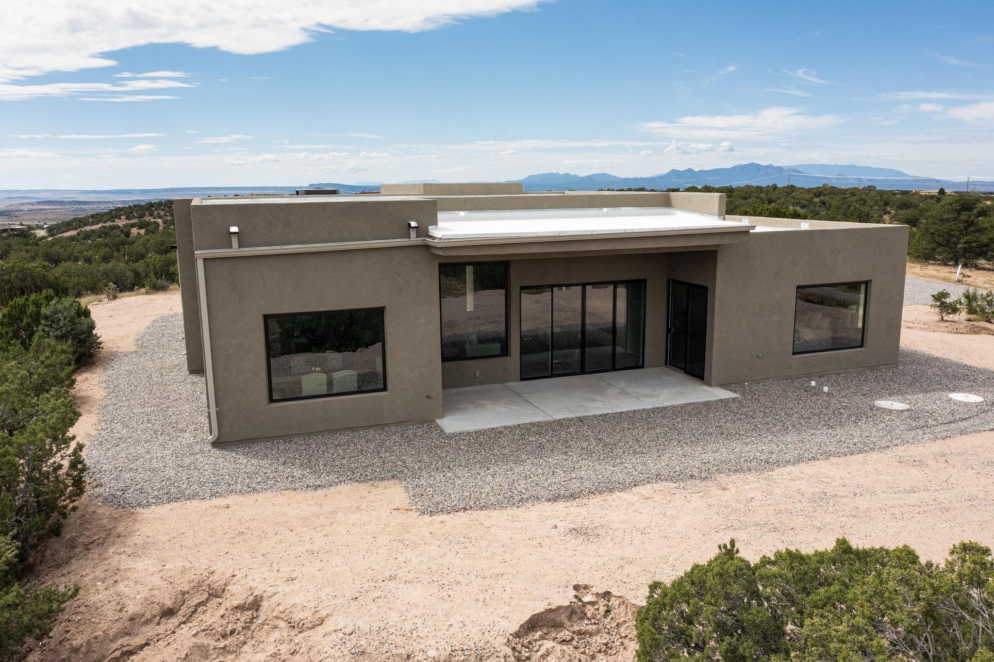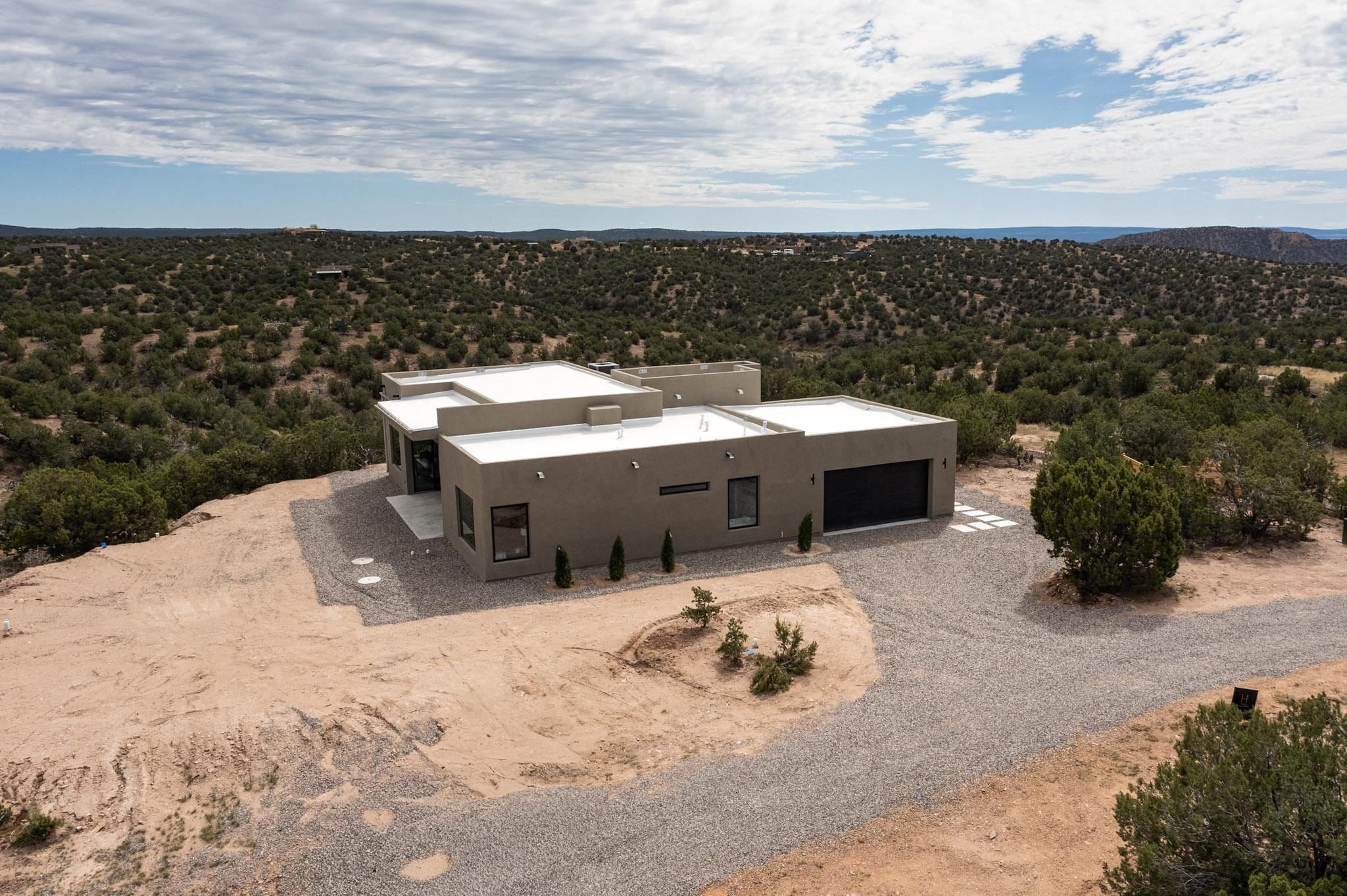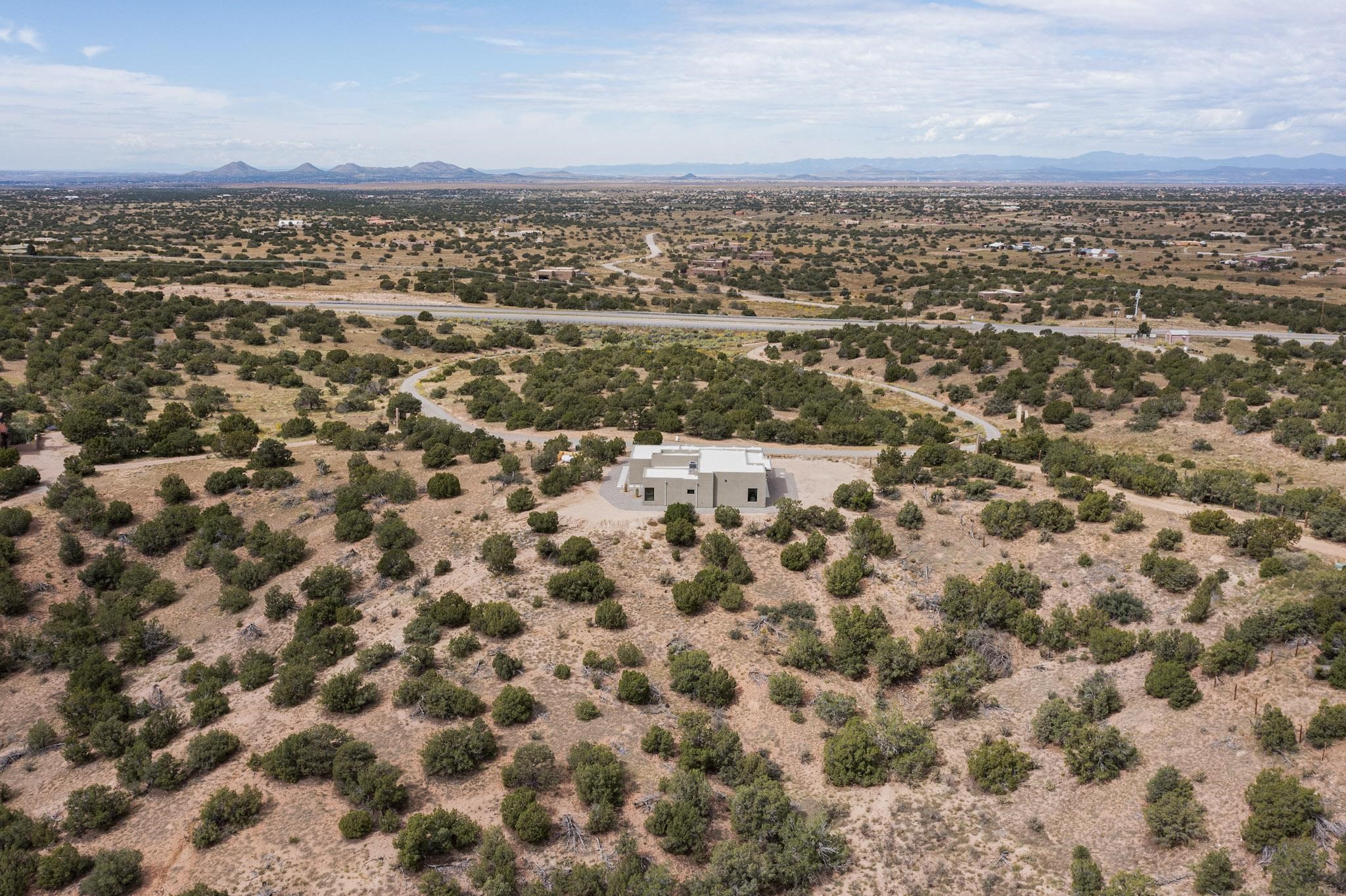 Just completed and ready for occupancy! Mountain views from every window in this new custom built contemporary pueblo style home with open floor plan situated on a huge 10.0 +/- ac. private lot in Lamy. Convenient access to US-285, the Agora shopping center, bank and restaurants. Perfect for indoor and outdoor entertaining. Open kitchen/family/dining room has floor to ceiling windows and double sliding glass doors to take in the fabulous views and access to the portal. The contemporary kitchen has a huge island bar and large walk in pantry. Every room has large picture windows with fabulous mountain views. Owner's bath has double sinks, soaking tub and large walk in shower room with double shower heads and rain showers and a large walk in closet. Home features contemporary style vigas in living areas. Three bedrooms with good separation and 2 baths. A guest house and equestrian structures are allowed, as well as 10 horses or cattle. (1 large animal per acre.) No HOA, recreational vehicles are allowed if parked inconspicuously. Connected to the Eldorado community water system. Located only 20 minutes from Downtown Santa Fe this home offers gorgeous views, rural living and easy access to everything Santa Fe has to offer. This home has it all; new home, fabulous views, great outdoor spaces, contemporary open floor plan, large private lot. Buyer to verify all information and Covenants. Seller gives $4000 credit to the buyer at closing for Range, dishwasher and microwave. Open House Sunday, October 5. 1:00 - 4:00 PM.