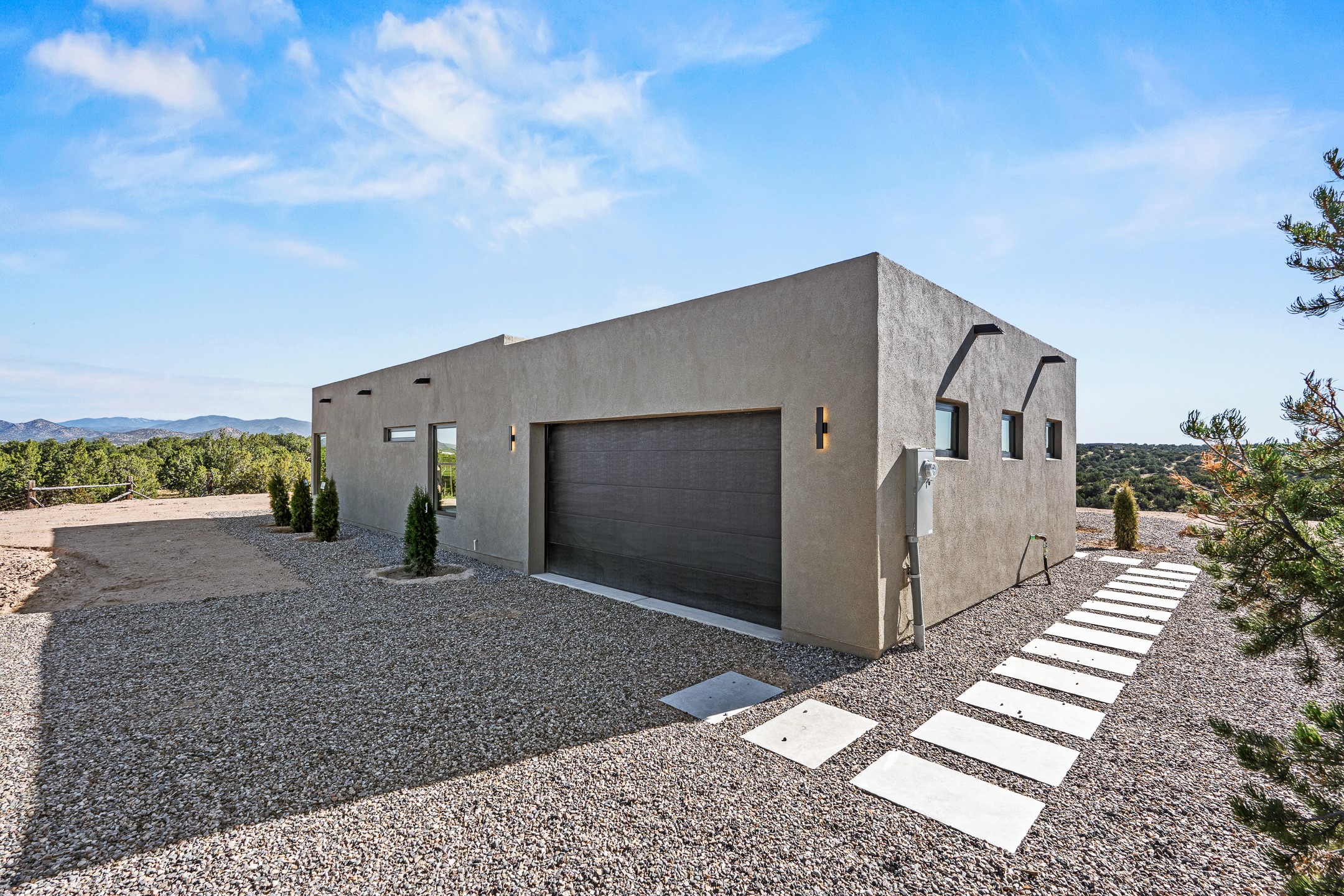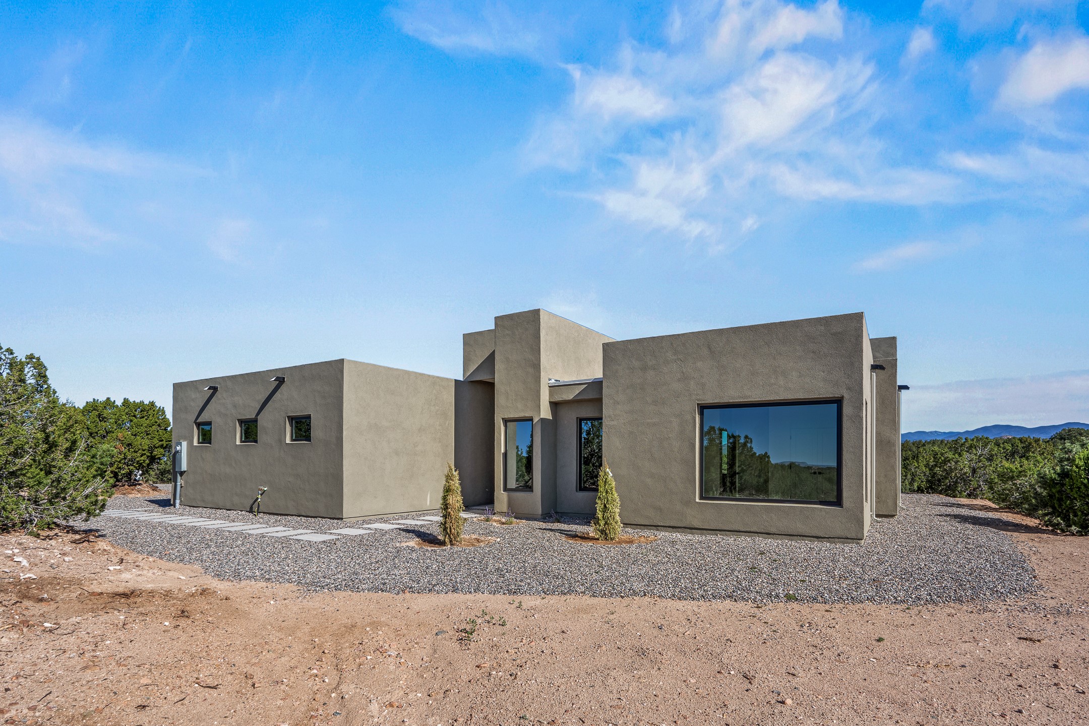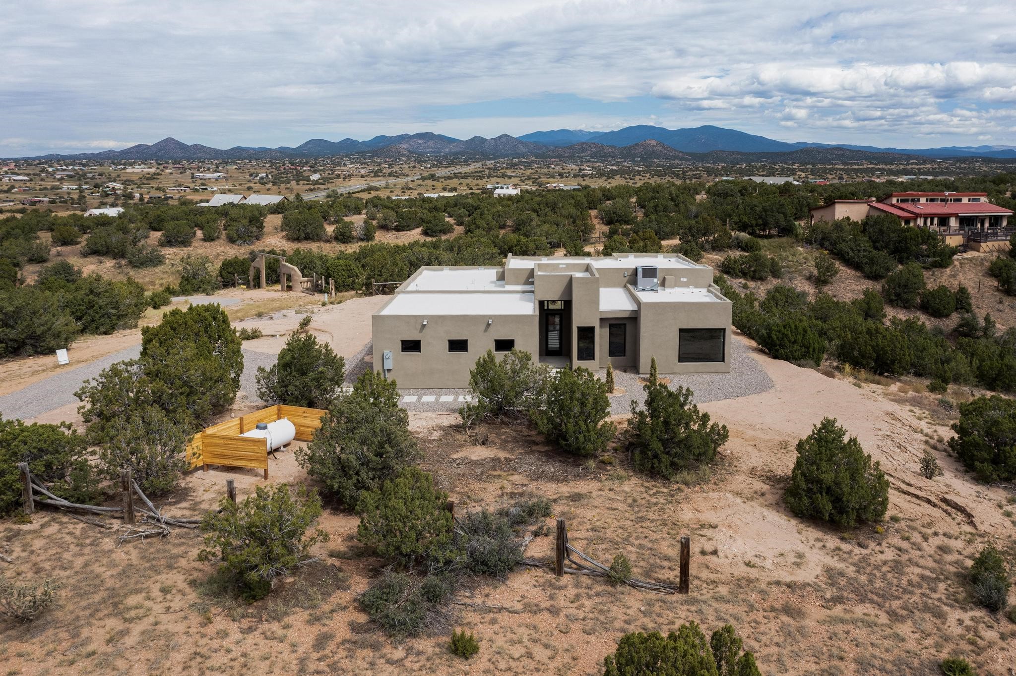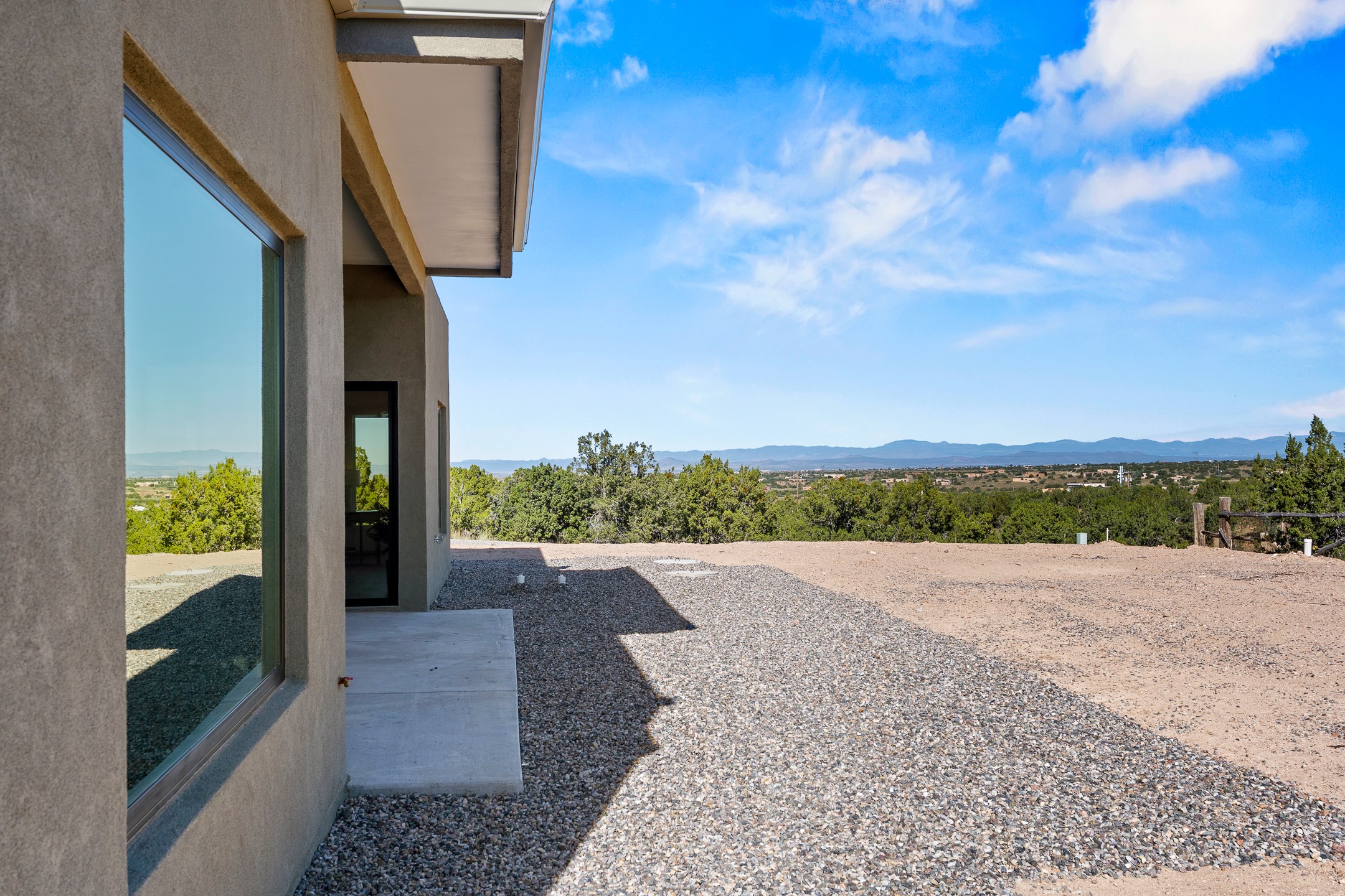 Just completed and ready for occupancy! Mountain views from every window in this new custom built contemporary pueblo style home with open floor plan situated on a huge 10.0 +/- ac. private lot in Lamy. Convenient access to US-285, the Agora shopping center, bank and restaurants. Perfect for indoor and outdoor entertaining. Open kitchen/family/dining room has floor to ceiling windows and double sliding glass doors to take in the fabulous views and access to the portal. The contemporary kitchen has a huge island bar and large walk in pantry. Every room has large picture windows with fabulous mountain views. Owner's bath has double sinks, soaking tub and large walk in shower room with double shower heads and rain showers and a large walk in closet. Home features contemporary style vigas in living areas. Three bedrooms with good separation and 2 baths. A guest house and equestrian structures are allowed, as well as 10 horses or cattle. (1 large animal per acre.) No HOA, recreational vehicles are allowed if parked inconspicuously. Connected to the Eldorado community water system. Located only 20 minutes from Downtown Santa Fe this home offers gorgeous views, rural living and easy access to everything Santa Fe has to offer. This home has it all; new home, fabulous views, great outdoor spaces, contemporary open floor plan, large private lot. Buyer to verify all information and Covenants. Seller gives $4000 credit to the buyer at closing for Range, dishwasher and microwave. Open House Sunday, October 5. 1:00 - 4:00 PM.