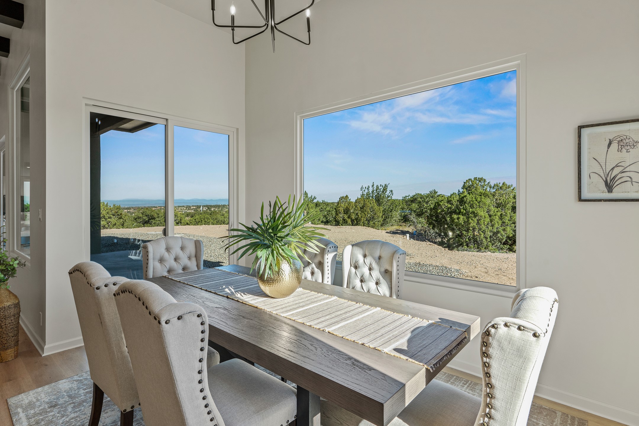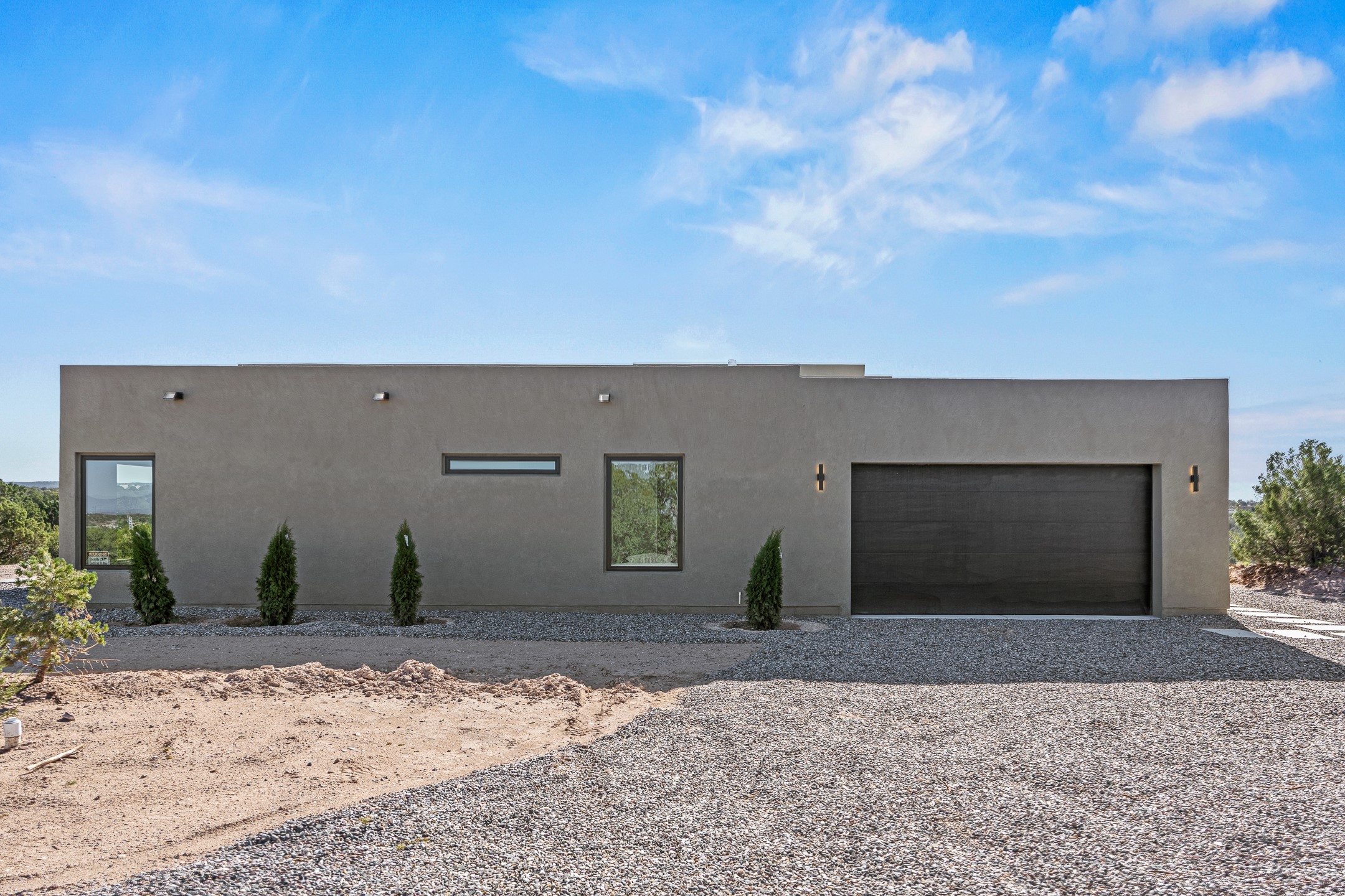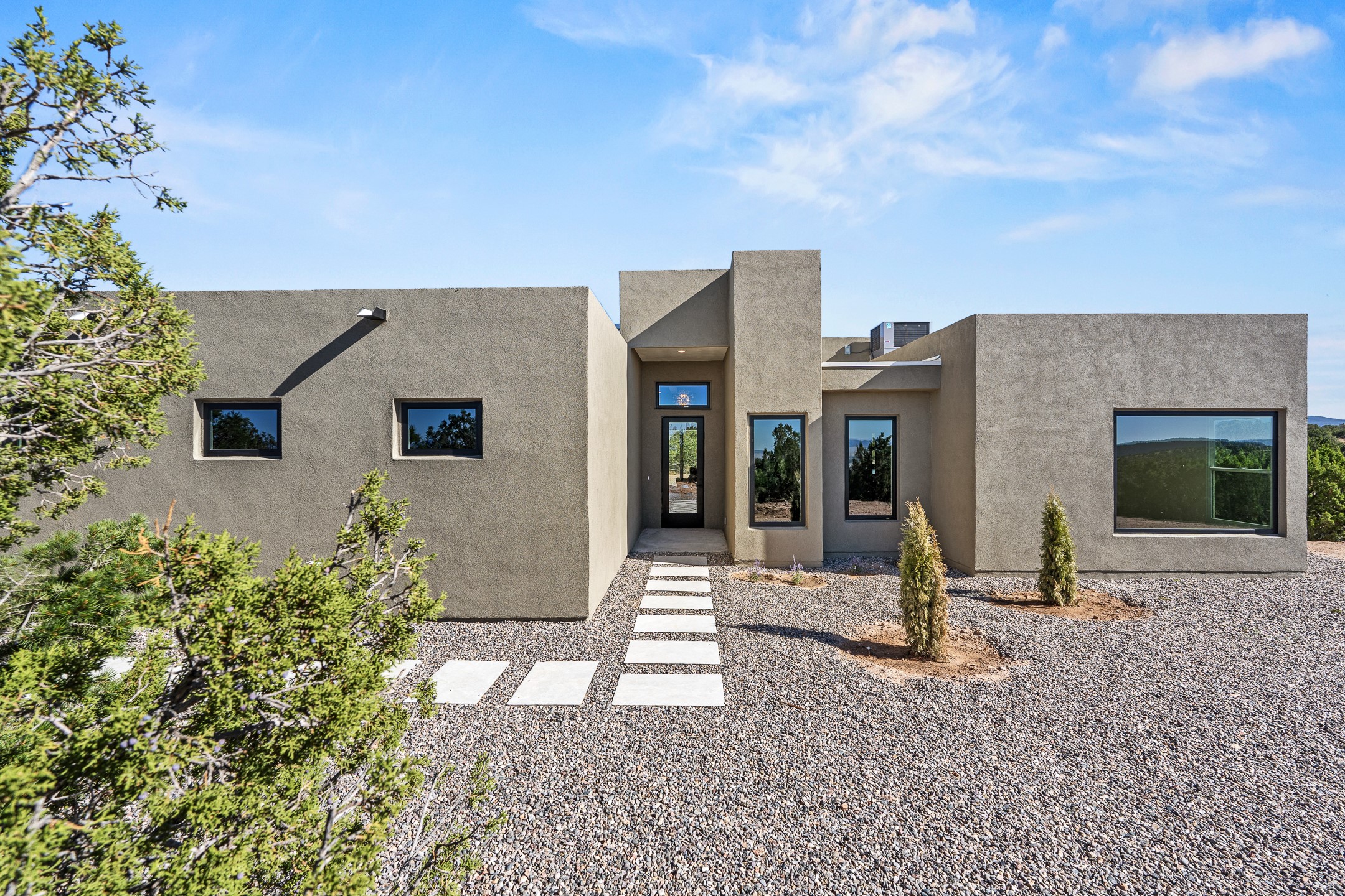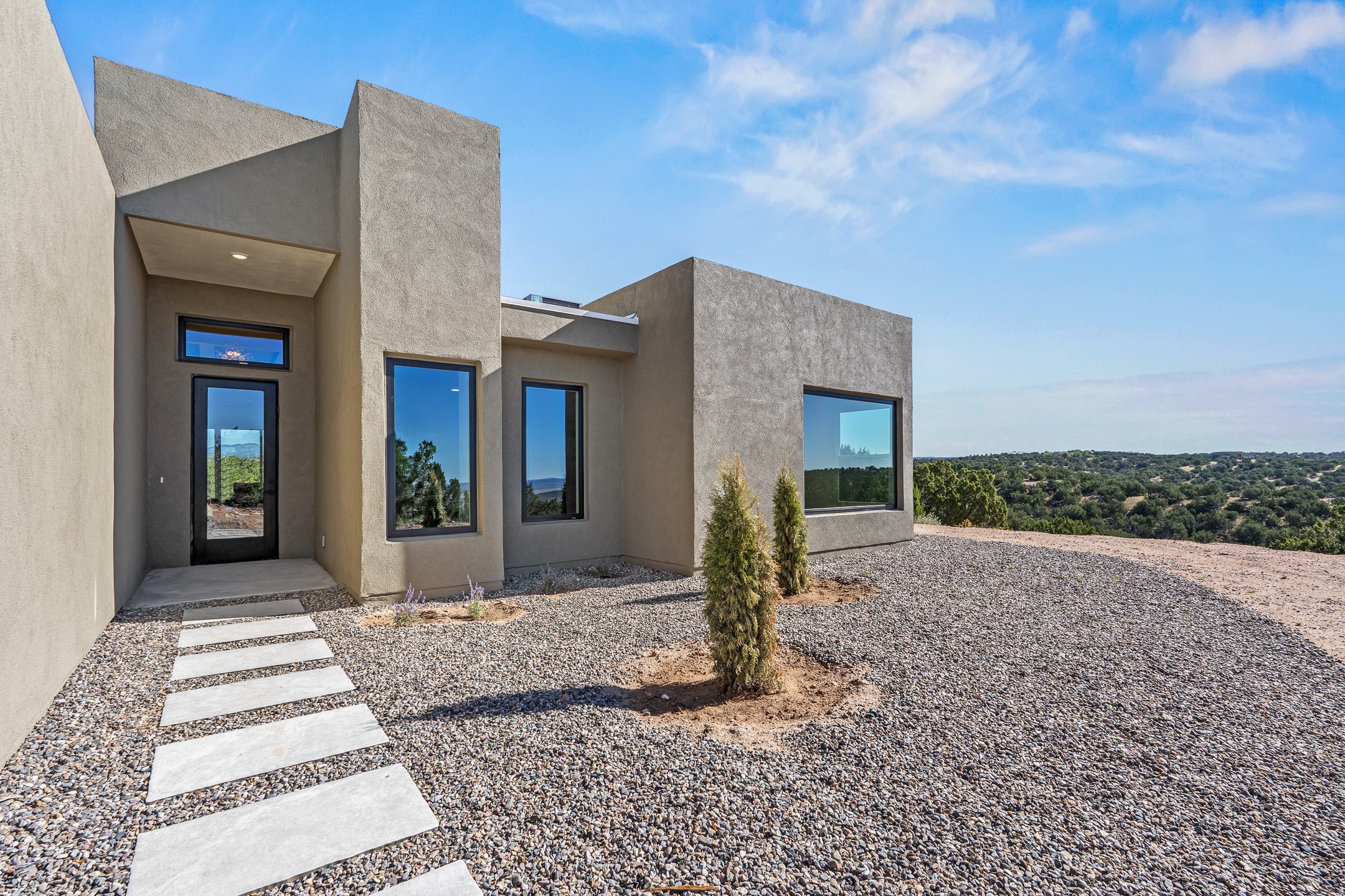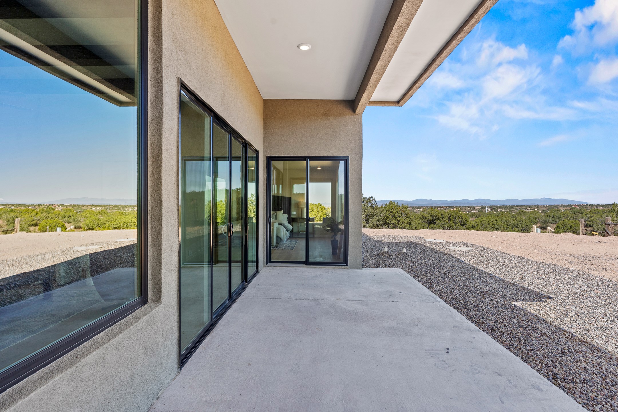 Just completed and ready for occupancy! Mountain views from every window in this new custom built contemporary pueblo style home with open floor plan situated on a huge 10.0 +/- ac. private lot in Lamy. Convenient access to US-285, the Agora shopping center, bank and restaurants. Perfect for indoor and outdoor entertaining. Open kitchen/family/dining room has floor to ceiling windows and double sliding glass doors to take in the fabulous views and access to the portal. The contemporary kitchen has a huge island bar and large walk in pantry. Every room has large picture windows with fabulous mountain views. Owner's bath has double sinks, soaking tub and large walk in shower room with double shower heads and rain showers and a large walk in closet. Home features contemporary style vigas in living areas. Three bedrooms with good separation and 2 baths. A guest house and equestrian structures are allowed, as well as 10 horses or cattle. (1 large animal per acre.) No HOA, recreational vehicles are allowed if parked inconspicuously. Connected to the Eldorado community water system. Located only 20 minutes from Downtown Santa Fe this home offers gorgeous views, rural living and easy access to everything Santa Fe has to offer. This home has it all; new home, fabulous views, great outdoor spaces, contemporary open floor plan, large private lot. Buyer to verify all information and Covenants. Seller gives $4000 credit to the buyer at closing for Range, dishwasher and microwave. Open House Sunday, October 5. 1:00 - 4:00 PM.