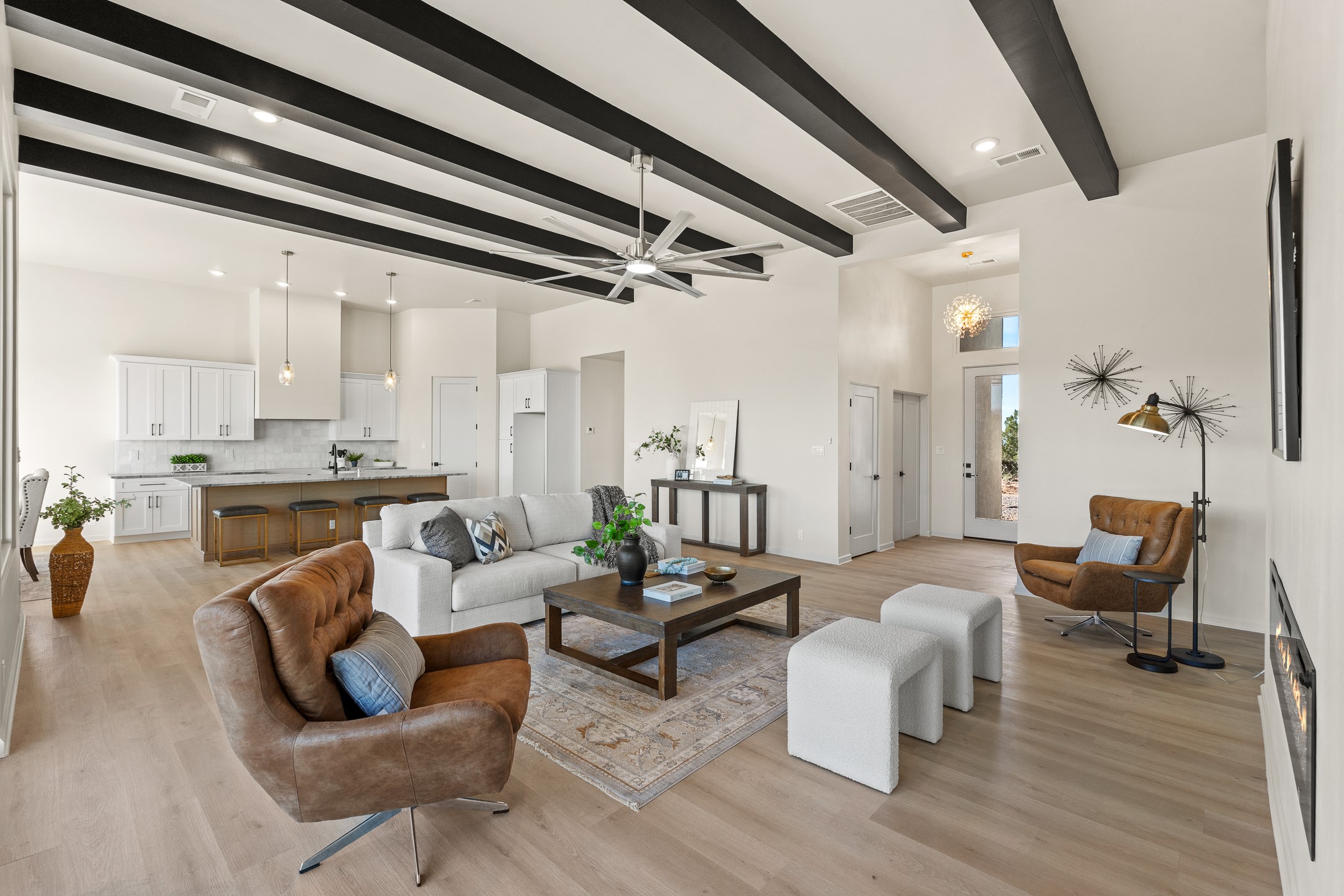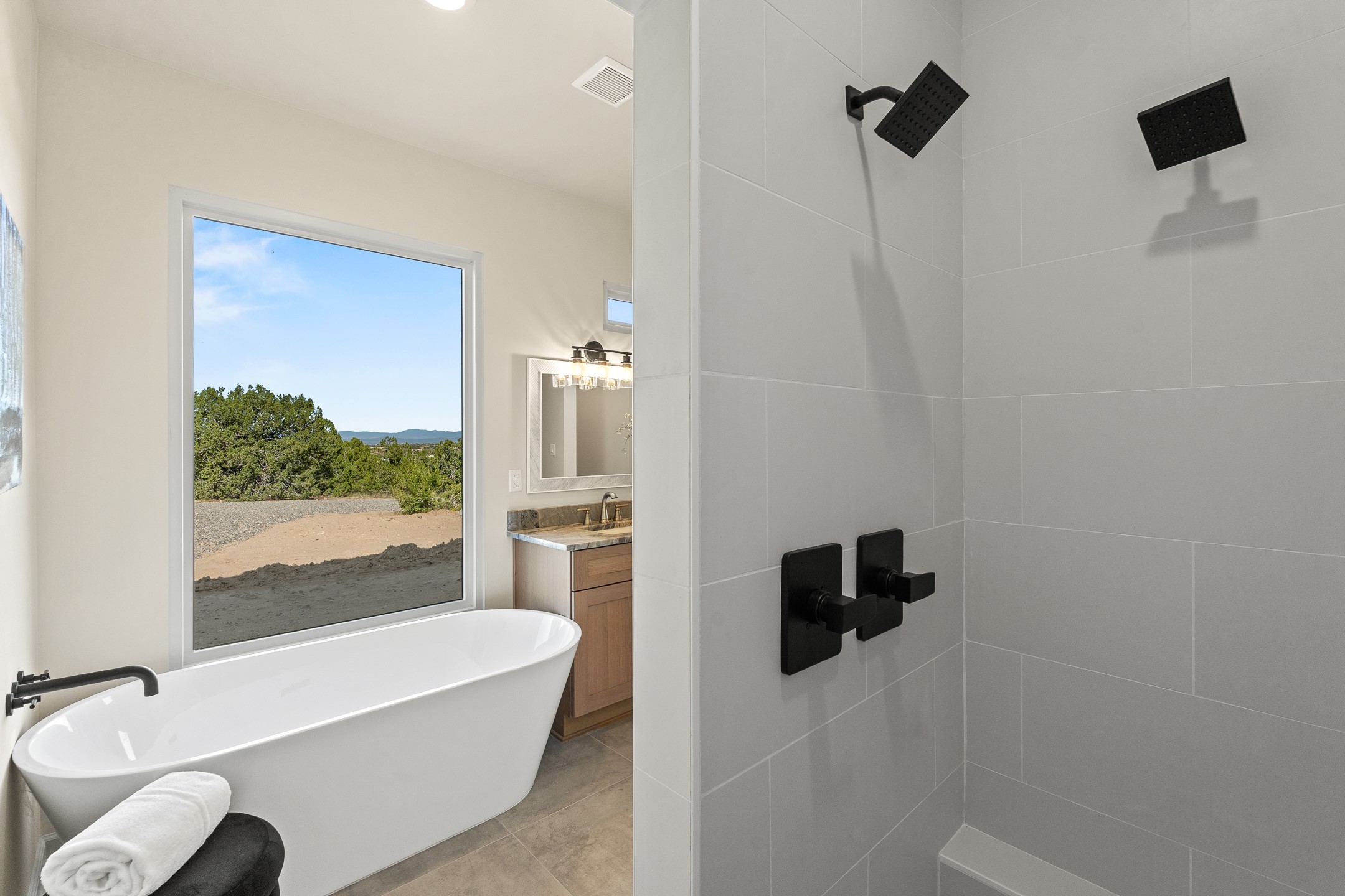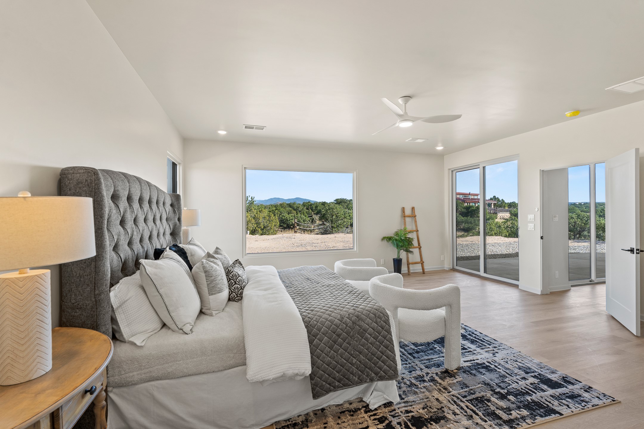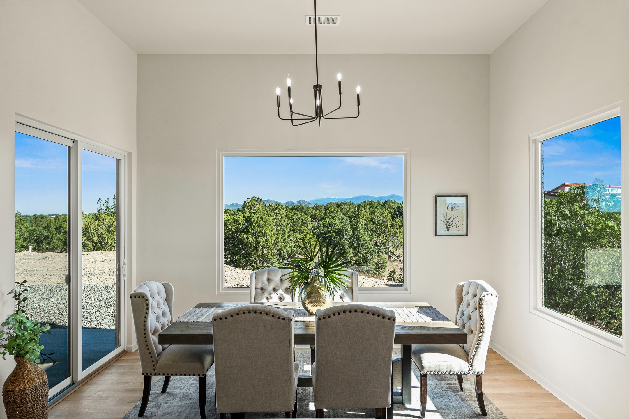 Just completed and ready for occupancy! Mountain views from every window in this new custom built contemporary pueblo style home with open floor plan situated on a huge 10.0 +/- ac. private lot in Lamy. Convenient access to US-285, the Agora shopping center, bank and restaurants. Perfect for indoor and outdoor entertaining. Open kitchen/family/dining room has floor to ceiling windows and double sliding glass doors to take in the fabulous views and access to the portal. The contemporary kitchen has a huge island bar and large walk in pantry. Every room has large picture windows with fabulous mountain views. Owner's bath has double sinks, soaking tub and large walk in shower room with double shower heads and rain showers and a large walk in closet. Home features contemporary style vigas in living areas. Three bedrooms with good separation and 2 baths. A guest house and equestrian structures are allowed, as well as 10 horses or cattle. (1 large animal per acre.) No HOA, recreational vehicles are allowed if parked inconspicuously. Connected to the Eldorado community water system. Located only 20 minutes from Downtown Santa Fe this home offers gorgeous views, rural living and easy access to everything Santa Fe has to offer. This home has it all; new home, fabulous views, great outdoor spaces, contemporary open floor plan, large private lot. Buyer to verify all information and Covenants. Seller gives $4000 credit to the buyer at closing for Range, dishwasher and microwave. Open House Sunday, October 5. 1:00 - 4:00 PM.