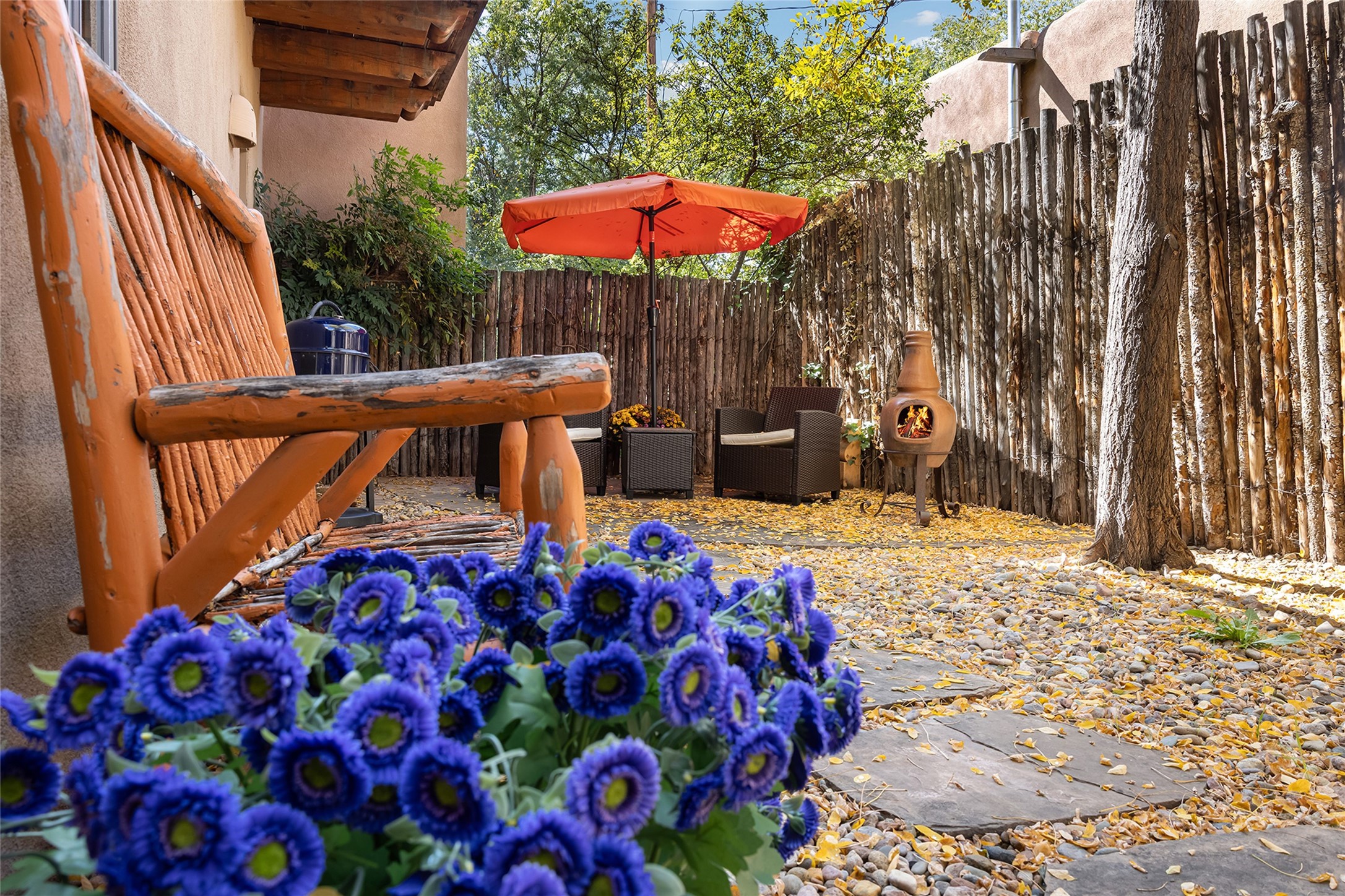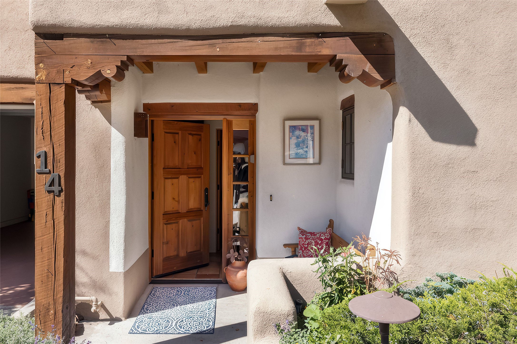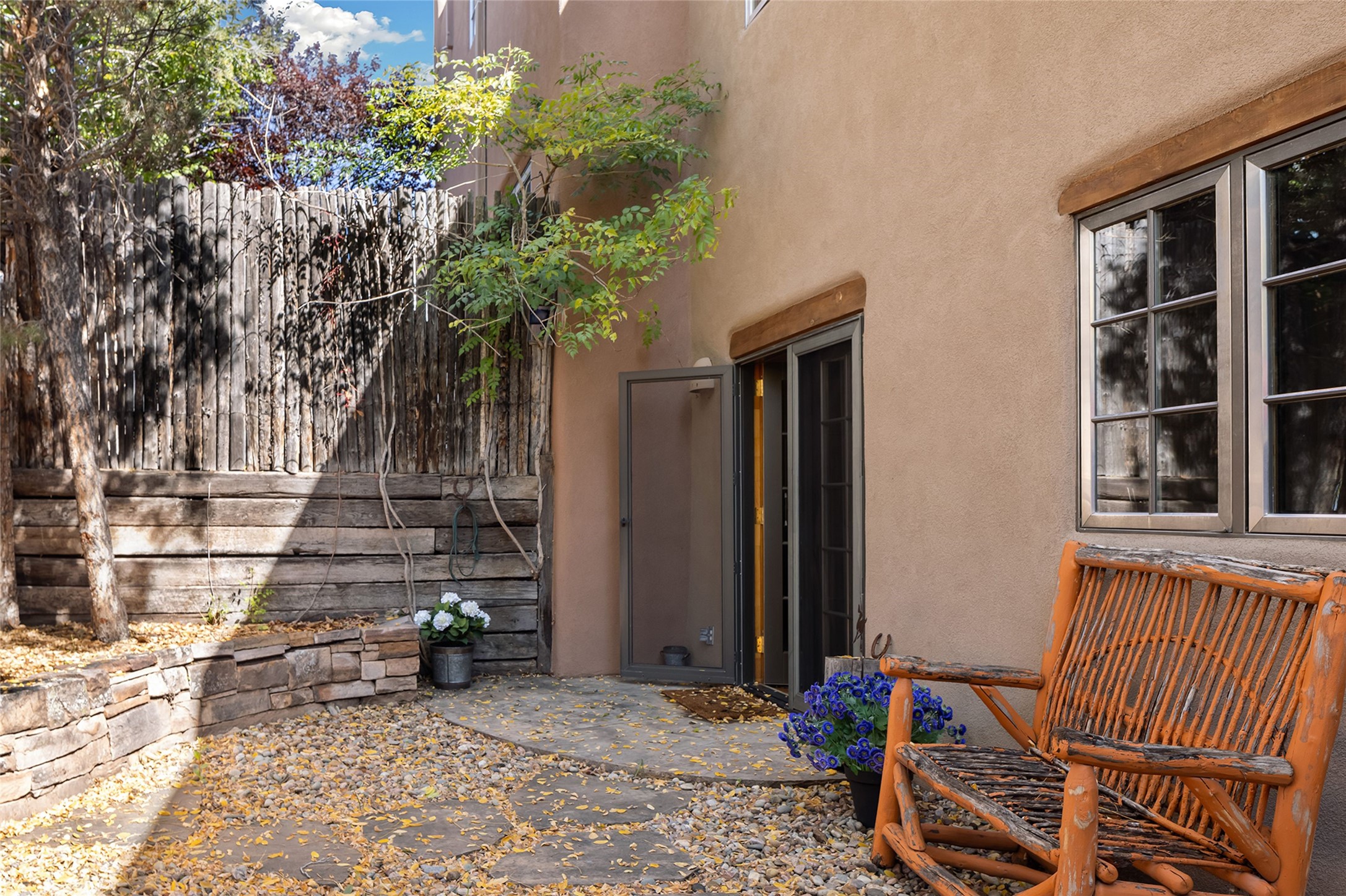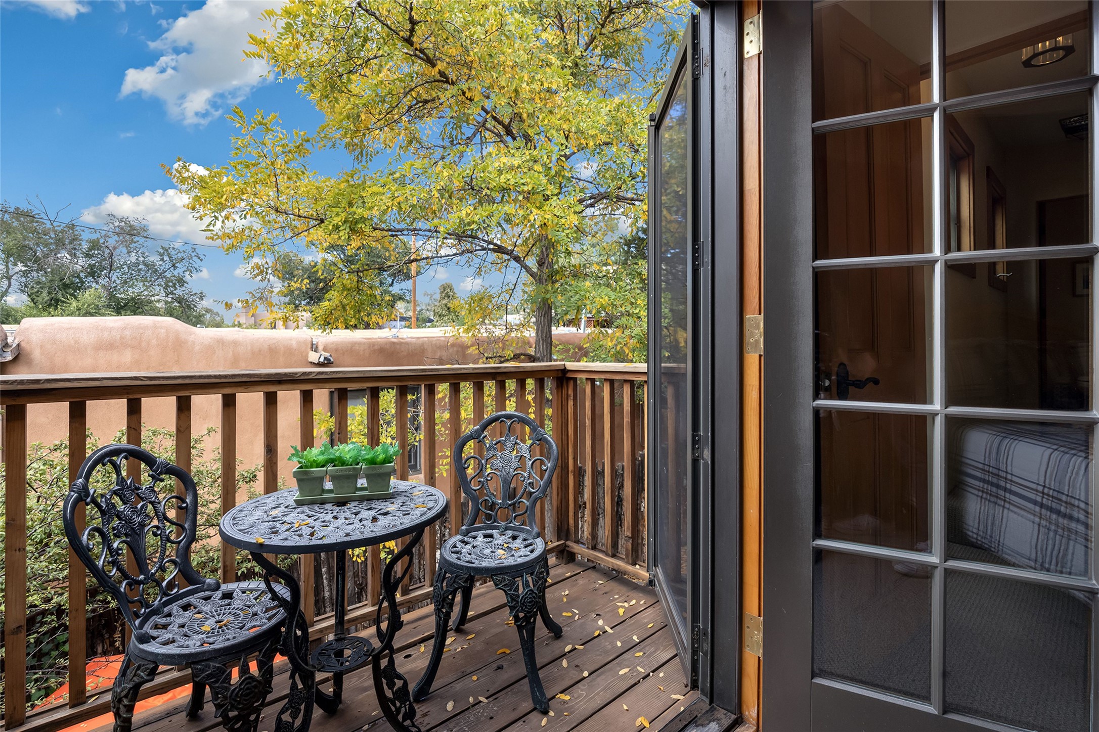 Imagine being two blocks from the Santa Fe Plaza and Fort Marcy Park in your own home away from home--or a full-time residence that embraces the best of in-town living. This two story delightful two-bedroom, one-and-a-half-bath condominium in the sought-after Muralla Compound offers both convenience and quintessential Santa Fe style, complete with a one-car garage.Inside, Saltillo tile floors, high wood beamed ceilings with vigas, and a classic wood-burning kiva fireplace set the tone for warmth and character. French doors open to a private rear patio enclosed by a coyote fence and shaded by a canopy of trees--an ideal space for al fresco dining, raised garden beds, and outdoor grilling.The kitchen exudes charm with playful terracotta and cream Talavera tile countertops and backsplash, complemented by light wood cabinetry. A stainless steel counter-depth refrigerator (delivery 10/17) joins the gas cooktop, built-in microwave, and dishwasher for modern functionality.Upstairs, two generously sized bedrooms share a full bath with double vanity in complementary blue and cream Talavera tile. The hallway includes a closet with a stackable washer and dryer for convenience. French doors from the guest bedroom open to a private balcony overlooking the garden--perfect for morning coffee or evening star-gazing.In the past few years, the condo association replaced the TPO roof and performed stucco maintenance. The condo association covers exterior maintenance and common areas. Zoned Commercial, the property allows 7-day-plus short-term rentals (with proper permitting), offering excellent flexibility for investors or second-home owners. A furniture package can be negotiated separately.Experience downtown Santa Fe living at its most charming--quiet, walkable, and unmistakably authentic.