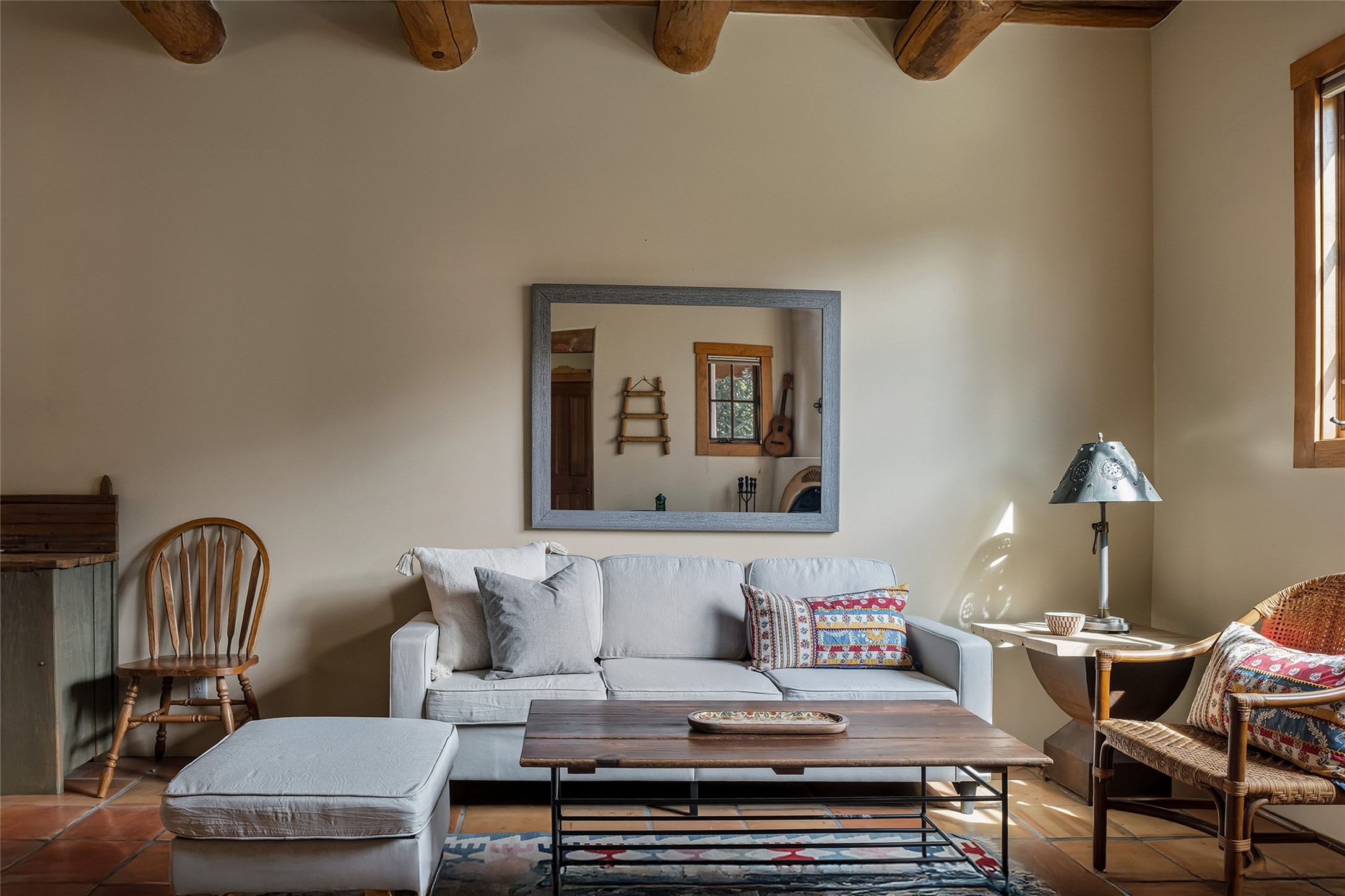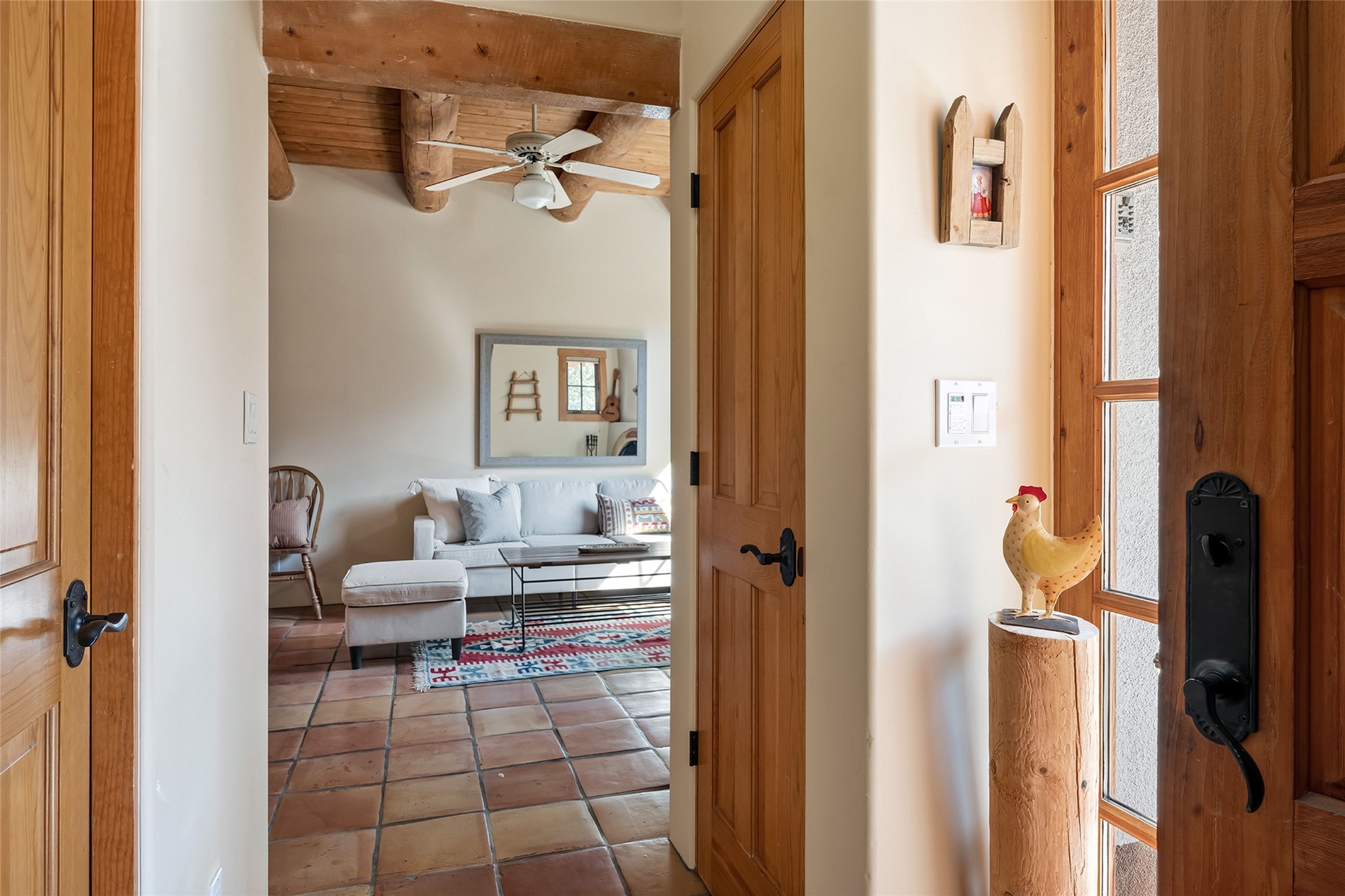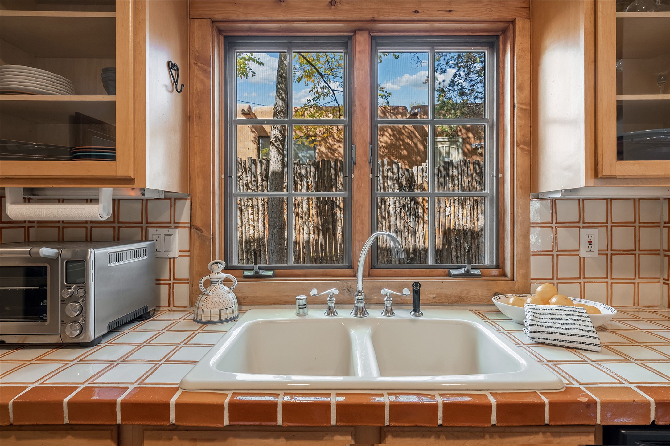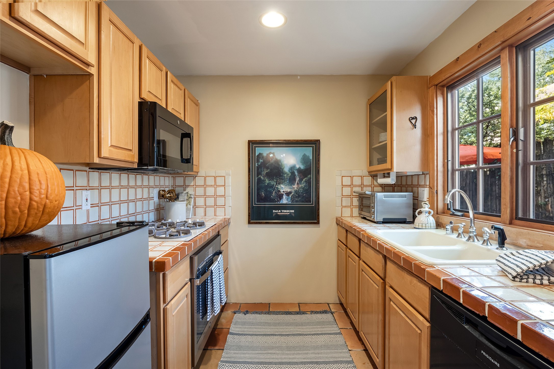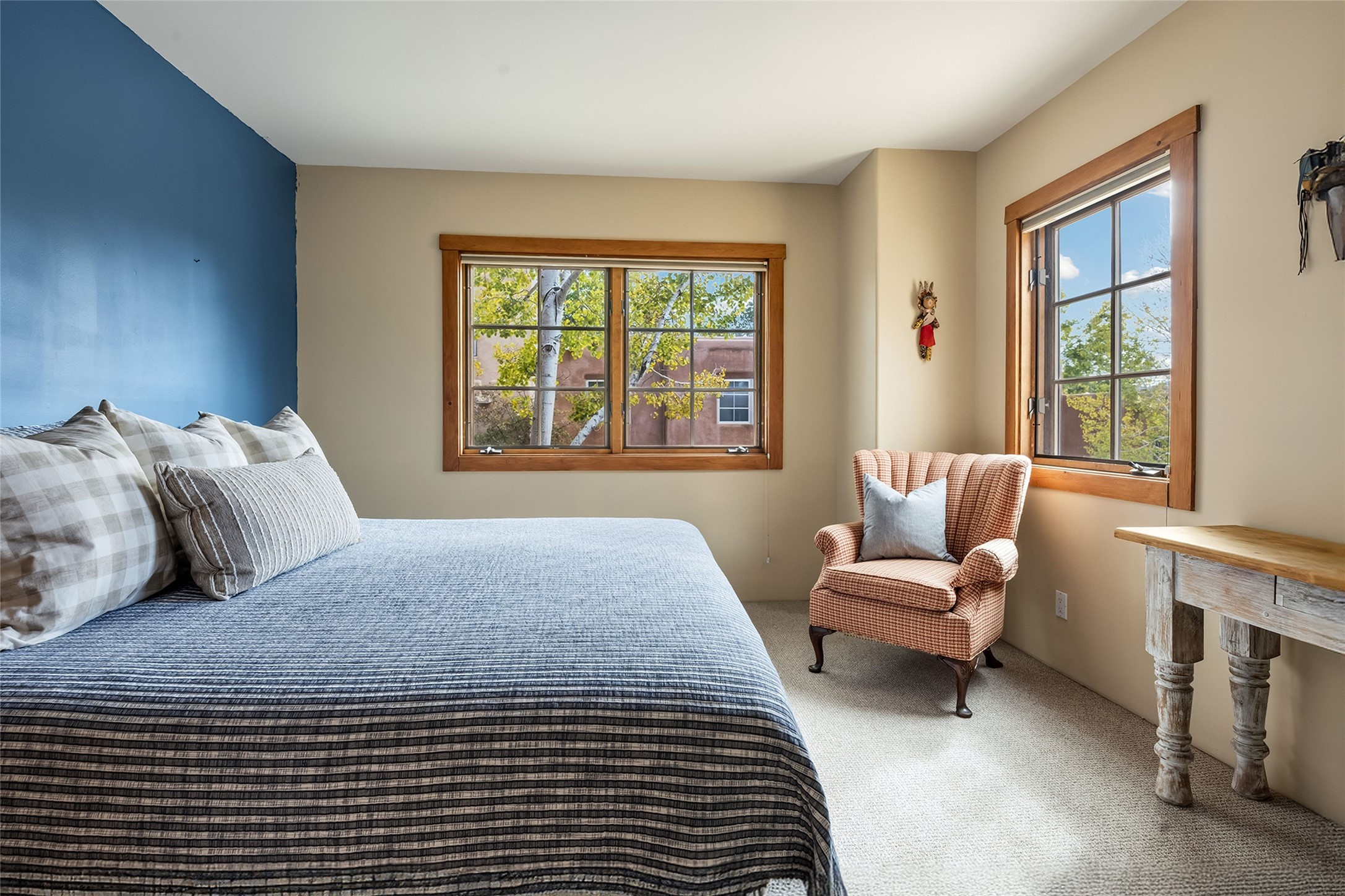 Imagine being two blocks from the Santa Fe Plaza and Fort Marcy Park in your own home away from home--or a full-time residence that embraces the best of in-town living. This two story delightful two-bedroom, one-and-a-half-bath condominium in the sought-after Muralla Compound offers both convenience and quintessential Santa Fe style, complete with a one-car garage.Inside, Saltillo tile floors, high wood beamed ceilings with vigas, and a classic wood-burning kiva fireplace set the tone for warmth and character. French doors open to a private rear patio enclosed by a coyote fence and shaded by a canopy of trees--an ideal space for al fresco dining, raised garden beds, and outdoor grilling.The kitchen exudes charm with playful terracotta and cream Talavera tile countertops and backsplash, complemented by light wood cabinetry. A stainless steel counter-depth refrigerator (delivery 10/17) joins the gas cooktop, built-in microwave, and dishwasher for modern functionality.Upstairs, two generously sized bedrooms share a full bath with double vanity in complementary blue and cream Talavera tile. The hallway includes a closet with a stackable washer and dryer for convenience. French doors from the guest bedroom open to a private balcony overlooking the garden--perfect for morning coffee or evening star-gazing.In the past few years, the condo association replaced the TPO roof and performed stucco maintenance. The condo association covers exterior maintenance and common areas. Zoned Commercial, the property allows 7-day-plus short-term rentals (with proper permitting), offering excellent flexibility for investors or second-home owners. A furniture package can be negotiated separately.Experience downtown Santa Fe living at its most charming--quiet, walkable, and unmistakably authentic.