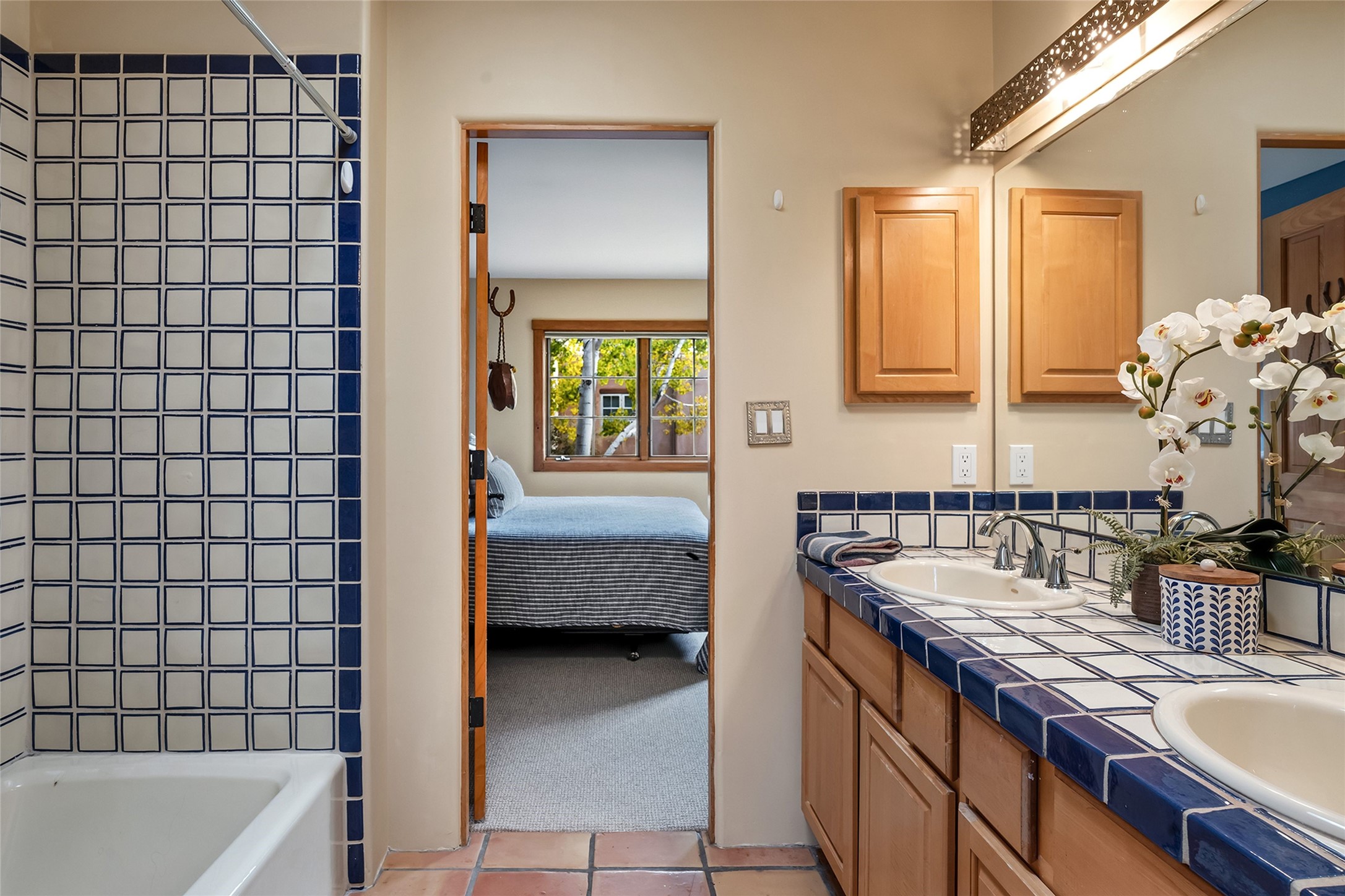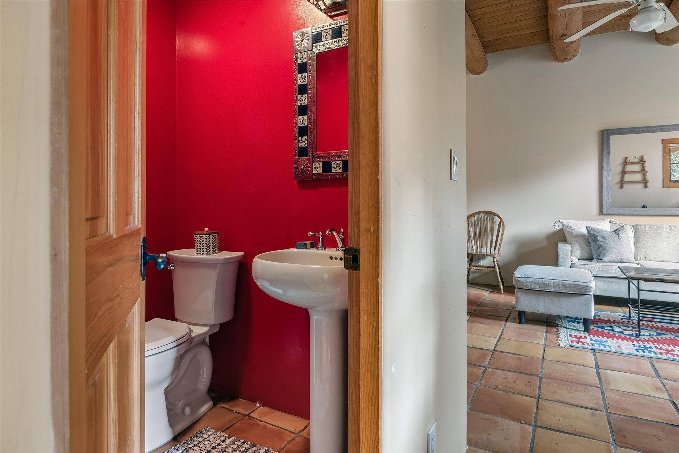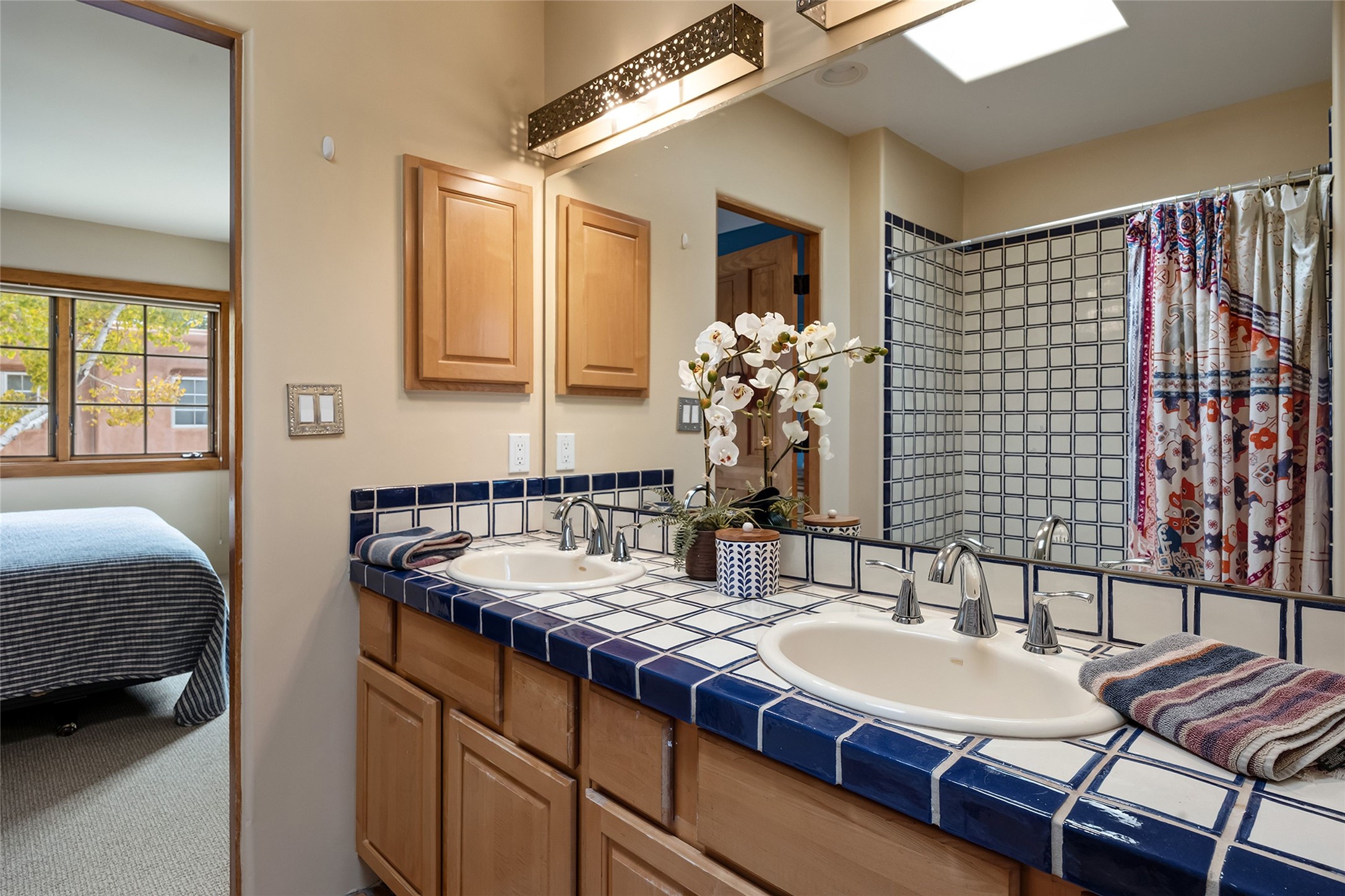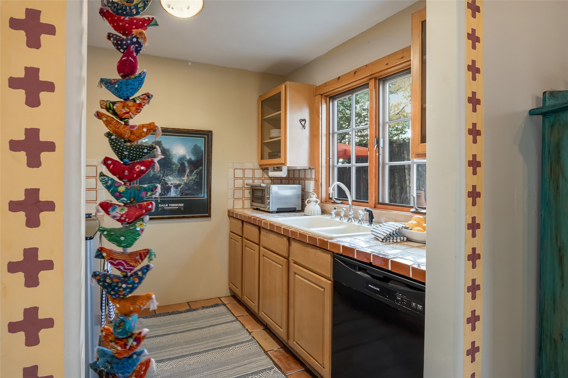 Imagine being two blocks from the Santa Fe Plaza and Fort Marcy Park in your own home away from home--or a full-time residence that embraces the best of in-town living. This two story delightful two-bedroom, one-and-a-half-bath condominium in the sought-after Muralla Compound offers both convenience and quintessential Santa Fe style, complete with a one-car garage.Inside, Saltillo tile floors, high wood beamed ceilings with vigas, and a classic wood-burning kiva fireplace set the tone for warmth and character. French doors open to a private rear patio enclosed by a coyote fence and shaded by a canopy of trees--an ideal space for al fresco dining, raised garden beds, and outdoor grilling.The kitchen exudes charm with playful terracotta and cream Talavera tile countertops and backsplash, complemented by light wood cabinetry. A stainless steel counter-depth refrigerator (delivery 10/17) joins the gas cooktop, built-in microwave, and dishwasher for modern functionality.Upstairs, two generously sized bedrooms share a full bath with double vanity in complementary blue and cream Talavera tile. The hallway includes a closet with a stackable washer and dryer for convenience. French doors from the guest bedroom open to a private balcony overlooking the garden--perfect for morning coffee or evening star-gazing.In the past few years, the condo association replaced the TPO roof and performed stucco maintenance. The condo association covers exterior maintenance and common areas. Zoned Commercial, the property allows 7-day-plus short-term rentals (with proper permitting), offering excellent flexibility for investors or second-home owners. A furniture package can be negotiated separately.Experience downtown Santa Fe living at its most charming--quiet, walkable, and unmistakably authentic.