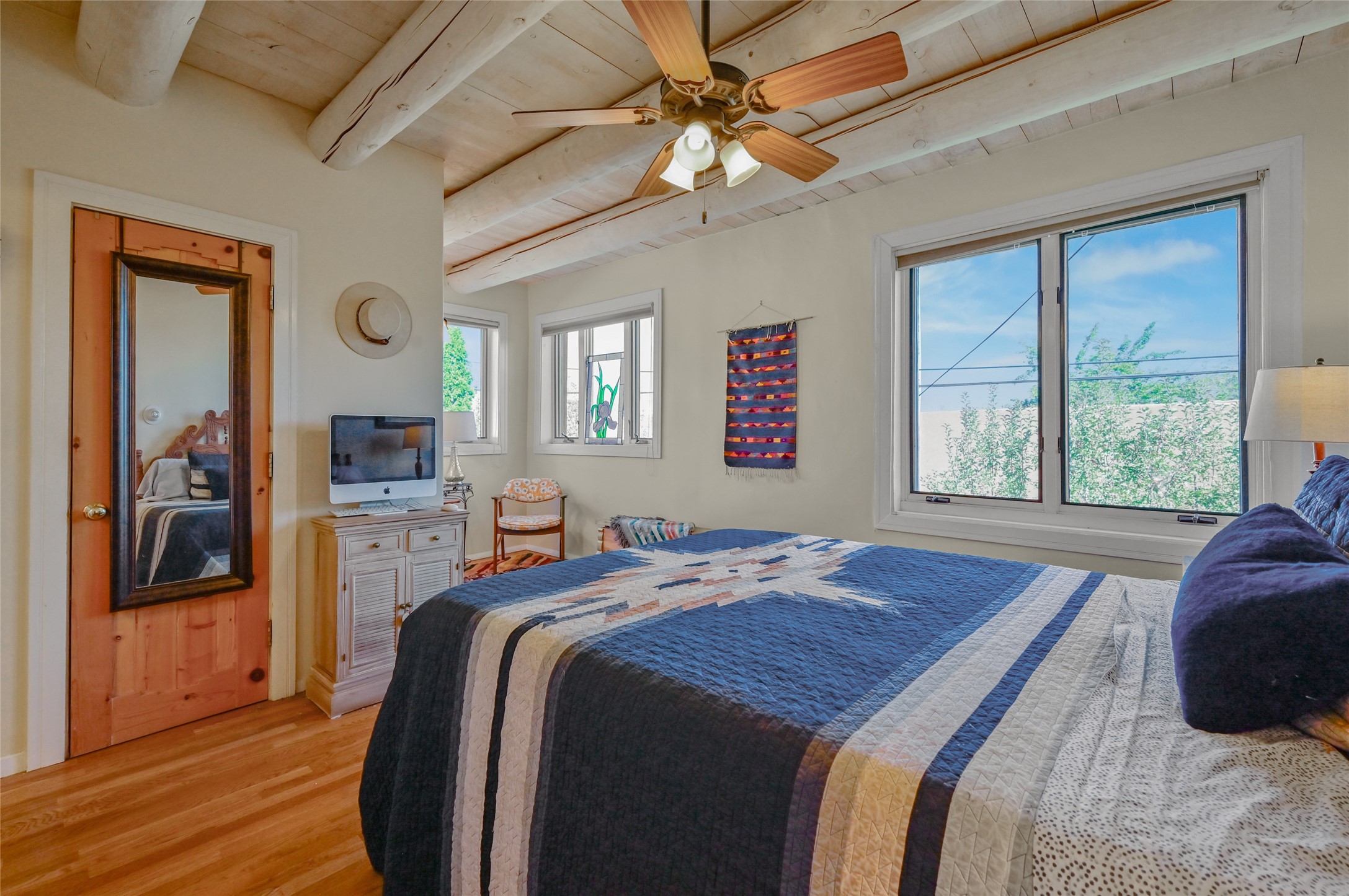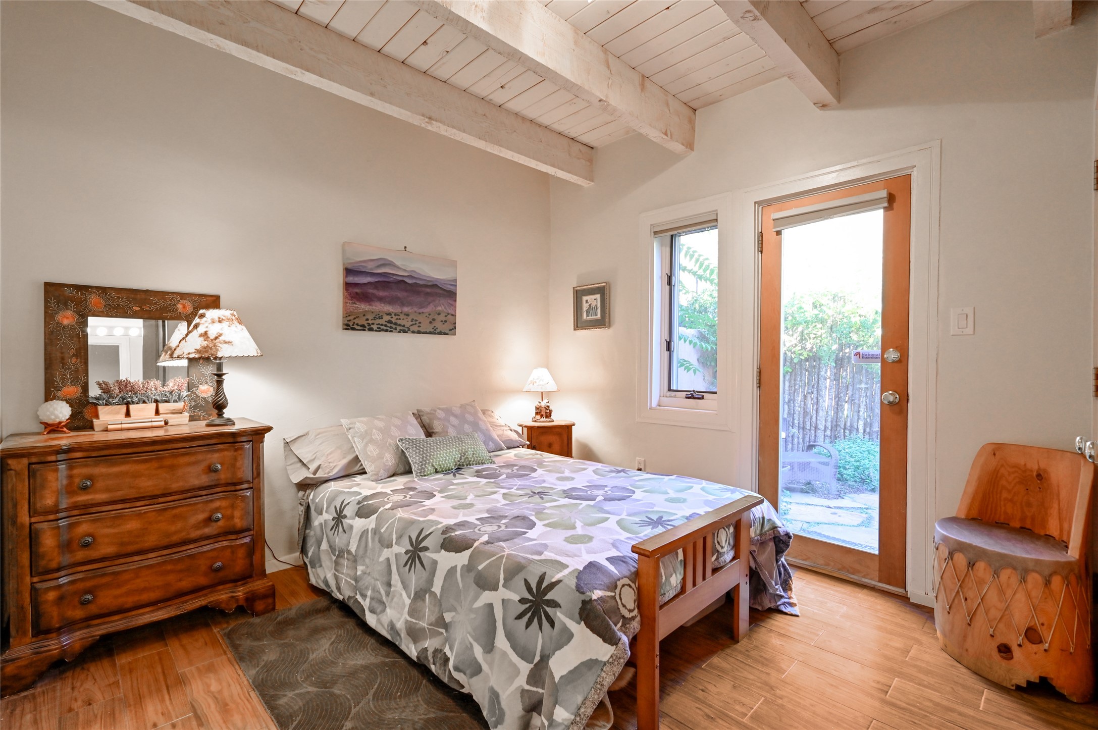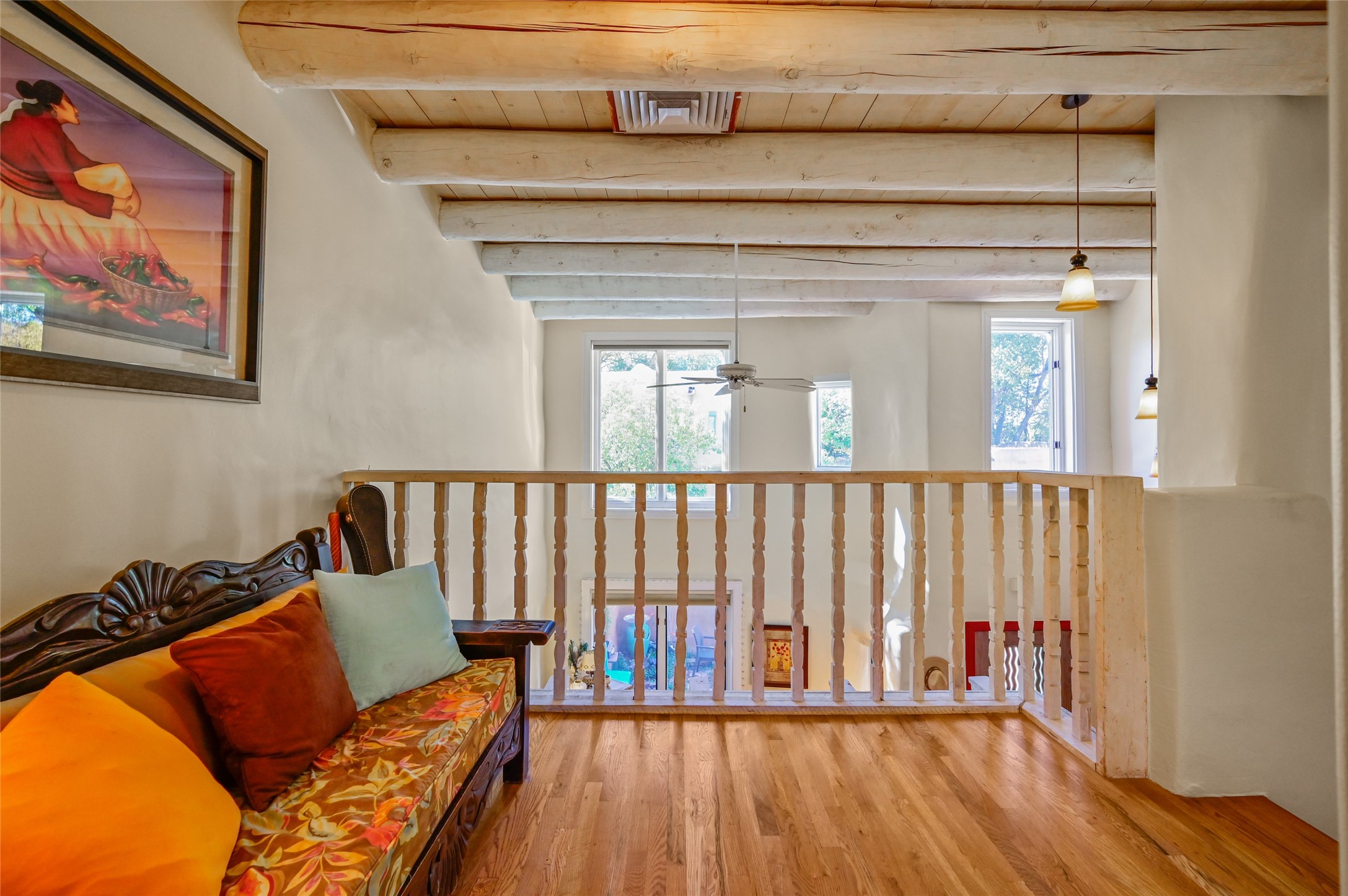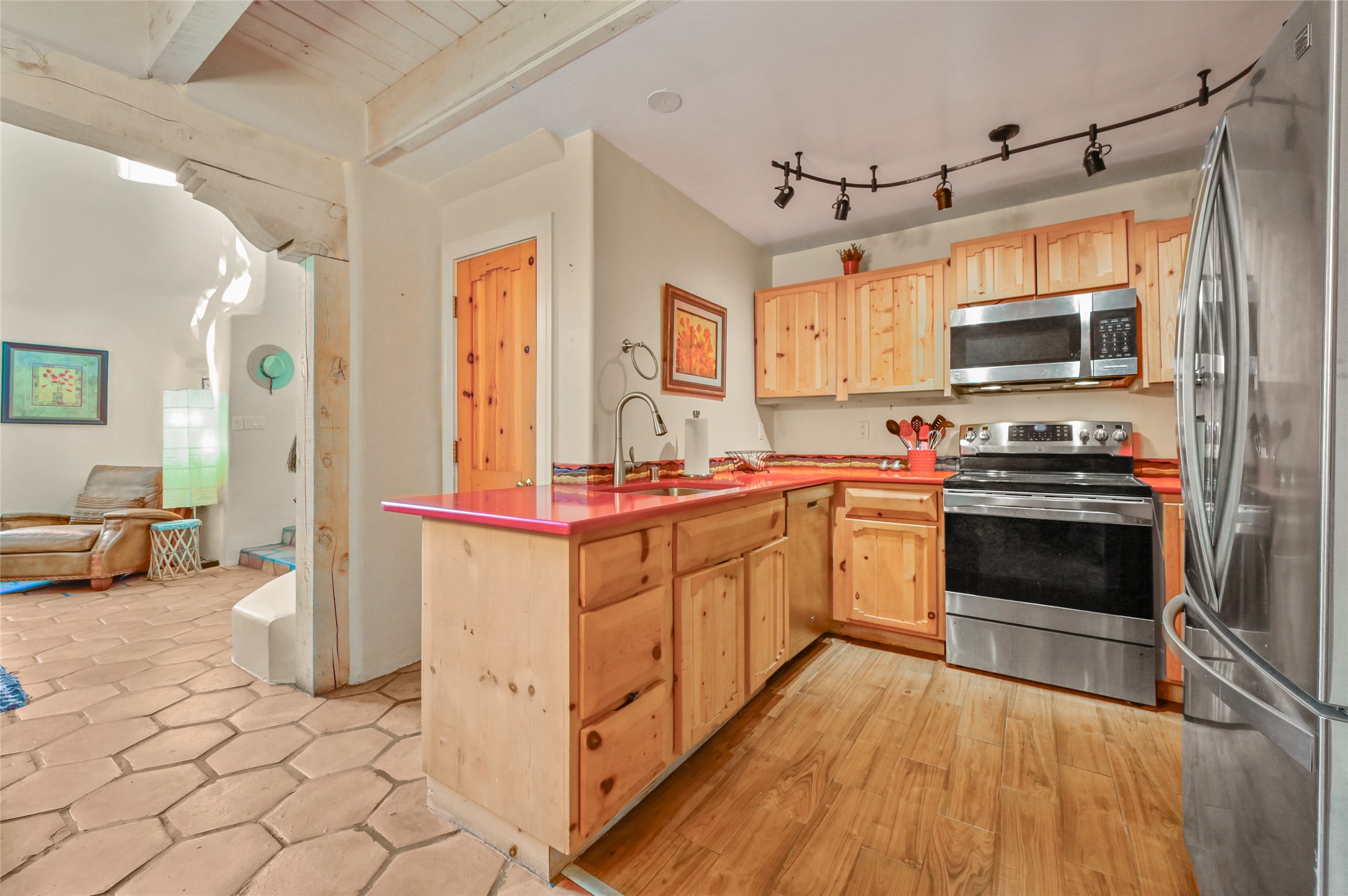 Bright and filled with light, this 2 bedroom 2 bath condo offers an excellent location for all that Santa Fe has to offer yet a very quiet neighborhood in South Capital. Brimming with many southwest features such as vigas, kiva fireplace, adobe walls with curved accents, talavera tile in the bathrooms, Saltillo tile and oak floors. Front courtyard with adobe walls for privacy. And rear patio has coyote fencing for privacy. Extra storage on the back patio. Las Brisas takes care of the exterior of the home and the roof. New TPO roof as of summer 2025. New boiler and hot water tank in 2022.
