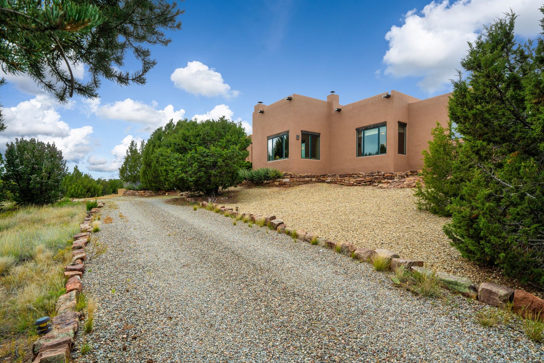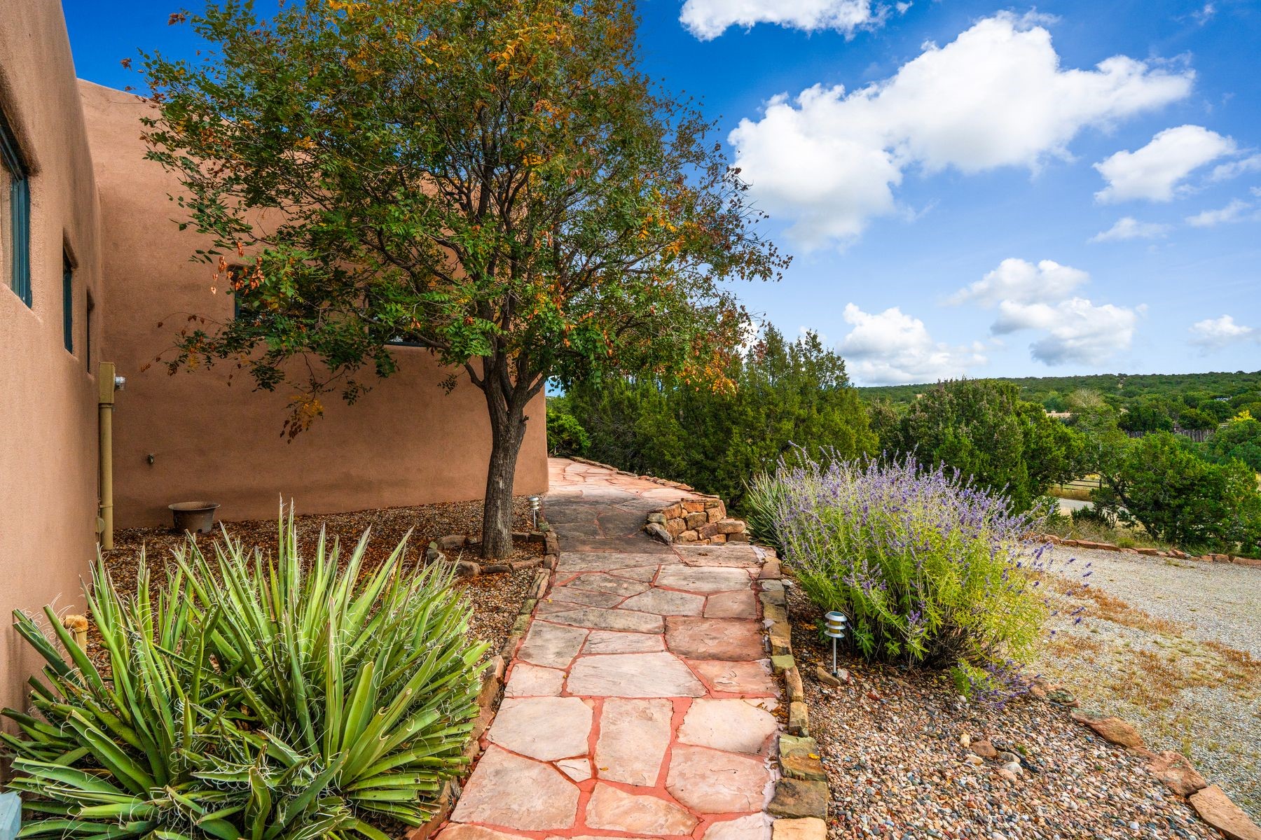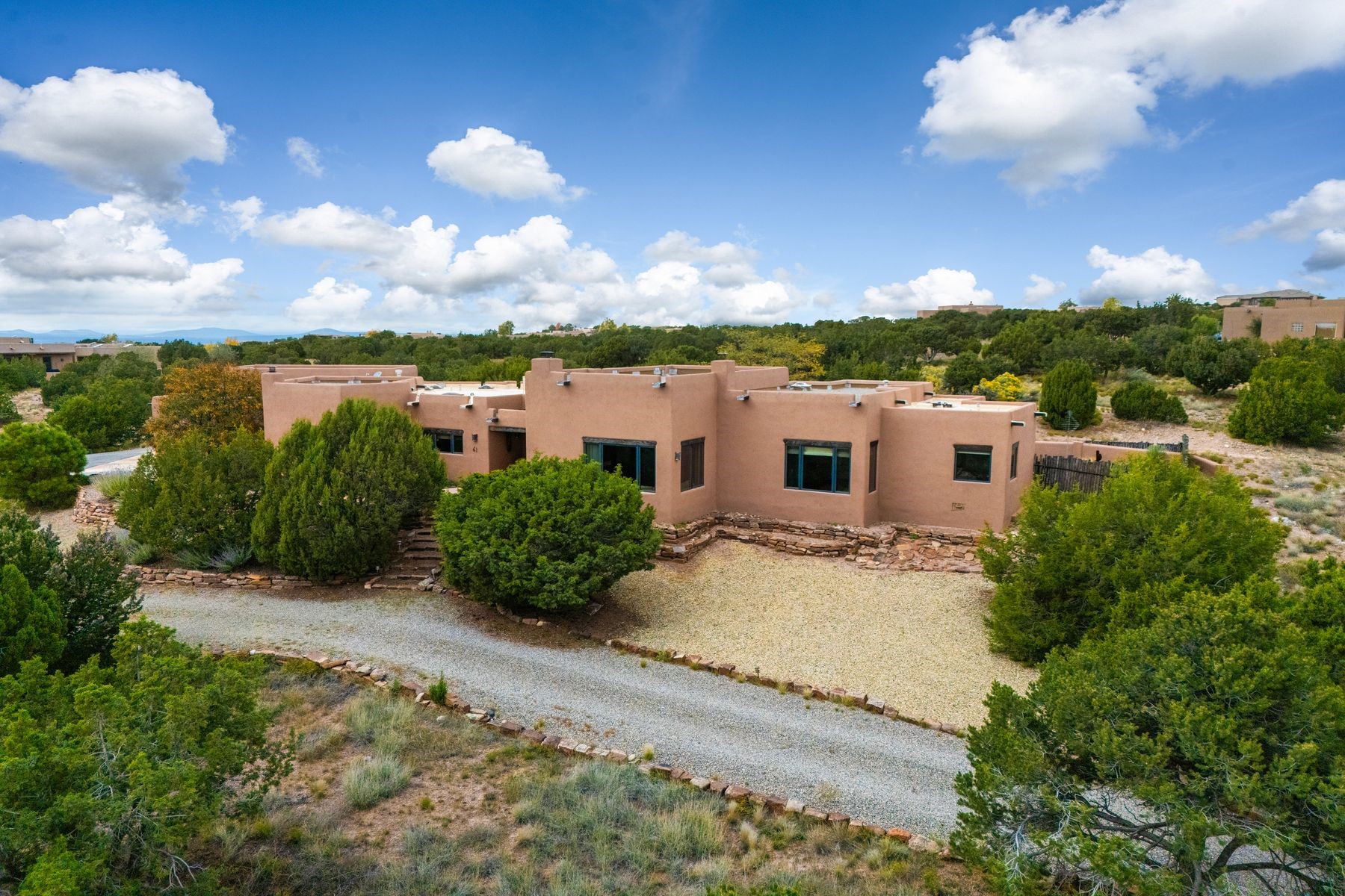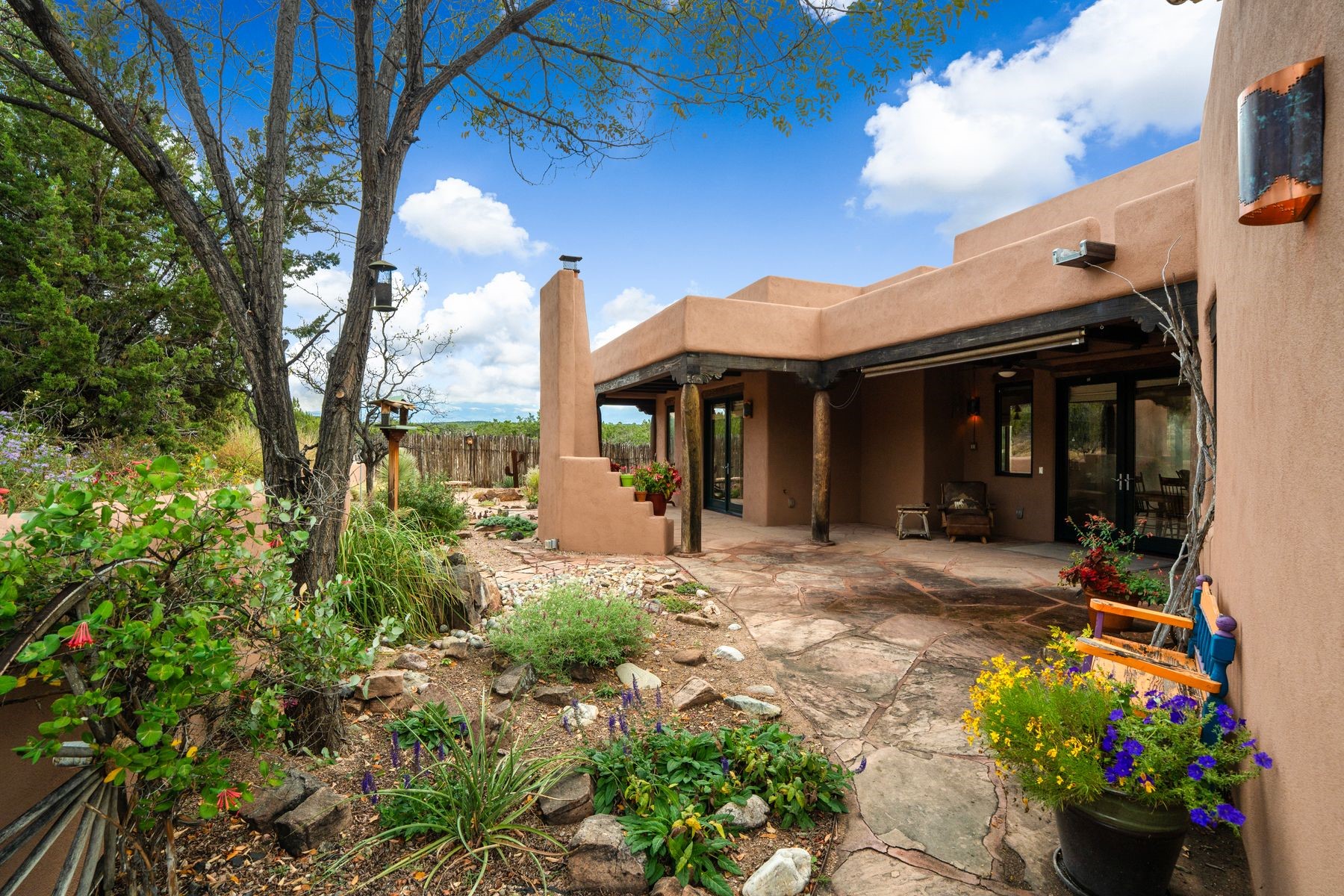 Experience classic Santa Fe style and modern livability in this 3,486 sq ft single-level (no steps!) Pueblo Revival home on 2.86 acres, built in 2005, and just 13 minutes from the Plaza. Designed for comfort and entertaining, the residence offers high ceilings and diamond plaster walls throughout, 3 spacious en-suite bedrooms and 5 bathrooms, including a luxurious primary suite with a generous flex space ideal for an office/gym, a large walk-in closet, and French doors leading to a portal. The ADA-compliant front entry to the house and primary bathroom shower provide accessibility without compromising style. The great room features soaring coved viga ceilings and opens through French doors to a covered rear portal with kiva fireplace, sunshade, and landscaped privacy wall -- a perfect space for outdoor entertaining. The kitchen offers abundant wood cabinetry, extensive granite countertops, a large island with a second sink, and a built-in desk area. The kitchen extends to a bonus space with a kiva fireplace for dining and gathering. A spacious laundry room with sink and cabinetry opens to a side yard with an established herb garden. Throughout the home, authentic Southwestern details such as nichos, banco seating, travertine tile floors, skylights, corbels, and four wood-burning kiva fireplaces (including one outdoors) create timeless character. In-floor radiant heating, and evaporative cooling enhance everyday comfort. Additional highlights include a large 3-car heated garage with an RV bay and a versatile workshop or studio space, ample parking, central vacuum, and a rock fountain surrounded by a native plant garden and flagstone walkways. Full re-stucco on house and rear privacy wall in 2023. Partial (approx. ) TPO roof replacement in 2023. With panoramic Sangre de Cristo mtn views, La Tierra's extensive trail system just a short walk away, and no HOA, this property offers the perfect blend of privacy, natural beauty, and proximity to Santa Fe's vibrant heart.