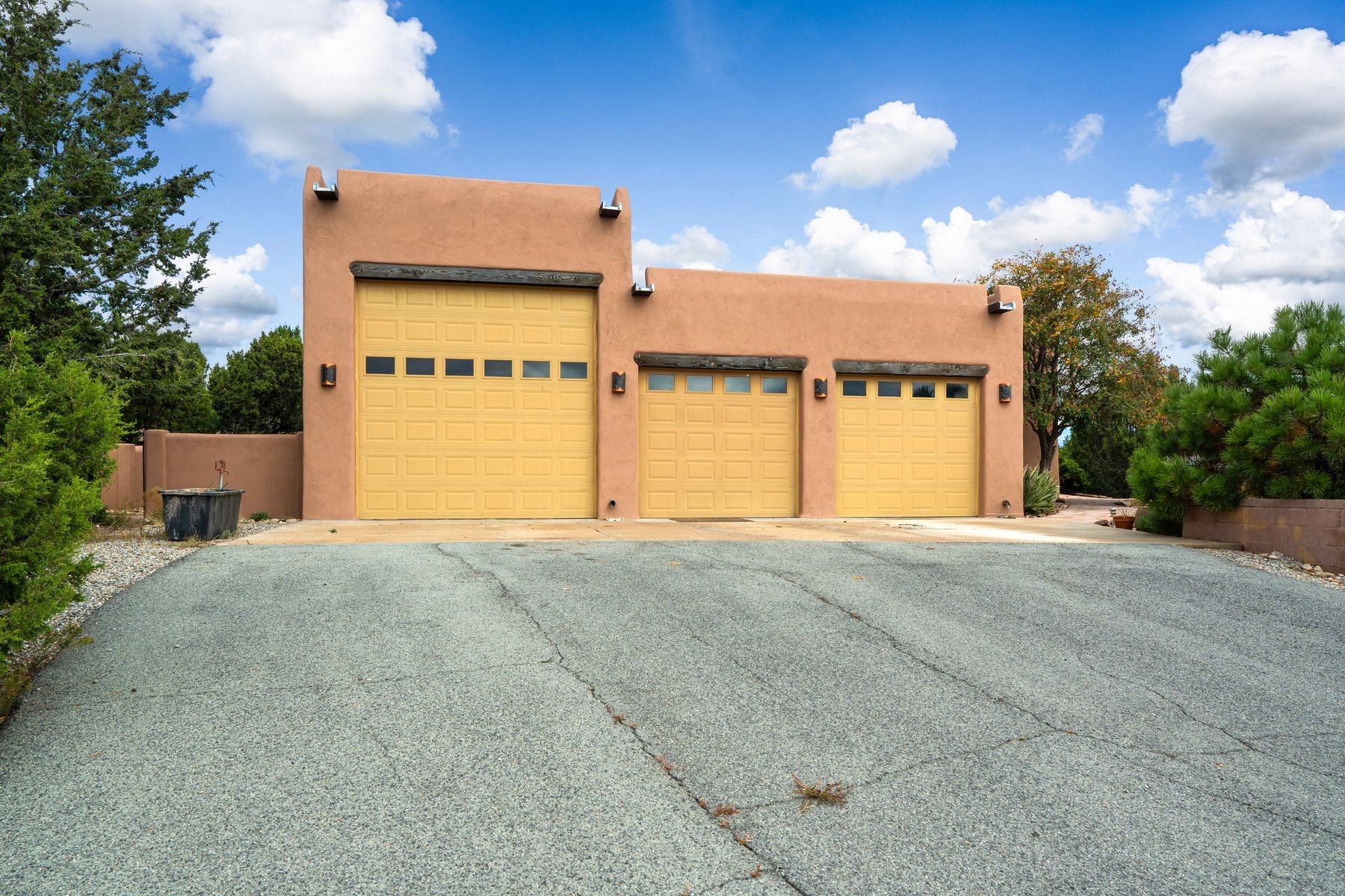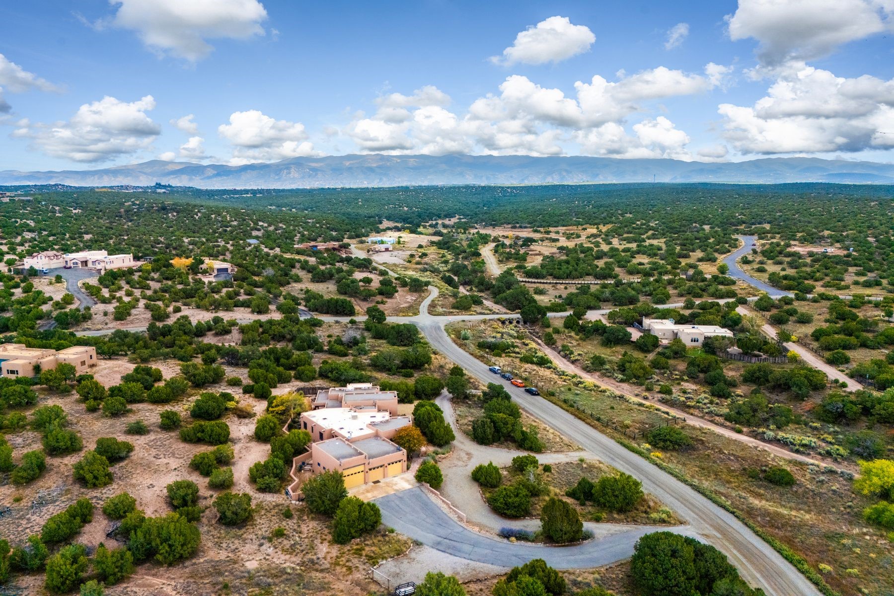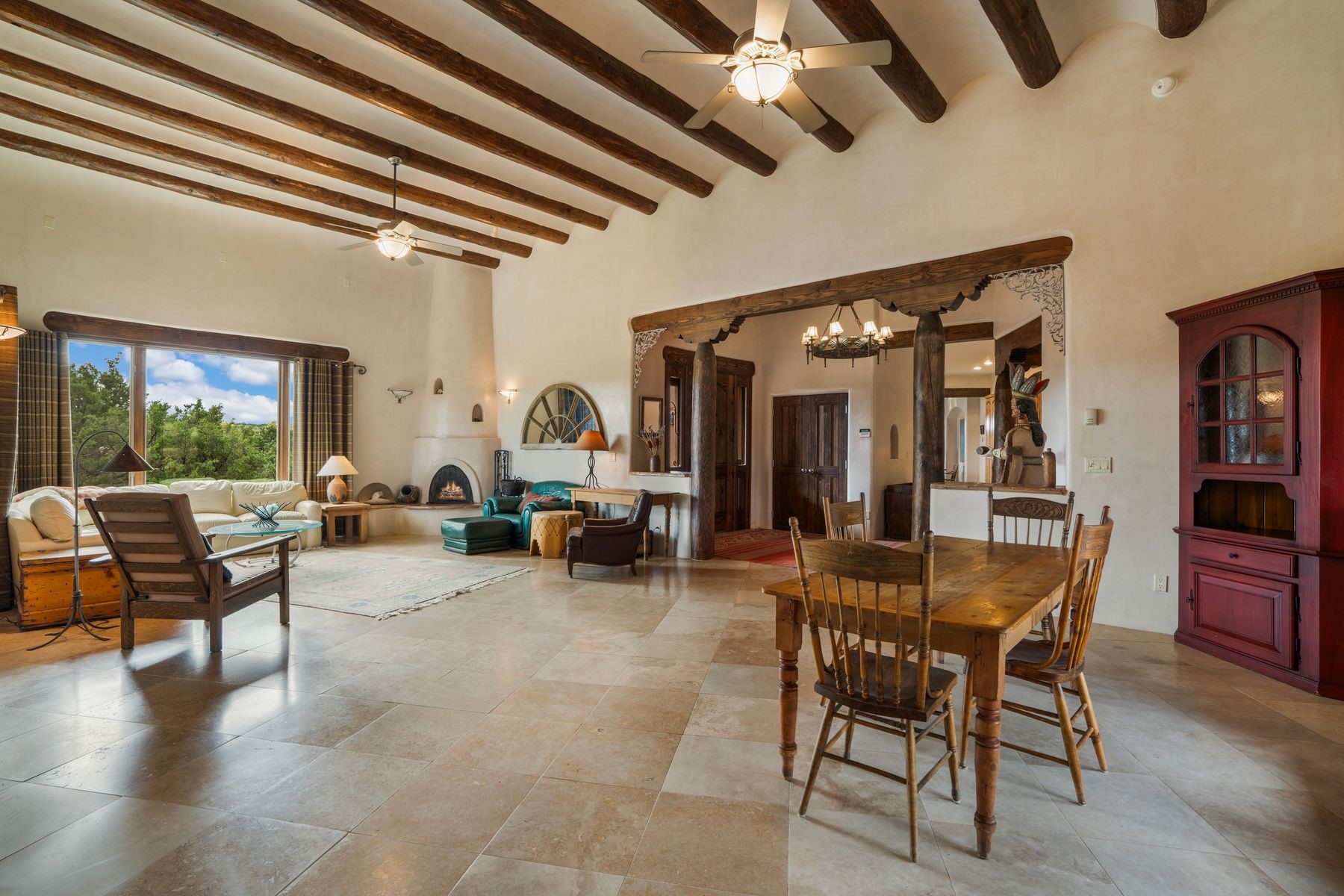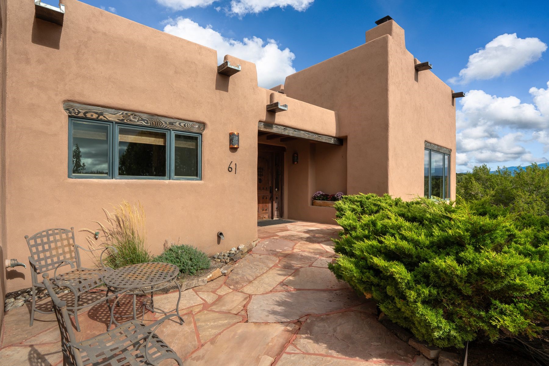 Experience classic Santa Fe style and modern livability in this 3,486 sq ft single-level (no steps!) Pueblo Revival home on 2.86 acres, built in 2005, and just 13 minutes from the Plaza. Designed for comfort and entertaining, the residence offers high ceilings and diamond plaster walls throughout, 3 spacious en-suite bedrooms and 5 bathrooms, including a luxurious primary suite with a generous flex space ideal for an office/gym, a large walk-in closet, and French doors leading to a portal. The ADA-compliant front entry to the house and primary bathroom shower provide accessibility without compromising style. The great room features soaring coved viga ceilings and opens through French doors to a covered rear portal with kiva fireplace, sunshade, and landscaped privacy wall -- a perfect space for outdoor entertaining. The kitchen offers abundant wood cabinetry, extensive granite countertops, a large island with a second sink, and a built-in desk area. The kitchen extends to a bonus space with a kiva fireplace for dining and gathering. A spacious laundry room with sink and cabinetry opens to a side yard with an established herb garden. Throughout the home, authentic Southwestern details such as nichos, banco seating, travertine tile floors, skylights, corbels, and four wood-burning kiva fireplaces (including one outdoors) create timeless character. In-floor radiant heating, and evaporative cooling enhance everyday comfort. Additional highlights include a large 3-car heated garage with an RV bay and a versatile workshop or studio space, ample parking, central vacuum, and a rock fountain surrounded by a native plant garden and flagstone walkways. Full re-stucco on house and rear privacy wall in 2023. Partial (approx. ) TPO roof replacement in 2023. With panoramic Sangre de Cristo mtn views, La Tierra's extensive trail system just a short walk away, and no HOA, this property offers the perfect blend of privacy, natural beauty, and proximity to Santa Fe's vibrant heart.