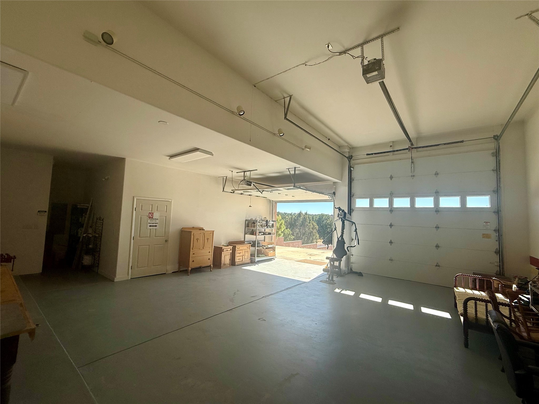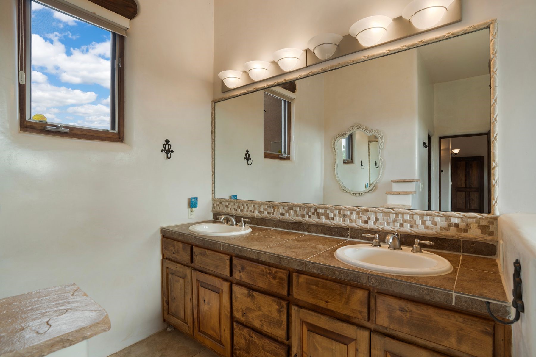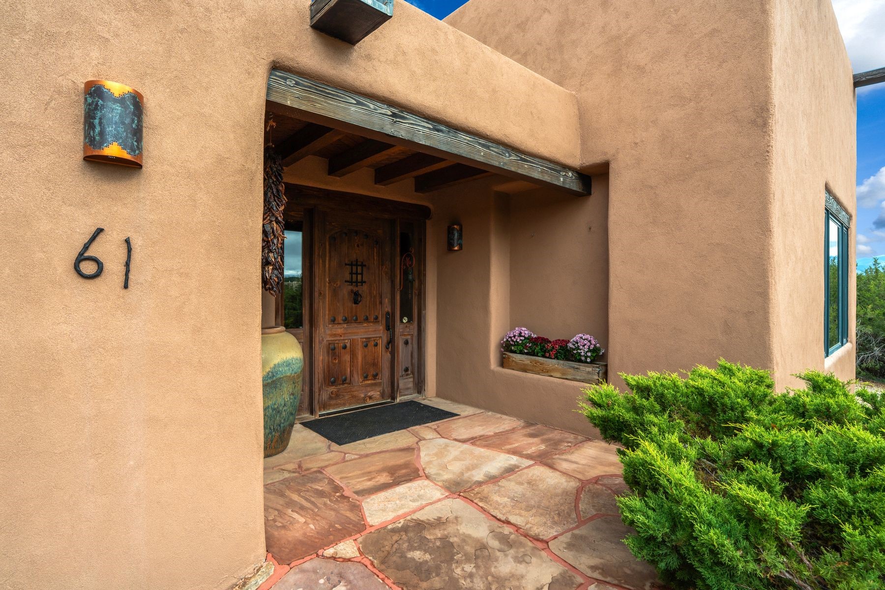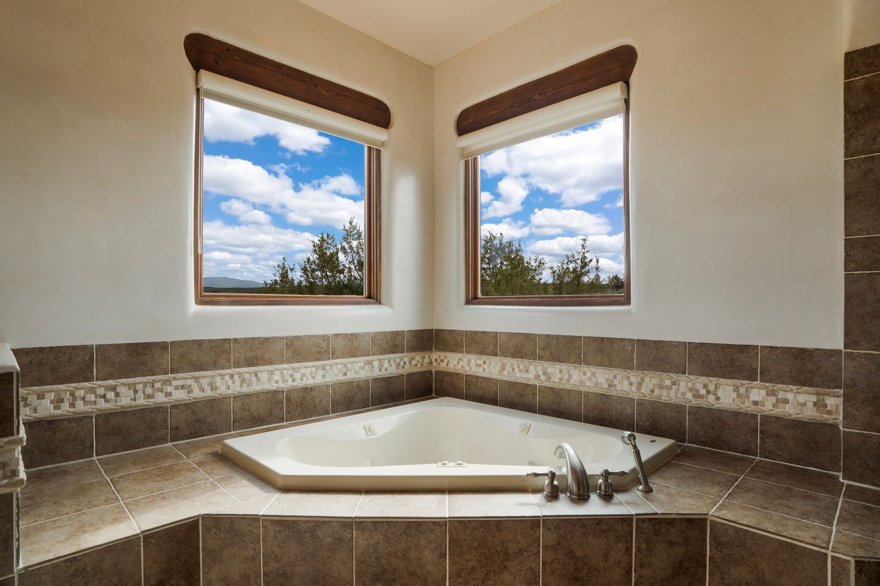 Experience classic Santa Fe style and modern livability in this 3,486 sq ft single-level (no steps!) Pueblo Revival home on 2.86 acres, built in 2005, and just 13 minutes from the Plaza. Designed for comfort and entertaining, the residence offers high ceilings and diamond plaster walls throughout, 3 spacious en-suite bedrooms and 5 bathrooms, including a luxurious primary suite with a generous flex space ideal for an office/gym, a large walk-in closet, and French doors leading to a portal. The ADA-compliant front entry to the house and primary bathroom shower provide accessibility without compromising style. The great room features soaring coved viga ceilings and opens through French doors to a covered rear portal with kiva fireplace, sunshade, and landscaped privacy wall -- a perfect space for outdoor entertaining. The kitchen offers abundant wood cabinetry, extensive granite countertops, a large island with a second sink, and a built-in desk area. The kitchen extends to a bonus space with a kiva fireplace for dining and gathering. A spacious laundry room with sink and cabinetry opens to a side yard with an established herb garden. Throughout the home, authentic Southwestern details such as nichos, banco seating, travertine tile floors, skylights, corbels, and four wood-burning kiva fireplaces (including one outdoors) create timeless character. In-floor radiant heating, and evaporative cooling enhance everyday comfort. Additional highlights include a large 3-car heated garage with an RV bay and a versatile workshop or studio space, ample parking, central vacuum, and a rock fountain surrounded by a native plant garden and flagstone walkways. Full re-stucco on house and rear privacy wall in 2023. Partial (approx. ) TPO roof replacement in 2023. With panoramic Sangre de Cristo mtn views, La Tierra's extensive trail system just a short walk away, and no HOA, this property offers the perfect blend of privacy, natural beauty, and proximity to Santa Fe's vibrant heart.