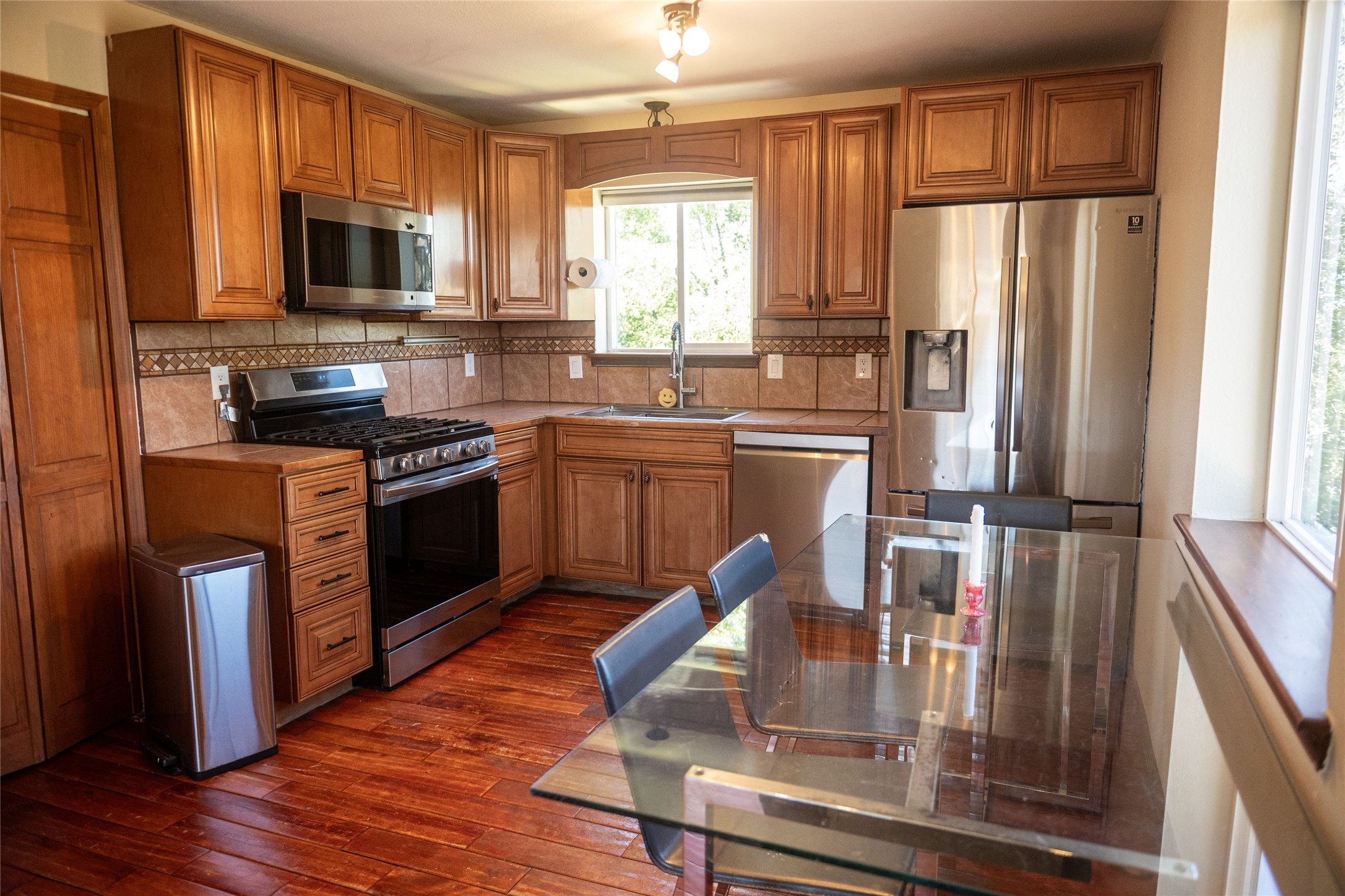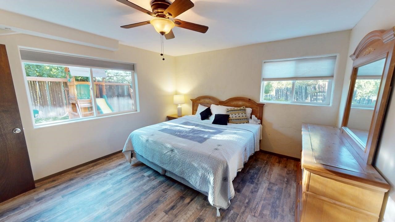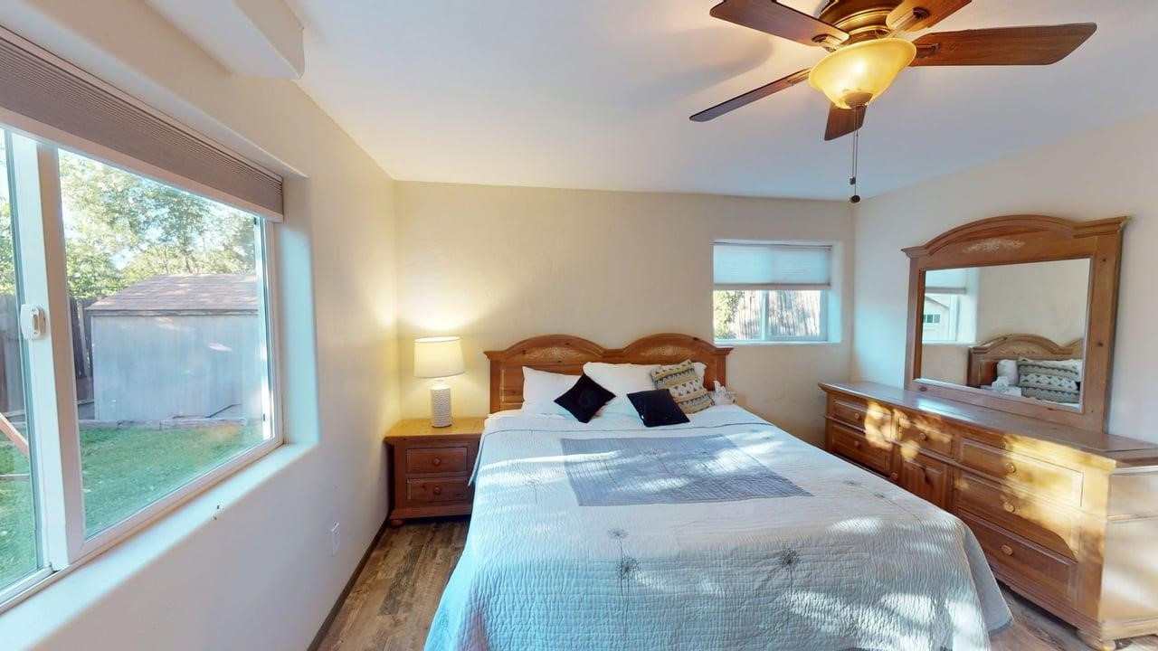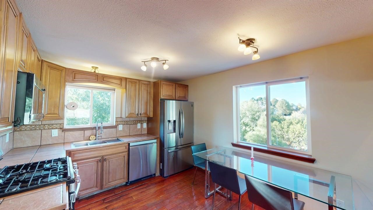 This spacious home offers versatile living across two levels, featuring beautiful and well-maintained outdoor spaces. The main entry level features a bedroom, two bathrooms, dual kitchen areas, built-in storage, and a laundry closet. The lower level features three additional bedrooms, a comfortable living area, and ample storage space. Updates include wood flooring, a kitchen, and bathrooms with granite countertops, as well as carpet in the downstairs area. From the upper level, enjoy sweeping views, while the landscaped yard provides the perfect setting for relaxation or entertaining.