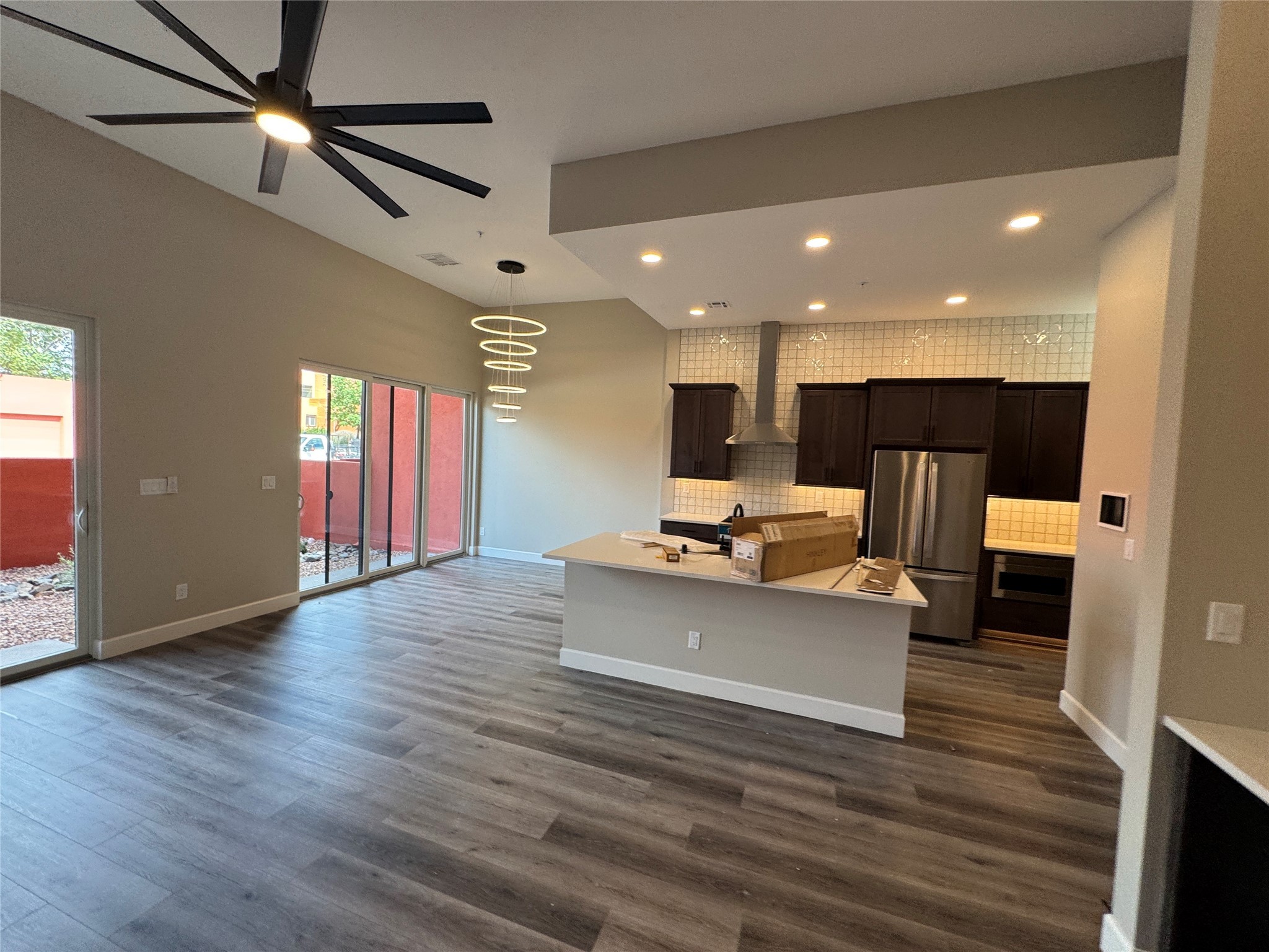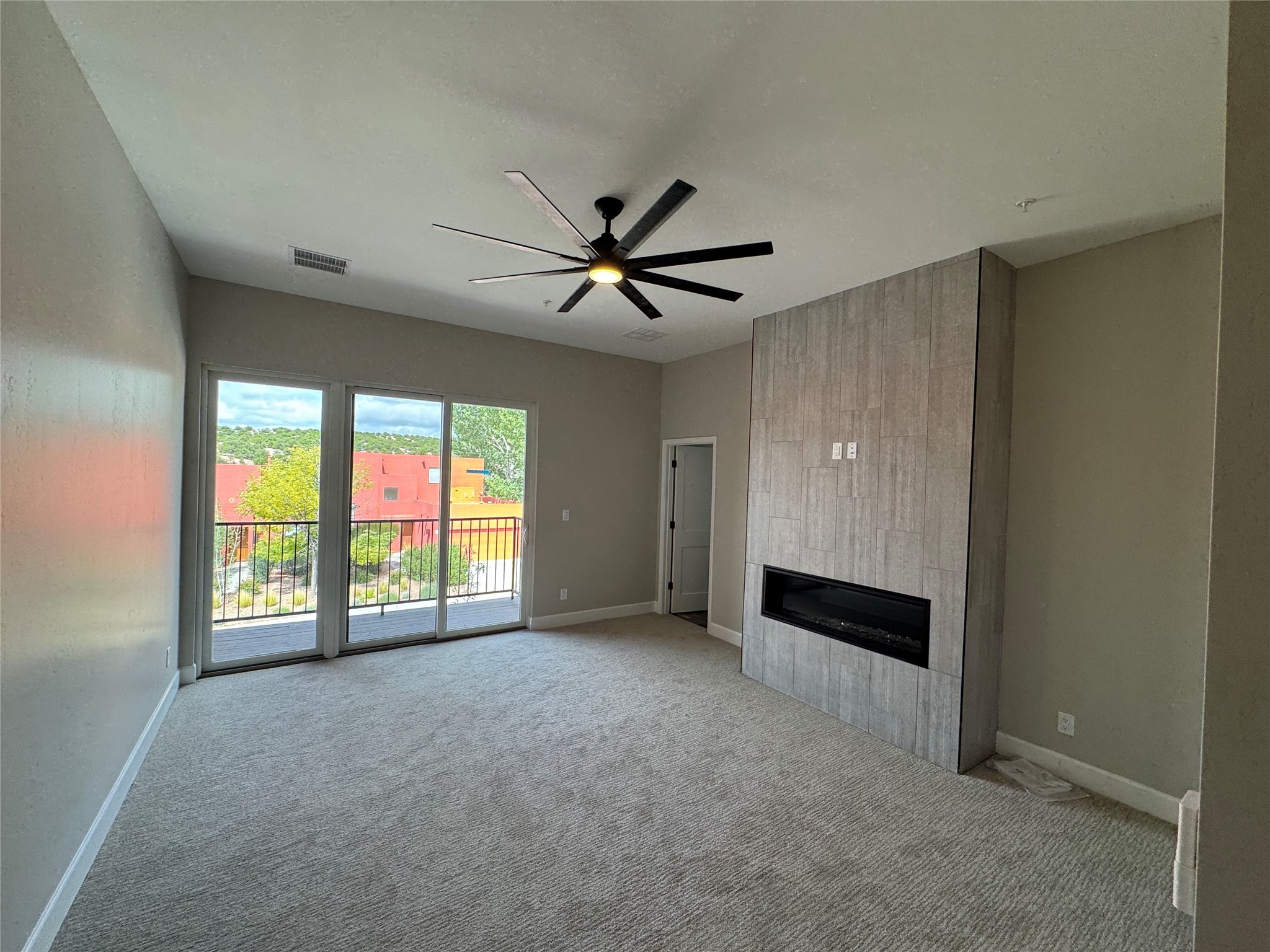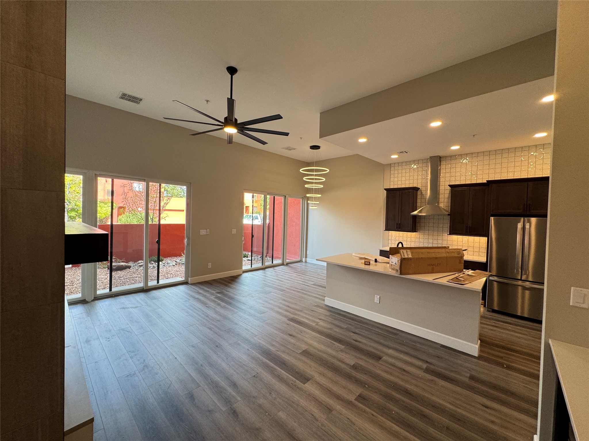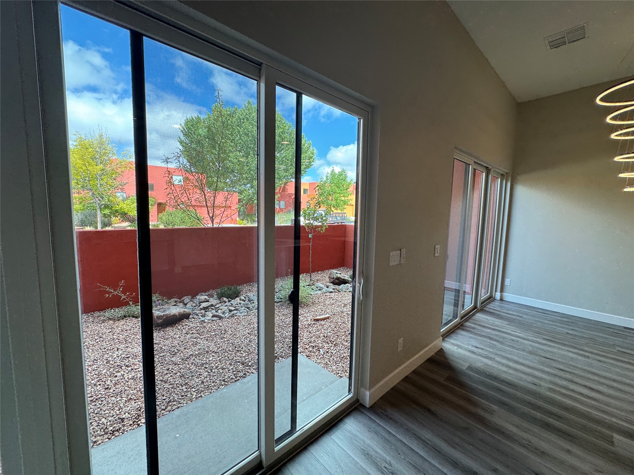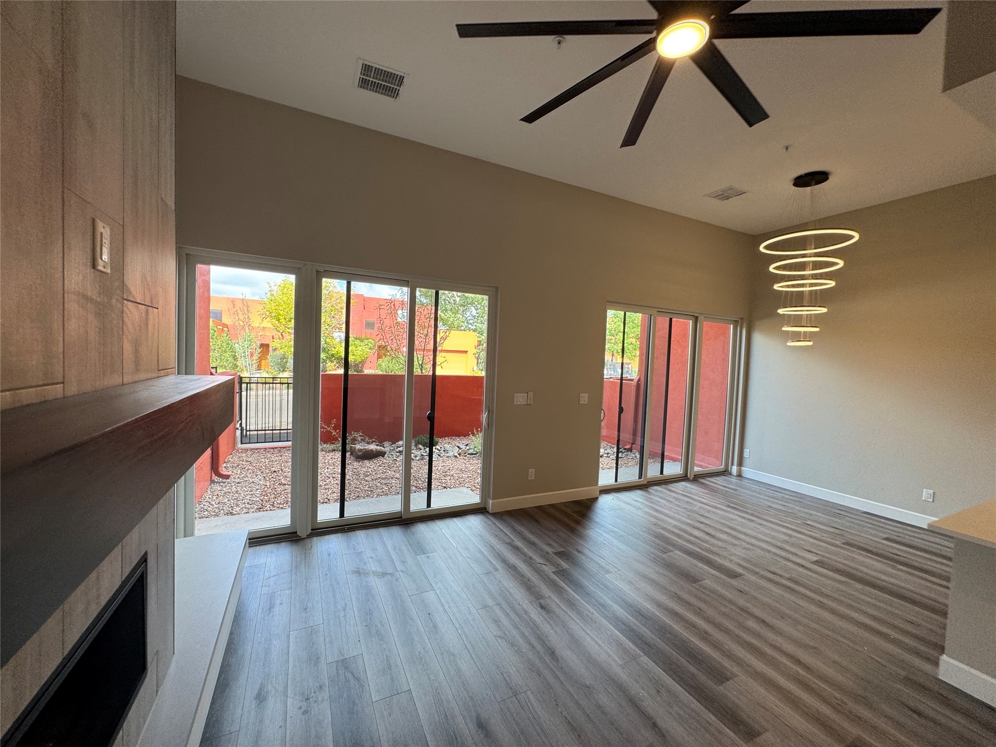 Welcome to Unit #45 at Zocalo, Santa Fe--A refined interior unit that perfectly melds luxury with comfort. As you step into the inviting foyer, you are presented with two enticing options: descend to the lower level where the expansive great room awaits, complete with modern grey toned, sophisticated brushed nickel finishes, and contemporary maple-finished flooring that radiates modern elegance. This level also houses the well-appointed kitchen and provides access to the beautifully landscaped patio, ideal for both vibrant entertainment and serene relaxation.Alternatively, ascend to the upper level where you will find the luxurious primary suite, featuring a cozy second fireplace that creates an opulent sanctuary perfect for restful nights. Atop boasts a junior suite offering additional comfort and privacy.