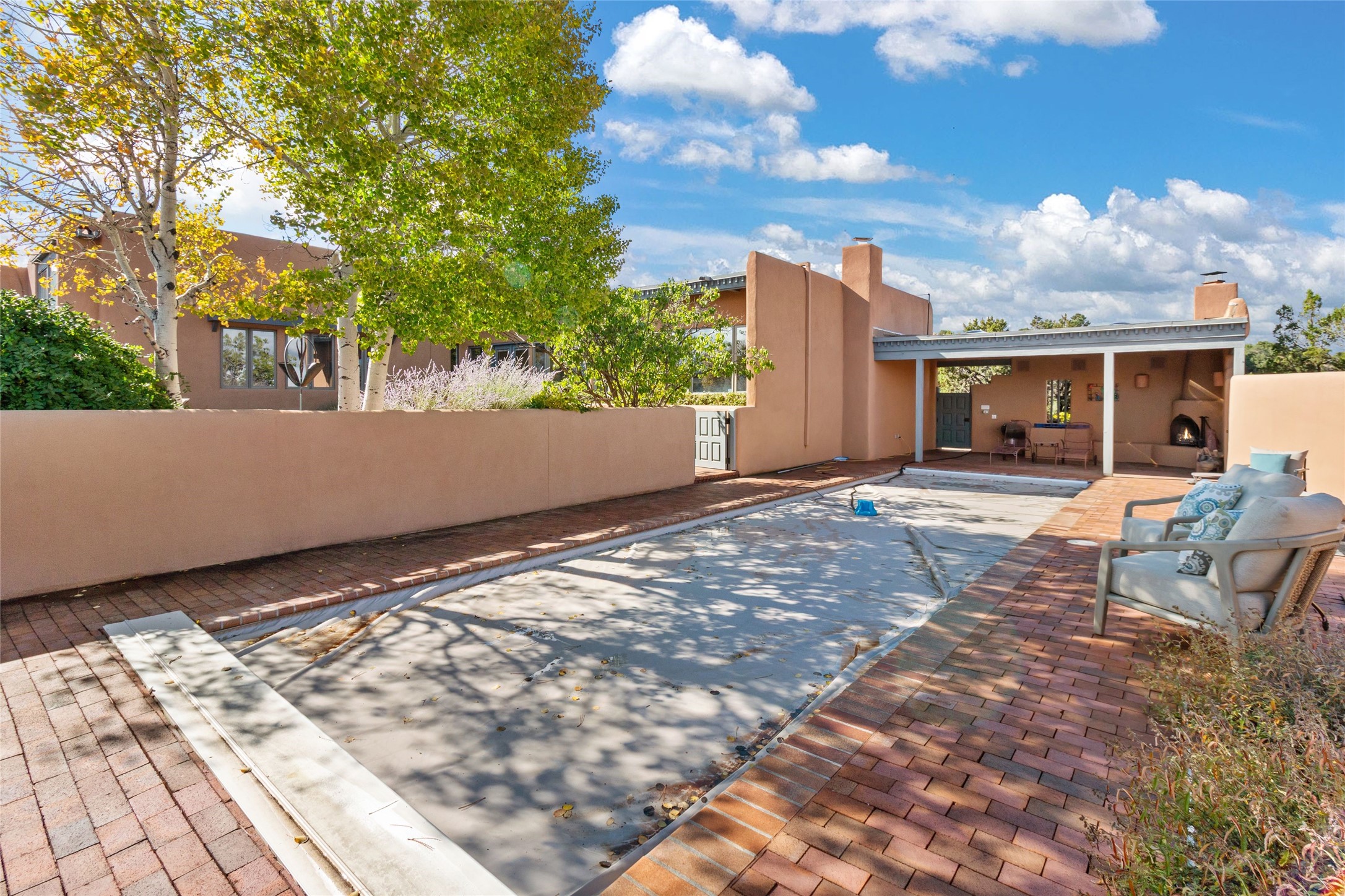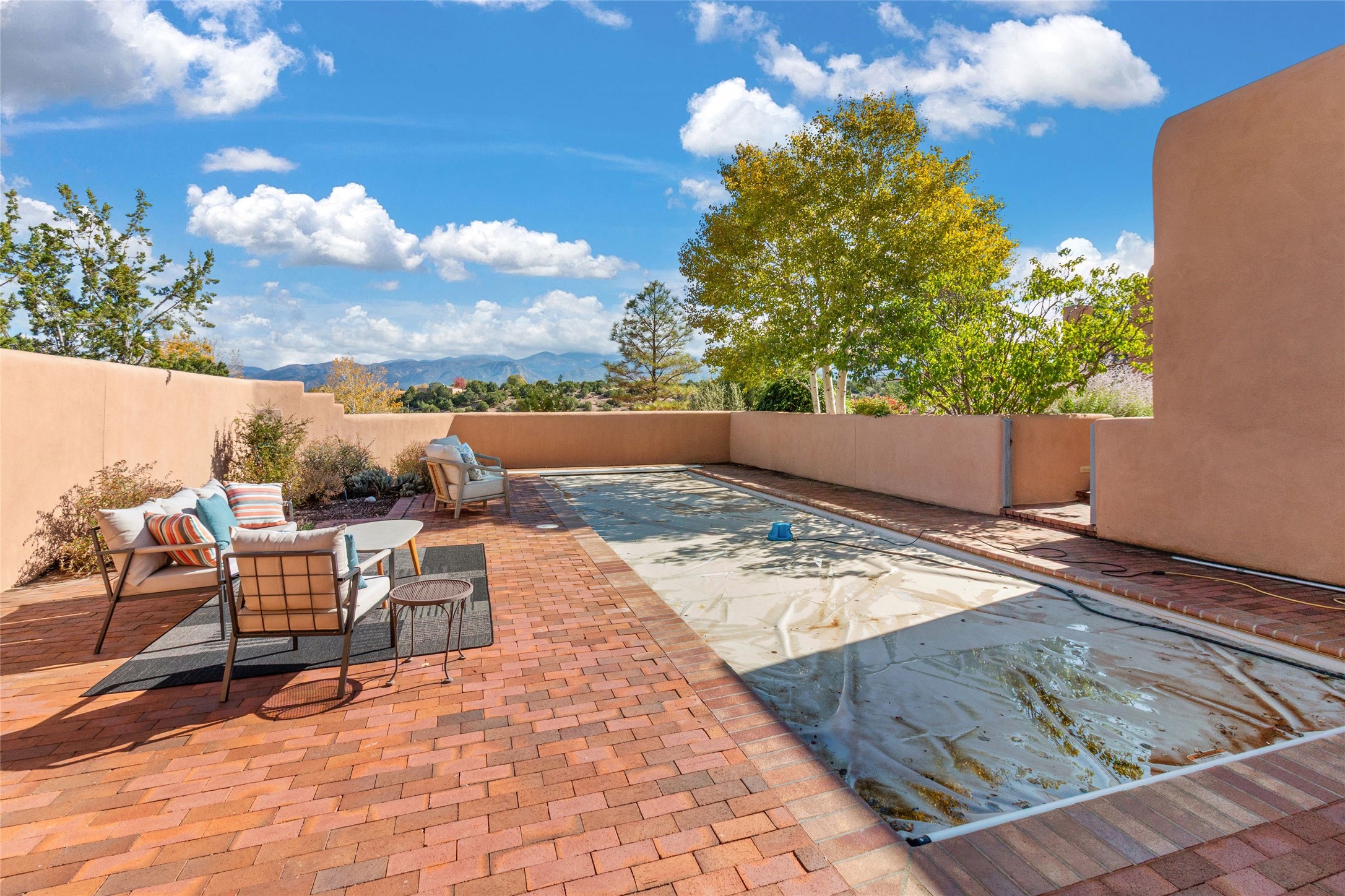 The story goes that when John Crosby (the original developer and founder of the Santa Fe Opera) chose a lot for their model, he chose this interior Casas de San Juan lot due to it's seclusion, privacy, and spectacular views. The main house, separate guest house, and heated swimming pool are singular in the condominium configuration in the subdivision. The living room features a high ceiling and glass window wall the inspire "Wow" when one walks in the home...it also features a wet bar, corner kiva fireplace, and a wall for media. The newly installed/renovated kitchen (by renowned kitchen designer Jeanne') features stone counter tops, Sub-Zero and Kitchen Aid appliances with a range/oven and a 2nd oven for big togethers. The kitchen space features high ceilings and lots of light. The over-sized Primary suite again features the views, a corner kiva fireplace, and a beautifully renovated full bath with separate tub and shower. The second large bedroom suite is on the other end of the home for privacy, and the home is rounded out by a 3rd bedroom and hallway full bath. The separate guest house sits atop the garage and is a welcome retreat from the main house with lots of space, privacy and comfort. To the east of the main part of the home is a large courtyard/garden area that provides plenty of options for outdoor living. And the large lap pool (41 x 12) sits to the north and is fenced in with a cabana, kiva fireplace and a barbecue area. The home has forced air heat and refrigerated air conditioning, w/ supplemental heat & AC via mini-split in the north bedroom suite and in the guest house. The home has a wired sound system, and utilizes a shared well and septic via the HOA. Casas de San Juan is a gated subdivision accessed by the Main Entrance front gate staffed during the day for added Security.