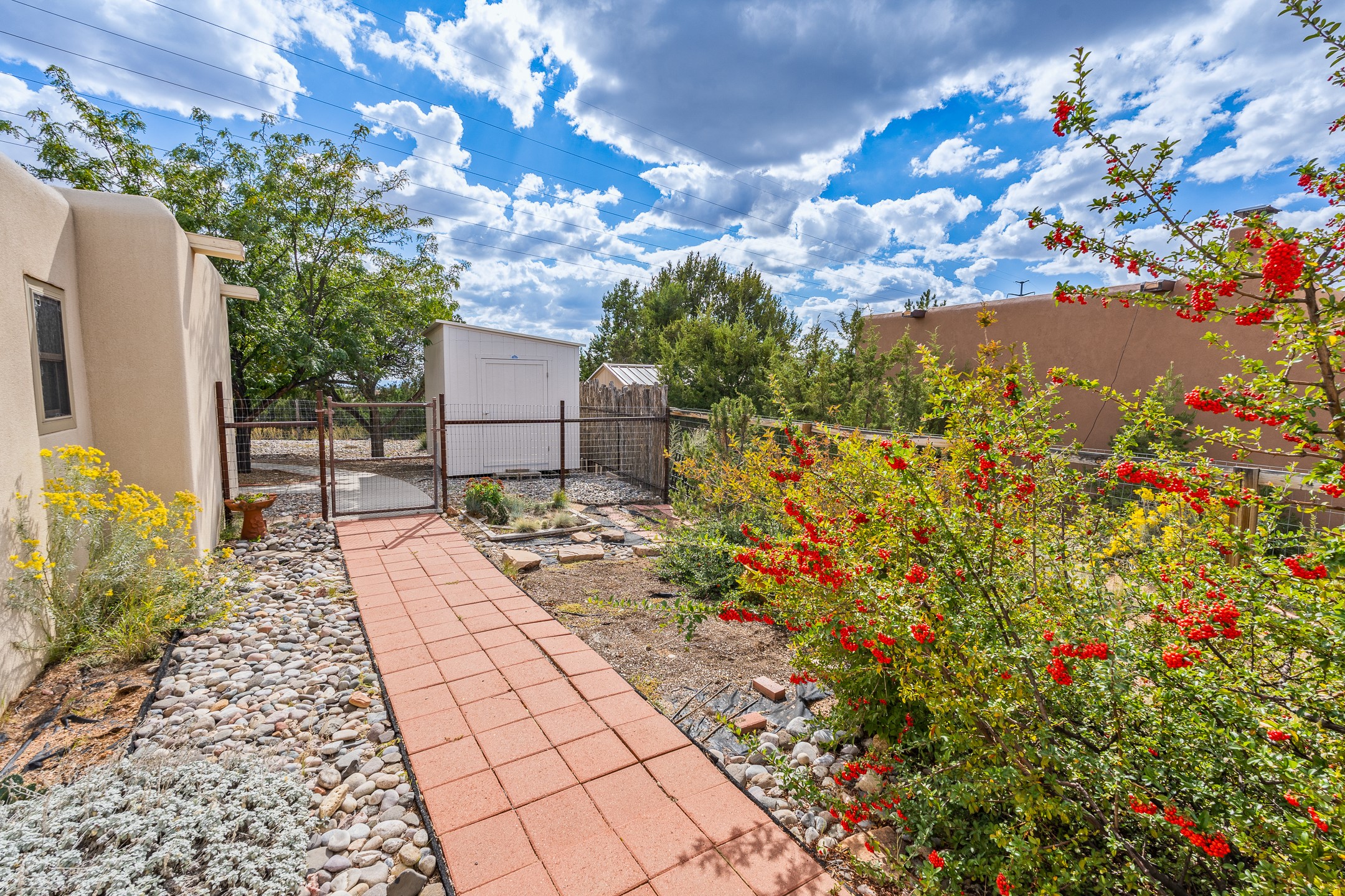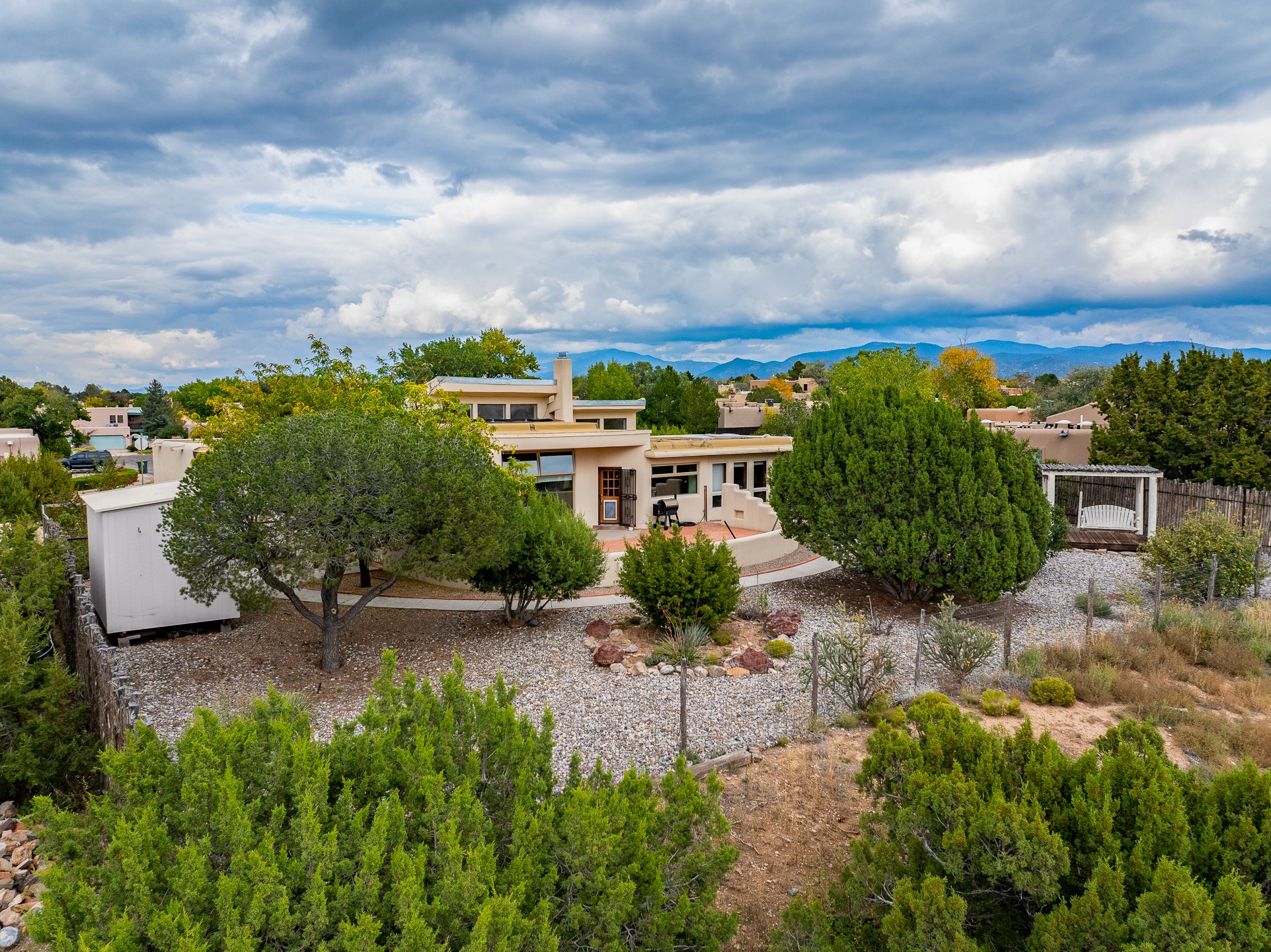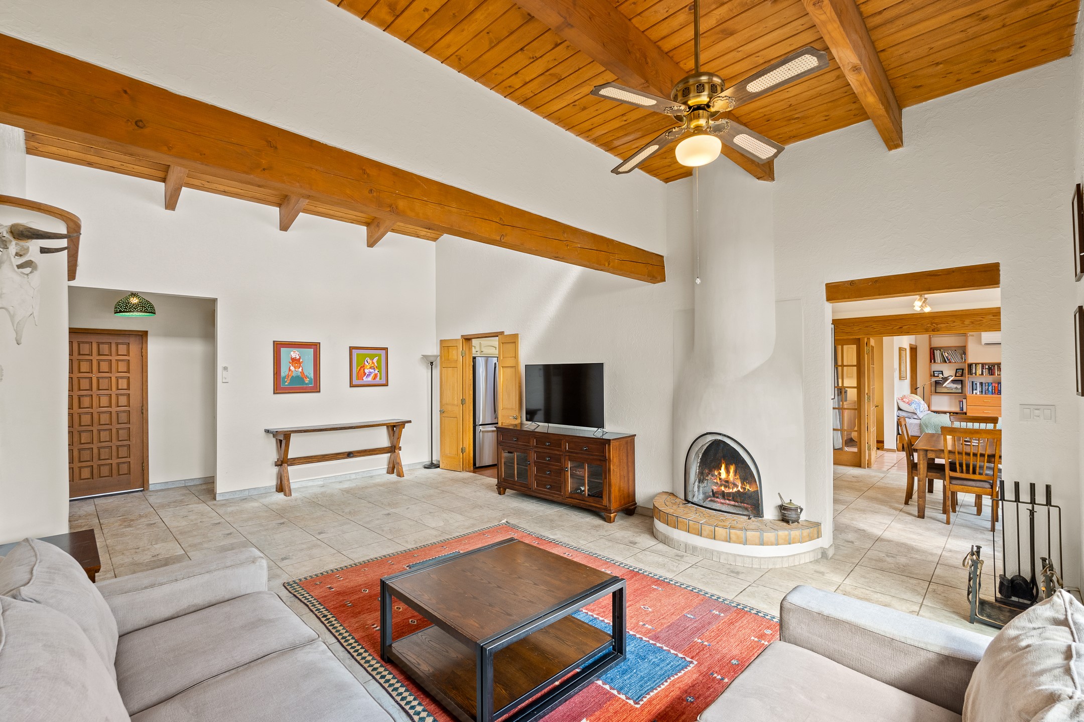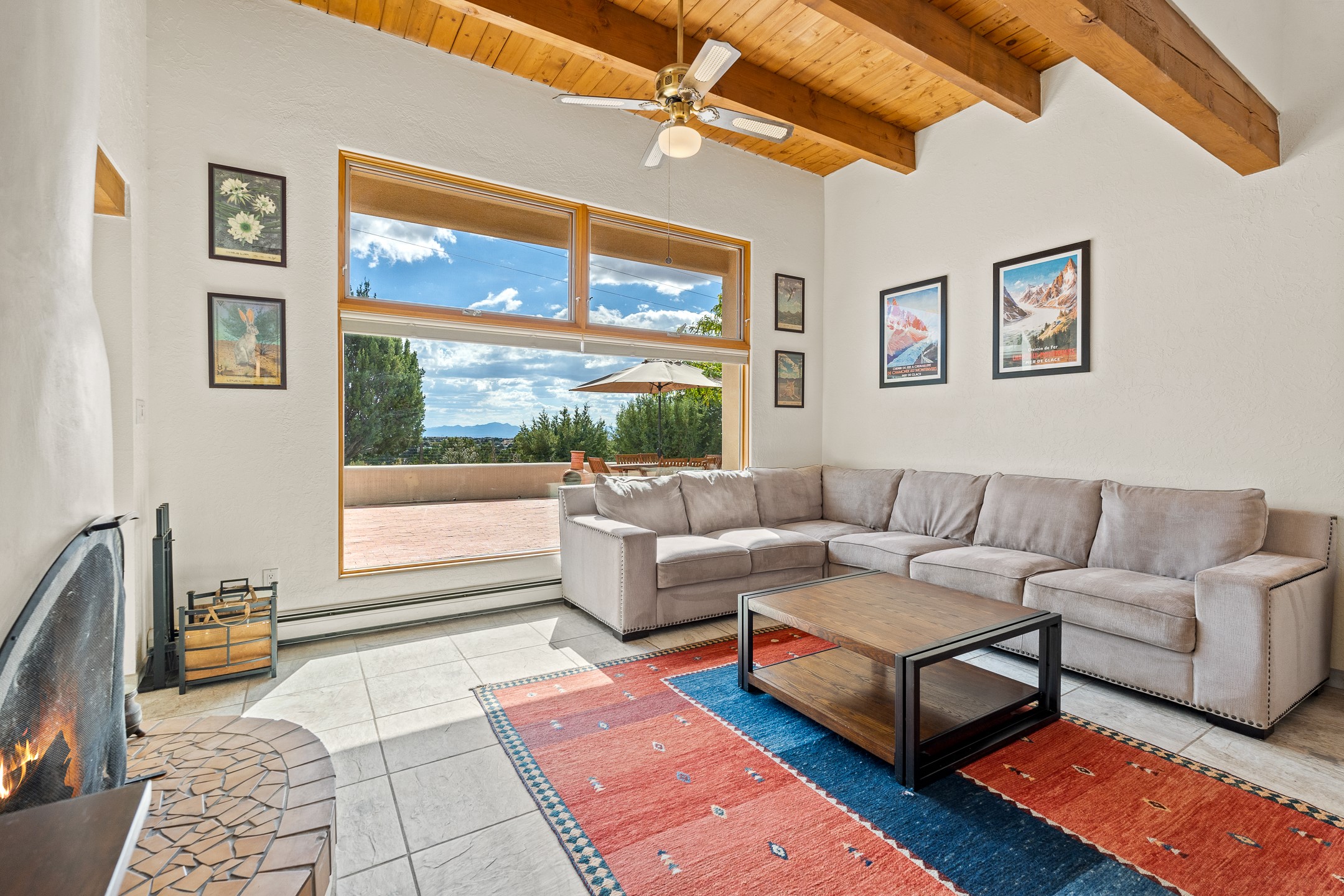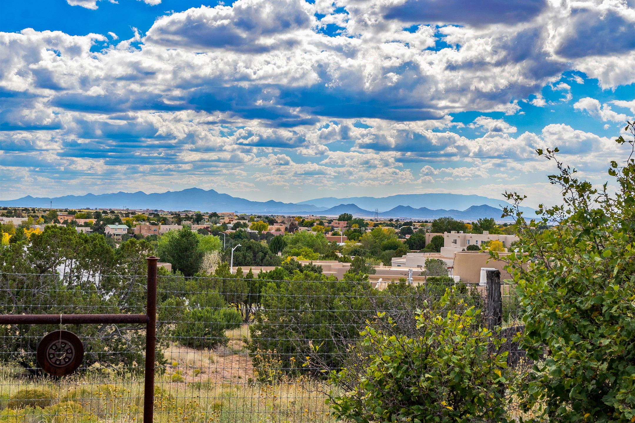 Welcome to this light-filled and beautifully maintained single-level home, ideally situated for easy access to all that Santa Fe has to offer. Located on an elevated .45-acre lot, this 1,900 sq. ft. property offers both comfort and accessibility. Inside, you'll find three spacious bedrooms, three bathrooms, and a flexible attached office/studio that can serve as a 4th bedroom or creative space. Architectural highlights include high beamed ceilings, T&G ceiling, with clerestory windows, skylights, and a classic kiva-style fireplace -- all creating a warm, Southwestern ambiance. Enjoy year-round comfort with hot water baseboard heating and mini-split systems for heating and cooling. Step inside to a private entry courtyard with flagstone and a fully enclosed backyard featuring a brick patio, perfect for outdoor entertaining. Relax under the pergola swing with your morning coffee or evening glass of wine while taking in breathtaking views of the Sandia and Ortiz Mountains. The yard is beautifully landscaped with multiple fruit trees, drip irrigation, and includes a large storage shed. Don't miss this rare opportunity to own a peaceful and versatile home with majestic sunrises and sunsets, just a short drive to downtown Santa Fe.