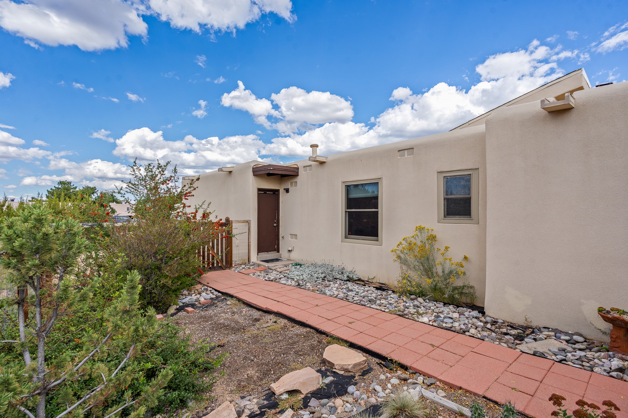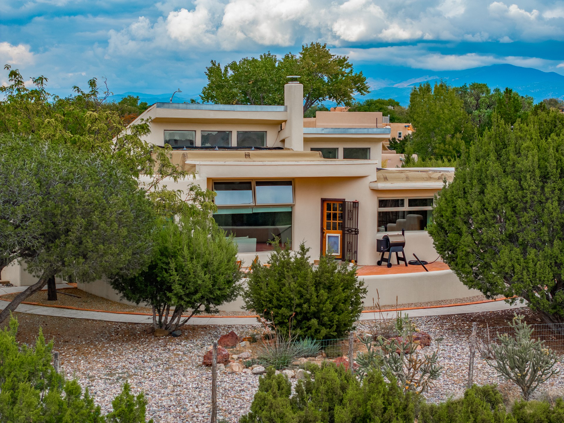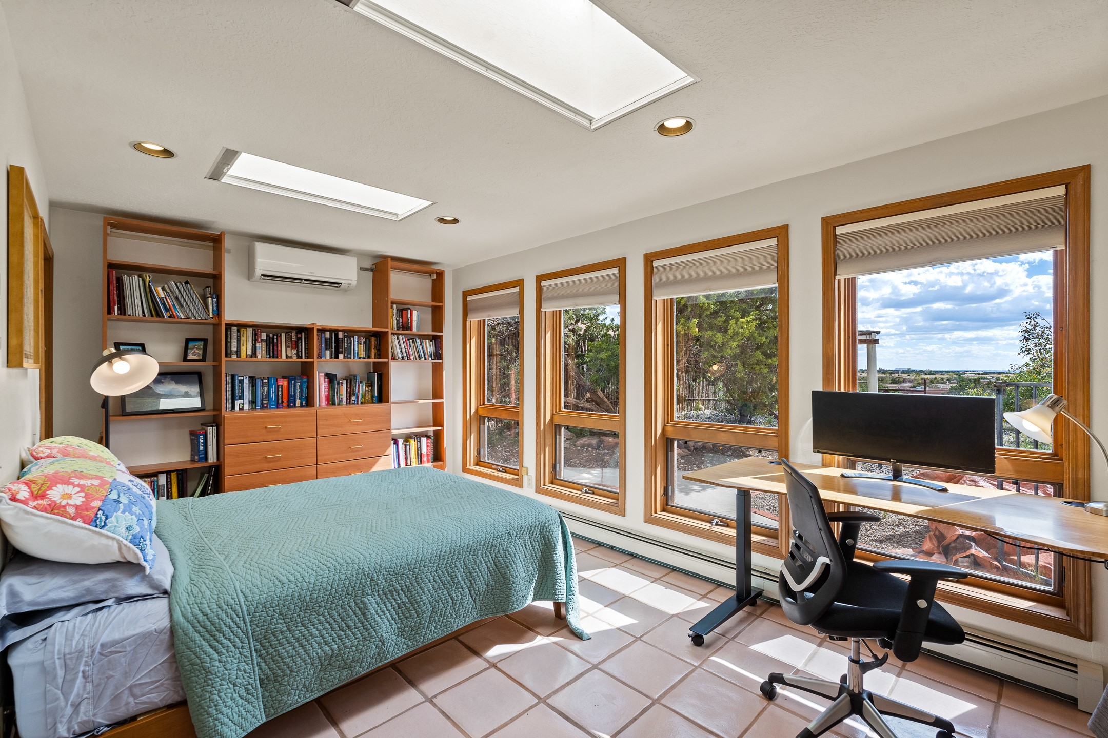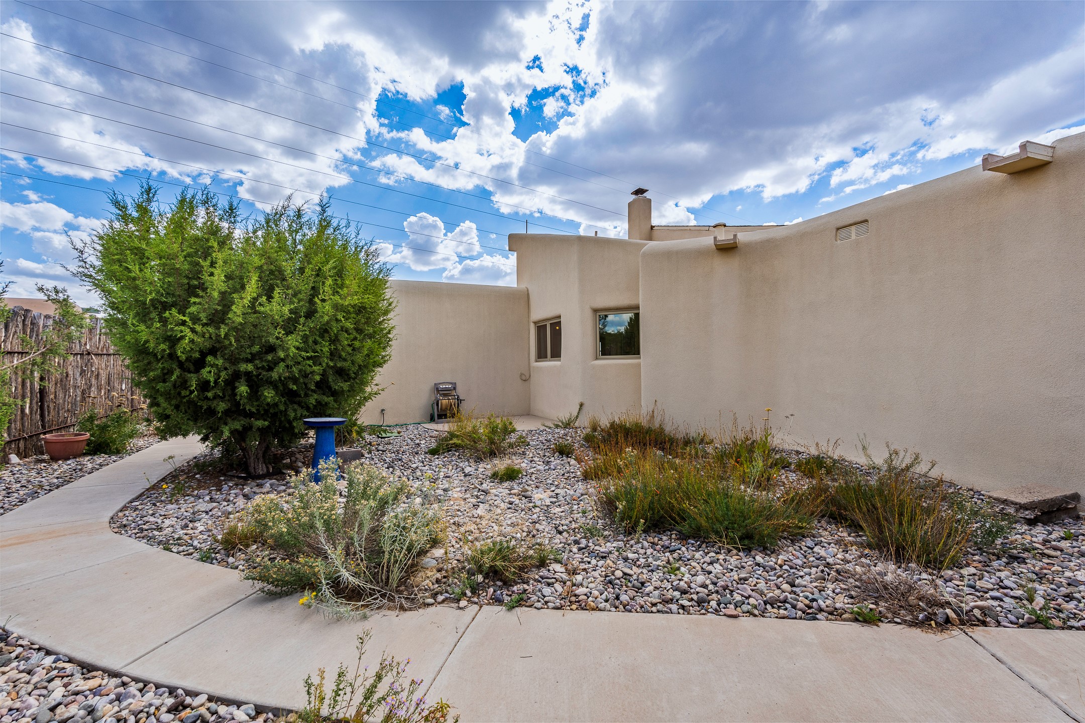 Welcome to this light-filled and beautifully maintained single-level home, ideally situated for easy access to all that Santa Fe has to offer. Located on an elevated .45-acre lot, this 1,900 sq. ft. property offers both comfort and accessibility. Inside, you'll find three spacious bedrooms, three bathrooms, and a flexible attached office/studio that can serve as a 4th bedroom or creative space. Architectural highlights include high beamed ceilings, T&G ceiling, with clerestory windows, skylights, and a classic kiva-style fireplace -- all creating a warm, Southwestern ambiance. Enjoy year-round comfort with hot water baseboard heating and mini-split systems for heating and cooling. Step inside to a private entry courtyard with flagstone and a fully enclosed backyard featuring a brick patio, perfect for outdoor entertaining. Relax under the pergola swing with your morning coffee or evening glass of wine while taking in breathtaking views of the Sandia and Ortiz Mountains. The yard is beautifully landscaped with multiple fruit trees, drip irrigation, and includes a large storage shed. Don't miss this rare opportunity to own a peaceful and versatile home with majestic sunrises and sunsets, just a short drive to downtown Santa Fe.