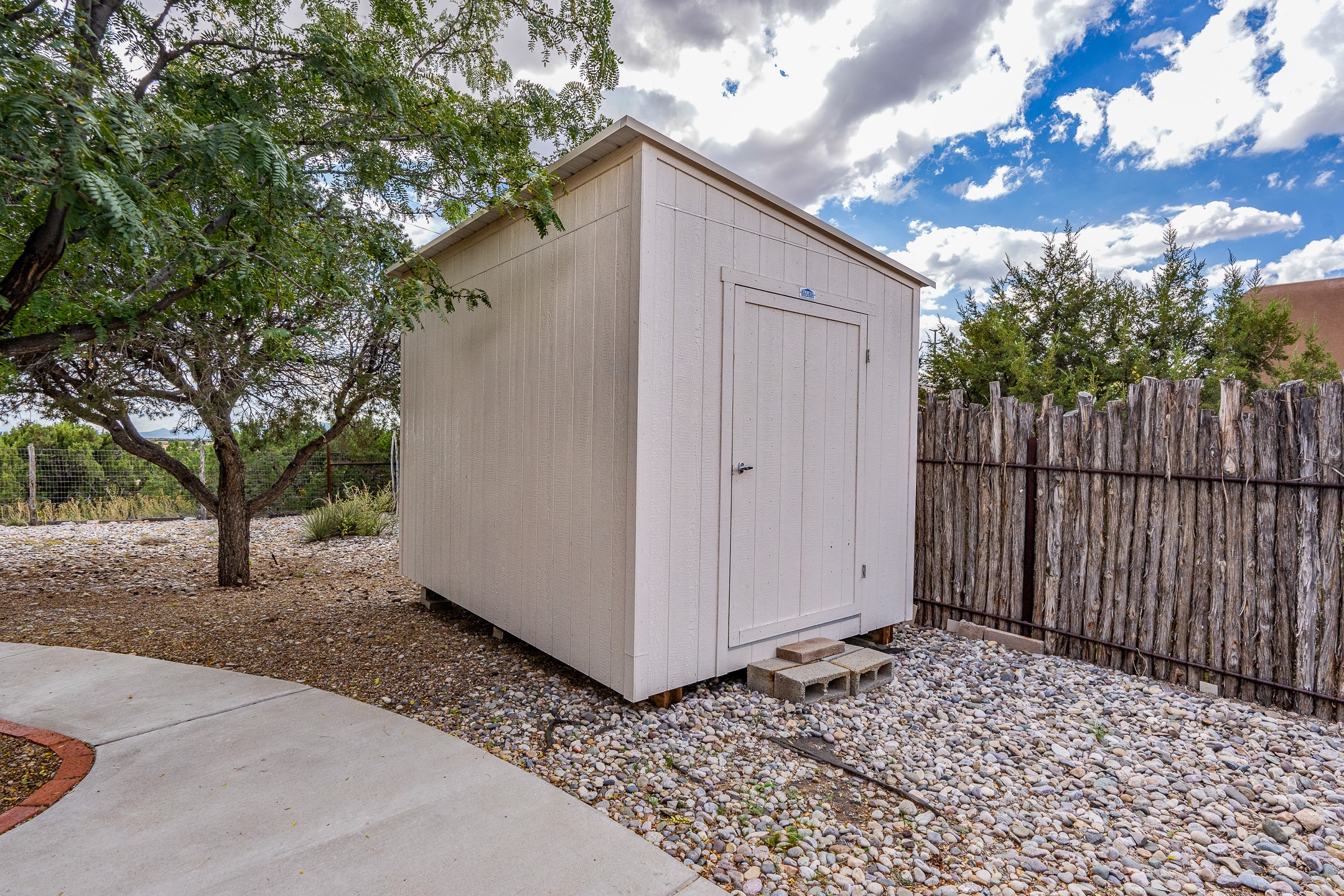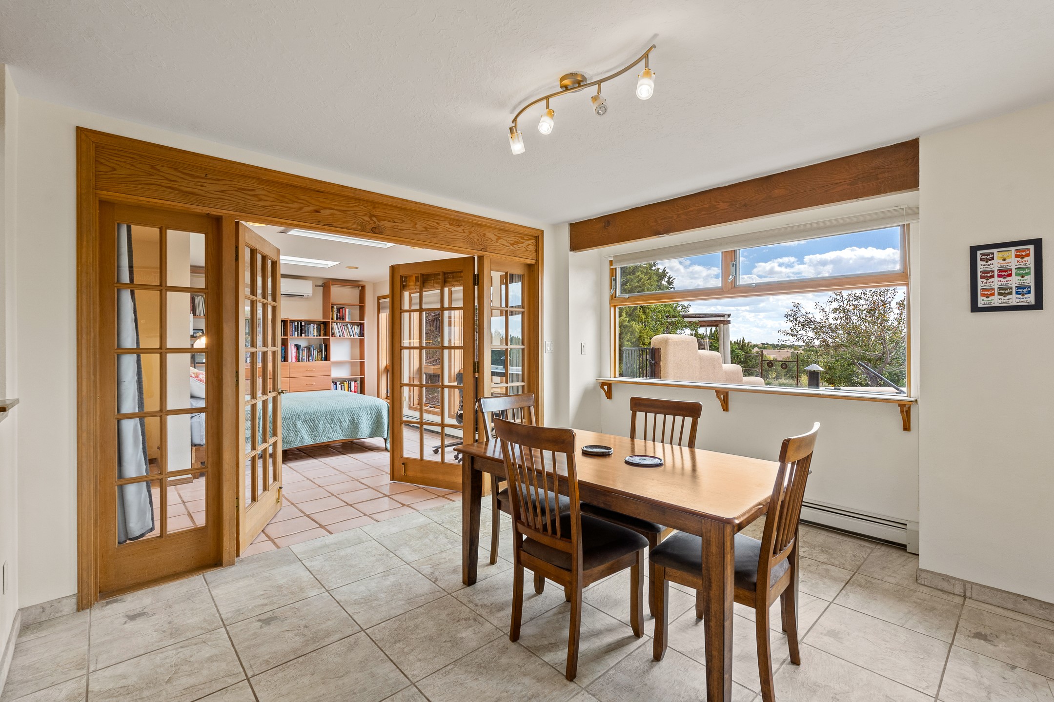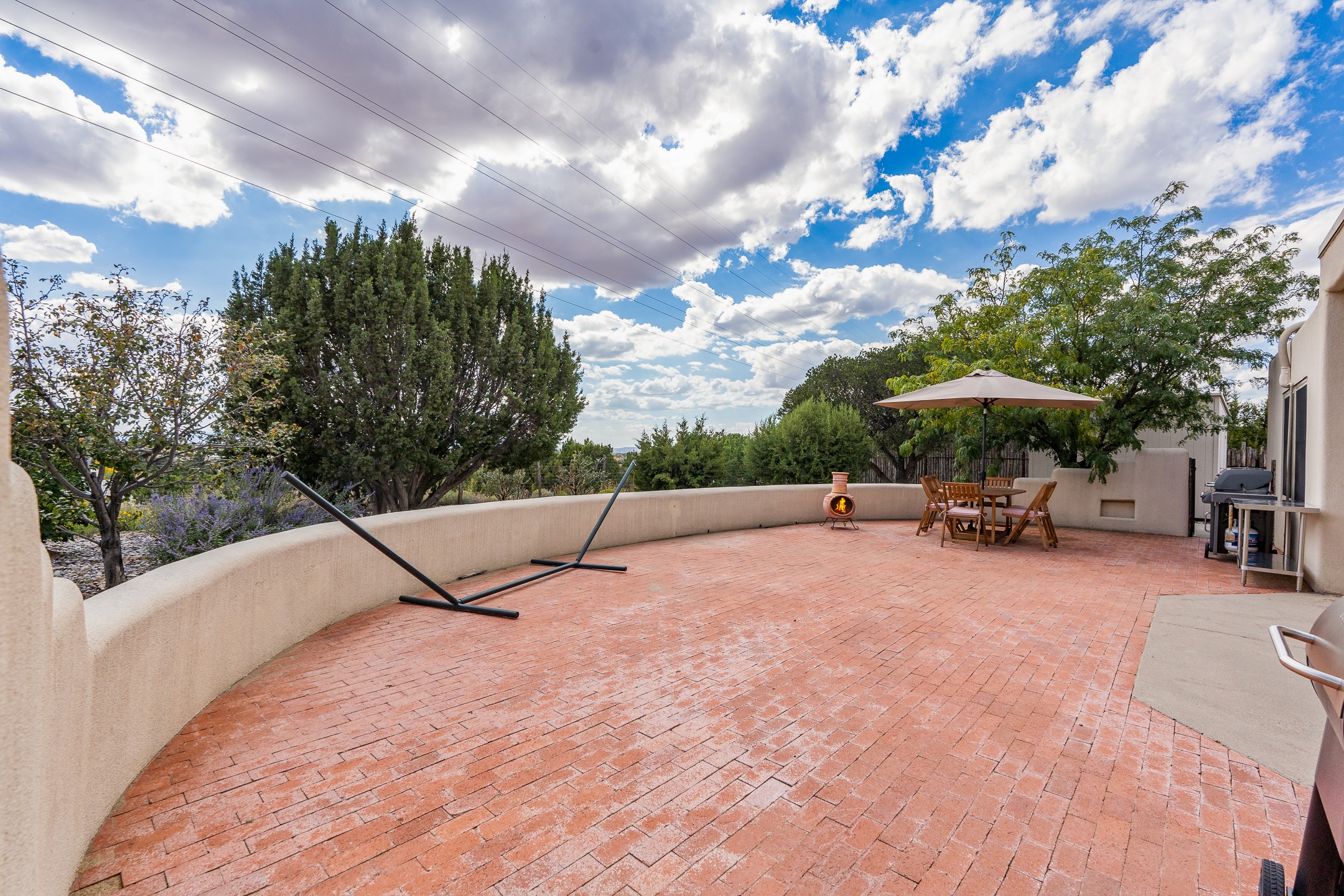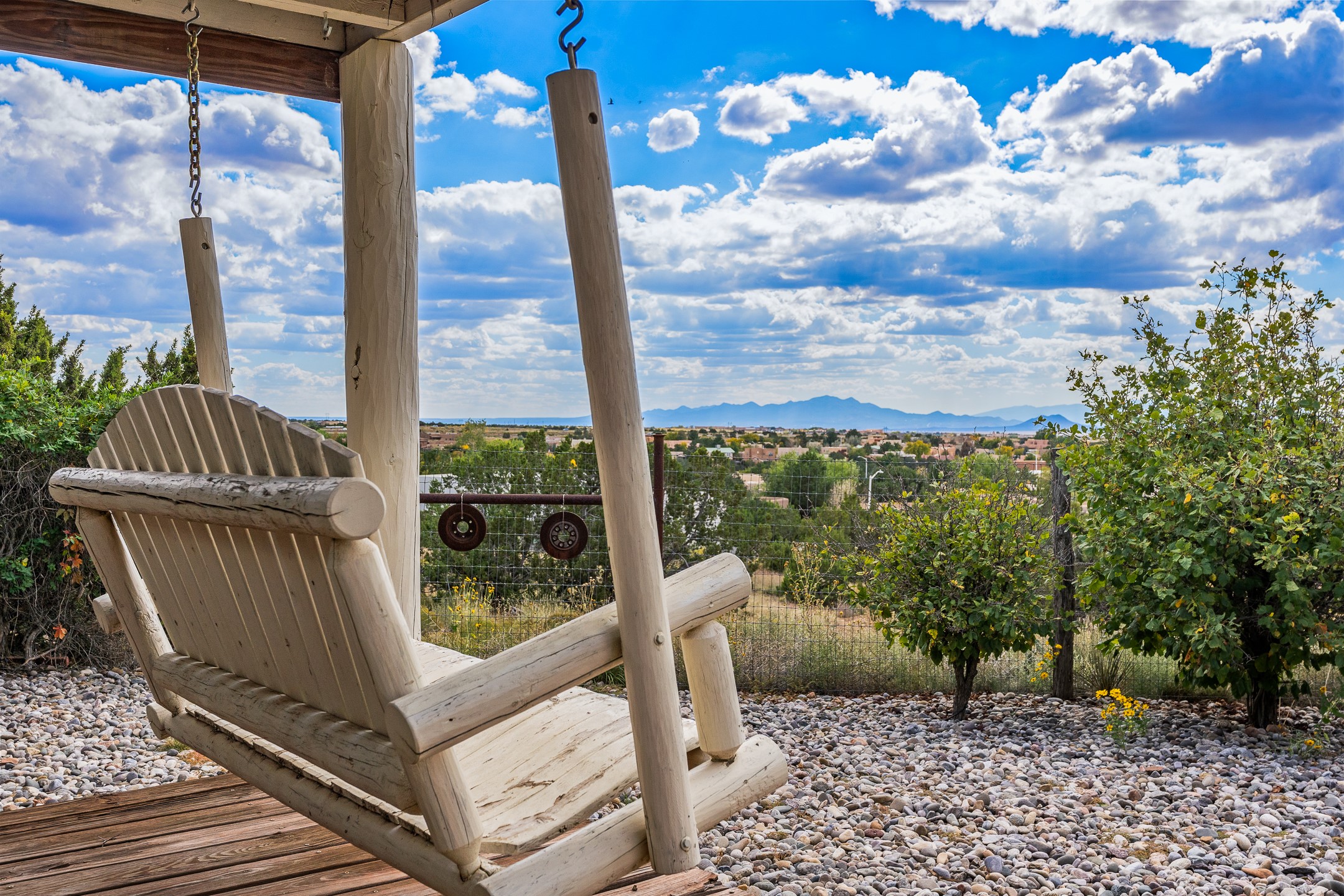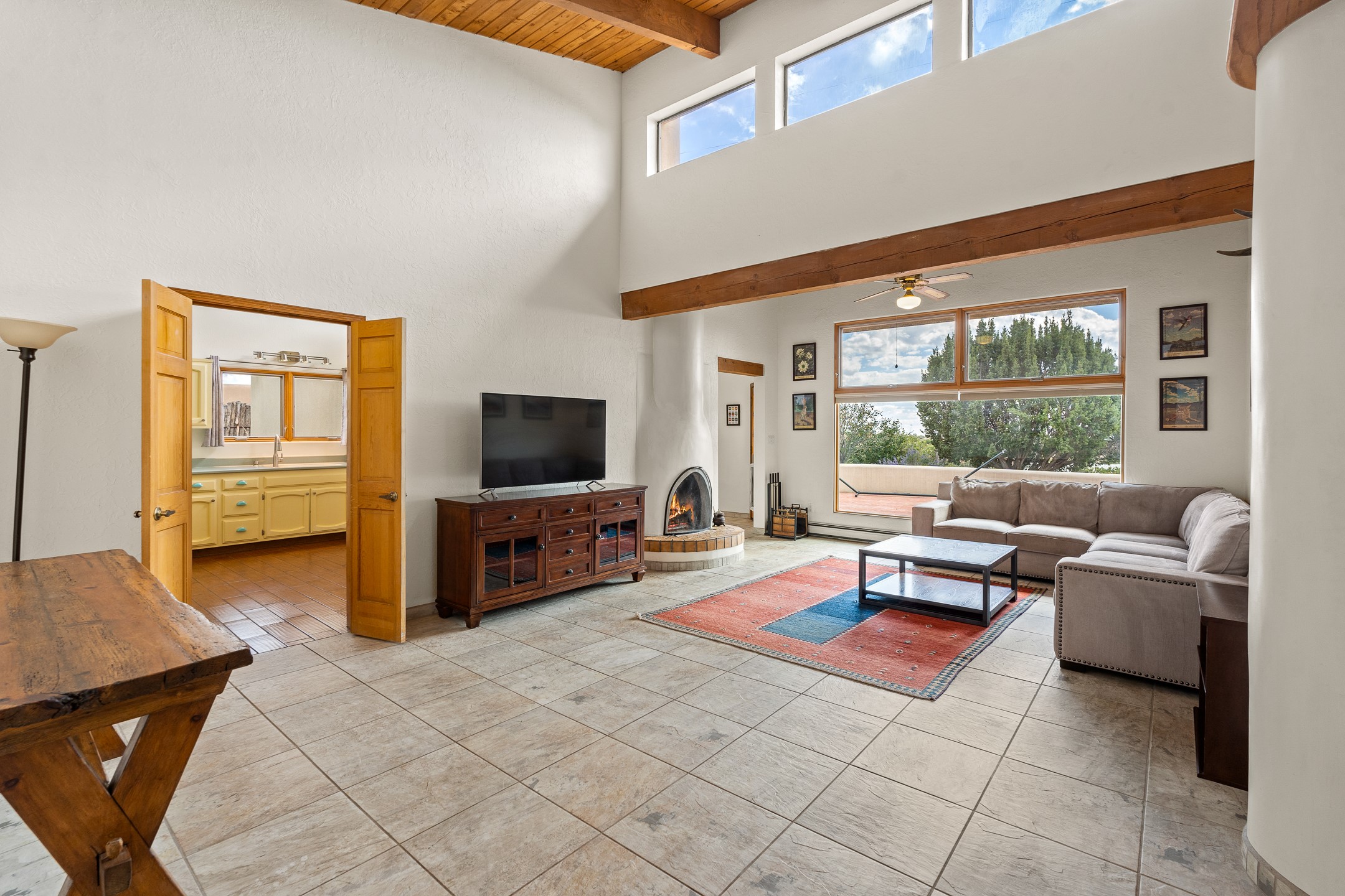 Welcome to this light-filled and beautifully maintained single-level home, ideally situated for easy access to all that Santa Fe has to offer. Located on an elevated .45-acre lot, this 1,900 sq. ft. property offers both comfort and accessibility. Inside, you'll find three spacious bedrooms, three bathrooms, and a flexible attached office/studio that can serve as a 4th bedroom or creative space. Architectural highlights include high beamed ceilings, T&G ceiling, with clerestory windows, skylights, and a classic kiva-style fireplace -- all creating a warm, Southwestern ambiance. Enjoy year-round comfort with hot water baseboard heating and mini-split systems for heating and cooling. Step inside to a private entry courtyard with flagstone and a fully enclosed backyard featuring a brick patio, perfect for outdoor entertaining. Relax under the pergola swing with your morning coffee or evening glass of wine while taking in breathtaking views of the Sandia and Ortiz Mountains. The yard is beautifully landscaped with multiple fruit trees, drip irrigation, and includes a large storage shed. Don't miss this rare opportunity to own a peaceful and versatile home with majestic sunrises and sunsets, just a short drive to downtown Santa Fe.