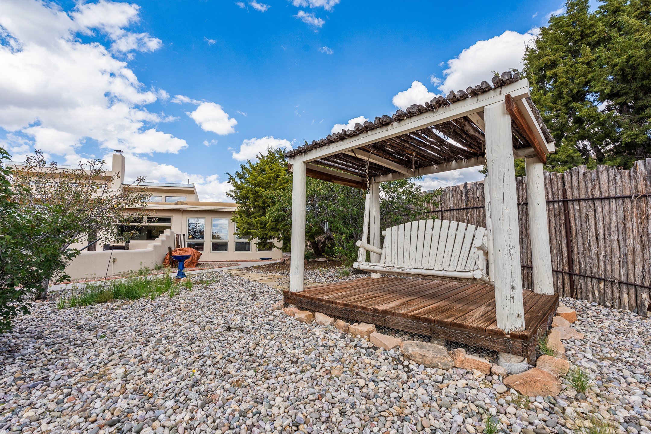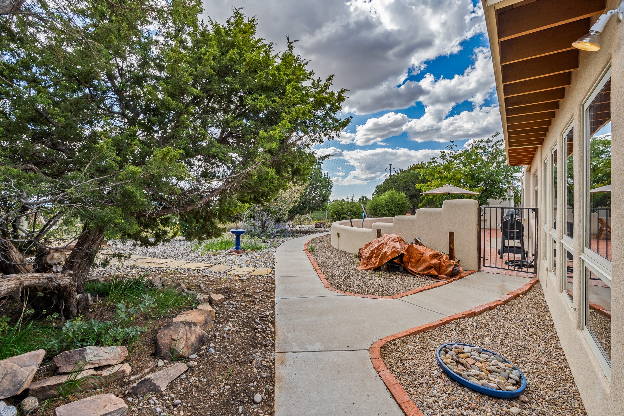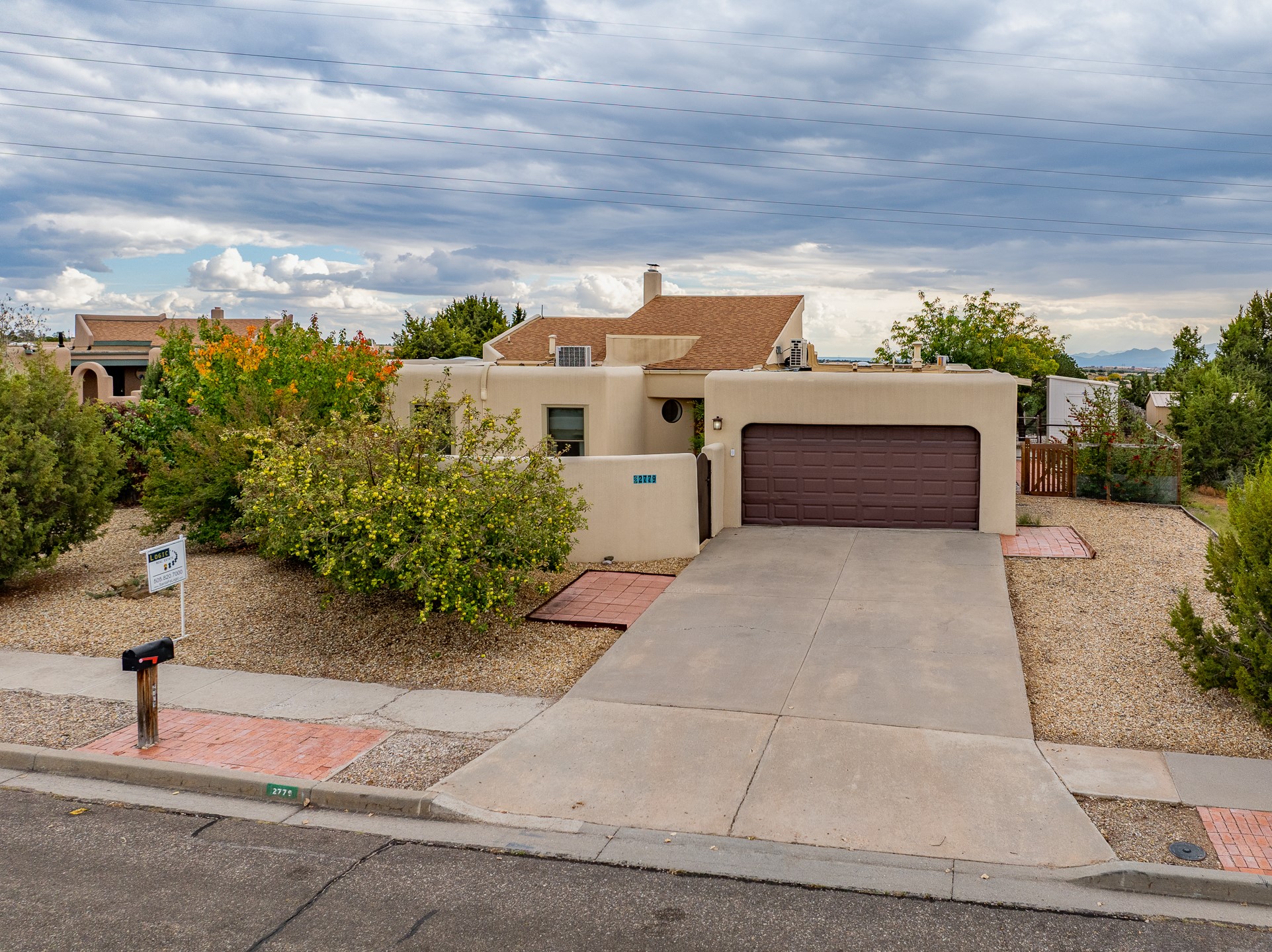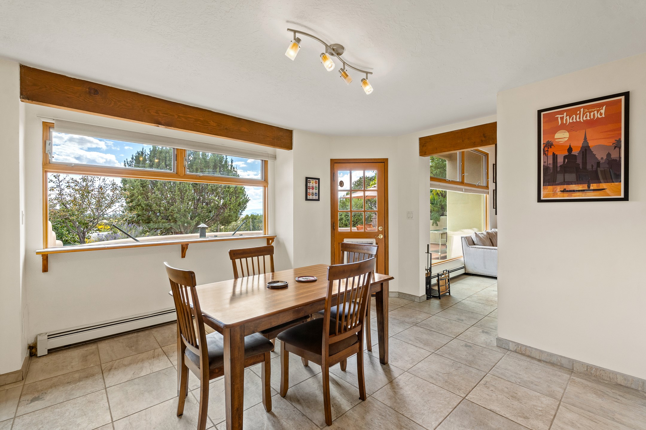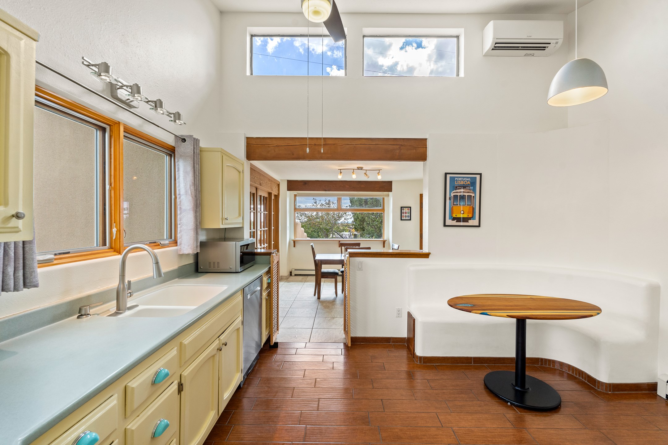 Welcome to this light-filled and beautifully maintained single-level home, ideally situated for easy access to all that Santa Fe has to offer. Located on an elevated .45-acre lot, this 1,900 sq. ft. property offers both comfort and accessibility. Inside, you'll find three spacious bedrooms, three bathrooms, and a flexible attached office/studio that can serve as a 4th bedroom or creative space. Architectural highlights include high beamed ceilings, T&G ceiling, with clerestory windows, skylights, and a classic kiva-style fireplace -- all creating a warm, Southwestern ambiance. Enjoy year-round comfort with hot water baseboard heating and mini-split systems for heating and cooling. Step inside to a private entry courtyard with flagstone and a fully enclosed backyard featuring a brick patio, perfect for outdoor entertaining. Relax under the pergola swing with your morning coffee or evening glass of wine while taking in breathtaking views of the Sandia and Ortiz Mountains. The yard is beautifully landscaped with multiple fruit trees, drip irrigation, and includes a large storage shed. Don't miss this rare opportunity to own a peaceful and versatile home with majestic sunrises and sunsets, just a short drive to downtown Santa Fe.