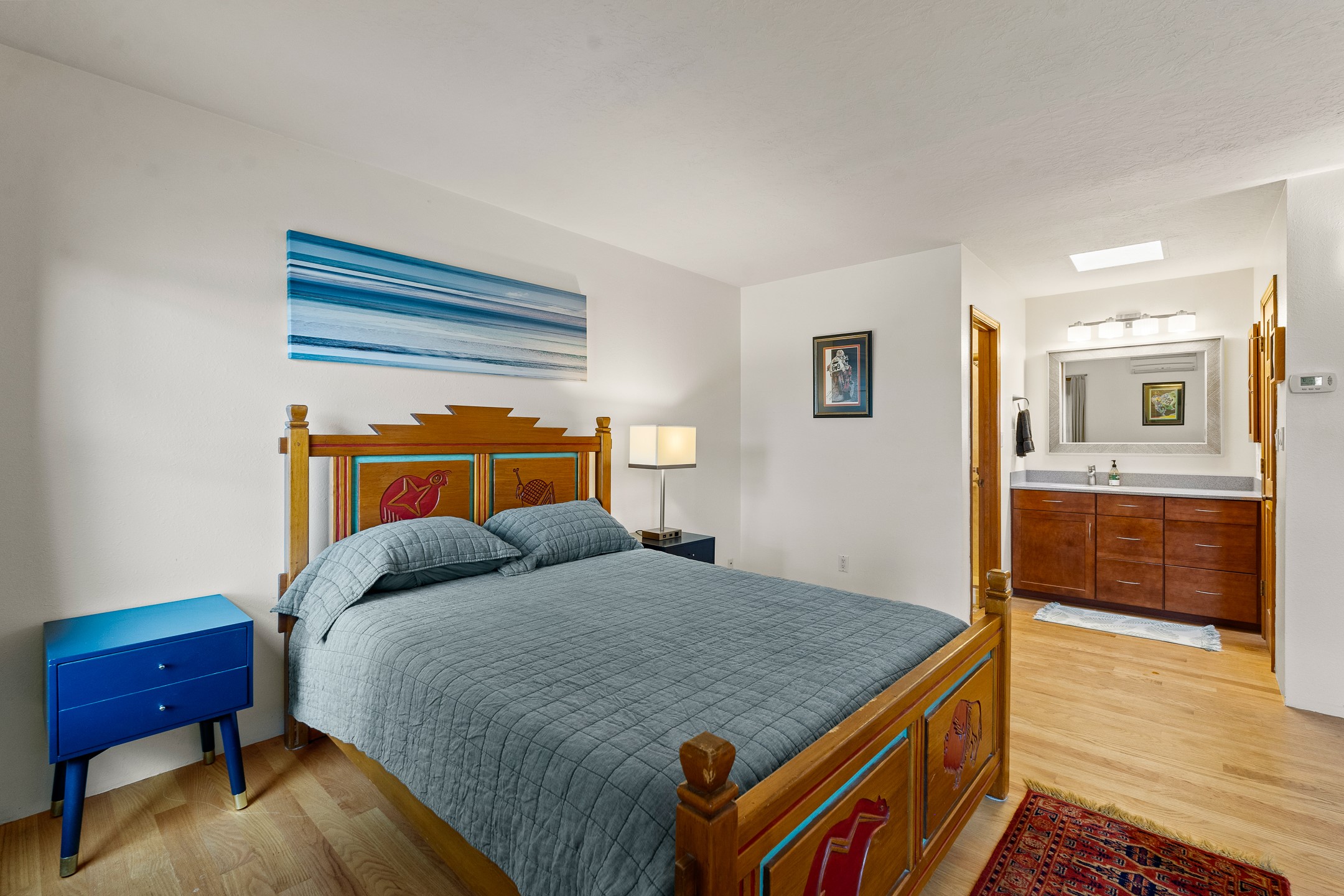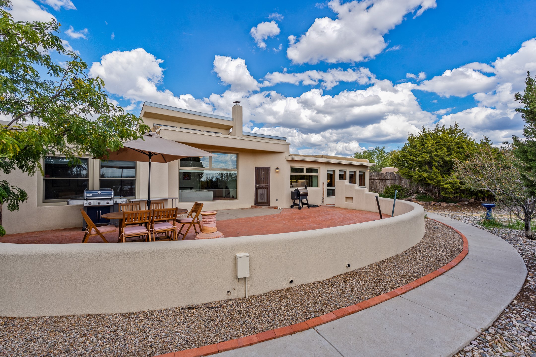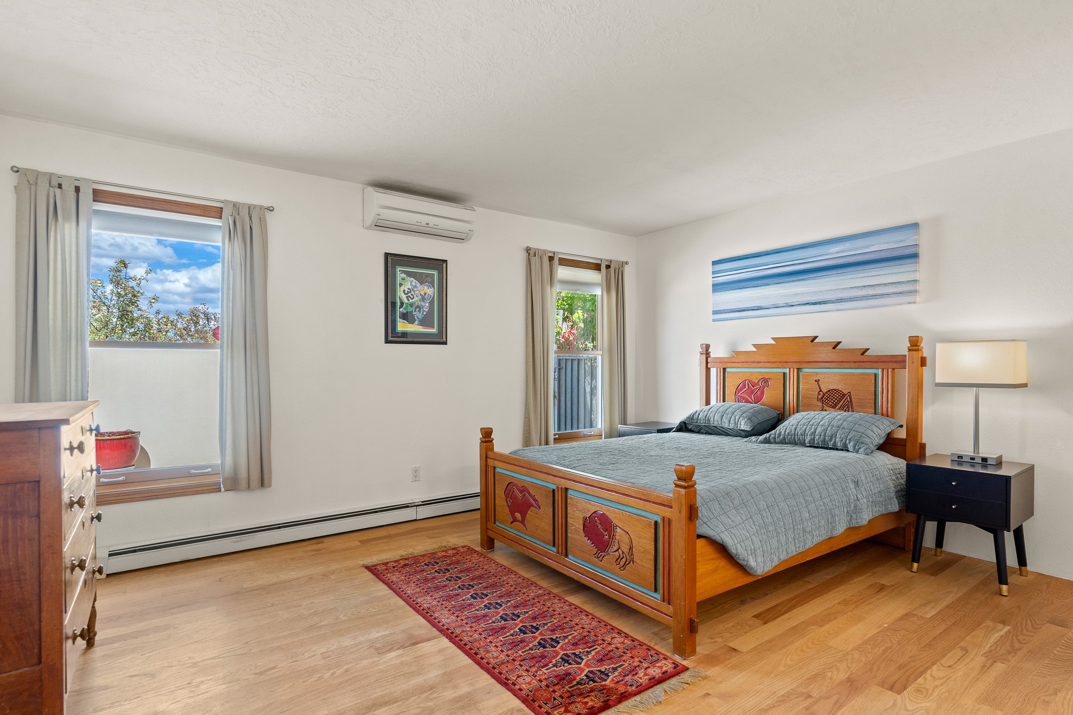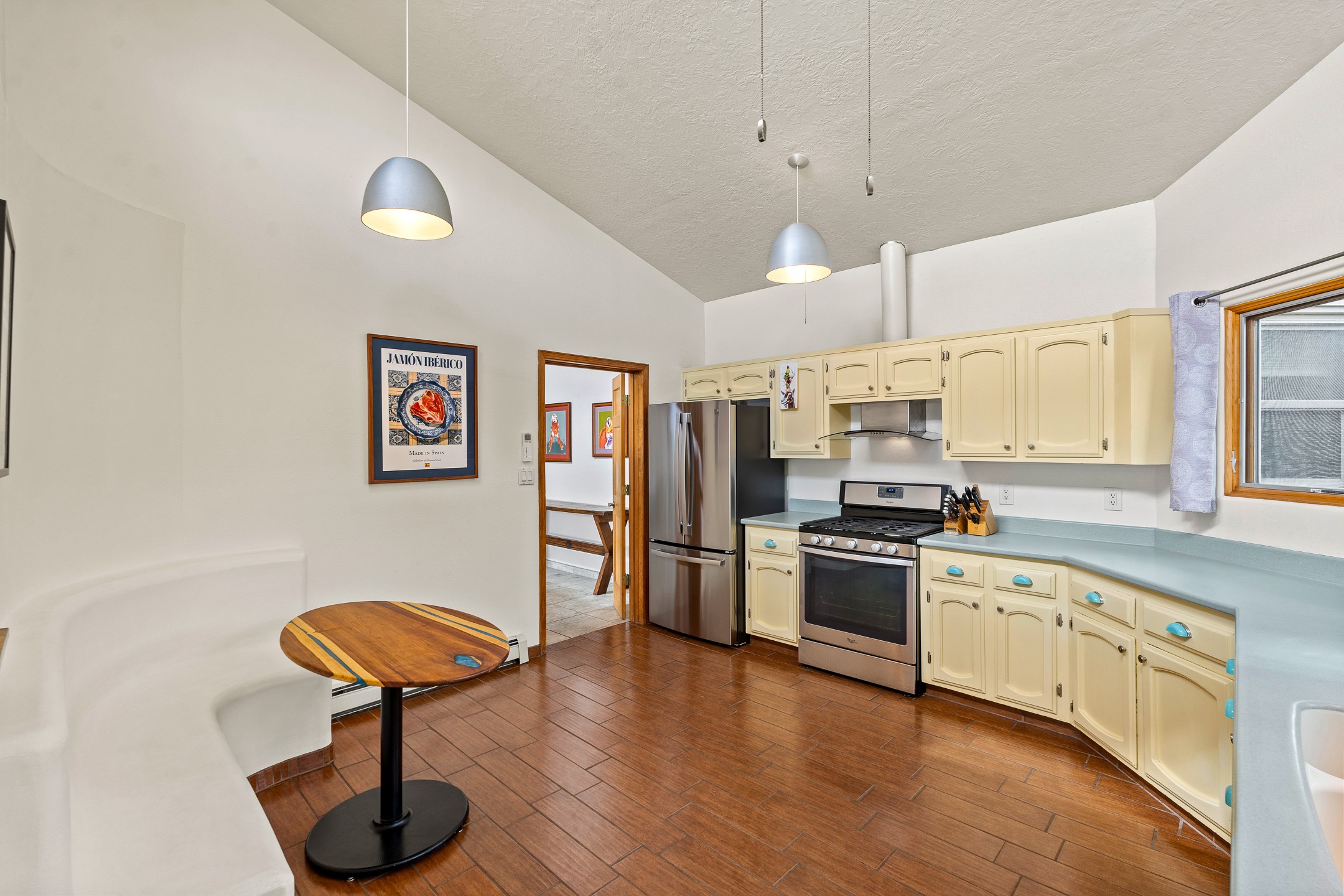 Welcome to this light-filled and beautifully maintained single-level home, ideally situated for easy access to all that Santa Fe has to offer. Located on an elevated .45-acre lot, this 1,900 sq. ft. property offers both comfort and accessibility. Inside, you'll find three spacious bedrooms, three bathrooms, and a flexible attached office/studio that can serve as a 4th bedroom or creative space. Architectural highlights include high beamed ceilings, T&G ceiling, with clerestory windows, skylights, and a classic kiva-style fireplace -- all creating a warm, Southwestern ambiance. Enjoy year-round comfort with hot water baseboard heating and mini-split systems for heating and cooling. Step inside to a private entry courtyard with flagstone and a fully enclosed backyard featuring a brick patio, perfect for outdoor entertaining. Relax under the pergola swing with your morning coffee or evening glass of wine while taking in breathtaking views of the Sandia and Ortiz Mountains. The yard is beautifully landscaped with multiple fruit trees, drip irrigation, and includes a large storage shed. Don't miss this rare opportunity to own a peaceful and versatile home with majestic sunrises and sunsets, just a short drive to downtown Santa Fe.