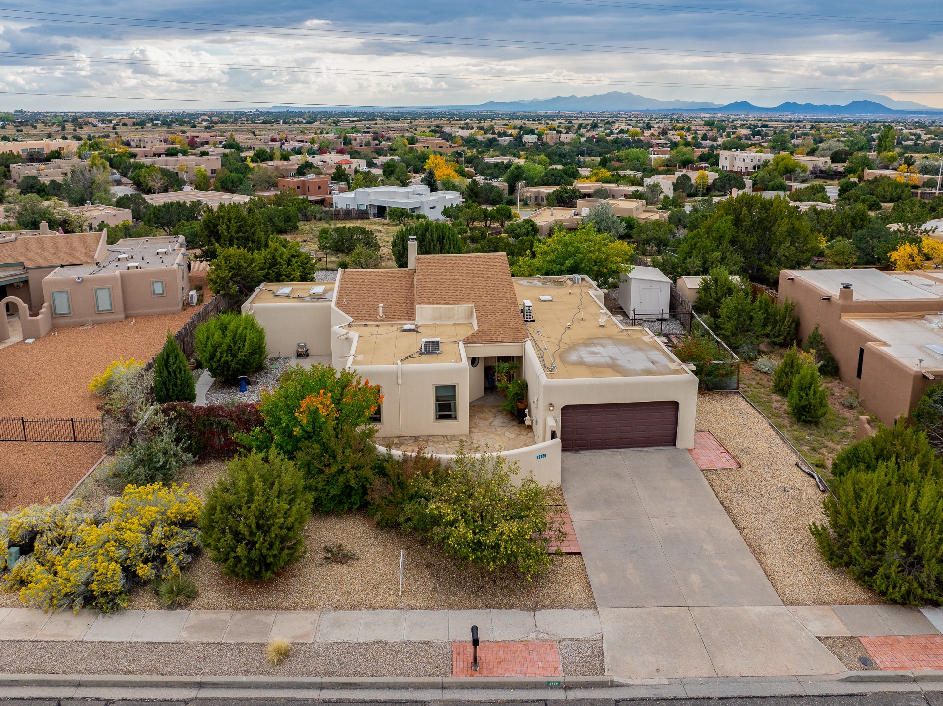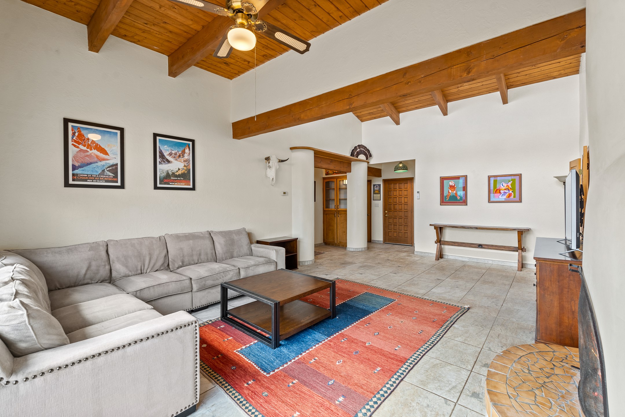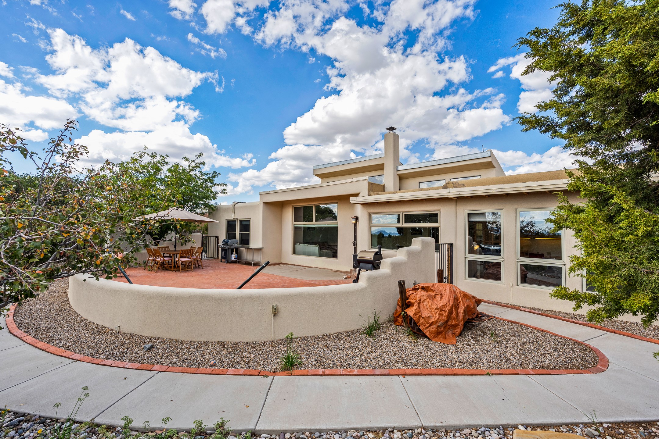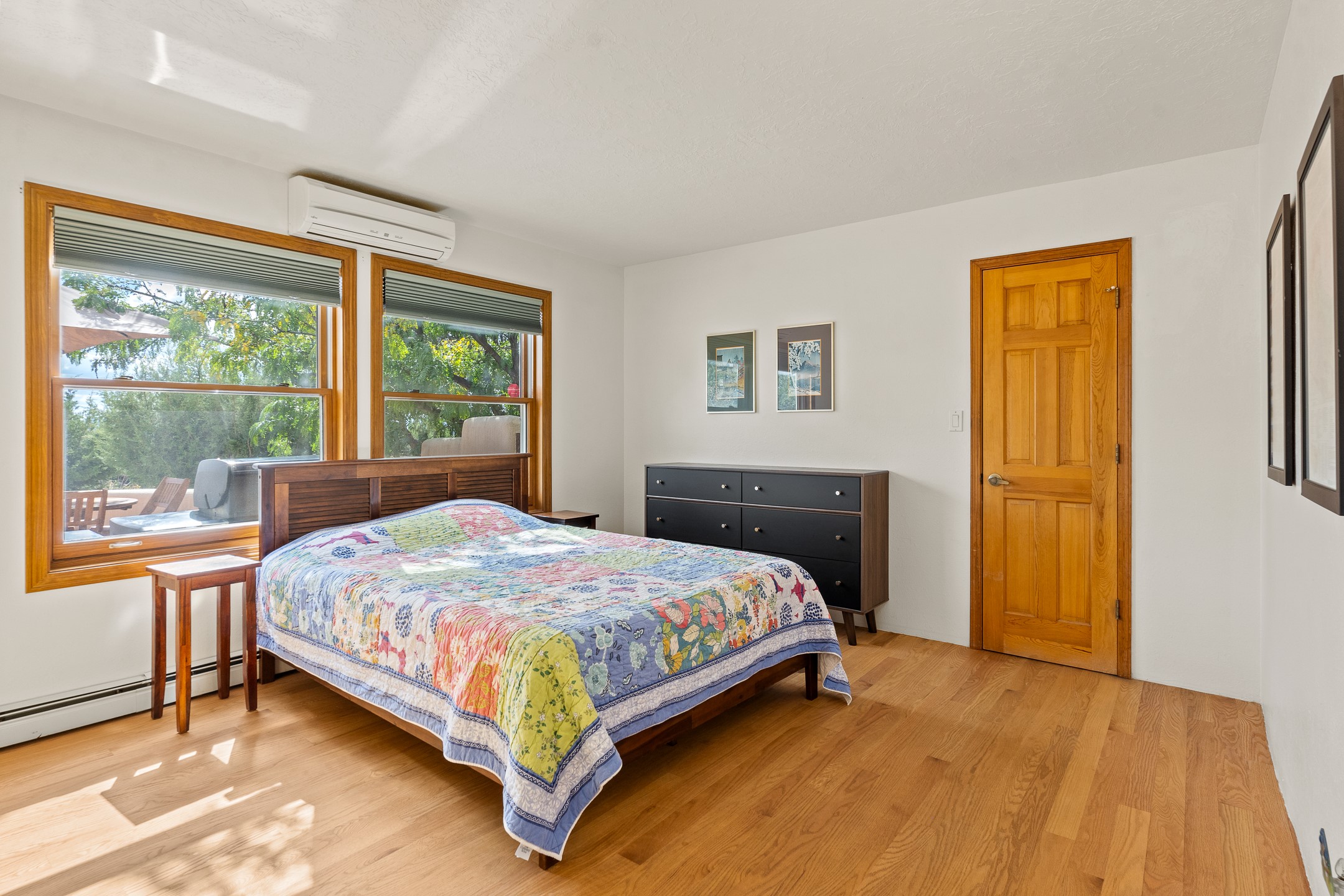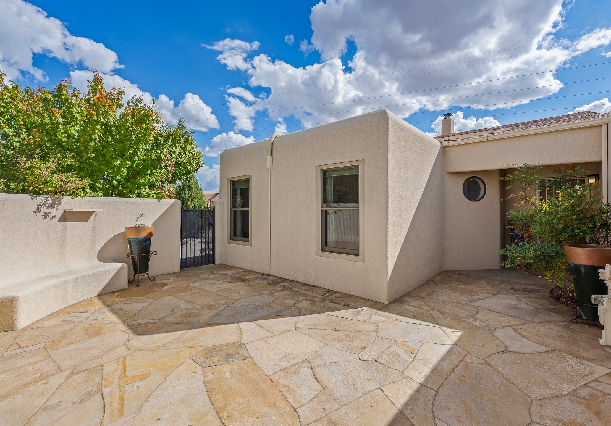 Welcome to this light-filled and beautifully maintained single-level home, ideally situated for easy access to all that Santa Fe has to offer. Located on an elevated .45-acre lot, this 1,900 sq. ft. property offers both comfort and accessibility. Inside, you'll find three spacious bedrooms, three bathrooms, and a flexible attached office/studio that can serve as a 4th bedroom or creative space. Architectural highlights include high beamed ceilings, T&G ceiling, with clerestory windows, skylights, and a classic kiva-style fireplace -- all creating a warm, Southwestern ambiance. Enjoy year-round comfort with hot water baseboard heating and mini-split systems for heating and cooling. Step inside to a private entry courtyard with flagstone and a fully enclosed backyard featuring a brick patio, perfect for outdoor entertaining. Relax under the pergola swing with your morning coffee or evening glass of wine while taking in breathtaking views of the Sandia and Ortiz Mountains. The yard is beautifully landscaped with multiple fruit trees, drip irrigation, and includes a large storage shed. Don't miss this rare opportunity to own a peaceful and versatile home with majestic sunrises and sunsets, just a short drive to downtown Santa Fe.