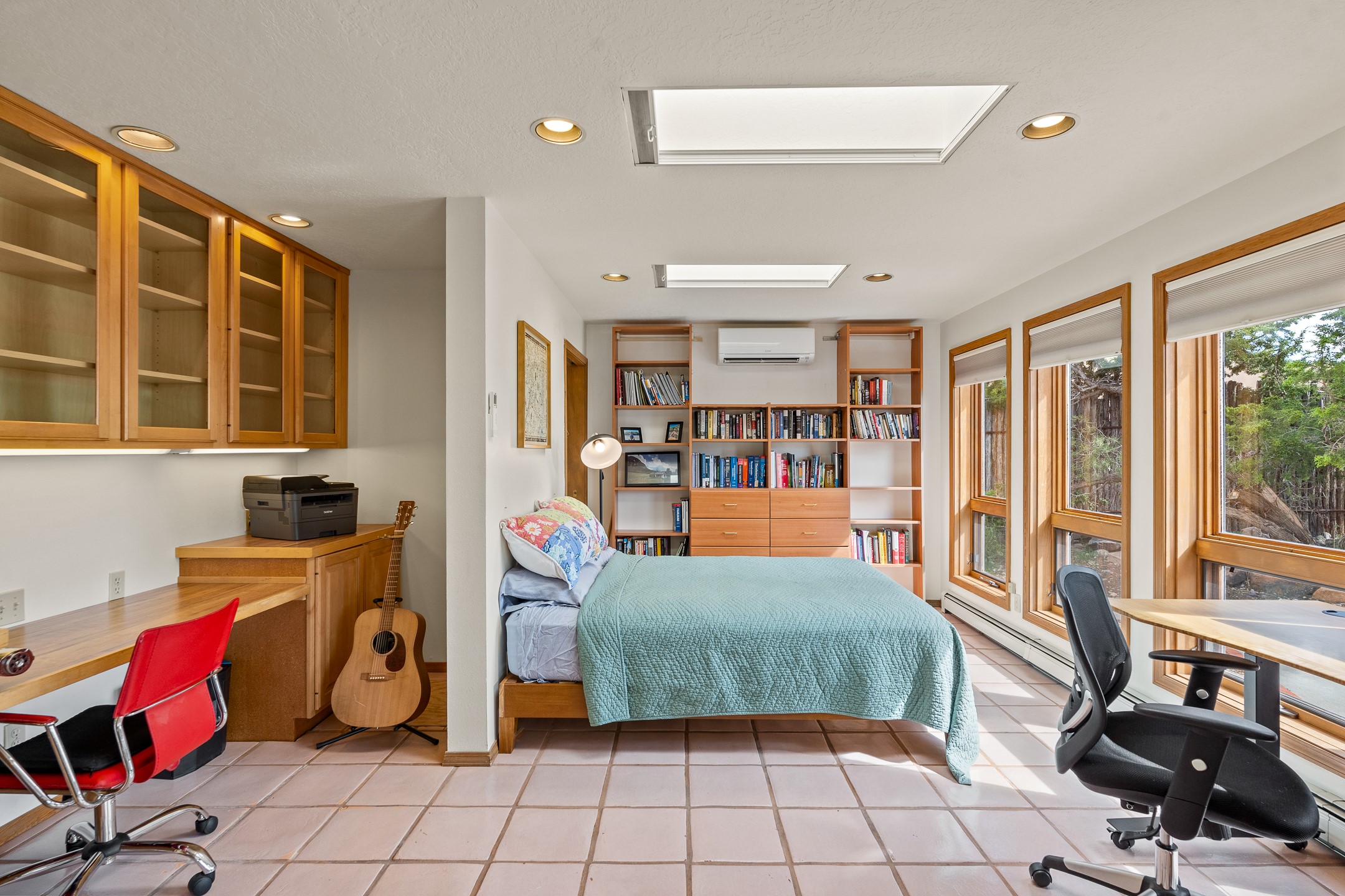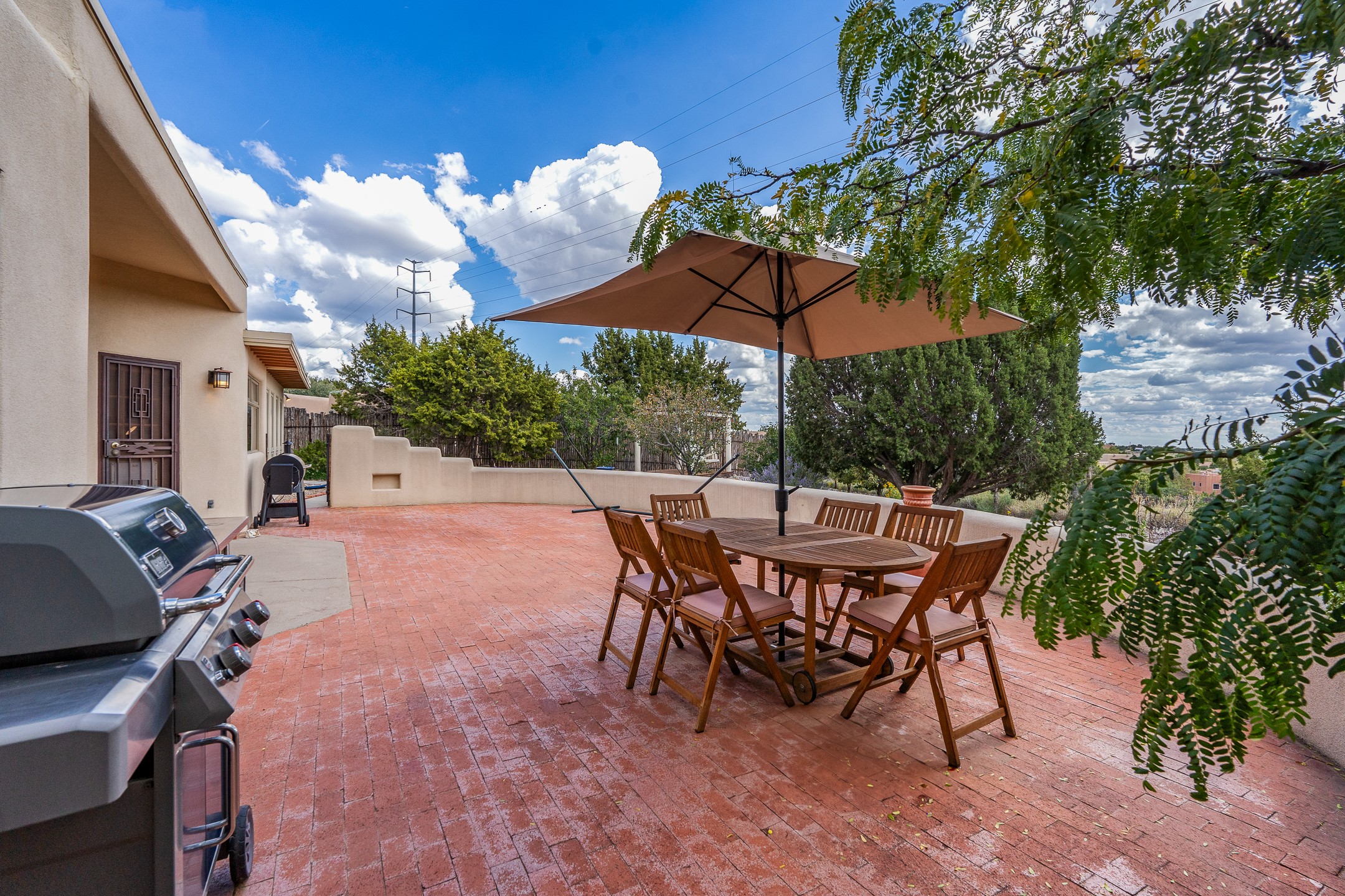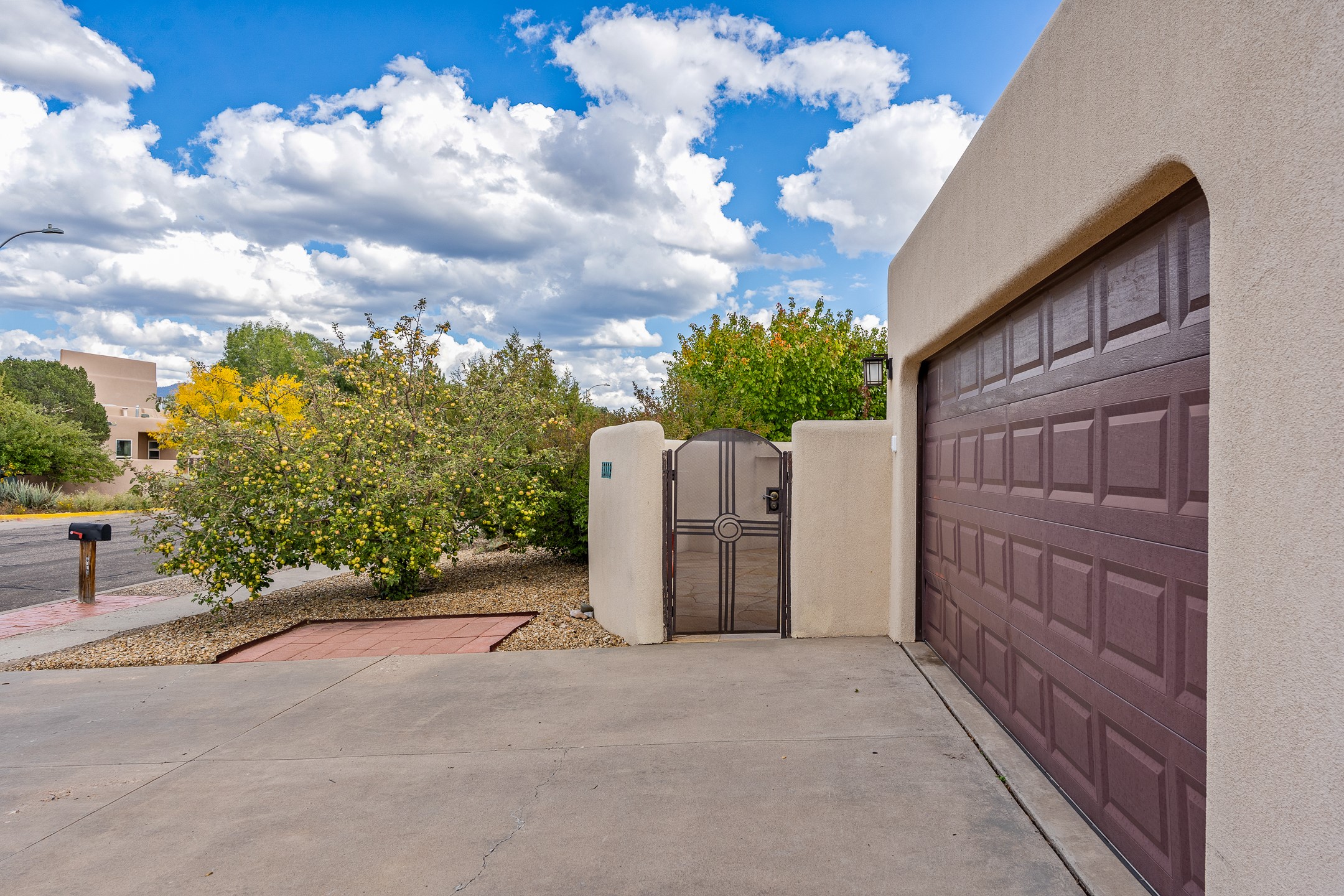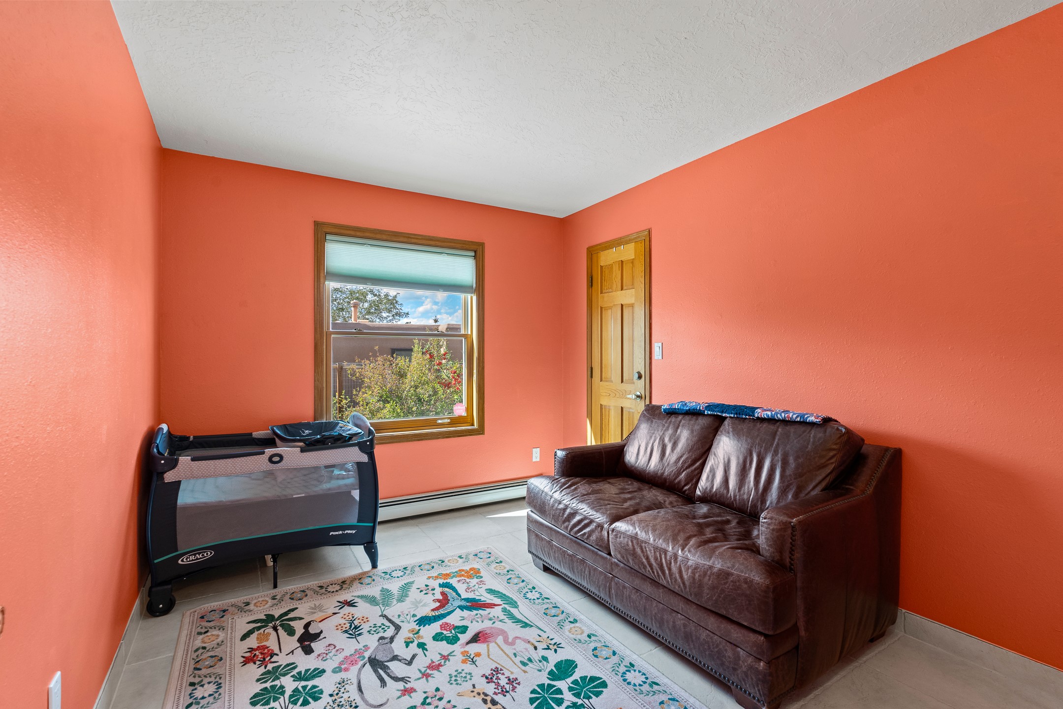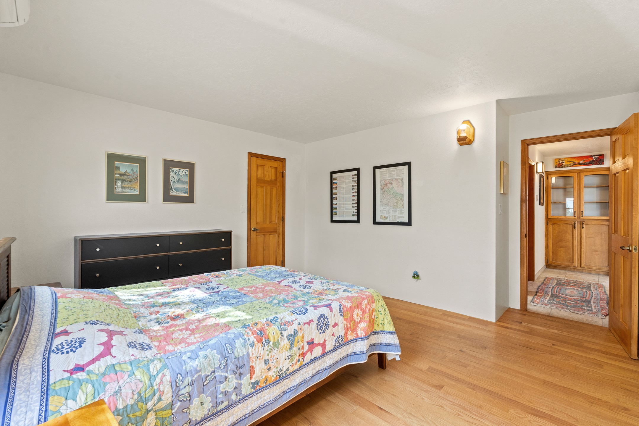 Welcome to this light-filled and beautifully maintained single-level home, ideally situated for easy access to all that Santa Fe has to offer. Located on an elevated .45-acre lot, this 1,900 sq. ft. property offers both comfort and accessibility. Inside, you'll find three spacious bedrooms, three bathrooms, and a flexible attached office/studio that can serve as a 4th bedroom or creative space. Architectural highlights include high beamed ceilings, T&G ceiling, with clerestory windows, skylights, and a classic kiva-style fireplace -- all creating a warm, Southwestern ambiance. Enjoy year-round comfort with hot water baseboard heating and mini-split systems for heating and cooling. Step inside to a private entry courtyard with flagstone and a fully enclosed backyard featuring a brick patio, perfect for outdoor entertaining. Relax under the pergola swing with your morning coffee or evening glass of wine while taking in breathtaking views of the Sandia and Ortiz Mountains. The yard is beautifully landscaped with multiple fruit trees, drip irrigation, and includes a large storage shed. Don't miss this rare opportunity to own a peaceful and versatile home with majestic sunrises and sunsets, just a short drive to downtown Santa Fe.