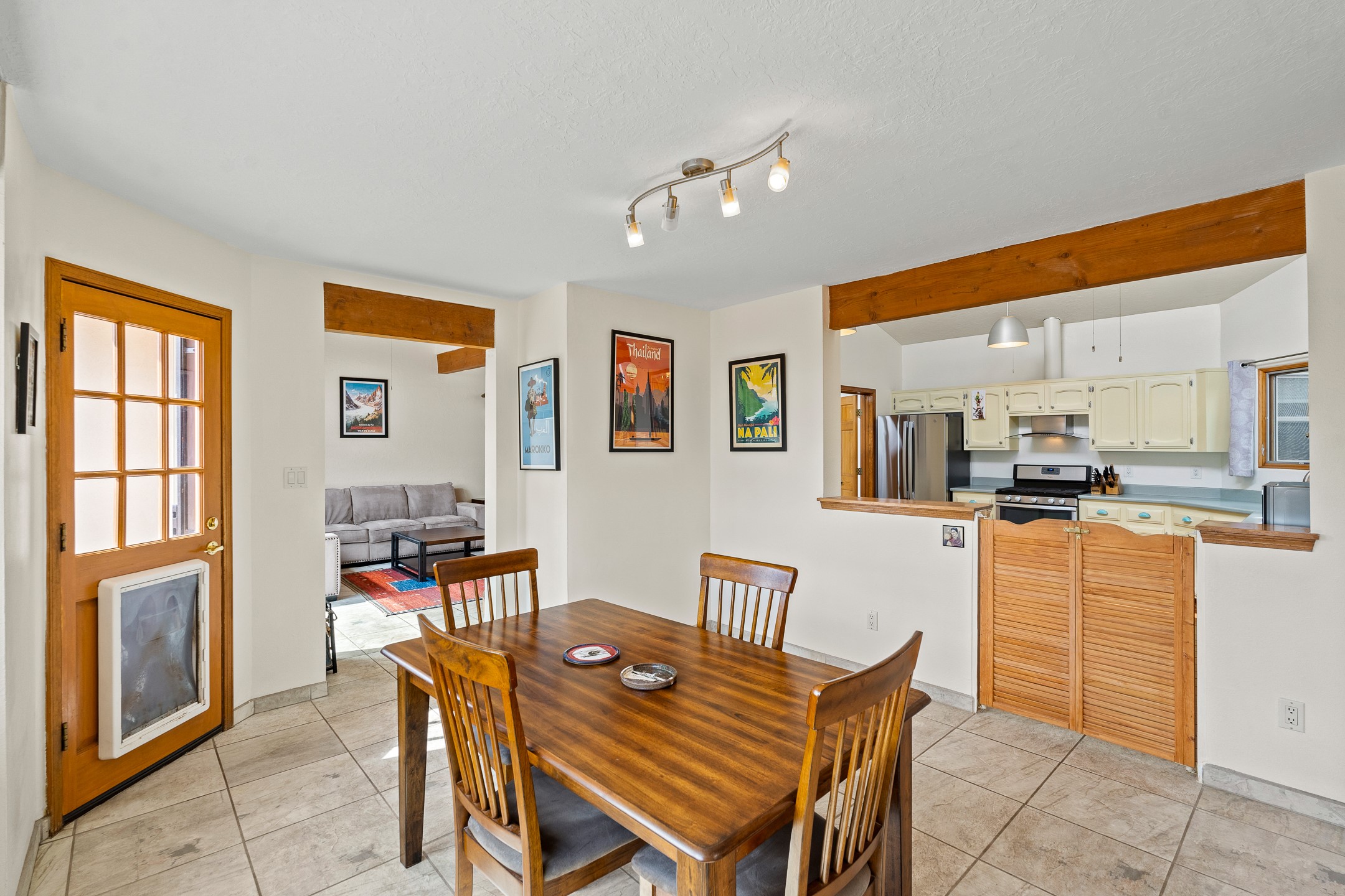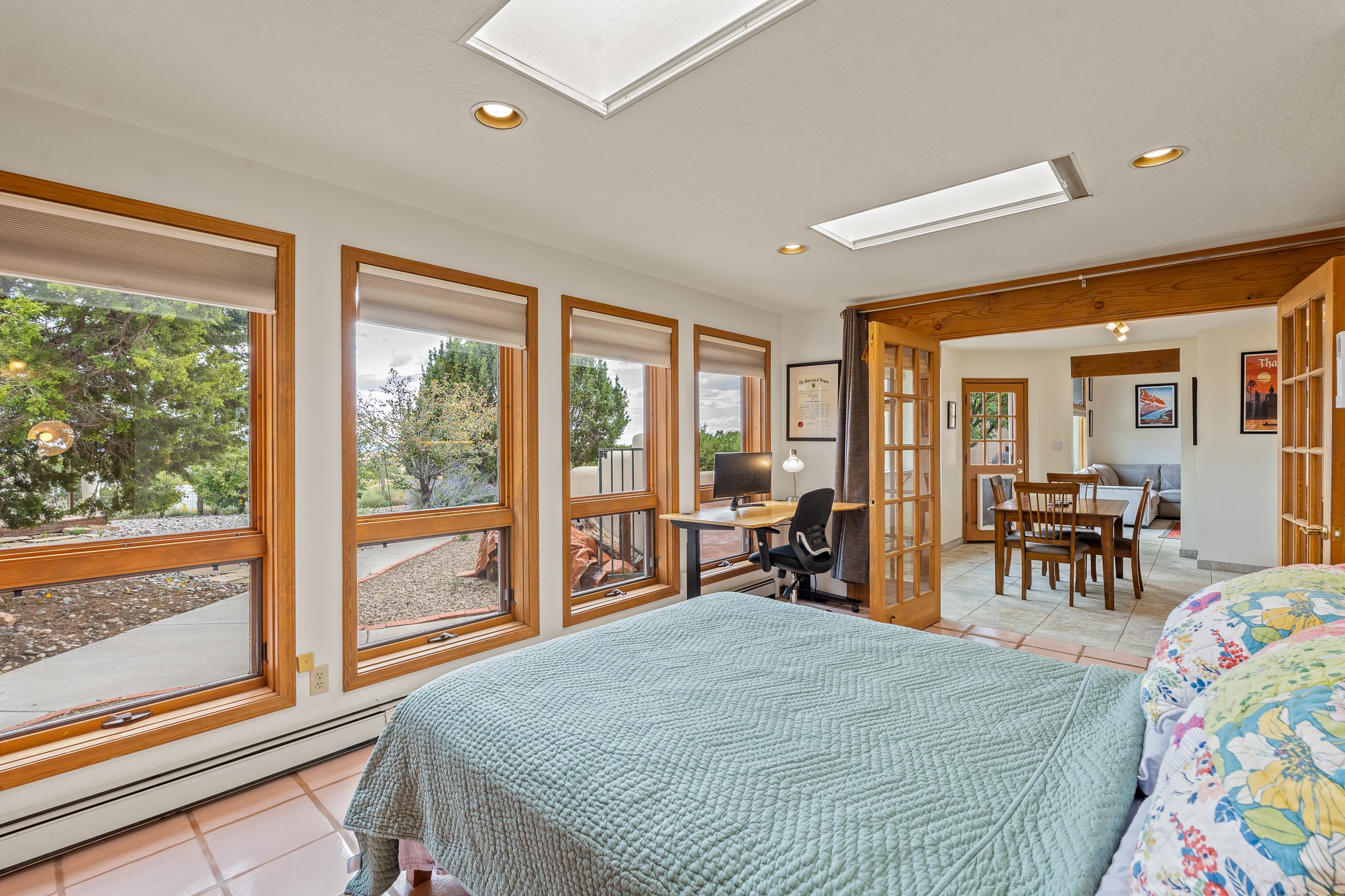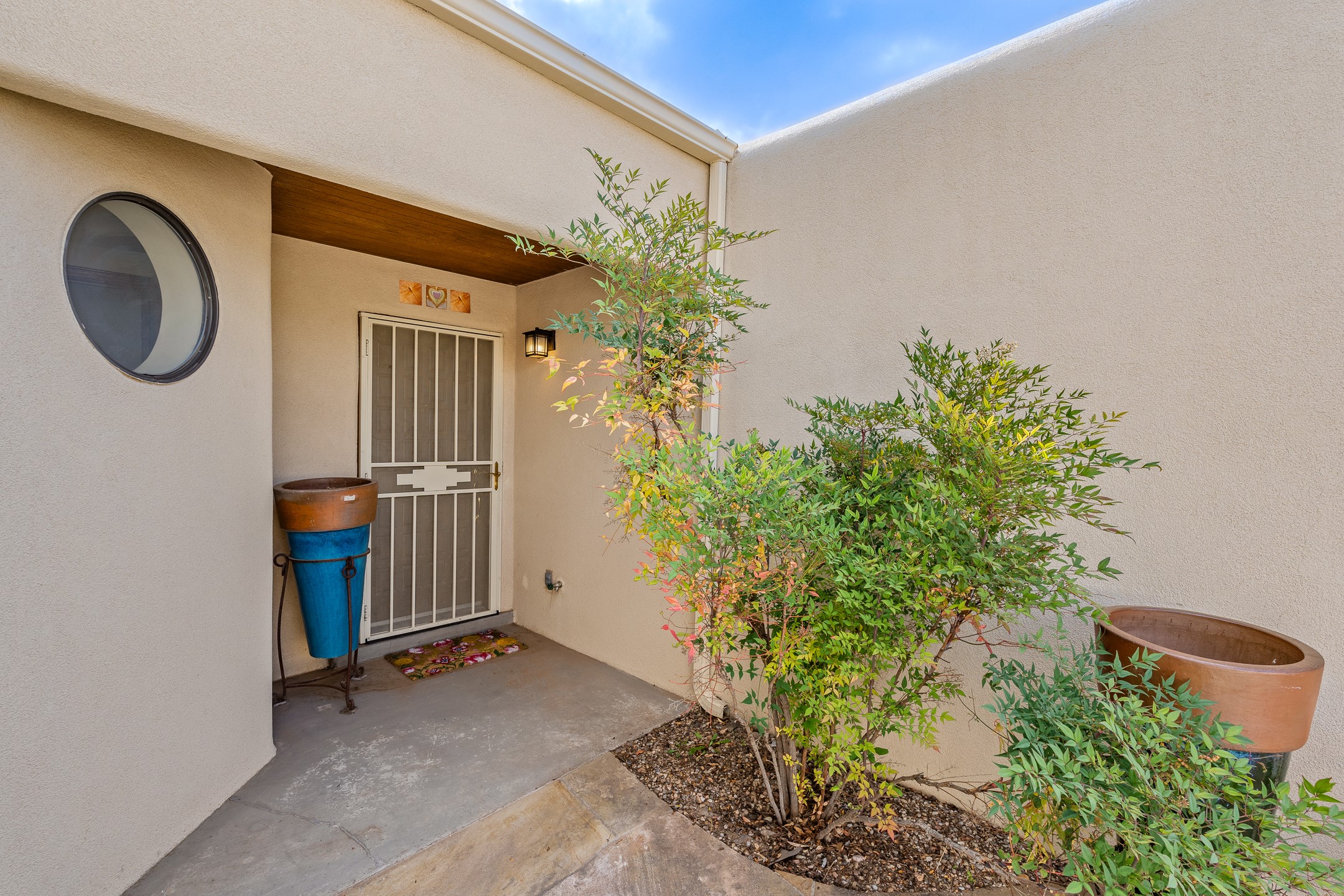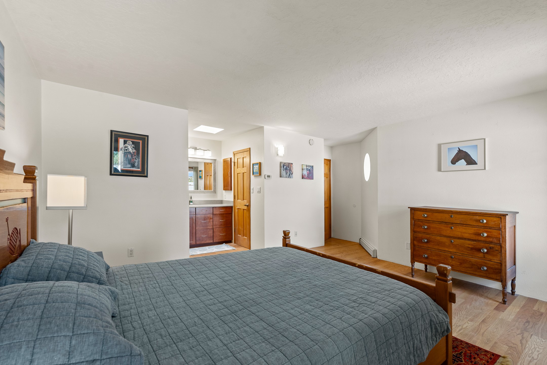 Welcome to this light-filled and beautifully maintained single-level home, ideally situated for easy access to all that Santa Fe has to offer. Located on an elevated .45-acre lot, this 1,900 sq. ft. property offers both comfort and accessibility. Inside, you'll find three spacious bedrooms, three bathrooms, and a flexible attached office/studio that can serve as a 4th bedroom or creative space. Architectural highlights include high beamed ceilings, T&G ceiling, with clerestory windows, skylights, and a classic kiva-style fireplace -- all creating a warm, Southwestern ambiance. Enjoy year-round comfort with hot water baseboard heating and mini-split systems for heating and cooling. Step inside to a private entry courtyard with flagstone and a fully enclosed backyard featuring a brick patio, perfect for outdoor entertaining. Relax under the pergola swing with your morning coffee or evening glass of wine while taking in breathtaking views of the Sandia and Ortiz Mountains. The yard is beautifully landscaped with multiple fruit trees, drip irrigation, and includes a large storage shed. Don't miss this rare opportunity to own a peaceful and versatile home with majestic sunrises and sunsets, just a short drive to downtown Santa Fe.